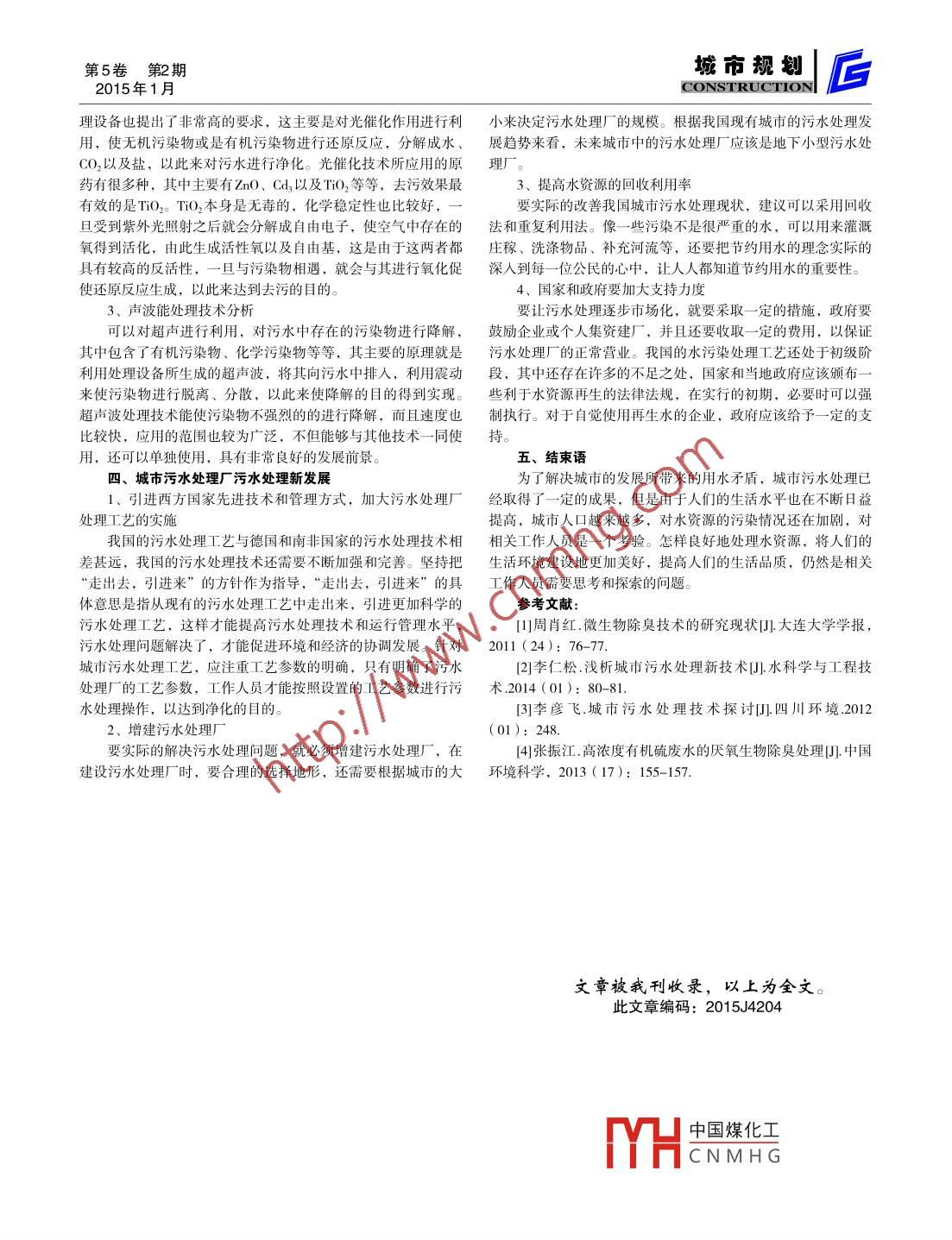 城市規(guī)劃第5卷第2期GCONSTRUCTION2015年1月城市污水廠建設(shè)中污水處理工藝的選擇賈志杰中山市南興房地產(chǎn)有限公司廣 東中山528400滴要:我國經(jīng)濟(jì)的發(fā)展帶動了工業(yè)的迅猛發(fā)展,而工業(yè)生產(chǎn)中產(chǎn)生的人大量有害物質(zhì)對環(huán)境的危害也是與日俱增的,不管是噪聲、大氣還是水體污染,其面臨的形式都非常嚴(yán)峻。隨著高效生物技術(shù)的不斷完善,傳統(tǒng)的污水處理技術(shù)對高效生化處理工藝功能擴(kuò)展的限制正日益凸顯,因此有必要加強(qiáng)對技術(shù)的不斷更新研究。關(guān)鍵詞:污水廠;污水處理;工藝選擇中圖分類號: TU984文獻(xiàn)標(biāo)識碼: A引言:2、間歇式活性污泥法,其具有設(shè)備簡單化、管理方便、我國的經(jīng)濟(jì)在不斷的發(fā)展,城市化的進(jìn)程也在不斷的深處理性能穩(wěn)定的功能,主要通過設(shè)置2個曝氣沉淀池來進(jìn)行混人,現(xiàn)在最主要的問題就是每年都在增加的城市污水排放量,合污水的處理,一般處理池進(jìn)行曝氣、沉淀、排除處理水等周這對與污水處理廠也造成了非常大的壓力。想要使污水處理的期需要進(jìn)行6h。效率得到提升,污水處理廠就- -定 要應(yīng)用到最先進(jìn)的污水處理3、AB工藝法,其也被稱為吸附生物降解法,具有特殊凈技術(shù),這樣才能使這個問題得到有效的解決。在近幾年來,我化機(jī)制的功能 ,AB 工藝法的主要工作原理是將曝氣池分為A,國的城市化進(jìn)程在不斷的深入,城市的污水排放量也在不斷的B兩段 來進(jìn)行處理池中物質(zhì)的吸附和氧化,從而實(shí)現(xiàn)污水處理。增加,現(xiàn)階段所使用的污水處理技術(shù)并無法滿足當(dāng)前對污水處4、A/0工藝處理,其主要應(yīng)用在生物除磷脫氮的污水處理理所提出的要求。所以,污水處理技術(shù)的水平就必須要不斷的中, 采用A/O處理工藝需要有充足的碳源,在污水處理中,通進(jìn)行提升,以此來使污水處理的效率得到有效的提升。過好氧硝化反應(yīng)來除磷脫氮,從而降低污水中的有機(jī)物濃度。一、 當(dāng)前我國城市污水的主要來源對于生物膜法,其是- - 種好氧生物處理技術(shù),具有凈化功能1、城市生活垃圾和生活污水強(qiáng)、適應(yīng)性強(qiáng)、固液分離和動力費(fèi)用低的特點(diǎn),主要采用生物近些年來,我國人們的生活得到了很大的提高,每天所接觸 氧化法和生物轉(zhuǎn)盤法對污水中附著的微生物群進(jìn)行凈化,制造出的垃圾和生活污水也越來越多。每個家庭、企事業(yè)單降 低污水中的污泥量。氧化塘污水處理工藝在污水處理中得到位、公共設(shè)施是生活污水的主要來源。洗滌污水與排泄物占了廣 泛應(yīng)用,其具有構(gòu)造簡單、建設(shè)成本低、方便維護(hù)管理、凈污染物的大部分,時間差異大是污水排放的主要特點(diǎn)。在我國化 率高的特點(diǎn),通過污水在塘內(nèi)長時間進(jìn)行緩慢流動和貯存,的城市發(fā)展一些相關(guān)的配套設(shè)施還不完備,排水管網(wǎng)就是其中并 且通過微生物的代謝活動來降低污水中的有機(jī)物,以達(dá)到污一項(xiàng)。一般是將污水直接排放到管網(wǎng)中,水資源直接受到了污水凈化的 目的。染,生態(tài)環(huán)境遭受惡化,嚴(yán)重者還會影響居民日常的生活用水三、城市污水廠建設(shè)中采用的新的污水處理技術(shù)隨著我國的經(jīng)濟(jì)發(fā)展,也出現(xiàn)了大量新的生產(chǎn)技術(shù),這對2、工業(yè)廢水.于污水處理技術(shù)來說也是同一-個道理。環(huán)保理念在當(dāng)前收到了工業(yè)中所生產(chǎn)的過程用水和冷卻水以及設(shè)備、場地等洗滌人們的廣 泛重視,在對污水進(jìn)行處理時也開始向著非化學(xué)治理時產(chǎn)生的廢水是工業(yè)廢水的主要來源。當(dāng)前我國經(jīng)濟(jì)發(fā)展較為轉(zhuǎn)變, 這樣不但能夠減少化學(xué)制品的投入,使成本降低,還能迅速,很多企業(yè)為了發(fā)展,引進(jìn)了很多含有高污染濃度的化工夠使處理的效果得到有效的提升。下面幾點(diǎn)就是我國當(dāng)前所使生產(chǎn)物,這些化工原料所排放的廢水對水資源的污染是極為可用的 新的污水處理技術(shù)。怕的。所以這些企業(yè)在為當(dāng)?shù)亟?jīng)濟(jì)發(fā)展貢獻(xiàn)的同時也容易威脅1、礦物質(zhì)污水的處理技術(shù)分析居民的用水安全。可以通過物理吸附的方法,讓處理材料對污水中存在的雜3、城市徑流產(chǎn)生的污水質(zhì)進(jìn)行吸附,以此來對水質(zhì)進(jìn)行凈化,對廢水進(jìn)行處理最為理下雨和下雪時,隨著雨水和雪水而下,地面、建筑物體、想的材料就是礦 物質(zhì)。大部分礦物質(zhì)都具有對污水進(jìn)行處理的生活的廢棄物混合而成的污水即為城市徑流產(chǎn)生的污水。季節(jié)功能, 比如說非常常見的材料,如:硅藻土、海泡石以及膨潤性和成分復(fù)雜性是其主要的特征。由于久未下雨,所以在進(jìn)入土等等。使用礦物質(zhì)對污水進(jìn)行處理有兩個非常重要的優(yōu)勢,雨季的初期而形成的污染物的含量指標(biāo)往往明顯高于普通的生第--,礦物質(zhì)的種類較多、也有非常豐富的儲量、價格相對活污水。來說也較為低廉,在對污水進(jìn)行處理的時候也非常容易進(jìn)行操二、常