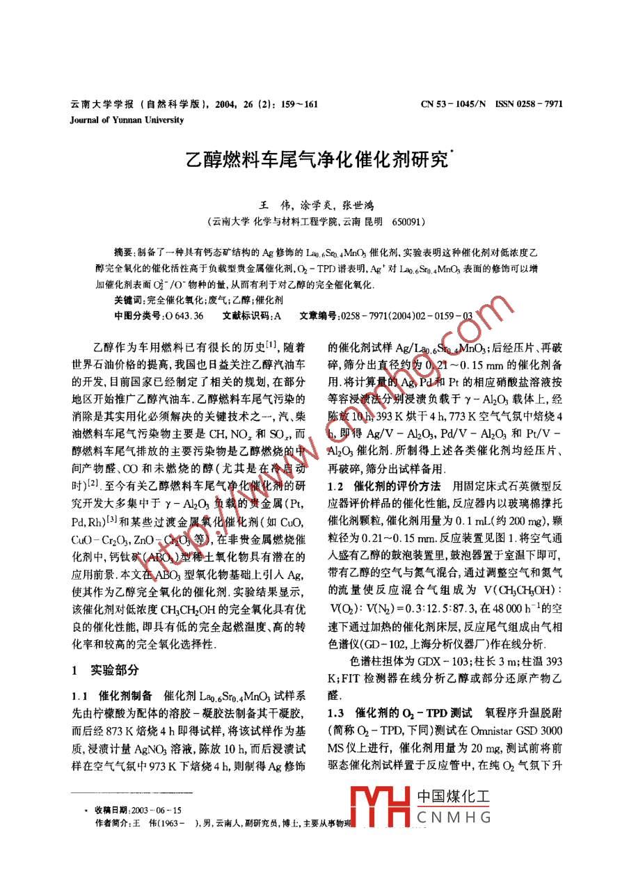 云南大學(xué)學(xué)報(自然科學(xué)版),200426(2):159-161CN53-1045/ N ISSN0258-7971Journal of Yunnan University乙醇燃料車尾氣凈化催化劑研究王偉,涂學(xué)炎,張世鴻云南大學(xué)化學(xué)與材料工程學(xué)院,云南昆明650091)摘要制備了一種具有鈣態(tài)礦結(jié)構(gòu)的Ag修飾的L4.6S04Mnk催化劑實驗表明這種催化劑對低濃度乙醇完全氧化的催化活性高于負(fù)載型貴金屬催化劑,O2-TPD譜表明,Ag對126 Sro mNo3表面的修飾可以增加催化劑表而O/O物種的量,從而有利于對乙醇的完全催化氧化關(guān)鍵詞:完全催化氧化;廢氣;乙醇;催化劑中圖分類號:O643.36文獻(xiàn)標(biāo)識碼:A文章編號:0258-7971(2004)02-0159-03乙醇作為車用燃料已有很長的歷史,隨著的催化劑試樣Ag/L206Sm04MnO2;后經(jīng)壓片、再破世界石油價格的提高,我國也日益關(guān)注乙醇汽油車碎篩分出直徑約為021~0.15mm的催化劑備的開發(fā),目前國家已經(jīng)制定了相關(guān)的規(guī)劃,在部分用將計算量的Ag,Pd和Pt的相應(yīng)硝酸鹽溶液按地區(qū)開始推廣乙醇汽油車.乙醇燃料車尾氣污染的等容浸漬法分別浸漬負(fù)載于y-A2O載體上,經(jīng)消除是其實用化必須解決的關(guān)鍵技術(shù)之一,汽、柴陳放10h,393K烘于4h,773K空氣氣氛中焙燒油燃料車尾氣污染物主要是CH,NO2和SOn,而b,即得Ag/V-Al2O3,PdV-Al2O3和Pt/V醇燃料車尾氣排放的主要污染物是乙醇燃燒的中Al2O3催化劑.所制得上述各類催化劑均經(jīng)壓片、間產(chǎn)物醛、OO和未燃燒的醇(尤其是在冷啟動再破碎,篩分出試樣備用時)2.至今有關(guān)乙醇燃料車尾氣凈化催化劑的研12催化劑的評價方法用固定床式石英傲型反究開發(fā)大多集中于y-A2O3負(fù)載的貴金屬(應(yīng)器評價樣品的催化性能,反應(yīng)器內(nèi)以玻璃棉撐托Pa,R)和某些過渡金屬氧化催化劑(如CuO,催化劑顆粒催化劑用量為0.1mL(約200mg),顆CO-Cn2O3,ZnO-Cr2O3等),在非貴金屬燃燒催粒徑為0.21-0.15mm反應(yīng)裝置見圖1.將空氣通化劑中,鈣鈦礦(ABO3)型稀土氧化物具有潛在的盛有乙醇的鼓泡裝置里鼓泡器置于室溫下即可,應(yīng)用前景本文在ABO2型氧化物基礎(chǔ)上引入帶有乙醇的空氣與氮氣混合,通過調(diào)整空氣和氮氣使其作為乙醇完全氧化的催化劑實驗結(jié)果顯示,的流量使反應(yīng)混合氣組成為v( H3CH3OH該催化劑對低濃度CH3CH2OH的完全氧化具有優(yōu)WO):WN)=0.3:12.5:87.3,在4800b-1的空良的催化性能,即具有低的完全起燃溫度、高的轉(zhuǎn)速下通過加熱的催化劑床層,反應(yīng)尾氣組成由氣相化率和較高的完全氧化選擇性色譜儀(GD-102,上海分析儀器廠)作在線分析1實驗部分色譜柱擔(dān)體為GDX-103;柱長3m;柱溫393K;FIT檢測器在線分析乙醇或部分還原產(chǎn)物乙1.1催化劑制備催化劑La0.6Sm.4MnO3試樣系醛先由檸檬酸為配體的溶膠一凝膠法制備其干凝膠,13催化劑的O2-TPD測試氧程序升溫脫附而后經(jīng)873K焙燒4h即得試樣,將該試樣作為基(簡稱O2-TPD,下同)測試在 Omnistar GSD3000質(zhì)浸漬計量AgNO3溶液陳放10h,而后浸漬試Ms儀上進(jìn)行,催化劑用量為20mg,測試前將前樣在空氣氣氛中973K下焙燒4h,則制得Ag修飾驅(qū)態(tài)催化劑試樣置于反應(yīng)管中,在純O2氣氛下升中國煤化工收稿日期:2003-06-1車者簡介:王偉(1963-),男,云南人,副研究員,博土,主要從事物YHCNMHG云南大學(xué)學(xué)報(自然科學(xué)版)第26卷溫至77K,而后降至室溫,經(jīng)He氣吹掃3h,然后4%Mn/Y-A2O等催化劑對乙醇的催化氧化行以20K/min速率進(jìn)行程序升溫脫附為相似2結(jié)果與討論21催化劑性能測試6%Ag/La.6Sm.4MO3催化劑和其它作為比較的4種催化劑對乙醇氧化活性實d00驗結(jié)果見表1,本文所制備的L06S04MnO基質(zhì)催化劑對低濃度乙醇完全氧化活性略優(yōu)于6%Ag/yA2O3,0.1%Py-A2O和0.1Py-AM2O3催化劑在0.1MPa,V( CH3CHOH):V(O2):V(N)=0.3:125:87.2,空速為48000h的反應(yīng)條件下,前400440480520560600者的T95溫度為506K而后三者的Ty溫度分別為523,538和573KAg的修飾使LA,6Sm04MO2基質(zhì)圖1不同溫度下各種催化荊催化氯化乙醇后尾氣中乙醛催化劑對乙醇完全氧化催化活性顯著提高在相同的體積分?jǐn)?shù)(mLm3)(a)6%Ag/La.6S04MnO3;反應(yīng)條件下6%Ag/La.6S0.4MnO3催化劑的Ts溫(b)La。6Sr.4MnO;(c)6%Ag/y-A2Oh;【d)0.1%尾氣中甲醛和的含量均在OC可檢測極限以下,說冬,PMy-A2O;(e)0.,1%P/Y-A2O度可降至453K;即使在這樣低的反應(yīng)溫度下,反應(yīng)CH,CHO content (in 10-6)in the exit-gas of ethanoloxidation at different temperatures ower the catalyst of:(a)6% Ag/Lao.s Srp, 4 MnO: (b) Lao. Sto. 4 MnO: (c)表1一些催化劑對低濃度乙醇氧化活性實驗結(jié)果6%Ag/y-A2O為;(d)0.1%PdY-A2O為;(e)0.1%Tab. I Assay results of complete oxidation activity of ethanolPt/y-AlO3in low concentration over the some catalysts催化劑Ts/KTw/K2.2催化劑的操作穩(wěn)定性能圖2為6%An.Sro.4 MnO3Ag/La0.6So4MnO3催化劑在450K反應(yīng)溫度下,6%Ag/Lao. Srp. 4MnO歷時24h操作穩(wěn)定性的考查結(jié)果考察結(jié)果顯示6% Ag/-AlO3在6%Ag/La0.Sm4MnO2催化劑上乙醇的轉(zhuǎn)化率始終保持在90%以上0.1%P/y-A2O24930. 1%Pt/y-ALO反應(yīng)條件:0.1MPa;反應(yīng)混合氣v((H3CHOH):V(O2):V(N2)=0.3:12.5:87.3;空速48000h明大多數(shù)乙醇都被催化氧化為H2O和CO2,乙醛是其部分氧化產(chǎn)物(尾氣中乙醛含量約790L/m3;但若將反應(yīng)溫度提升至493K,則幾乎100%乙醇完全氧化生成H2O和CO2,尾氣中乙醛含量能下降到1m/m3以下.而為達(dá)到如此低的尾氣中乙醛排放指標(biāo),上