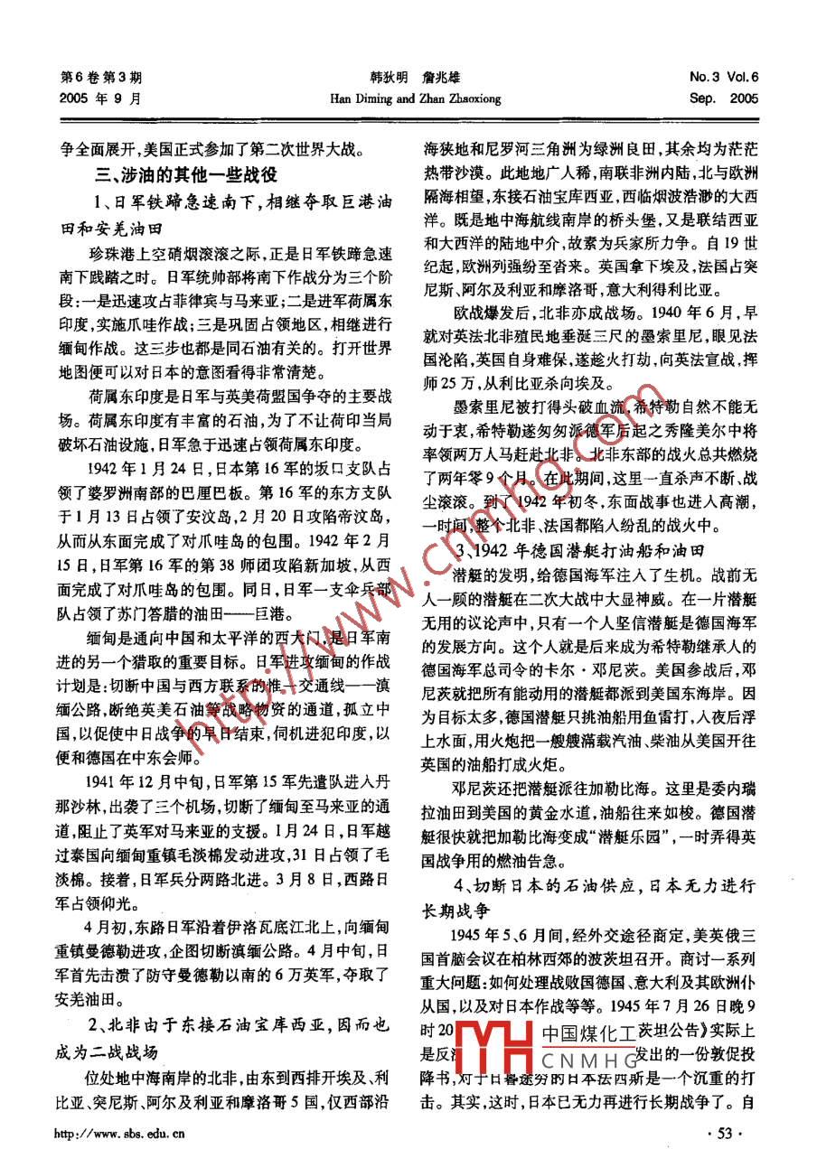 第6卷第3期海商學(xué)院學(xué)報(bào)No.3 Vol. 62005年9月Journal of Shanghai Business SchoolSep.2005[反法西斯勝利60周年紀(jì)念]二戰(zhàn)與石油韓狄明'(上海商學(xué)院法律行政系,中國(guó)上海200235 )詹兆雄(同濟(jì)大學(xué)文法學(xué)院,中國(guó)上海200011)摘要: 石油作為重要的戰(zhàn)略物資,與國(guó)家的安全和經(jīng)濟(jì)的繁榮緊密地聯(lián)系在一起。100 多年來(lái)世界各地發(fā)生的多次戰(zhàn)爭(zhēng)與軍事沖突的背后都有石油問(wèn)題。二戰(zhàn)的爆發(fā)更是與石油難分難解。進(jìn)入新世紀(jì),我們應(yīng)對(duì)爭(zhēng)奪石油的“戰(zhàn)爭(zhēng)”新形式保持足夠的警覺(jué)。關(guān)鍵詞:二戰(zhàn)石油涉油戰(zhàn)爭(zhēng)戰(zhàn)略資源戰(zhàn)爭(zhēng)風(fēng)險(xiǎn)中圖分類(lèi)號(hào):E87文獻(xiàn)標(biāo)識(shí)碼:A文章編號(hào):1673 - 324X(2005) -03-51-56-061929年爆發(fā)的震撼世界的經(jīng)濟(jì)危機(jī)。這次危爭(zhēng) 提供預(yù)警。機(jī)時(shí)間長(zhǎng)、地域廣、多病并發(fā)破壞性大。整個(gè)資本二戰(zhàn)中著名蘇德大戰(zhàn)與日本偷襲珍珠港以及其主義世界工業(yè)生產(chǎn)下降44%以上,各國(guó)失業(yè)率在他一些戰(zhàn)役幾乎 都同石油有關(guān):30% ~ 50%之間,造成的物質(zhì)損失達(dá)2500多億美-、為了取得羅馬尼亞和蘇聯(lián)高加索的元,比第-次世界大戰(zhàn)所造成的1700 億美元的損失石油資源,爆發(fā)蘇德大戰(zhàn)還要多出800億美元。這樣嚴(yán)重的經(jīng)濟(jì)危機(jī),大大1939年8月23日二戰(zhàn)爆發(fā)前夕,德蘇在莫斯激化了資本主義世界的各種矛盾。各國(guó)為了轉(zhuǎn)嫁危機(jī),以鄰為壑,競(jìng)相爭(zhēng)奪國(guó)外市科簽訂了“蘇德互不侵犯條約”。德國(guó)得到蘇聯(lián)中場(chǎng),展開(kāi)了空前的傾銷(xiāo)戰(zhàn)、關(guān)稅戰(zhàn)和貨幣戰(zhàn)。在這場(chǎng)立的保證后,放膽發(fā)動(dòng)侵略波蘭的戰(zhàn)爭(zhēng)。1939 年9你死我活的爭(zhēng)斗中,德、日兩國(guó)或因國(guó)內(nèi)市場(chǎng)狹小,月1日4時(shí)45分, 德國(guó)軍隊(duì)大舉越過(guò)波蘭國(guó)境,分而國(guó)外市場(chǎng)又受美、英、法控制,明顯處于不利地位。北、西、南三路進(jìn)逼華沙。第二次世界大戰(zhàn)爆發(fā)。它們?yōu)榱烁钠兆约旱牡匚?決心通過(guò)發(fā)動(dòng)對(duì)外戰(zhàn)爭(zhēng)“蘇德互不侵犯條約”還包括-一個(gè)《秘密附屬議來(lái)重新瓜分殖民地和勢(shì)力范圍,在歐洲和亞洲形成定書(shū)》,德國(guó)答應(yīng)東南歐屬蘇聯(lián)的勢(shì)力范圍。因此了兩個(gè)戰(zhàn)爭(zhēng)策源地。由日德兩個(gè)法西斯先后拉開(kāi)了蘇聯(lián)在未通知德國(guó)的情況下,于1940年6月26日二戰(zhàn)的序幕。對(duì)羅馬尼亞提出了最后通碟,要求立即歸還比薩拉二戰(zhàn)是逞兇、逞奸、逞謀、逞奇,- -個(gè)各色人物粉比亞,割讓北布科維納。蘇聯(lián)限定羅馬尼亞政府24墨登場(chǎng)的人性舞臺(tái);是斗強(qiáng)、斗勇、斗狠、斗智,一幅小時(shí)內(nèi)務(wù)必作出答復(fù)。羅馬尼亞一屈服,蘇軍便立人類(lèi)歷史上最為波瀾壯闊的戰(zhàn)爭(zhēng)畫(huà)卷。研究二戰(zhàn)的即從空中和陸上蜂擁而人。文獻(xiàn)浩瀚,本文從一個(gè)尚未引起人們足夠關(guān)注的角這對(duì)希特勒而言,簡(jiǎn)直無(wú)異于打了他一個(gè)不聲度----二戰(zhàn) 與石油資源的關(guān)系,來(lái)研究二戰(zhàn)的成因,不響的重重的耳光:- -戰(zhàn)后德國(guó)石油依賴(lài)羅馬尼亞,以期對(duì)當(dāng)今世界石油資源的短缺有可能引發(fā)新的戰(zhàn)二戰(zhàn)中國(guó)煤化工自羅馬尼亞,其余YHCNMHG[收稿日期] 2005-07 - 10http://www. sbs. edu. cn,51●.第6卷第3期二戰(zhàn)與石油No.3 Vol.6 .2005年9月World War I and PetroleumSep.2005不足部分通過(guò)戰(zhàn)爭(zhēng)中占領(lǐng)其他油田來(lái)解決。當(dāng)年德機(jī)場(chǎng)以及其他軍事基地、交通樞紐和重要城市,并以國(guó)對(duì)羅的石油依賴(lài)量達(dá)到94%。不過(guò)羅馬尼亞的數(shù)千門(mén)大炮猛烈轟炸蘇聯(lián)西部邊境地域。德軍以裝石油并不安全,最大的普羅耶什蒂油田不斷面臨駐甲和摩托化部隊(duì)為先導(dǎo),由空降到蘇軍防御縱深內(nèi)比薩拉比亞和克里米亞半島的蘇聯(lián)轟炸機(jī)威脅。蘇的空降部隊(duì)配合,從波羅的海至喀爾巴阡山一線(xiàn)約德戰(zhàn)爭(zhēng)打響后,羅馬尼亞的油田和煉油廠就遭到從1500公里寬的正面,向蘇聯(lián)發(fā)起全線(xiàn)進(jìn)攻。蘇德戰(zhàn)克里米亞半島奧德薩起飛(直線(xiàn)距離約600公里)爭(zhēng) 全面爆發(fā)。的蘇聯(lián)轟炸機(jī)95次轟炸。當(dāng)時(shí)斯大林估計(jì),德軍的主攻方向?qū)⑹谴┻^(guò)烏在當(dāng)時(shí)德國(guó)海外石油來(lái)源已被切斷的情況下,克蘭奪取高加索的石油。希特勒本來(lái)是把羅馬尼亞油田視為主要油源的,而19世紀(jì)末,里海之濱的巴庫(kù)發(fā)現(xiàn)大油田,產(chǎn)量俄國(guó)卻逼近了羅馬尼亞的油田,希特勒對(duì)這一危險(xiǎn)最高曾接近蘇聯(lián)總產(chǎn)量的80% ,英國(guó)戰(zhàn)爭(zhēng)經(jīng)濟(jì)部估愈加感到惴惴不安。7月29日,希特勒曾對(duì)他推行計(jì)其8000口油井1941年產(chǎn)量高達(dá)2400萬(wàn)噸,比伊侵略政策的