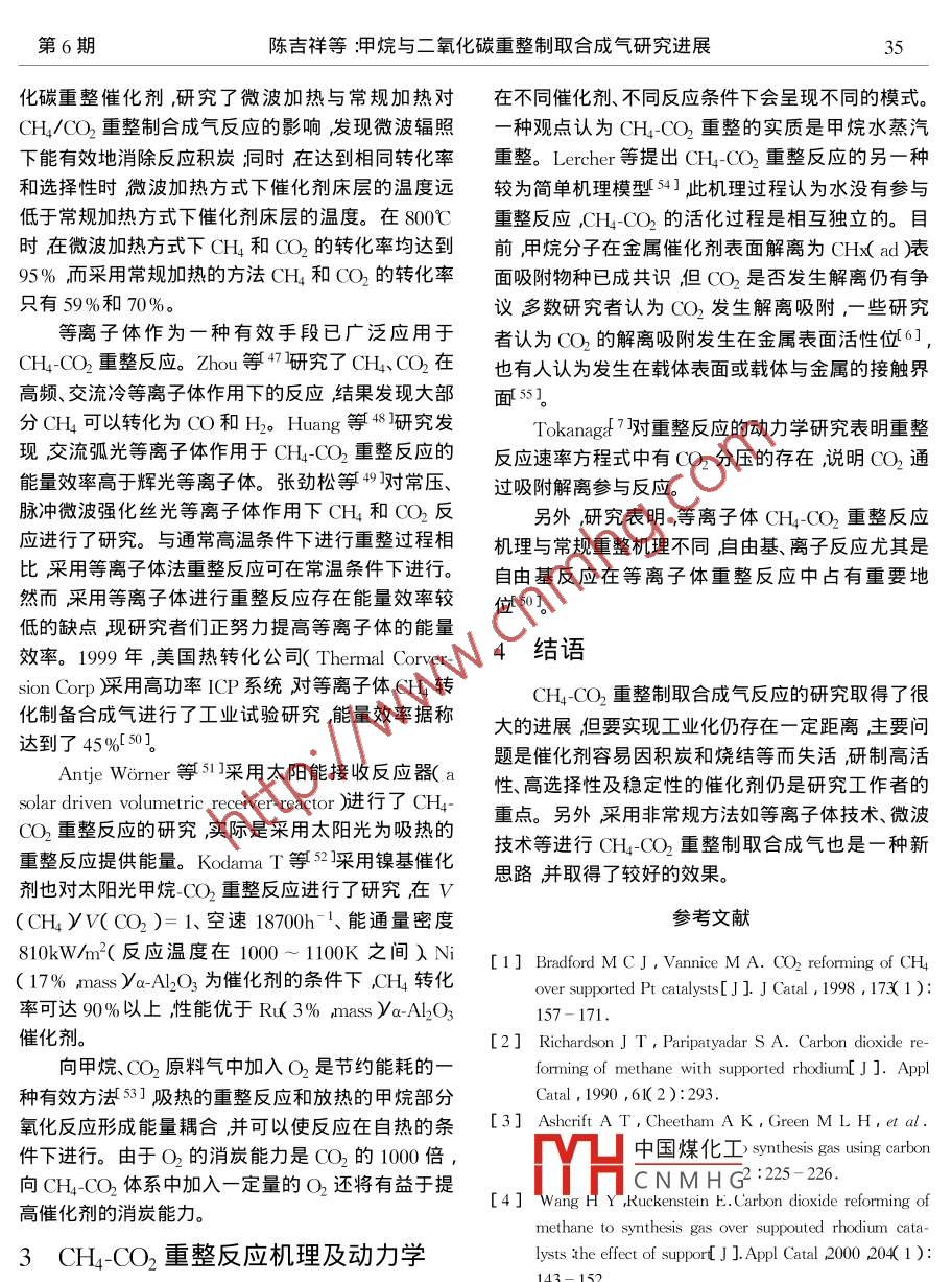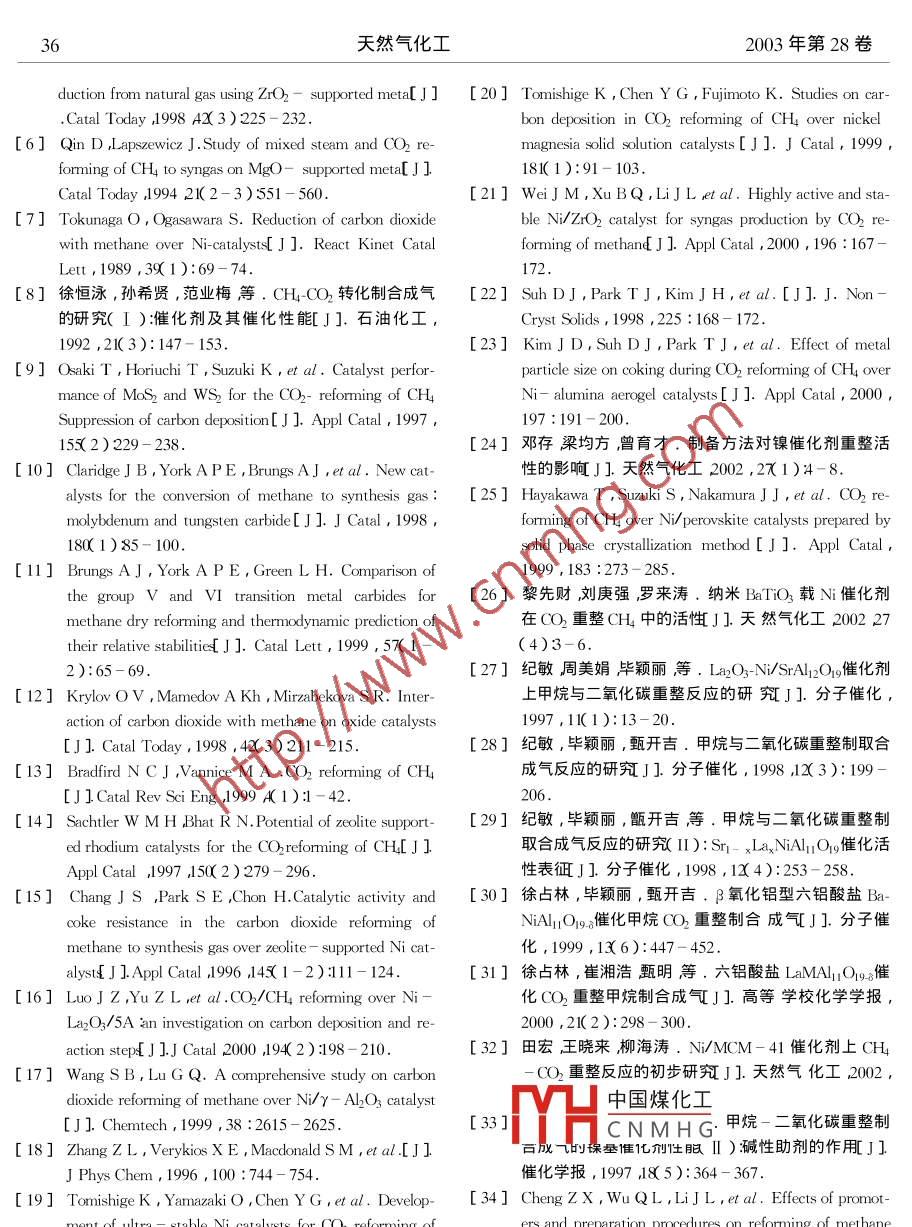 天然氣化工2003年第28卷甲烷與二氧化碳重整制取合成氣研究進展陳吉祥王日杰1張繼炎1蘇萬華2(1.天津大學化工學院催化科學與工程系天津3000722.天津大學內燃機燃燒學國家重點實驗室天津300072)摘要呷烷二氧化碳重整制取高附加值合成氣的過程是近十幾年來世界范圍的研究熱點之一該過程旳硏究具有重要的理論和實際意義。本文綜述了甲烷-二氧化碳重整制取合成氣反應的進展對重整催化劑、積炭過程、非常規(guī)供能方式在重整反應中的應用等進行了討論和分析。關鍵詞甲烷二氧化碳重整反應洽成氣載體助劑反應機理積炭中圖分類號⑩643文獻標識碼文章編號:001-92192003)632060前言研制高活性、高選擇性和高穩(wěn)定性的催化劑是CH4OO2重整反應實現(xiàn)工業(yè)應用的關鍵因素之天然氣在世界能源結構中的比例日趨增大而也是該領域研究中的重中之重。眾多研究者對甲烷和二氧化碳是兩大主要的溫室氣體并且許多CH4CO2重整催化劑活性組分載體、助劑制備方天然氣中都有一定濃度的二氧化碳如何有效利用法等進行了大量的探索獲得了許多有意義的結果二者為世界范圍內眾多研究者所關注。CH4CO2重1.1活性組分的研究整制取合成氣的過程是甲烷、二氧化碳利用的一條研究表明第VII族過渡金屬除O外均具有有效途徑該過程產生的含成氣中HOO比約為1,重整活性其中貴金屬催化劑具有較高的活性和抗可直接作為羰基合成及費托合成的原料1彌補了積炭性能13-61;非貴金屬催化劑則因積炭等原因甲烷水蒸氣重整生產合成氣中氫碳比H/(O比≥而失活較快幾種非貴金屬催化劑的活性順序為Ni3羧高的不足。另外該過程的開發(fā)和研究對緩解(o>Cu>F78]其中鎳基催化劑的活性可與貴能源危機、減少溫室氣體排放以改善人類的生存環(huán)金屬催化劑相媲美。目前,對貴金屬催化劑的研究境具有重要的意義。再有CHCO2重整反應可以主要見于國外研究者的報道考慮到貴金屬資源有作為能量儲備介質和進行能量的運輸2。早在限、價格昂貴國內外研究大多集中于非貴金屬Ni、1928年國外學者便對多種金屬催化劑在CH4(O2(o尤其Ni基催化劑的研究上,并通過對鎳基催化重整反應中的性能進行了研究。然而對該反應較劑進行結構的調變而改善其催化性能。為廣泛深入的研究始于20世紀90年代。1991年除第VIⅠ族過渡金屬外,些研究者發(fā)現(xiàn)MoAshcroft3在 Nature上發(fā)表了有關CH4CO2重整W的硫化物和碳化物10l及Mn的氧化物12催化劑的研究此引發(fā)了世界范圍內研究者對該均具有較好的反應活性和抗積炭性能。高比表面的過程的研究興趣。近十幾年來,世界各國的研究者M2CW2C表現(xiàn)了良好的重整活性和穩(wěn)定性01對該過程進行了大量研究取得了一定的進展。本其活性和抑制積炭能力可以與貴金屬相媲美,該催文就CHCO2重整反應催化劑積炭過程反應機化劑中國煤化工舌較快而提高反應壓理、非常規(guī)方式在重整反應中的應用等進行了綜述力其CNMHG1CH4(O2重整反應催化劑研究1.2載體的研究載體對催化劑性能起著極其重要的作用,它不收稿日期作者簡介陳吉祥1967-)男博士僅起物理支撐作用還可以與活性組分發(fā)生相互作聯(lián)系人:張繼疫022-27890865E-mil: jyzhang(用從而影響其結構和性能有的載體還有可能參與tju. edu.cno第6期陳吉祥等押甲烷與二氧化碳重整制取合成氣研究進展反應。CH4(O2重整催化劑主要是負載型金屬催化用共沉淀法制備的Ni.a3Mg.9O固溶體催化劑在劑由于重整反應在高溫糸件下進行才具有實際意(H-CO2重整反應中表現(xiàn)了極好的穩(wěn)定性該催化義所以選用的重整催化劑載體必須具有良好的熱劑可穩(wěn)定使用200以上而采用漫漬法制備的Ni穩(wěn)定性。目前重整催化劑使用的載體包括AL2O、(3m%yMO催化劑在反應幾個小時后就嚴重失MgO, siC2、TO2、ZO2、稀士金屬氧化物以及復合氧活。魏俊梅等21的研究發(fā)現(xiàn),以ZO,為載體時其化物A2O3- Cao-TiO、Al2O3- MgO Al2O3 Cao-Mgo粒徑大小對催化劑的性能產生很大的影響:以超細和分子篩等13-161其中Al2O、MgO及其復合氧化zOH)粒子(6mm)為載體制備的Ni/ZO2催化劑物使用較多。穩(wěn)定性明顯優(yōu)于以相對較大Z(OH)粒子18mm)載體的酸堿性對重整催化劑的結構和反應性能為載體制備的N/ZO2催化劑,在1030K、2.4有一定的影響。研究3表明,些金屬(如PP、10 ml/(g h)V( CH yV(CO2)=1/1的反應條件Rh等分散度與載體表面Lews酸呈函數(shù)關系,下前者反應600h尚未失活(甲烷的轉化率維持在原因很可能是金屬原子易于分散于Lwis酸中心80%以上)而后者失活很快在第6h時甲烷轉化率上。載體的酸堿性影響反應性能主要在于其對CO2為84.1%,反應進行到50h已降為63.0%。Kim的吸附性能的改變。GQLu等研究了№O3、等23-用溶膠凝膠超臨界干燥法制備的氣凝膠SiO2、La2O、MO、TO2活性炭等載體對鎳基催化催化劑NiA1O3的穩(wěn)定性明顯高于采用漫漬法制劑反應性能的影響結果表明以LaO、MgO為載備的催化劑。鄧存等241考察了浸漬法和共沉淀法體制備的催化劑具有較高的反應活性和穩(wěn)定性主對鎳基催化劑活性的影響。要原因之一就是二者的堿性強于其它載體,它們對些研究者還采用鈣鈦礦類化合物、六鋁酸鹽CO具有較強的吸附能力。作為重整催化劑的載體,取得了較好的結果。T些載體對O2具有很好的活化作用隊從而有 Hayakawa等25采用固相結晶( solid phase crystal利于抑