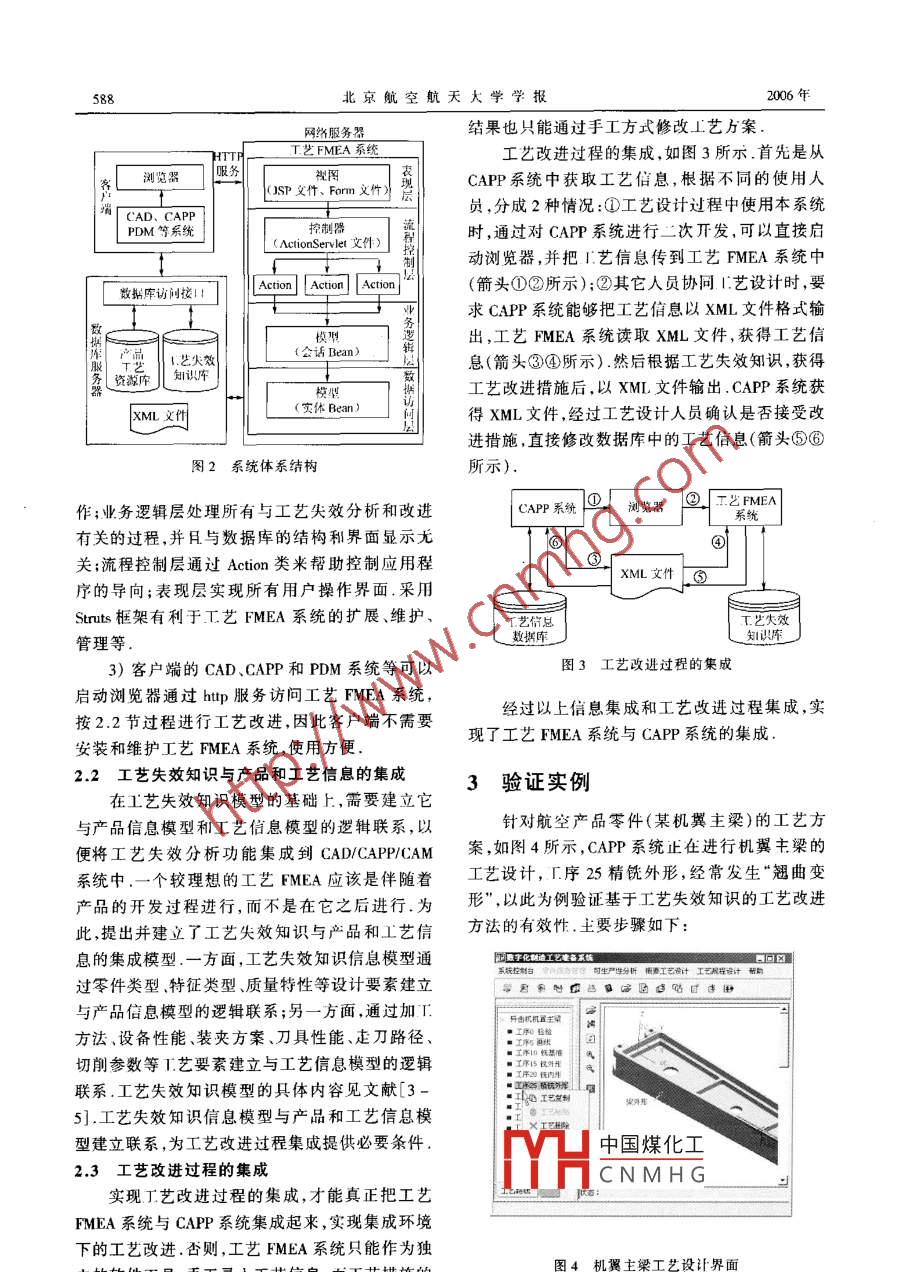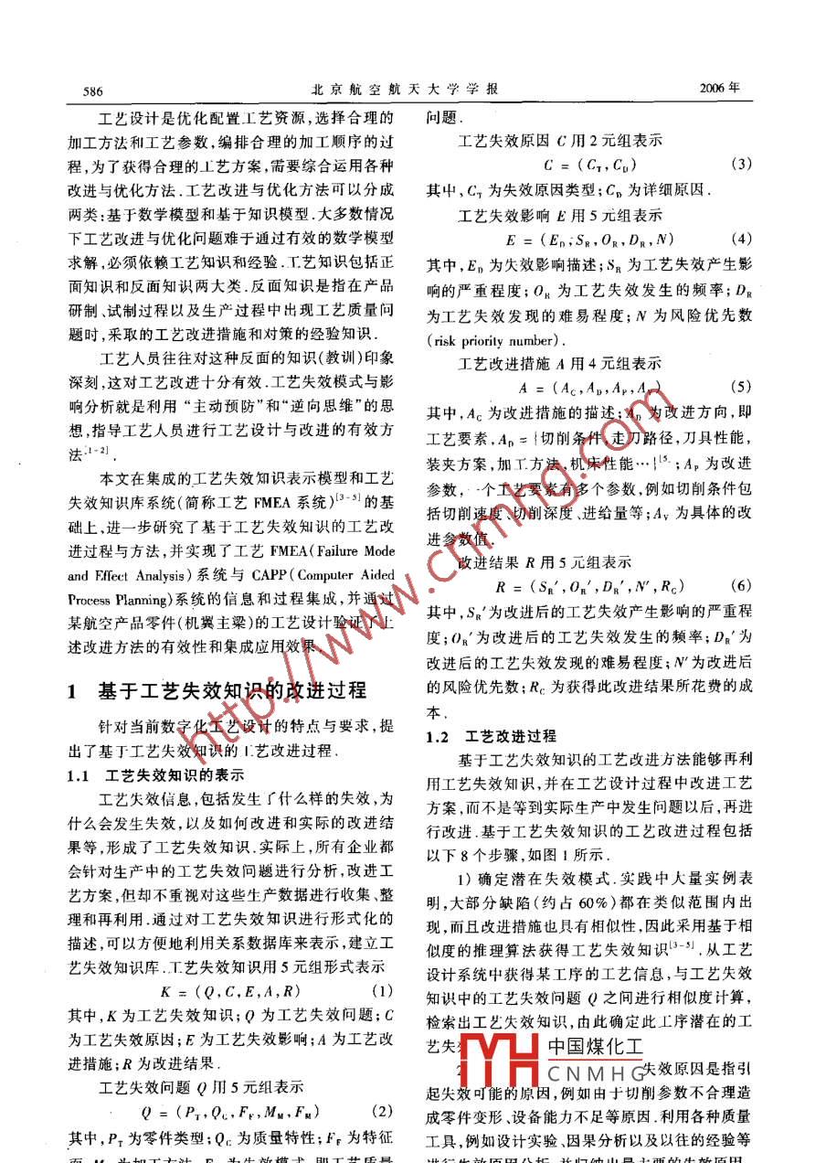 2006年5月北京航空航天大學學報X06第32卷第5期Journal of Beijing University of Aeronautics and AstronauticsVol 32 No 5基于工藝失效知識的工藝改進方法及實現(xiàn)魏麗鄭聯(lián)語劉日暉〈北京航空航天大學機械工程及自動化學院,北京100083)摘要:工藝設計是一個不斷改進與優(yōu)化的過程,而反面工藝知識即工藝失效知識對工藝改進與優(yōu)化往往十分有效,提出了一種基于工藝失效知識的改進方法,包括8個步驟確定潛在失效模式,分析潛在失效原因,計算風險優(yōu)先數(shù)N,提岀改進措施,計算改進后的鳳險優(yōu)先數(shù)N’,杈衡改進措施,釆納改進措施和存儲工藝改進數(shù)據(jù).在基于We的工藝失效知識庫管理系統(tǒng)—工藝FMFA( ailure Mode and Effect Analysis)的基礎上,通過建立工藝失效知識與產(chǎn)品和工藝信息的關(guān)聯(lián),實現(xiàn)工藝FMEA系統(tǒng)與CAPP( Computer Aided Process Planning)系統(tǒng)的信息集成和過程集成,從而達到工藝改進的目的給出某飛機結(jié)構(gòu)件(主梁)利用工藝失效知識進行工藝改進的驗證實例,為在工藝設計階段主動預防地改進工藝方案提供了一種有效手段關(guān)鍵詞:工藝設計;工藝改進;工藝失效知識;工藝失效模式與影響分析中圖分類號:TH164文獻標識碼:A文章編號:100-5965(2006)0540585-05Approach to process improvement based on process failure knowledge andits implementationWei Li Zheng Lianyu Iiu Riht(School of Mechurucal Engineering and Automation, Beijing University of Aeronautics and Astronautics, Beijing 100083, China)Abstract: Process planning is a continued improving and optimizing process, and reverse process knowledgenamely process failure knowledge which is experience of process improving measures where process quality problemsoccur in production, is quite effective to improve and optimize process solution. A process improvement approachbased on process failure knowledge was proposed, it includes eight steps: identifying potential failure mode, analyzing potential failure cause, counting risk priority number Nsing improvement action, counting risk prioritymumber N after improvement, tradeoff improvement actionting improvement action and saving process improvement data. On the basis of Web-based process failure knowledge management system(process FMEA, failureode and effect analysis ), the relationships between process failure knowledge and product and process informationwas established so as to implement the information and process integration between process FMEA and CAPP(com-puter aided process planning), and achieve effective process improvement. An airplane structural part( main girder)was used to validate process improvement utilizing process failure knowledge. This approach provides an effectivemeasure to actively other than passively improve process solution during process planningKey words: prnning; process improvement; process failure knowledge; process failure mode and ef中國煤化工CNMHG稿日期:200505-18基金項目:“十五”國防預研項日(41318124)j作藏據(jù)魏麗(1978-),女內(nèi)蒙古通遼人,博士生, candywei@ buaa,du,cm北京航空航天大學學報2006工藝設計是優(yōu)化配置工藝資源,選擇合理的問題加工方法和工藝參數(shù),編排合理的加工順序的過工藝失效原因C用2元組表示程,為了獲得合理的工藝方案,需要綜合運用各種(3)改進與優(yōu)化方法.工藝改進與優(yōu)化方法可以分成其屮,C1為失效原因類型;CD為詳細原因兩類:基于數(shù)學模型和基于知識模型.大多數(shù)情況工藝失效影響E用5元組表示下工藝改進與優(yōu)化問題難于通過有效的數(shù)學模型E=(En, SR, O, DR, N)求解,必須依賴工藝知識和經(jīng)驗.工藝知識包括正其中,En為失效影響描述;Sa為工藝失效產(chǎn)生影面知識和反面知識兩大類反面知識是指在產(chǎn)品響的嚴重程度;On為工藝失效發(fā)生的頻率;D研制、試制過程以及生產(chǎn)過程中出現(xiàn)工藝質(zhì)量間為工藝失效發(fā)現(xiàn)的難易程度;N為風險優(yōu)先數(shù)題時,采取的工藝改進措施和對策的經(jīng)驗知識TIs工藝人員往往對這種反面的知識(教訓)印象工藝改進措施A用4元組表示深刻,這對工藝改進十分有效.工藝失效模式與影A =(Ac, Ap, Ap, Ay)響分析就是利用“主動預防”和“逆向思維”的思其中,A為改進措施的描述;An為改進方向,即想,指導工藝人員進行工藝設計與改進的有效方工藝要素,A={切削條件,走刀路徑,刀具性能,法裝夾方案,加工方法,機床性能…6;A,為改進本文在集成的工藝失效知識表示模型和工藝失效知識庫系統(tǒng)(簡稱工藝FMEA系統(tǒng))的基參數(shù),個工藝要素有多個參數(shù),例如切削條件包礎上進一步研究了基于工藝失效知識的工藝改括切削速度、切削深度、進給量等;Ay為具體的改進過程與方法,并實現(xiàn)了工藝FMEA( Failure Mod進參數(shù)值改進結(jié)果R用5元組表示and Fffect Analysis)系統(tǒng)與CAPP( Computer AidedProcess Planning)系統(tǒng)的信息和過程集成,并通過R=(SR, OR, DR, N,Rc)某航空產(chǎn)品零件(機翼主梁)的工藝設計驗證了上其中,SB′為改進后的工藝失效產(chǎn)生影響的嚴重程述改進方法的有效性和集成應用效果度;On為改進后的工藝失效發(fā)生的頻率;D為改進后的工藝失效發(fā)現(xiàn)的難易程度;N為改進后基于工藝失效知識的改進過程的風險優(yōu)先數(shù);Rc為獲得此改進結(jié)果所花費的成針對當前數(shù)字化工藝設計的特點與要求,提12工藝改進過程出了基于工藝失效知識的藝改進過程基于工藝失效知識的工藝改進方法