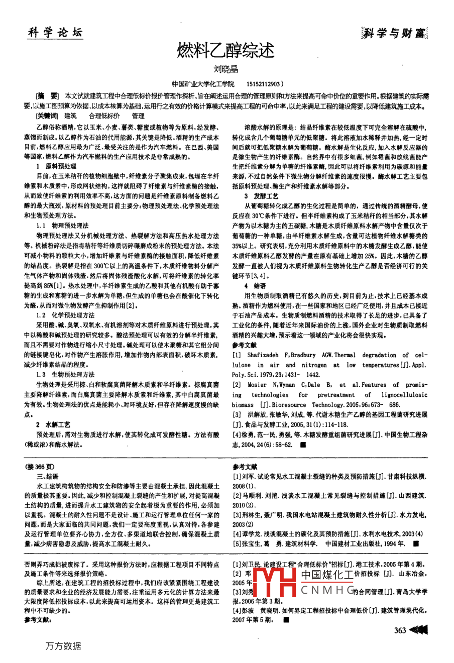 科學(xué)論壇科學(xué)與財(cái)富燃料乙醇綜述劉曉晶中國(guó)礦業(yè)大學(xué)化工學(xué)院15152112903)摘本文試就建筑工程中合理低標(biāo)價(jià)報(bào)價(jià)管理作探析旨在闡述運(yùn)用合理的管理原則和方祛來(lái)提髙可命中價(jià)位的重要作用。根據(jù)建筑的實(shí)際需要以施工圖預(yù)算為依據(jù)、以成本核算為基礎(chǔ)運(yùn)用行之有效的價(jià)格計(jì)算模式來(lái)提高工程的可命中率以此來(lái)滿(mǎn)足工程的建設(shè)需要,以降低建筑施工成本民關(guān)詞建筑合理低標(biāo)價(jià)管理乙醇俗稱(chēng)酒精它以玉米、小麥、薯類(lèi)糖蜜或植物等為原料經(jīng)發(fā)酵、濃酸水解的原理是:結(jié)晶纖維素在較低溫度下可完全溶解在硫酸中蒸餾而制成以乙醇作為石油的代用能源其關(guān)鍵是降低酒精的生產(chǎn)成本轉(zhuǎn)化成含幾個(gè)葡萄糖單元的低聚糖。將此溶液加水稀釋并加熱,經(jīng)一定時(shí)目前燃料乙醇應(yīng)用最為廣泛、最受關(guān)注的是作為汽車(chē)燃料。在巴西、美國(guó)間后就可把低聚糖水解為葡萄糖。酶水解是生化反應(yīng),加入水解反應(yīng)器的等國(guó)家燃料乙醇作為汽車(chē)燃料的生產(chǎn)應(yīng)用技術(shù)是非常成熟的是微生物產(chǎn)生的纖維素酶。自然界中有很多細(xì)菌例如霉菌和放線菌能產(chǎn)1原料預(yù)處理生把纖維素分解為單糖的纖維素酶因此可以將纖維素利用為碳源和能量目前在玉米秸稈的植物細(xì)胞壁中纖維素分子聚集成束包埋在半纖來(lái)源,不過(guò)自然條件下微生物分解纖維素的速度很慢。酶水解工藝主要包維素和木質(zhì)素中形成網(wǎng)狀結(jié)構(gòu)。這樣就阻礙了纖維素與纖維素酶的接觸,括原料預(yù)處理酶生產(chǎn)和纖維素水解等部分。從而致使纖維素的利用效率不高這方面的問(wèn)題是纖維素原料制備燃料乙3發(fā)酵工藝醇的最大瓶頸。原材料的預(yù)處理目前主要分:物理預(yù)處理法、化學(xué)預(yù)處理法從葡萄糖轉(zhuǎn)化成乙醇的生化過(guò)程是簡(jiǎn)單的,通過(guò)傳統(tǒng)的酒精酵母使和生物預(yù)處理方法反應(yīng)在30℃條件下進(jìn)行。但半纖維素構(gòu)成了玉米秸稈的相當(dāng)部分,其水解1.1物理預(yù)處理法產(chǎn)物為以木糖為主的五碳糖,木糖是木質(zhì)纖維原料水解產(chǎn)物中含量?jī)H次于物理預(yù)處理法又分機(jī)械處理方法、熱裂解方法和高壓熱水處理方法葡萄糖的一種單糖,由半纖維素水解生成,含量可達(dá)植物纖維水解糖類(lèi)的等,機(jī)械粉碎法是指將秸稈等纖維質(zhì)切碎碾磨成粉末的預(yù)處理方法。本法35%以上。研究表明,充分利用木質(zhì)纖維原料中的木糖發(fā)酵生成乙醇能使可減小物料的顆粒大小,增加纖維素與纖維素酶的接觸面積降低纖維素木質(zhì)纖維原料乙醇發(fā)酵的產(chǎn)量在原有基礎(chǔ)上增加25%。因此,木糖的乙醇的結(jié)晶度。熱裂解是指在300℃以上的高溫條件下,木質(zhì)纖維物料分解產(chǎn)發(fā)酵一直被人們視為木質(zhì)纖維原料生物轉(zhuǎn)化生產(chǎn)乙醇是否經(jīng)濟(jì)可行的關(guān)生氣體產(chǎn)物和固體殘?jiān)缓髮⒐腆w殘?jiān)峄?可將纖維素的轉(zhuǎn)化率鍵環(huán)節(jié)[3,4]提高到85%[1]。熱水處理中,半纖維素生成的乙酸和其他有機(jī)酸有助于寡4結(jié)語(yǔ)糖的生成和寡糖的進(jìn)一步水解為單糖但生成的單糖也會(huì)在酸催化下轉(zhuǎn)化用生物質(zhì)制取酒精已有悠久的歷史,到目前為止技術(shù)上已經(jīng)基本成為醛,從而對(duì)微生物發(fā)酵產(chǎn)生抑制作用[2]熟。酒精作為燃料使用在一些國(guó)家和地區(qū)已經(jīng)廣泛使用,并且成本已接近2化學(xué)預(yù)處理方法于石油產(chǎn)品成本,生物質(zhì)制燃料酒精的技術(shù)取得了長(zhǎng)足的進(jìn)步,已具備了采用酸堿、臭氧、雙氧水、有機(jī)溶劑等對(duì)木質(zhì)纖維原料進(jìn)行預(yù)處理,其工業(yè)化的條件隨著近年來(lái)國(guó)際油價(jià)的上漲,國(guó)外企業(yè)對(duì)生物質(zhì)制取燃料中以稀酸和堿預(yù)處理的研究較多。酸法預(yù)處理可以有效的分解半纖維素,酒精的興趣大增,預(yù)示著這一領(lǐng)域的產(chǎn)業(yè)化將會(huì)很快實(shí)現(xiàn)而且不需要對(duì)作物進(jìn)行縮小尺寸處理。堿處理可以使木聚糖和其它組分間參考文獻(xiàn)的鏈接鍵皂化,對(duì)作物產(chǎn)生溶脹作用,增加作物內(nèi)部表面積破壞木質(zhì)素,[l] Shafizadeh F, Bradbury AGR. Thermal degradation of cel-減少纖維素結(jié)晶的程度。lulose in air and nitrogen at low temperatures [J]. Appl1.3生物預(yù)處理方法Poly.Sci.1979,23:1431-1442生物處理是采用棕、白和軟腐真菌降解木質(zhì)素和半纖維素。棕腐真菌[2] Mosier N, Wyman C, Dale B,etl. Features of promis-主要降解纖維素,而白腐真菌主要降解木質(zhì)素和纖維素,其中白腐真菌最 ing technologies for pretreatment of lignocellulosic為有效。生物處理法的優(yōu)點(diǎn)是能耗小、對(duì)環(huán)境友好,但存在降解速度慢的缺 biomass[J]. Bioresource Technology.2005,96:673-6863]洪解放張敏華,劉成等代謝木糖生產(chǎn)乙醇的基因工程菌研究進(jìn)展2水解工藝[J.食品與發(fā)酵工業(yè)2005,31(1):114118預(yù)處理后,需對(duì)生物質(zhì)進(jìn)行水解,使其轉(