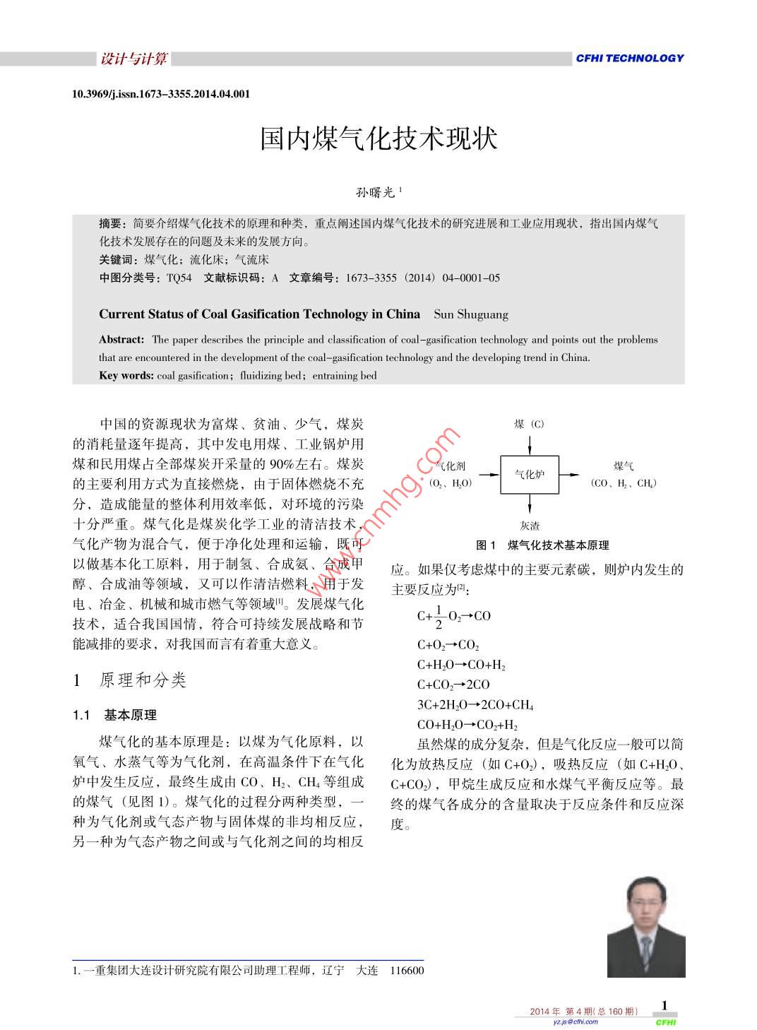 設(shè)計(jì)與計(jì)算 CFHI TECHNOLOGY10.39699issn11673-3355.2014.04.001國(guó)內(nèi)煤氣化技術(shù)現(xiàn)狀孫曙光摘要:簡(jiǎn)要介紹煤氣化技術(shù)的原理和種類,重點(diǎn)闡述國(guó)內(nèi)煤氣化技術(shù)的研究進(jìn)展和工業(yè)應(yīng)用現(xiàn)狀,指出國(guó)內(nèi)煤氣化技術(shù)發(fā)展存在的問題及未來的發(fā)展方向。關(guān)鍵詞:煤氣化;流化床;氣流床中圖分類號(hào):TQ54文獻(xiàn)標(biāo)識(shí)碼:A文章編號(hào):1673355(201404-0001-05 Current Status of Coal Gasification Technology in China Sun Shuguang Abstract: The paper describes the principle and classification of coal-gasification technology and points out the problems that are encountered in the development of the coal-gasification technology and the developing trend in China. Key words: coal gasification; fluidizing bed; entraining bed中國(guó)的資源現(xiàn)狀為富煤、貧油、少氣,煤炭煤(C)的消耗量逐年提高,其中發(fā)電用煤、工業(yè)鍋爐用煤和民用煤占全部煤炭開采量的90%左右。煤炭氣化劑氣化爐煤氣的主要利用方式為直接燃燒,由于固體燃燒不充(O2、H2O)(CO、H2、CH)分,造成能量的整體利用效率低,對(duì)環(huán)境的污染十分嚴(yán)重。煤氣化是煤炭化學(xué)工業(yè)的清潔技術(shù),灰渣氣化產(chǎn)物為混合氣,便于凈化處理和運(yùn)輸,既可圖1煤氣化技術(shù)基本原理以做基本化工原料,用于制氫、合成氨、合成甲應(yīng)。如果僅考慮煤中的主要元素碳,則爐內(nèi)發(fā)生的醇、合成油等領(lǐng)域,又可以作清潔燃料,用于發(fā)主要反應(yīng)為電、冶金、機(jī)械和城市燃?xì)獾阮I(lǐng)域。發(fā)展煤氣化技術(shù),適合我國(guó)國(guó)情,符合可持續(xù)發(fā)展戰(zhàn)略和節(jié)C+O2→o能減排的要求,對(duì)我國(guó)而言有著重大意義。C+O2→CO2C+h2O→o+H1原理和分類C+CO2→2C3c+2h2O→2CO+CH41.1基本原理CO+H2O→CO2+H2煤氣化的基本原理是:以煤為氣化原料,以雖然煤的成分復(fù)雜,但是氣化反應(yīng)一般可以簡(jiǎn)氧氣、水蒸氣等為氣化劑,在高溫條件下在氣化化為放熱反應(yīng)(如C+O2),吸熱反應(yīng)(如C+H2O、爐中發(fā)生反應(yīng),最終生成由CO、H2、CH4等組成C+CO2),甲烷生成反應(yīng)和水煤氣平衡反應(yīng)等。最的煤氣(見圖1)。煤氣化的過程分兩種類型,終的煤氣各成分的含量取決于反應(yīng)條件和反應(yīng)深種為氣化劑或氣態(tài)產(chǎn)物與固體煤的非均相反應(yīng),度。另一種為氣態(tài)產(chǎn)物之間或與氣化劑之間的均相反1.一重集團(tuán)大連設(shè)計(jì)研究院有限公司助理工程師,遼寧大連1166002014年第4期總160期)1 CFHI一重技術(shù)設(shè)計(jì)與計(jì)算1.2技術(shù)分類及命名對(duì)煤氣化技術(shù)的描述應(yīng)包括技術(shù)命名、技術(shù)分類和煤氣化技術(shù)發(fā)始于20世紀(jì)30年代,70年代氣化原料形態(tài),如:灰熔聚流化床粉煤氣化、二段是此技術(shù)的迅猛發(fā)展期,主要有兩次重大突破,第式氣流床干粉氣化、四噴嘴氣流床水煤漿氣化一次是工業(yè)制氧裝置的開發(fā),用氧氣代替空氣進(jìn)行等煤氣化;第二次是加壓氣化技術(shù)的開發(fā)。至今,已形成了多種大規(guī)模煤氣化工業(yè)技術(shù)。2國(guó)內(nèi)發(fā)展現(xiàn)狀及應(yīng)用煤氣化技術(shù)的分類和氣化爐有關(guān),氣化爐又稱2.1發(fā)展現(xiàn)狀煤氣發(fā)生器,是煤進(jìn)行氣化反應(yīng)的場(chǎng)所,是工藝裝置中的核心設(shè)備。傳統(tǒng)上按照煤在氣化爐中的流體在引進(jìn)國(guó)外各類型煤氣化技術(shù)的同時(shí),國(guó)內(nèi)也力學(xué)行為,分為固定床氣化、流化床氣化、氣流床投入了大量人力物力開展煤氣化技術(shù)的研究工作。氣化三種(見圖2)。固定床氣化一般使用塊煤或經(jīng)過幾十年的不懈努力,涌現(xiàn)出一批有代表性的煤煤焦為原料,篩分范圍6~50mm,原料煤從上部加化技術(shù),包括:灰熔聚氣化技術(shù)、兩段式氣化技入,氣化劑自下而上通過床層,產(chǎn)出的煤氣中含有術(shù)、四噴嘴氣化技術(shù)、非熔渣-熔渣分級(jí)氣化技烴類及焦油等。流化床氣化使用粒徑3~5mm的煤術(shù)、航天爐氣化技術(shù)、多原料漿氣化技術(shù)?!懔?同樣采用原料煤與氣化劑錯(cuò)流接觸的方式,由一個(gè)新的化工工藝流程思想要達(dá)到可以大規(guī)模于爐內(nèi)原料煤保持沸騰運(yùn)動(dòng)狀態(tài),整個(gè)床層溫度和工業(yè)化,要經(jīng)過五個(gè)階段。即小試、中試、工業(yè)化組成均勻,故煤氣中不含有焦油和酚類雜質(zhì)。氣流試驗(yàn)、示范廠、商業(yè)化工廠國(guó)內(nèi)這些技術(shù)正在產(chǎn)床氣化多使用粒度小于0.1mm的干煤粉或混合均業(yè)化道路上發(fā)展,基本上都處于示范階段,有的進(jìn)勻的水煤漿為氣化原料,與氣化劑以并流的方式在展的比較快一些,有幾個(gè)工廠已經(jīng)運(yùn)行,或者有幾個(gè)工程正在建設(shè),個(gè)別技術(shù)已經(jīng)開始向國(guó)外推廣爐內(nèi)進(jìn)行高溫高壓反應(yīng),煤氣中不含焦油等雜質(zhì),(見表1)。生產(chǎn)能力大。表1國(guó)內(nèi)正在開發(fā)的煤氣化技術(shù)煤氣化技術(shù)的命名方式有兩種,一種是根據(jù)該技術(shù)的工藝特點(diǎn)命名,如:灰熔聚氣化、二段式氣技術(shù)原料單爐投煤量(/d)開發(fā)單位化、四噴嘴氣化、多原料漿