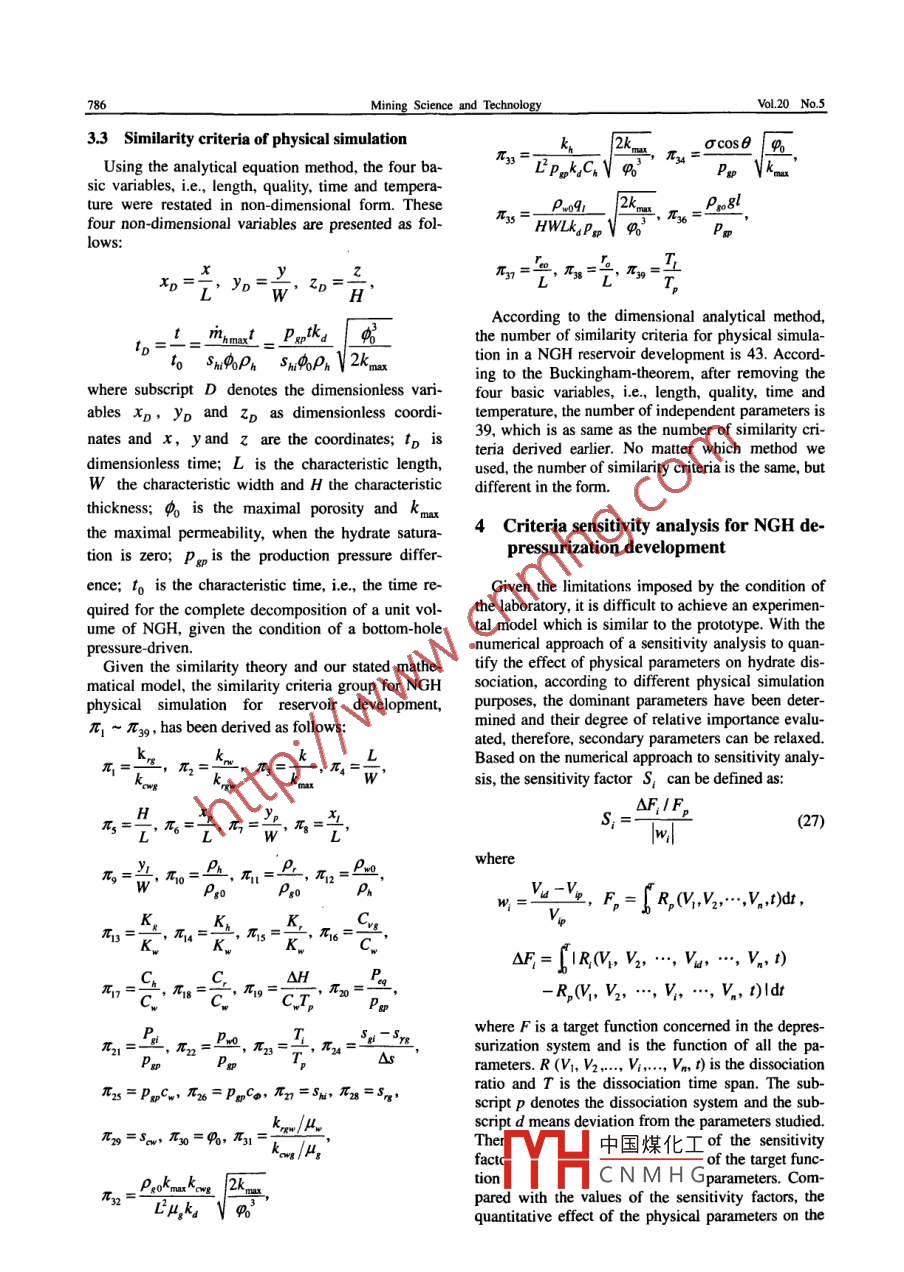 Availableonlineatwww.sciencedirect.comMININGScienceDirectSCIENCE ANDTECHNOLOGYELSEVIERMining Science and Technology 20(2010)0782-0788sevier. com/locate/jcumtSimilarity theory for the physical simulation ofnatural gas hydrate reservoir developmentLIU Yaping.2., CHEN Yueming, BAI Yuhu,LI ShuxiaSchool of Petroleum Engineering, China University of Petroleum, Dongying 257006, Chine2Globe Research Center, Exploration and Production Research Institute of SINOPEC, Beijing 100083, ChinaTechnology Research Department, CNOOC Research Center, Beijing 100027, ChinaAbstract: In order to apply physical simulation results to natural gas hydrate reservoir parameters to provide a theoretical frame-work for the design of a development plan, an analytical equation method was used to obtain the similarity criteria of natural gashydrate reservoir development by physical simulation, based on a mathematical model of natural gas hydrate development. Giventhe approach of numerical simulation, a sensitivity analysis for all parameters was carried out, which specifically demonstrated thatnitial temperature is the most important parameter. Parameters of thermal conductivity coefficients are not necessary for conduct-ing the NGH dissociation process, which will fundamentally simplify the design and establishment of the model. The analysisvides a sound theoretical basis and design principles for particular similarityKeywords: mathematical model; equation analysis; similarity criteria; nature gas hydrate; sensitivity analysis1 Introductionexperiments involving the same parameters withidentical measurements may still provide very differ-At present, Natural Gas Hydrate (NGH), a high- ent results. Developing such a physical simulationquality, clean and new solid energy source, repre- device does not simply require scaling down thesenting high-density enrichment, has a wide applica- NGH field conditions. It requires an understandingion and development potential to help meet and control of a large number of multi-scale physicallong-term energy demands. Based on a scientific and chemical phenomena, spanning in scale fromestimate the methane resources in NGH account for decimeters to hundreds of meters. Consequently, italmost twice the total methane resources in all fossil becomes necessary to apply the principles of similfuels(coal, oil and natural gas)worldwide. Along ity theory as a guide in physical simulation experiwith in-depth theoretical studies, laboratory research ments. Based on similarity theory, a similarity physi-and field practices for NGH, commercial exploitation cal model of NGH was constructed by scaling downof NGh has gradually become of primary interest". the prototype parameters. Subsequently, the physicalThe hydrate dissociation process involves many processes of the prototype would be reproduced accomplex mechanisms, which cannot be explained cording to specific similarity relations where, throughsatisfactorily by means of existing theories, field short-term, small-scale simulation experiments, thepractices or physical simulation(5-6) Compared with seepage process of hydrate reservoirs would be ob-field practices, physical simulation has many advan-served rapidly and the required parameters deter-tages, such as low-cost, short time prerequisites and minedeasy operation. A NGH physical simulation devicetypically integrates many fluid components and con- 2 Basic principles of the similarity theorytains functions simulating actual NGh reservoir con-ditions. Although a large number of hydrate dissocia-Similarity theory is a theory expressing similar re-tion experiments have been carried out, a unified un-tionships between the same phenomena, which canderstanding of NGH has not been formulated so far be described by the same formal equations, requiringand without the guidance of similarity theory, varioussImI中國(guó)煤化工 kind of physicalReceived 11 December 2009: accepted 22 February 2010*Corresponding author. Tel: 86 10 823381 14CNMHGonstructs of simiwcorem. the similardoi:10.1016/S16745264(09)60281-7and its inverseLIU Yaping et alSimilarity theory for the physical simulation ofSimilarity I theoremover the pressure-temperature equilibrium condition兀1=∫(丌2,丌3y…,mn)the hydrate in the neiwell dissociatest is a set of dimensionless groups. In this set, theThe NGH development process is a very complexvarious groups are independent from each other. Each process of seepage, which involves many intricatedimensionless group can be expressed by the multi- factors, such as the hydrate phase change(solid-liq-plication of the power of the other group. According uid-gas), hydrate dissociation dynamics, the changeto eq (1), all the relevant physical parameters of the of parameters, such as porosity, permeability andtwo systems can be exchanged by a constant ratio. As saturation, the flow dynamics between water and gaswell, if the physical process involves m basic dimen- and heat transfer and latent heat of phase change. Insions, the physical process can be expressed by n-m the present study, the following assumptions aredimensional groups, made up of n variablesmade: i)the aqueous phase contains only water,The similarity theorem: for all similar phenomena, methane gas dissolved in water is not considered; ii)at a corresponding moment, the same numerical crite- the synthesis and decomposition of NGH is unrelatedria have the same numerical value on the corre- to the salt concentration in the reservoir; iii)thesponding points.seepage of water and gas is consistent with DarcysThe inverse similarity theorem: for the same kind law and iv) the quality of transmission does not conof phenomena, if the single value conditions are same sider molecular and hydrodynamic diffusion.and under the condition of a single value, the corre- 3.2 Model formulationsponding criteria of stereotypes are the same as well,then these phenomena are called similarity phenom- 3.2.1 Infiltration equationprocess of dimensionless mathemat