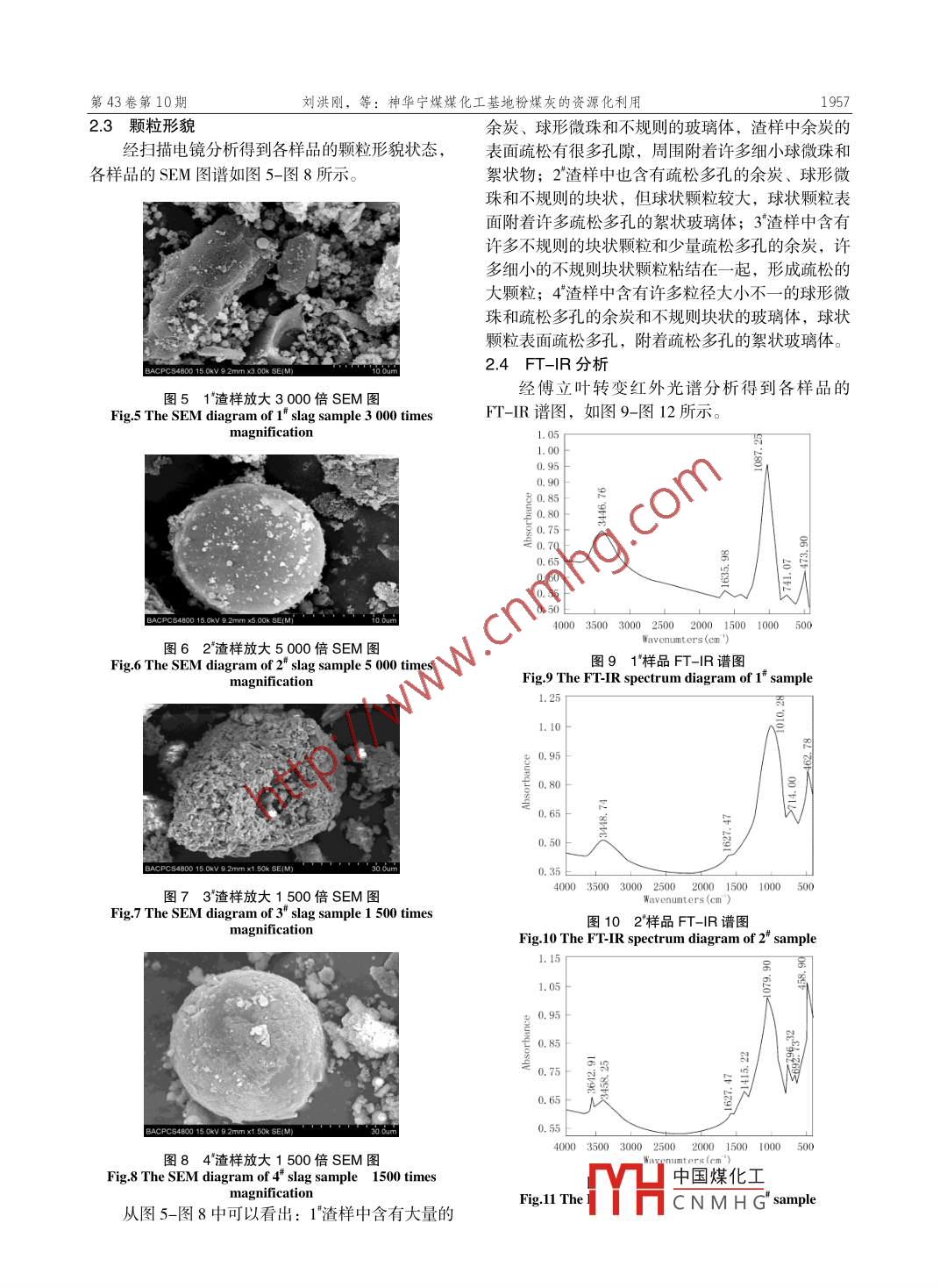 第43卷第10期代化Wo1.43,No.102014年10月Contemporary Chemical IndustryOctober, 2014神華寧煤煤化工基地粉煤灰的資源化利用劉洪剛,劉春萌,楊帥,井云環(huán)(神華寧夏煤業(yè)集團(tuán)煤炭化學(xué)工業(yè)分公司研發(fā)中心,寧夏銀川750411)要:簡(jiǎn)述了煤化工生產(chǎn)過(guò)程中產(chǎn)生的粉煤灰來(lái)源,通過(guò)RD、SEM、FI-IR等手段對(duì)氣化爐粉煤灰和鍋爐粉煤灰的性質(zhì)進(jìn)行檢測(cè),根據(jù)分析檢測(cè)結(jié)果,提岀了煤化工粉煤灰資源化綜合利用的建議。選用適宜的粉煤灰處理技術(shù),創(chuàng)建煤化工基地粉煤灰綜合處理示范項(xiàng)目,對(duì)基地粉煤灰利用乃至全國(guó)煤化工行業(yè)粉煤灰能源化利用都有重要的意義和積極的推動(dòng)作用關(guān)鍵詞:粉煤灰;利用;煤化工中圖分類(lèi)號(hào):TQ530文獻(xiàn)標(biāo)識(shí)碼:A文章編號(hào):1671-0460(2014)10-1955-04Resource Utilization of Fly ash From Ningdong Coal-ChemicalIndustrial Base of SNCG Coal Chemical Industry CompanyLIU Hong-gang, LIU Chun-Imeng, YANG Shuai, JING Yun-huan(r&D Center of SNCG Coal Chemical Industry Company, Ningxia Yincuan 750411, China)Abstract: The source of fly ash from the process of coal chemical production was introduced, the characteristicsof gasification furnace ash and boiler fly ash were detected by XRD, SEM, FT-IR and other means. According tothe test results, some suggestions on comprehensive utilization fly ash in coal chemical industry were put forward.Selecting appropriate fly ash treatment technology to create a demonstration project of comprehensive fly ashKey words: Fly ash; Utilization; Coal chemical indust寧東是國(guó)家批準(zhǔn)建設(shè)的13個(gè)億噸級(jí)大型媒炭基1實(shí)驗(yàn)部分地之一,并列為國(guó)家規(guī)劃建設(shè)的6個(gè)大型煤電基地和7個(gè)煤化工基地。神華寧夏煤業(yè)集團(tuán)結(jié)合企業(yè)自1.1實(shí)驗(yàn)樣品及預(yù)處理身實(shí)際,在寧東能源化工基地(A區(qū))規(guī)劃建設(shè)了分別取不同氣化爐及鍋爐產(chǎn)生的粉煤灰樣品。批煤化工項(xiàng)目。僅現(xiàn)已建成投產(chǎn)的85萬(wàn)ta甲醇將樣品編號(hào)后,在鼓風(fēng)干燥箱中110℃烘6h去掉50萬(wàn)a煤基烯烴項(xiàng)目和6萬(wàn)h聚甲醛項(xiàng)目每年共樣品的水分,最后粉磨至300目待測(cè)。樣品與其對(duì)產(chǎn)生粉煤灰約200萬(wàn)t;目前在建項(xiàng)目主要有50萬(wàn)應(yīng)編號(hào)見(jiàn)表1ta甲醇制烯烴、400萬(wàn)ta煤炭間接液化項(xiàng)目,后期表1渣樣編號(hào)還將開(kāi)工建設(shè)40億m煤制天然氣項(xiàng)目,這些煤化Table 1 The sample number工項(xiàng)目陸續(xù)投產(chǎn)后還將產(chǎn)生更大量的粉煤灰。粉煤灰樣品灰水濾餅水煤漿氣化渣鍋爐渣干煤粉氣化渣我公司煤化工項(xiàng)目粉煤灰排放主要來(lái)源有」1.2表征個(gè):一部分為氣化爐粉煤灰;另一部分為動(dòng)力鍋爐21X射線粉末衍射分析(XRD)粉煤灰;再一部分為氣化灰水處理工段壓濾機(jī)濾餅用于鑒定樣品的物相組成。X射線粉末衍射儀由于煤在氣化爐和鍋爐中燃燒的氣氛不同,因此燃為日本理學(xué)Dmax-200型,銅靶(CuKa),掃描燒后的灰渣性質(zhì)差異較大。范圍2.5°~45°(2θ),掃描速率:2/min,步寬0.02°,通過(guò)XRD、SEM、FT-R等分析手段對(duì)氣化爐管電壓40kv,管電流34mA,石墨單色器,連續(xù)掃粉煤灰和鍋爐粉煤灰的特性進(jìn)行比較分析,并且根描。據(jù)檢測(cè)分析結(jié)果,提出了粉煤灰資源化綜合利用的1.2.2掃描電建議。用于觀察中國(guó)煤化工Hitachi s-CNMHG收稿日期:2014-03-31作者簡(jiǎn)介:劉洪剛(1982-),男,遼寧朝陽(yáng)人,工程師,碩士,2009年畢業(yè)于遼寧石油化工大學(xué)化學(xué)工藝專(zhuān)業(yè),研究方向:從事煤質(zhì)與氣化技術(shù)研究工作。E-mail:liuhonggang0l@nxmy.com。19562014年10月4800型場(chǎng)發(fā)射掃描電鏡,工作距離8.8~8.9mm,分含量最高的均為SO2,除1樣品外其他樣品均超電壓5kV過(guò)了40%;AlO3含量在13.24%~1918%之間;Fe2O312.3傅立葉轉(zhuǎn)變紅外光譜(FT-IR)含量除1樣品外,其他樣品均在12.5%以上;CaO采用KBr壓片法。 Nicolet nexus-6700型傅立含量在6.44%~12.39%之間;SO3除了4"樣品含量偏葉轉(zhuǎn)變紅外光譜儀表征其紅外吸收特征,掃描范圍高以外,其它含量較低。400~4000cm22物相分析124X射線熒光光譜分析(XRF)經(jīng)X射線粉末衍射分析得到各樣品的物相組用于鑒定樣品化學(xué)成分含量。樣品經(jīng)850℃煅成,各樣品的XRD圖譜如圖1-圖4所示燒3h除掉燒失量后進(jìn)行測(cè)試。由圖1-圖4分析可知:1樣品的XRD譜圖中主要2結(jié)果與討論為“饅頭狀”衍射峰,說(shuō)明玻璃相含量較高;此外,還含有極小的石英衍射峰,說(shuō)明其中還含有極少量2.1化學(xué)組成石英。2、4樣品主要為“饅頭狀”衍射峰,說(shuō)明不同礦煤燃燒后產(chǎn)生的粉煤灰中礦物組成含其玻璃相含量較高,出現(xiàn)的石英衍射峰比1高而且量會(huì)有一定的差異,經(jīng)X射線熒光分析得到各樣品尖銳,說(shuō)明其石英晶相較1樣品多。3樣品的Ⅹ射的主要化學(xué)成分含量,具體數(shù)據(jù)見(jiàn)表2。線衍射峰高而且尖銳,主晶相為石英、石膏和赤鐵由表2數(shù)據(jù)分析可知:1樣品的燒失量高達(dá)礦,此外,還含有極少部分玻璃相物質(zhì)。27%,說(shuō)明其中含有大量的余炭;各樣品中化學(xué)成表2各樣品主要化學(xué)成分含量Table 2 The main chemical components of the