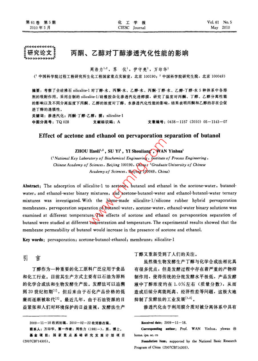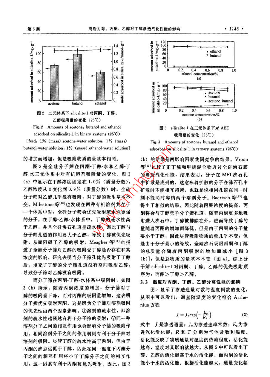 第61卷第5期化工學報VoL 61 No 52010年5月CIESc JournalMay 2010研究論文丙酮、乙醇對丁醇滲透汽化性能的影響周浩力2,蘇儀1,伊守亮1,萬印(中國科學院過程工程研究所生化工程國家重點實驗室,北京100190;2中國科學院研究生院,北京100049)摘要;考察了全硅沸石 silicalite1對丁醇-水、丙酮水、乙醇-水、丙酮丁醇水、乙醇丁醇水5種體系中各溶劑的吸附作用。采用自制的 silicalite-1/硅橡膠雜化滲透汽化透醇膜,研究了溫度對丙酮、丁醇、乙醇分離性能的影響以及不同分離溫度下丙酮、乙醇的濃度對丁醇、水滲透汽化性能的影響,結果表明丙酮和乙醇的存在會促進丁醇的透膜性關鍵詞:滲透汽化;丙酮丁醇乙醇;膜; silicalite1中圖分類號:TQ028文獻標識碼:A文章編號:0438-1157(2010)05-1143-07Effect of acetone and ethanol on pervaporation separation of butanolZHOU Haoli SU Yi, YI Shouliang, WAN Yinhua( National Key Laboratory of Biochemical Engineering, Institute of Process EngineeringChinese academy of Sciences, Beijing 100190, China 'Graduate University of ChineseAcademy of Sciences, Beijing 100049, China)Abstract: The adsorption of silicalite-l to acetone, butanol and ethanol in the acetone-water, butanol-water,and ethanol-water binary mixtures, and acetone-butanol-water and ethanol-butanol-water ternarymixtures was investigated. With the home-made silicalite-1/silicone rubber hybrid pervaporationmembranes, pervaporation separation of butanol-water, acetone-water, ethanol-water binary solutions wasexamined at different temperature. The effects ofacetone and ethanol on pervaporation separation ofbutanol were studied at different concentration and temperature. The experimental results showed that themembrane permeability of butanol would increase in the presence of acetone and ethanol.Key words: pervaporation; acetone-butanol-ethanol; membrane; silicalite-1引言丁醇又重新受到了人們的關注。雖然微生物發(fā)酵生產(chǎn)丁醇與化學合成法相比具丁醇作為一種重要的化工原料廣泛應用于食品有很多優(yōu)點,但是發(fā)酵過程中存在著嚴重的產(chǎn)物抑和化工行業(yè)。目前其生產(chǎn)方式主要有以石油為原料制作用,使得傳統(tǒng)的分批發(fā)酵水平極低,產(chǎn)品發(fā)酵的化學合成法和生物發(fā)酵生產(chǎn)法。發(fā)酵法可以追溯液中丁醇濃度約在1.0%左右(質(zhì)量分數(shù)),從而到20世紀初期,但后來由于石化產(chǎn)品價格的低造成后續(xù)分離能耗高、經(jīng)濟性差等問題,這極大地廉而逐漸被取代2。最近幾年,由于石油資源的日抑制了發(fā)酵法的工業(yè)發(fā)展益緊張和人們對環(huán)境保護的日益重視,發(fā)酵法生產(chǎn)滲透汽化由于利用膜介質(zhì)對被分離體系中具有2009-11-18收到初稿,2010-02-22收到修改稿。Received date: 2009-11-18.聯(lián)系人:萬印華,第一作者:周牿力(1981-),男,博士,Corresponding author: Prof. WAN Yinhua, yhwan基家重點基礎研究發(fā)展計劃項目2007CB714305)。Foundation item: supported by the National Basic Research·1144化工學報第61卷不同理化性質(zhì)的各組分的吸附、溶解、擴散速度的及滲透液組分利用氣相色譜儀分析。分離性能指標不同而實現(xiàn)分離,并且其具有能耗低,不會對細胞為分離因子和通量產(chǎn)生毒性等優(yōu)點而廣泛用于生物發(fā)酵產(chǎn)品的原位通量:分離。采用發(fā)酵與滲透汽化膜耦合的方法將產(chǎn)物及時分離因子:(2)移出發(fā)酵體系,不僅可以解決產(chǎn)物反饋抑制問題,式中W是透過液質(zhì)量,g;t為時間,h;A為有還可以對產(chǎn)物起到一定的濃縮作用,以利于后續(xù)處效膜面積,m2;P和a分別為透過側(cè)和原料側(cè)的理,降低能耗。在ABE發(fā)酵過程中,丁醇是主要質(zhì)量分數(shù),g·g-1;下角標b和w分別代表丁醇產(chǎn)物,也是主要的抑制物質(zhì)因此,丁醇的及時和水移出對發(fā)酵產(chǎn)率的提高至關重要。而在ABE發(fā)酵中還存在丙酮、乙醇、酸類、鹽類等物質(zhì),這些物質(zhì)的存在將可能影響膜的分離性能,進而影響丁醇的提取。徐玲芳等研究了葡萄糖、甘油、丁二酸的6添加對PDMS聚合物膜滲透汽化性能的影響,結果表明,3種有機物的存在對滲透汽化膜性能影響不大;侯丹等研究了無機鹽類的存在對滲透汽化分離乙醇水溶液的影響,研究表明,鹽離子的存在圖1滲透汽化過程示意圖會增加滲透汽化膜的選擇性。而對于總濃度約占丁Fig 1 Diagram of pervaporation process醇濃度的2/3,理化性質(zhì)與丁醇相似的丙酮和乙醇1-feed tank: 2-water bath: 3-peristaltic pump:對丁醇滲透汽化性能的影響則較少進行系統(tǒng)、深入flowmeter; 5-membraner 6-triple valve7-cold trap 8-vacuum pump的研究。本文圍繞丙酮、乙醇對丁醇滲透汽化性能的影響開展了系統(tǒng)研究,以期為該技術在丁發(fā)酵2實驗結果與討論生產(chǎn)上的規(guī)?;瘧锰峁┏醪降睦碚摵蛯嶒灮A2.1全硅分子篩對丙酮/丁醇/乙醇的吸附1實驗滲透汽化實驗所使用的膜為自制的全硅沸石1.1實驗材料PDMS雜化膜,即在硅橡膠中添加全硅分子篩正丁醇、丙酮、乙醇、正庚烷均為分析純,購 silicalite-1是一種具有獨特三維空間結構的疏水性自北京化工試劑廠;硅橡膠(PDMS),GE公司;分子篩,孔道直徑接近丁醇等的動力學直徑0全硅沸石( silicalite-1),實驗室自制。因此當其添加入聚合物膜后,由于分子篩吸附作氣相色譜儀( aglient7890),美國 Aglient公用、疏水作用等原因可以顯著提高聚合物膜的分離司,色譜柱為 Zebron ZB- wAX毛細管柱,FID檢性能。為了更好