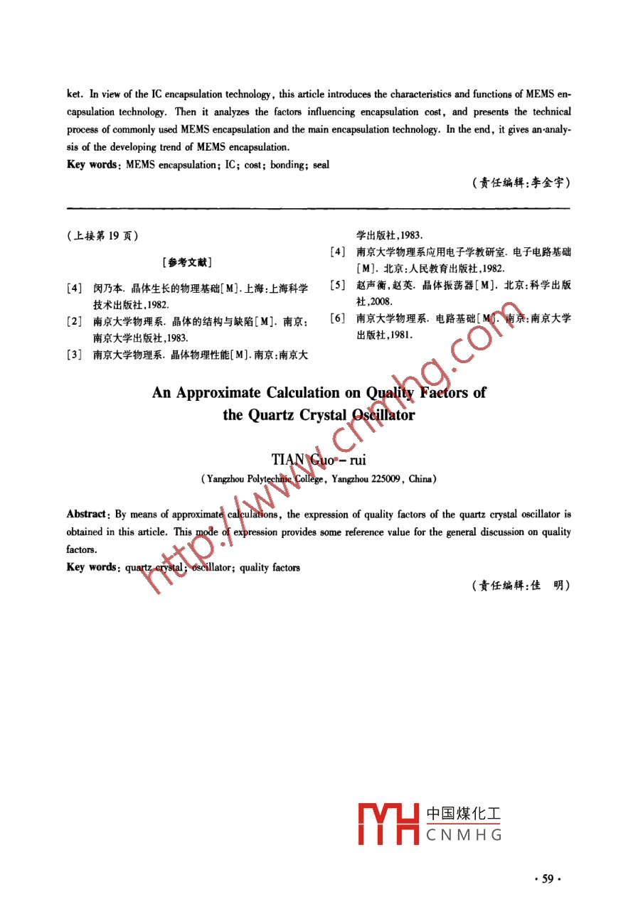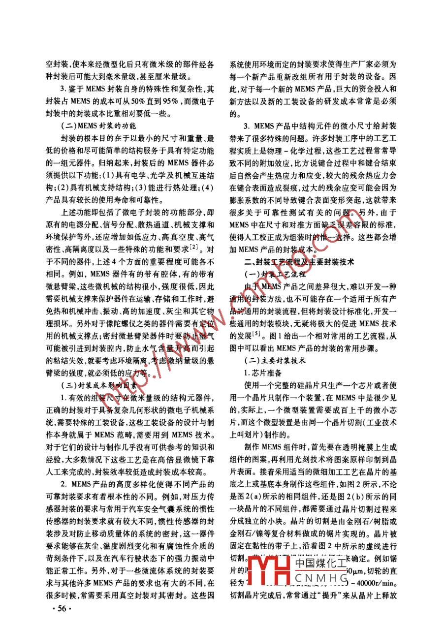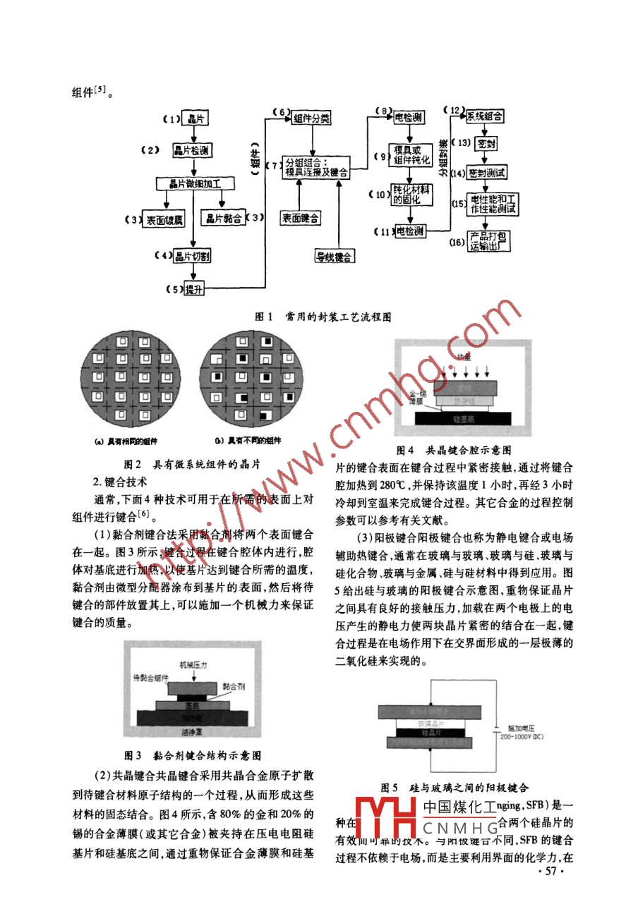 2009年9月.揚(yáng)州教育學(xué)院學(xué)報(bào)Sept. 2009第27卷第3期JournalY angzhou College of EducationVol.27 ,No.3MEMS的封裝技術(shù)趙翔,梁明富(揚(yáng)州職業(yè)大學(xué),江蘇揚(yáng)州225009)摘要: 相對(duì)于目前MEMS器件或系統(tǒng)的設(shè)計(jì)與制作技術(shù),落后的封裝技術(shù)已成為制約MEMS產(chǎn)品進(jìn)入市場(chǎng)的瓶頸。針對(duì)IC封裝技術(shù),介紹了MEMS封裝技術(shù)特點(diǎn)和功能,分析了封裝成本的影響因素,并給出了常用MEMS封裝的工藝流程和主要封裝技術(shù),最后,對(duì)MEMS封裝的發(fā)展趨勢(shì)做了分析。關(guān)鍵詞: MEMS封裝;|C;成本;鍵合;密封中圈分類號(hào): TH-39文獻(xiàn)標(biāo)識(shí)碼: A文章編號(hào): 1008 -6536(2009)03 -0055 -05微電子機(jī)械系統(tǒng)( MEMS)是由感知外界信息工藝功能和信號(hào)接口等方面存在諸多差別,要想?yún)?力熱、光、磁、化等)的微傳感器、控制對(duì)象的微執(zhí)照IC封裝技術(shù)標(biāo)準(zhǔn)來對(duì)MEMS進(jìn)行標(biāo)準(zhǔn)化封裝,必行器、信號(hào)處理和控制電路通訊接口和電源等部件須找出MEMS封裝與微電子封裝的異同點(diǎn)[2]。組成的一體化的微型機(jī)電系統(tǒng)[川。MEMS 技術(shù)的1.微電子封裝通常分三個(gè)層次,即單芯片和多目標(biāo)是把信息的獲取、處理和執(zhí)行集成在一.起,組成芯片組件的一級(jí)封裝,將- - 級(jí)封裝和其他元器件一具有多功能復(fù)合的微型智能系統(tǒng)。同組裝到單層或多層PWB(印制電路板)或其他基我國從20世紀(jì)80年代末開始MEMS的研究,板上的二次封裝(插板封裝) ,以及將二級(jí)封裝插裝但同發(fā)達(dá)國家相比,仍存在較大的差距,在MEMS的到多層母板上的三級(jí)封裝。產(chǎn)業(yè)化方面表現(xiàn)得尤為突出。原因在于對(duì)MEMS封而MEMS封裝則通常分為芯片級(jí)封裝、器件級(jí)裝的認(rèn)識(shí)一直落后于MEMS器件的研究,封裝已成封裝和系統(tǒng)級(jí)封裝這樣三個(gè)層次。需要特別指出的為妨礙MEMS商業(yè)化的主要技術(shù)瓶頸。是,這里的“芯片級(jí)"含義更加廣泛,不但涵蓋包括.- .MEMS封裝概述控制器在內(nèi)的微電子封裝中的各種芯片,還包括感目前,大量的MEMS器件仍然停留在實(shí)驗(yàn)室階測(cè)的各種力、光、磁、聲、溫度、化學(xué)、生物等傳感器元段,沒能形成產(chǎn)品在軍事和民用領(lǐng)域中充分發(fā)揮其器件和執(zhí)行運(yùn)動(dòng).能量、信息等控制量的各種部件。功用,主要原因是MEMS器件的封裝問題沒能得到總的來說, MEMS封裝是建立在微電子封裝基礎(chǔ)上很好的解決。包括組裝和測(cè)試在內(nèi)的封裝實(shí)質(zhì)上是的,并沿用了許多微電子封裝的工藝技術(shù),但通常又影響MEMS產(chǎn)品總生產(chǎn)成本的主要因素,封裝成本比微電子封裝更龐大、更復(fù)雜、更困難-一些。太高限制了部分產(chǎn)品在市場(chǎng)上的競(jìng)爭(zhēng)力。因此,找2. MEMS 封裝對(duì)減小體積的要求比微電子封出封裝難度過大封裝成本過高的原因,采用相應(yīng)措裝迫切,對(duì)3D封裝的要求尤為強(qiáng)烈。因?yàn)镸EMS施來推動(dòng)MEMS的發(fā)展,已成為很多研發(fā)人員把封的各種元器件及部件,特別是執(zhí)行部件等,為了提高裝視為成功商業(yè)化的惟-最亟待解決的關(guān)鍵問題。組裝密度,不可能只在平面內(nèi)展開,而必然向3D方(一)MEMS封裝的特點(diǎn)向延伸[3,4]。而高可靠要求的MEMS產(chǎn)品,既要求由于MEMS技術(shù)與IC技術(shù)相比在材料、結(jié)構(gòu)、采用氣密封裝 而其些可動(dòng)部件機(jī)械元件又要求真中國煤化工收稿日期: 2009-04-28 .YHCNMHG作者簡(jiǎn)介:趙翔(1975-),女,楊州職業(yè)大學(xué)機(jī)械工程學(xué)院講師;梁明富(1973-), 男,揚(yáng)州職業(yè)大學(xué)招生就業(yè)處講師。.●55●空封裝,使本來經(jīng)微型化后只有微米級(jí)的部件經(jīng)各系統(tǒng)使用環(huán)境而定的封裝要求使得生產(chǎn)廠家必須為種封裝后可能大到毫米量級(jí),甚至厘米量級(jí)。每一個(gè)新產(chǎn)品重新改組所有用于封裝的設(shè)備。因3.鑒于MEMS封裝自身的特殊性和復(fù)雜性,其此,對(duì)于每一個(gè)新的MEMS產(chǎn)品,巨大的資金投人和封裝占MEMS的成本可從50%直到95%,而微電子新方法以及新的工裝設(shè)備的研發(fā)成本常常是必須封裝中的封裝成本比重相對(duì)要低--些。的。(二)MEMS封裝的功能3.MEMS產(chǎn)品中結(jié)構(gòu)元件的微小尺寸給封裝封裝的根本目的在于以最小的尺寸和重量、最帶來了很多特殊的問題。許多封裝I序中的工藝工低的價(jià)格和盡可能簡(jiǎn)單的結(jié)構(gòu)服務(wù)于具有特定功能程實(shí)質(zhì)上是物理-化學(xué)過程,這些工藝過程常常導(dǎo)的一組元器件。歸納起來,封裝后的MEMS器件必致不同的附加效應(yīng),比方說鍵合過程中和鍵合結(jié)束須提供以下功能:(1)具有電學(xué)、光學(xué)及機(jī)械互連結(jié)后自然會(huì)產(chǎn)生熱應(yīng)力和應(yīng)變,較大的殘余熱應(yīng)力會(huì)構(gòu);(2)具有機(jī)械支持結(jié)構(gòu);(3)能進(jìn)行熱處理;(4)在鍵合表面造成裂痕,過大的殘余應(yīng)變可能會(huì)因?yàn)楫a(chǎn)品具有較長(zhǎng)的使用壽命和可靠性。膨脹系數(shù)的不同導(dǎo)致鍵合表面變形突起,這就帶來上述功能