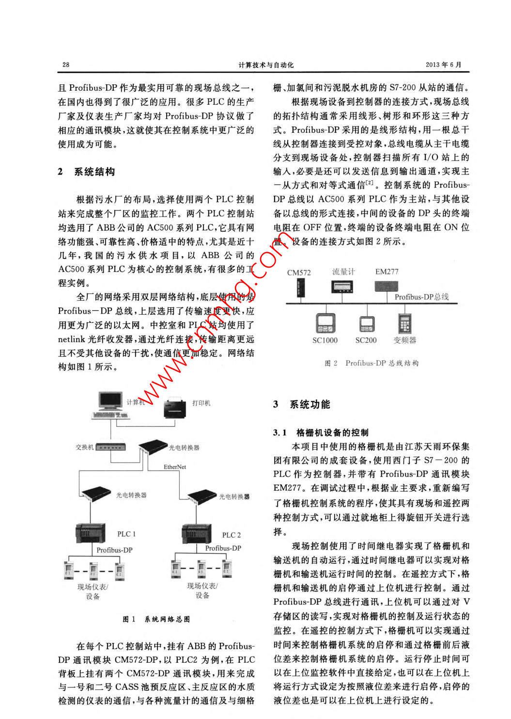 第32卷第2期計算技術(shù)與自動化Vo.32,No.22013年6月Computing Technology and AutomationJun,2013文章編號:1003-6199(2013)02-0027-03現(xiàn)場總線在污水廠中的應(yīng)用王樹東2,金魯東1,何巍3(1.蘭州理工大學(xué)電氣與信息工程學(xué)院,甘肅蘭州730050;2.甘肅省工業(yè)過程先進控制重點實驗室,甘肅蘭州7300503.甘肅省電力公司電力科學(xué)研究院,甘肅蘭州730000摘要:隨著自動化程度的不斷提高,污水廠的控制系統(tǒng)中的智能儀表及現(xiàn)場總線的應(yīng)用越來越廣泛,但隨之而來的是各種儀表通訊協(xié)議的選擇和現(xiàn)場總線的選擇。各設(shè)備廠家設(shè)備支持的通訊協(xié)議不盡相同,為此,在污水處理控制系統(tǒng)的設(shè)計中,選擇 Profibus-DP作為全廠的總線協(xié)議,并將其它總線協(xié)議轉(zhuǎn)換為Profibus-DP協(xié)議,使污水處理廠的現(xiàn)場總線結(jié)構(gòu)統(tǒng)一,提高了系統(tǒng)的可靠性,這在系統(tǒng)的網(wǎng)絡(luò)設(shè)計中具有」定的推廣價值。關(guān)鍵詞 Profibus-DP;現(xiàn)場總線;僅表;污水處理中圖分類號:TP273.5獻標識碼:AApplication of Field Bus in the Wastewater Treatment PlantWANG Shu-dong. 2, JIN Lu-dong, HE We(1. College of Electrical and Information Engineering, Lanzhou University of Technology, Lanzhou 730050;2. Key Laboratory of Gansu Advanced Control for Industrial Processes, Lanzhou 7300503. Electric Power Research Institute of Gansu Provincial Power Company, Lanzhou 730000, China)Abstract With the continuous improvement of the degree of automation, the use of intelligent instrumentation and fieldbus become more and more widely in the wastewater treatment plant control system. But a variety of instrument communication protocol selection and choice of field bus are followed. Equipment manufacturers may support different communicationprotocols. So, in the control system design of wastewater treatment plant, chooses the Profibus-DP as the main field busand converts other protocol to Profibus-DP protocol. That makes the systems field bus unify and improves the reliability ofthe system, and has promotional value in net work designKey words: Profibus-DP; field bus; field instruments; sewage treatment這些設(shè)備、儀表及PLC均來自不同廠家,這為設(shè)備1引言之間的數(shù)據(jù)交換造成了困難。通過對系統(tǒng)網(wǎng)絡(luò)結(jié)構(gòu)的優(yōu)化設(shè)計,本控制系統(tǒng)選擇了 Profibus-DP協(xié)隨著自動化程度的不斷提高,污水廠的控制系議作為成套設(shè)備、現(xiàn)場儀表及PC的通訊協(xié)議統(tǒng)中的智能儀表及現(xiàn)場總線的應(yīng)用越來越廣泛Profibus-DP是一種用于工廠自動化車間級監(jiān)甘肅省某縣的城鎮(zhèn)污水處理廠于今年上半年投入控和現(xiàn)場設(shè)備層數(shù)據(jù)通訊與控制的現(xiàn)場總線技術(shù),運行,廠區(qū)使用了大量的智能儀表對水質(zhì)進行實時它可以實現(xiàn)現(xiàn)場設(shè)備層到車間級監(jiān)控的分散式數(shù)的監(jiān)測,也使用了一些成套的控制設(shè)備,來完成特字控制和現(xiàn)場通訊網(wǎng)絡(luò),是一種高速低成本的通定的控制要求,這有利于增加系統(tǒng)運行的穩(wěn)定性。信,可以代替2VDC或4~20mA信號傳輸。并收稿日期:2012-12-02作者簡介:王樹東(1965-),男,山東青島人,教授,碩士生導(dǎo)師,研究方向:計算機自動控制技術(shù)、現(xiàn)場總線技術(shù)的教學(xué)與應(yīng)用(maii:yanga88d@163.com);金魯東(1988-)男,山東秦安人,碩土研究生,研究方向:計算機技術(shù)應(yīng)用,現(xiàn)場總線技術(shù)應(yīng)用計算技術(shù)與自動化2013年6月且 Profibus-DP作為最實用可靠的現(xiàn)場總線之一,柵、加氯間和污泥脫水機房的S7-200從站的通信在國內(nèi)也得到了很廣泛的應(yīng)用。很多PLC的生產(chǎn)根據(jù)現(xiàn)場設(shè)備到控制器的連接方式,現(xiàn)場總線廠家及儀表生產(chǎn)廠家均對 Profibus-DP協(xié)議做了的拓撲結(jié)構(gòu)通常采用線形、樹形和環(huán)形這三種方相應(yīng)的通訊模塊,這就使其在控制系統(tǒng)中更廣泛的式。 Profibus-DP采用的是線形結(jié)構(gòu),用一根總干使用成為可能。線從控制器連接到受控對象,總線電纜從主干電纜分支到現(xiàn)場設(shè)備處,控制器掃描所有IO站上的2系統(tǒng)結(jié)構(gòu)輸入,必要是還可以發(fā)送信息到輸出通道,實現(xiàn)主從方式和對等式通信2??刂葡到y(tǒng)的 Profibus-根據(jù)污水廠的布局,選擇使用兩個PLC控制DP總線以AC500系列PLC作為主站,與其他設(shè)站來完成整個廠區(qū)的監(jiān)控工作。兩個PLC控制站備以總線的形式連接,中間的設(shè)備的DP頭的終端均選用了ABB公司的AC500系列PLC,它具有網(wǎng)電阻在OFF位置,終端的設(shè)備終端電阻在ON位絡(luò)功能強、可靠性高、價格適中的特點,尤其是近十置。設(shè)備的連接方式如圖2所示。幾年,我國的污水供水項目,以ABB公司的AC500系列PLC為核心的控制系統(tǒng),有很多的工CM572流量計EM277程實例。全廠的網(wǎng)絡(luò)采用雙層網(wǎng)絡(luò)結(jié)構(gòu),底層使用的是Profibus-DP總線Profibus-DP總線,上層選用了傳輸速度更快,應(yīng)用更為廣泛的以太網(wǎng)。中控室和PLC站均使用了日白國netlink光纖收發(fā)器,通過光纖連接,傳輸距離更遠SC1000SC200變頻器且不受其他設(shè)備的干擾,使通信更加穩(wěn)定。網(wǎng)絡(luò)結(jié)構(gòu)如圖1所示。圖2 Profibus-DP總線結(jié)構(gòu)計算機打印機3系統(t