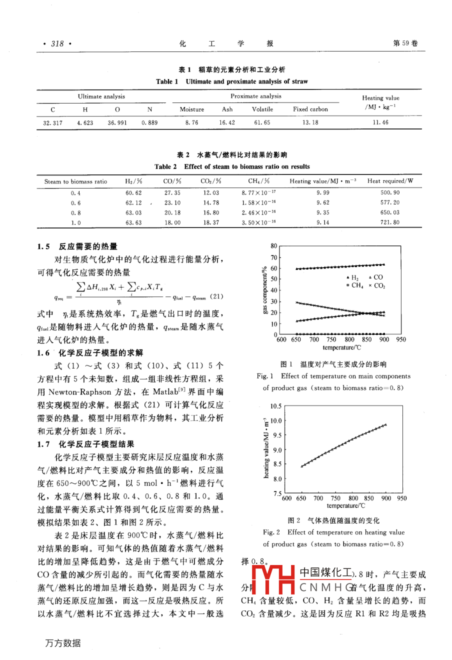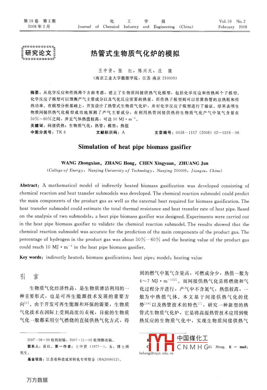 第59卷第2期化學(xué)報(bào)Vol. 59 No. 22008年2月Journal of Chemical Industry and Engineering (China)February 2008總研究論文熱管式生物質(zhì)氣化爐的模擬王中賢,張紅,陳興元,莊駿(南京工業(yè)大學(xué)能源學(xué)院,江蘇南京210009)摘要:從化學(xué)反應(yīng)和傳熱兩個(gè)方面考慮,建立了生物質(zhì)間接供熱氣化模型,包括化學(xué)反應(yīng)和傳熱兩個(gè)子模型?;瘜W(xué)反應(yīng)子模型可以預(yù)測(cè)產(chǎn)氣主要成分以及氣化反應(yīng)需要的熱量,而傳熱子模型則可以估算熱管的總熱阻和傳熱功率。在模型分析基礎(chǔ)上,開(kāi)發(fā)設(shè)計(jì)了熱管式生物質(zhì)氣化爐,并對(duì)化學(xué)反應(yīng)子模型進(jìn)行了驗(yàn)證。結(jié)果表明生物質(zhì)間接供熱氣化模型成功地預(yù)測(cè)了產(chǎn)氣主要成分,在利用熱管間接供熱的生物質(zhì)氣化產(chǎn)氣中氫氣含量在50%~60%之間,并且氣體熱值較高,可達(dá)10MJ·m關(guān)鍵詞:間接供熱;生物質(zhì)氣化;熱管;模型;熱值中圖分類號(hào):TK6文獻(xiàn)標(biāo)識(shí)碼:A文章編號(hào):0438-1157(2008)02-0316-06Simulation of heat pipe biomass gasifierWANG Zhongxian, ZHANG Hong, CHEN Xingyuan, ZHUANG JunCollege of Energy, Nanjing University of Technology, Nanjing 210009, Jiangsu, China)Abstract: A mathematical model of indirectly heated biomass gasification was developed consisting ofchemical reaction and heat transfer submodels was developed. The chemical reaction submodel could predictthe main components of the product gas as well as the external heat required for biomass gasification. Theheat transfer submodel could estimate the total thermal resistance and heat transfer rate of heat pipe. Basedon the analysis of two submodels, a heat pipe biomass gasifier was designed. Experiments were carried outin the heat pipe biomass gasifier to validate the chemical reaction submodel. The results showed that thechemical reaction submodel was accurate for the prediction of the main components of the product gas. Thepercentage of hydrogen in the product gas was about 50%-60% and the heating value of the product gascould reach 10 MJ. m in the heat pipe biomass gasifierKey words: indirectly heated; biomass gasification; heat pipe; model; heating value引言到的燃?xì)庵械獨(dú)夂扛?可燃成分少,熱值一般為4~7M·m-32。而間接供熱氣化是將燃燒和氣生物質(zhì)氣化經(jīng)濟(jì)性高,是生物質(zhì)清潔利用的一化過(guò)程分開(kāi)進(jìn)行,產(chǎn)氣中不含氮?dú)?熱值較高,種主要形式,也是可再生能源技術(shù)發(fā)展的重要方般為中熱值氣體。本文基于間接供熱氣化的優(yōu)向。由于開(kāi)發(fā)可再生能源和環(huán)保的需要,生物質(zhì)勢(shì)以及熱管技術(shù)的特色,研究一種新型的熱氣化技術(shù)在國(guó)際上受到高度的重視,目前的生物質(zhì)管式生物質(zhì)氣化爐,它是將高溫?zé)峁芗夹g(shù)應(yīng)用到吸氣化一般都采用空氣燃燒的直接供熱氣化方式,得熱反應(yīng)的生物質(zhì)氣化中,實(shí)現(xiàn)生物質(zhì)間接供熱氣2007—06-19收到初稿,2007-11-02收到修改稿聯(lián)系人:張紅,第一作者:王中賢(1977-),女,博士研究生dH中國(guó)煤化工CNMH GG基金項(xiàng)目:江蘇省科技成果轉(zhuǎn)化專項(xiàng)資金(BA2006012)。第2期上中賢等:熱管式生物質(zhì)氣化爐的模擬317·化。本文從化學(xué)反應(yīng)和傳熱兩個(gè)方面考慮,建立了Xe,p'o生物質(zhì)間接供熱氣化模型,包括化學(xué)反應(yīng)和傳熱兩個(gè)子模型,在模型分析基礎(chǔ)上,開(kāi)發(fā)設(shè)計(jì)了熱管式式中p為標(biāo)準(zhǔn)壓力,規(guī)定p-100P2,合并生物質(zhì)氣化爐,并對(duì)化學(xué)反應(yīng)子模型進(jìn)行了驗(yàn)證。式(7)~式(9)K? Xco, XH1化學(xué)反應(yīng)子模型Xux熱管式生物質(zhì)氣化爐中的生物質(zhì)氣化過(guò)程,是個(gè)復(fù)雜的反應(yīng)系統(tǒng),要研究這類反應(yīng)系統(tǒng)的機(jī)理式(10)和式(1)中的標(biāo)準(zhǔn)平衡常數(shù)與溫度有是很困難的。本文的化學(xué)反應(yīng)模型是以化學(xué)熱力學(xué)關(guān),可通過(guò)推導(dǎo)得到標(biāo)準(zhǔn)平衡常數(shù)的計(jì)算關(guān)為基礎(chǔ),研究氣化過(guò)程中的所有反應(yīng)都達(dá)到平衡時(shí)系式的燃?xì)獬煞值淖兓?。此模型雖然簡(jiǎn)單,但可以用來(lái)1.4平衡常數(shù)預(yù)測(cè)產(chǎn)氣主要成分以及氣化反應(yīng)需要的熱量物質(zhì)的比定壓熱容與溫度的關(guān)系式為1.1模型假設(shè)Cp,m=a+br+ct+dT3在化學(xué)反應(yīng)子模型中,做如下假設(shè)(1)燃料由C、H和O元素組成,而N和Svc,△d-等元素可以忽略;(2)產(chǎn)氣組成為CO、CO2、H、CH1則有△cp,m=△a+△hT|△cT2+△dI3和H2O;(3)氣化爐密封良好,沒(méi)有氣休泄漏Kirchhof等式為d(△,He)(4)在每一個(gè)計(jì)算步屮系統(tǒng)都達(dá)到熱力學(xué)(14)平衡積分得1.2質(zhì)量平衡△H=△T+r+4T+4r+1(15)根據(jù)質(zhì)量平衡,可分別得到C平衡、H平衡和O平衡方程式中I是積分常數(shù)。Van' t hoff 4等式為Nu I 2N2xn2+4Amt1+2Xn2°d(lnK°)△.H(16)燃料巾的碳是按轉(zhuǎn)化率=90%進(jìn)行反應(yīng)。積分得1.3化學(xué)平衡K=k(△dhr+T+合7+7-)+氣化反應(yīng)過(guò)程中C與水蒸氣的反應(yīng)(R1)、Boudouard反應(yīng)(R2)以及甲烷生成反應(yīng)(R3)式中J是積分常數(shù)對(duì)燃?xì)庾罱K組成起關(guān)鍵作用,因而選取這3個(gè)反應(yīng)當(dāng)溫度一定時(shí),有下列關(guān)系作為化學(xué)平