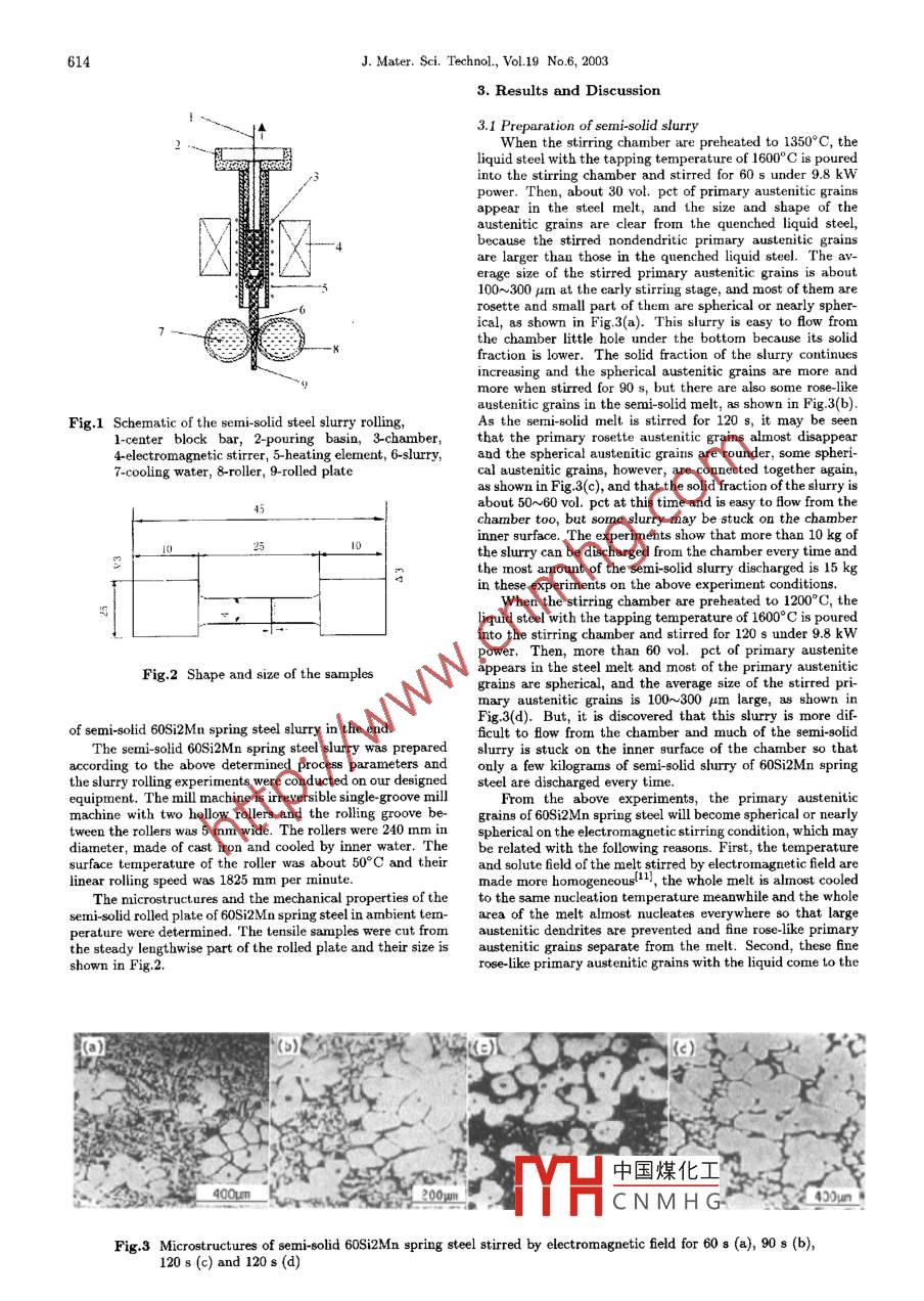 J. Mater. Sci. Technol, Vo1.19 No.6, 2003613Slurry Preparation and Rolling of Semi-solid 60Si2Mn Spring SteelWeimin MAOt, Aimin ZHAO, Dong YUN, Leping ZHANG and Yonglin KANGSchool of Materials Science and Engineering, University of Science & Technology Beijing, Beijing 100083, China[ Manuscript received October 31, 2002, in revised form January 8, 2003]The nondendritic semi-solid slurry preparation of 60Si2Mn spring steel has been studied in this paper. The experimentshave shown that when stirred for 2 min on the test condition, the semi-solid slurry with 50%~60% fraction solid andspherical primary austenitic grains in the size of 100~300 um can be obtained and is easy to be discharged from thebottom lttle hole of the strring chamber. The nondendritic slurry of 60Si2Mn spring steel can be rolled into givenplate form scessfully, but the solid phase and liquid phase is easy to be separated in rlling process so that thesolid primary austenite is concentrated in the center and the liquid is near the edge of the rolled plate. The rupturestrength and elongation of the plate rolled only once with semi-solid slurry are lower than that of the traditionallyrepeated hot-rolled plate of 60Si2Mn spring steel.KEY WORDS: 60Si2Mn, Semi-solid, Electromagnetic strring, Rolling1. Introductionhas studied the preparation of 60Si2Mn spring steel semi-solidslurry by electromagnetic stirring and the slurry rolling. TheThe semi-solid forming technology of metals or their asemi-solid shurry with solid fraction of 50%~60% was preparedloys was invented in the earlyDs of the 20th centuryl1.and rolled into plate, which has provided the experience andThis new technology has many advantages, such as reducingexperiment basis for steel slurry rolling process.porosity and solidification shrinkage in the formed castings sothat their compactness and strength is increased, reducing the2. Experimentalcomposition segregation and improving the property unifor-mity, reducing the deformation resistance so that the sophistj-The raw material in the experiments is 60Si2Mn springcated castings can be formed, raising the production ratio andsteel with the composition of 0.61 wt pct C, 1.83 wt pct Si,reducing the percentage of rejects, lowering the forming tem-0.7 wt pct Mn, <0.05 wt pct P,≤0.03 wt pct S, <0.35 wtperature and prolonging the die life, and easily realizing thepct Cr,≤0.35 wt pct Ni. The melting furnace is intermediateproduction automatization, so the semi-solid forming technol-frequency coreless induction furnace and with a capacity ofogy of aluminum alloys and magnesium alloys has been suC~-20 kg of the steel. The proper amount of pig iron was addedcessfully used tomanufacture many parts of cars and otherin the melt for compensation of the burning loss of C and Si,the steel melt was deoxidized by Si-Ca powder before tappingWhile the semi-solid forming of alloys with low melt-ing point was studied, the semi-solid forming of ferrous a小pouring and heating the stirring chamber liner. After tap-loys had also been researched, for example, Flemings and hisping, the liquid steel is poured into the stirring chamber ofcolleaguesl2,5~5l of MIT prepared the semi-golid slurries orthe semi-solid steel slurry preparation equipment and stirredbillets of AISI440C, 304, 4340 steels with mechanical stir-immnediately by electromagnetic field.ring equipments, did the semi- solid die casting experimentsThe equipment for preparation of nondendritic semi solidand gained compact castings. Kapranos, et al.l9, also pro-iron or steel slurry by electromagnetic stirring and slurryduced the serni-solid billet of M2 high speed steel by Os-rolling is shown in Fig.1. As the superheat liquid 60Si2Mnprey or SIMA methods and carried out the forming exper-spring steel was poured into the stirring chamber, it wasiments. Some progress in continuous semi-solid cast billet ofstirred rightaway by electromagnetic fend wasoledalloys with high melting point by electromagnetic stirrer wascontinuously. When the semi-solid melt was stirred, the cool-achieved by Blazck, et al,1o. But, the main reason delay-ing rate was appropriately controlled so that the semi-soliding the technical improvement of the die casting process withmelt can stay between the liquidus temperature T and solidussemi-solid iron or steel slurry is that the cracks on the die sur-temperature T: for enough long time and the slurry of spheri-face usually occur for the thermal sbock of high melting pointcal or nearly spherical primary austenite can be easily gained.slurry and the die life is too short, so it is necessary to con-When the slurry reached the given solid fraction, the centertinuously develop the semi-solid forming technology suitableblock bar of the equipment is risen up and the semi-solidfor high melting point iron or steel slurry. The direct rollingslurry flowed out of the stirring chamber from the little bot-procesof iron or steel slurry should be the most importanttom hole, and then the semi-solid slurry went on flowing intoarea because the roller shape is simpler and the slurry is sup-the predetermined groove between the two holow rollers withplied continuously, and it is possible for the roller to withstandcooling water and finally was rolled into plate.the thermal shock of high melting point iron or steel slurry.In order to roll semi solid steel slurry, the process param-In order to suit the need of semi-solid iron or stel rolling,eters should be firstly determined by experiments. The tem-tbe mechanical stirring, SIMA, and Osprey methods are notperatures of the chamber top and bottom were determined byproper for preparation of iron or steel slurry because the me-PtRh-Pt thermocouples and were preheated to 1200~1350°Cchanical stirring chamber and stirrer life are short and theybefore pouring liquid 60Si2Mn spring steel. The center blockmay easily pollute the slurry, and the SIMA, Osprey methodsbar was risen up as the steel melt was stirred for a series ofare only used for prepa