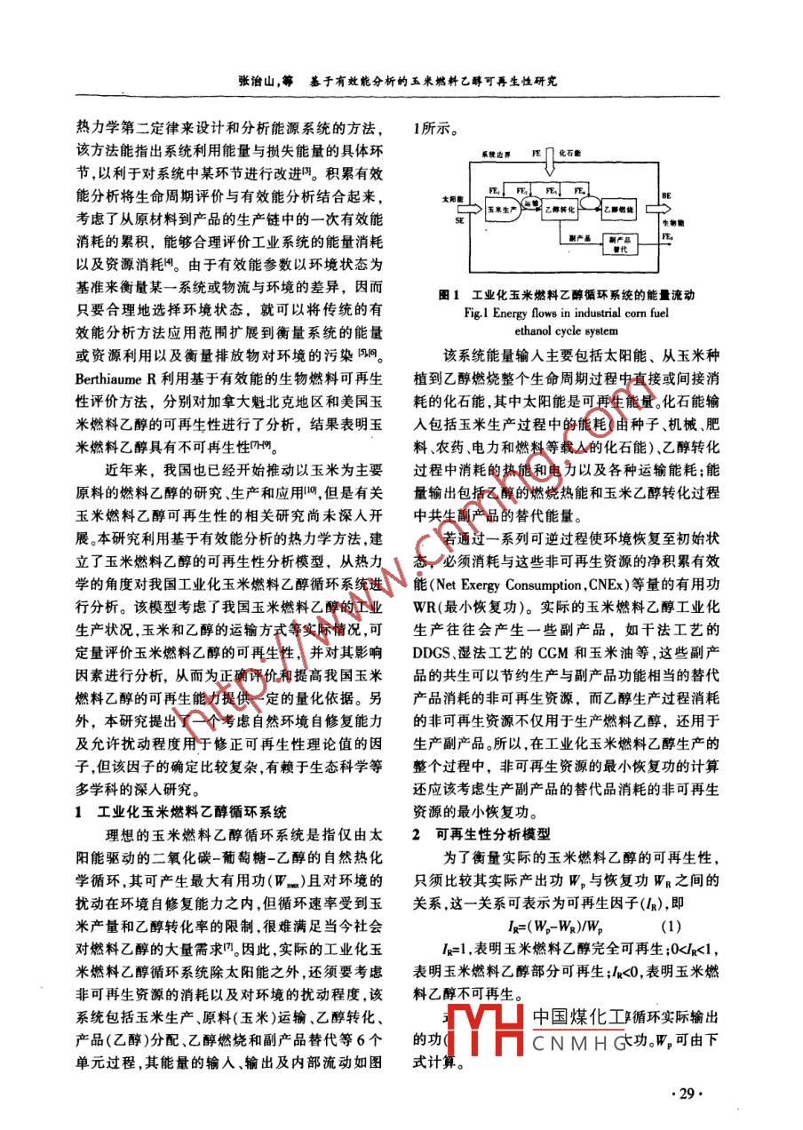 第27卷第5期習(xí)其生能源Vol 27 No52009年10月renewable Energy Resourcesoct.2009基于有效能分析的玉米燃料乙醇可再生性研究張治山1,張苗苗1,袁希鋼2(1.山東科技大學(xué)化學(xué)與環(huán)境工程學(xué)院,山東青島266510;2.天津大學(xué)化學(xué)工程聯(lián)合國(guó)家重點(diǎn)實(shí)驗(yàn)室天津300072)要:玉米燃料乙醇是一種化石燃料替代品,其可再生能力是評(píng)價(jià)其性能優(yōu)劣的一個(gè)重要指標(biāo)。從熱力學(xué)的角度建立了基于有效能的玉米燃料乙醇可再生性分析模型,并提出一個(gè)考慮白然環(huán)境自修復(fù)能力及允許擾動(dòng)程度用于修正可再牛性理論值的因子。研究結(jié)果表明,目前我國(guó)玉米燃料乙醇可冉生因子的理論值為-214具有不可再生性。文章最后指出了提高我國(guó)玉米燃料乙醇可冉生能力的重要途徑。關(guān)鍵詞:燃料乙醇;可再生性;有效能;玉米中圖分類號(hào):TK6,TQ013.1文獻(xiàn)標(biāo)志碼:A文章編號(hào):1671-5292(200905-0028-05Study on renewability of corn fuel ethanolbased on exergy analysisZHANG Zhi-shan, ZHANG Miao-miao, YUAN Xi-gang(1. School of Chemical and Environmental Engineering and Technology, Shandong University of Science and Technology, Qingdao 266510, China; 2.State Key Laboratory of Chemical Engineering. Tianjin University, Tianjin300072,ChiAbstract: The renewability of com fuel ethanol, which is known as an alternative for fossil fuel,an important criterion for evaluating its performance. The renewability analysis model of co fuelethanol is established based on exergy from the view of thermodynamics, and a new factor is putforward to amend the theoretical value of renewability factor, which considers the self-healing ca-pacity and the disturbance permissibility of natural environment in the paper. It is shown that comfuel ethanol is non-renewable and its theoretical value of renewability factor is -2 14 in China atpresent Finally, some important ways are indicated to improve the renewability of corn fuel ethanolin our countryKey words: fuel ethanol; renewability: exergy; corn0引言能量質(zhì)量和實(shí)際做功能力做出評(píng)價(jià),從而不能反玉米燃料乙醇是一種重要的石油替代燃料,映其實(shí)際的可再生能力。玉米燃料乙醇的碳平衡基于生命周期原理對(duì)其進(jìn)行能量效益、環(huán)境影響、分析模型較為全面地考慮了整個(gè)生命周期中溫室可再生性和可持續(xù)性等相關(guān)的研究工作具有重要?dú)怏w排放的影響因素,但從熱力學(xué)的角度全面評(píng)意義。價(jià)玉米燃料乙醇的可再生性是一個(gè)復(fù)雜問題,不在玉米燃料乙醇生命周期能量流動(dòng)框架內(nèi),僅包括能量平衡和碳平衡問題,還涉及更多的生基于熱力學(xué)第一定律建立的凈能量分析模型可以態(tài)環(huán)境影響問題。定量評(píng)價(jià)能量效益和分析影響因素叫,但不能對(duì)有效能分析是一種用質(zhì)量守衡、能量守衡及收稿日期:2009-0430。中國(guó)煤化工基金項(xiàng)目:國(guó)家重點(diǎn)基礎(chǔ)研究發(fā)展規(guī)劃(973)項(xiàng)目(2001CB711203)。作者簡(jiǎn)介:張治山(1975-),男,山東德州人博土副教授,主要研究方向?yàn)樯鶦NMHG63張治山,等基于有效能分析的玉米然料乙醇可再生性研究熱力學(xué)第二定律來設(shè)計(jì)和分析能源系統(tǒng)的方法,1所示。該方法能指出系統(tǒng)利用能量與損失能量的具體環(huán)系使邊界EE化石能節(jié),以利于對(duì)系統(tǒng)中某環(huán)節(jié)進(jìn)行改進(jìn)。積累有效能分析將生命周期評(píng)價(jià)與有效能分析結(jié)合起來考慮了從原材料到產(chǎn)品的生產(chǎn)鏈中的一次有效能玉生產(chǎn)乙轉(zhuǎn)化消耗的累積,能夠合理評(píng)價(jià)工業(yè)系統(tǒng)的能量消耗以及資源消耗。由于有效能參數(shù)以環(huán)境狀態(tài)為基準(zhǔn)來衡量某一系統(tǒng)或物流與環(huán)境的差異,因而圖1工業(yè)化玉米燃料乙醇循環(huán)系統(tǒng)的能量流動(dòng)只要合理地選擇環(huán)境狀態(tài),就可以將傳統(tǒng)的有Fig 1 Energy flows in industrial corn fue效能分析方法應(yīng)用范圍擴(kuò)展到衡量系統(tǒng)的能量ethanol cycle system或資源利用以及衡量排放物對(duì)環(huán)境的污染國(guó)問該系統(tǒng)能量輸入主要包括太陽能、從玉米種Berthiaume R利用基于有效能的生物燃料可再生植到乙醇燃燒整個(gè)生命周期過程中直接或間接消性評(píng)價(jià)方法,分別對(duì)加拿大魁北克地區(qū)和美國(guó)玉耗的化石能,其中太陽能是可再生能量化石能輸米燃料乙醇的可再生性進(jìn)行了分析,結(jié)果表明玉包括玉米生產(chǎn)過程中的能耗(由種子、機(jī)械、肥米燃料乙醇具有不可冉生性例。料、農(nóng)藥、電力和燃料等載入的化石能)、乙醇轉(zhuǎn)化近年來,我國(guó)也已經(jīng)開始推動(dòng)以玉米為主要過程中消耗的熱能和電力以及各種運(yùn)輸能耗;能原料的燃料乙醇的研究、生產(chǎn)和應(yīng)用,但是有關(guān)量輸出包括乙醇的燃燒熱能和玉米乙醇轉(zhuǎn)化過程玉米燃料乙醇可再生性的相關(guān)研究尚未深人開中共生副產(chǎn)品的替代能量。展。本研究利用基于有效能分析的熱力學(xué)方法,建若通過一系列可逆過程使環(huán)境恢復(fù)至初始狀立了玉米燃料乙醇的可再生性分析模型,從熱力態(tài),必須消耗與這些非可再生資源的凈積累有效學(xué)的角度對(duì)我