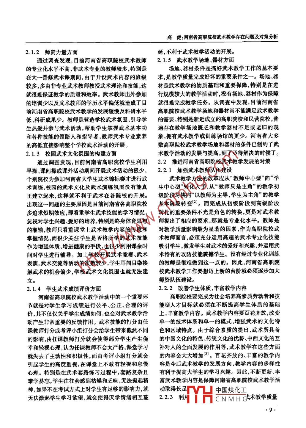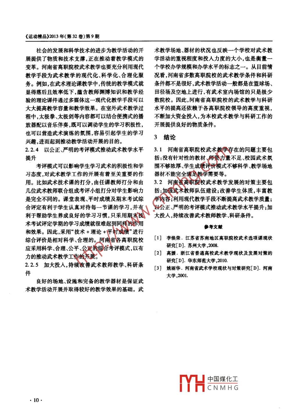 運(yùn)動精品Plhysical Education Rerview2013年(第32卷)第9期VoL. 32 ,NO.9 ,2013河南省高職院校武術(shù)教學(xué)存在問題及對策分析高健(鄭州澍青醫(yī)學(xué)高等??茖W(xué)校,河南鄭州450064)摘要:通過文獻(xiàn)法、調(diào)查法 、數(shù)理統(tǒng)計(jì)法和邏輯分析法等研究方法對河南省高職院校武術(shù)教學(xué)中存在的問題及應(yīng)對舉措進(jìn)行了分析研究。結(jié)果發(fā)現(xiàn),河南省高職院校在武術(shù)教學(xué)中存在的問題主要集中在教材、師資力量、武術(shù)文化氛圍、學(xué)生成績評定、教學(xué)場地器材等方面。提出了有針對性的對策,以促進(jìn)河南省高職院校武術(shù)教學(xué)質(zhì)量的不斷提高。關(guān)鍵詞:高職院校;河南省;武術(shù)教學(xué);問題;對策Analyzes of the Problems and Countermeasures of WushuTeaching in Higher Vocational Colleges in Henan ProvinceGAO Jian( Shuqing Medical College of Zhengzhou, Zhengzhou 450064 , Henan, China)Abstract : This paper mainly through literature method, survey method,mathematical statistics and logicanalysis and other research methods , to analyze the problems existing in Wushu teaching in higher voca-tional colleges of Henan province . The results showed that problems existing in Wushu teaching in highervocational colleges of Henan province mainly focused on the teaching material , teachers faculty , cultureatmosphere of Wushu, evaluation of students’achievement and teaching yard and equipment . This paperalso puts forward the targeted countermeasures to promote Wushu teaching quality in higher vocationalcolleges of Henan province.Keywords : vocational college; wushu; teaching; countermeasures2.1.1武術(shù)教材方面1研究對象與方法目前河南省高職院校武術(shù)教材中,主要以套路1.1 研究對象練習(xí)為主,選修課內(nèi)容也是如此,涉及攻防技擊保以河南省高職院校武術(shù)教學(xué)狀況為研究對象。健、養(yǎng)生等內(nèi)容較少,“在教學(xué)過程中,教師基本就1.2研究方法是按照教學(xué)計(jì)劃將所學(xué)套路授完為止,很少去了解主要通過文獻(xiàn)法、調(diào)查法數(shù)理統(tǒng)計(jì)法及邏輯分學(xué)生選擇武術(shù)的理由,也很少從實(shí)際角度去考慮整析法等研究方法對河南省高職院校武術(shù)教學(xué)中存在個教學(xué)過程,致使大多數(shù)學(xué)生都認(rèn)為武術(shù)就是套路,的問題和解決途徑進(jìn)行研究。調(diào)查研究對象黃河水就是花架子,沒有實(shí)用性””。所以,解決教材內(nèi)容利職業(yè)技術(shù)學(xué)院,開封大學(xué)、周口職業(yè)技術(shù)學(xué)院、鄭不夠全面,與學(xué)生的興趣、愛好結(jié)合不夠等問題就顯州鐵路職業(yè)技術(shù)學(xué)院等共12所。得非常重要。教材是開展武術(shù)教學(xué)的指南和依據(jù),河南省高職院校單靠使用老的綜合教材已不能適應(yīng)2結(jié)果與分析當(dāng)前武術(shù)教學(xué)的需要,解決教材問題已成為當(dāng)前需2.1河南省高職院校武術(shù)教學(xué)存在問題分析要解決的突出問題。中國煤化工作者簡介:高健( 1986 - ),男,本科,助教,研究方向:體育教學(xué)與訓(xùn)練。MYHCNM HG●8..《運(yùn)動精品>2013年(第32卷)第9期社會的發(fā)展和科學(xué)技術(shù)的進(jìn)步為教學(xué)活動的開術(shù)教學(xué)場地、器材的狀況也反映-一個學(xué)校對武術(shù)教展提供了物質(zhì)和技術(shù)支撐,正在推動著教學(xué)模式的學(xué)活動的重視程度和投入力度的大小,也是衡量一變革。河南省高職院校武術(shù)教學(xué)也要充分利用現(xiàn)代個學(xué)校辦學(xué)規(guī)模和辦學(xué)水平的標(biāo)志之一一。從目前情教學(xué)手段為武術(shù)教學(xué)的現(xiàn)代化、科學(xué)化、合理化服況看,河南省多數(shù)高職院校的武術(shù)教學(xué)條件和科研務(wù)。例如,在武術(shù)理論課教學(xué)中,傳統(tǒng)的教學(xué)模式就條件都不是很好,武術(shù)教學(xué)活動一般都是在籃球場、顯得落后且效率低下,蘊(yùn)含教師淵博知識和教學(xué)經(jīng)田徑場及空地上進(jìn)行,有武術(shù)室內(nèi)場館的只是極少驗(yàn)的理論課件通過多媒體這-現(xiàn)代化教學(xué)手段可以數(shù)院校。因此,河南省高職院校的武術(shù)教學(xué)與科研大大提高教學(xué)容量和教學(xué)效果。在室外武術(shù)教學(xué)過水平的提高還依賴于各高職院校領(lǐng)導(dǎo)的高度重視,程中,太極拳太極劍等內(nèi)容都可以結(jié)合便攜式的播不斷加大資金投人,為本校武術(shù)教學(xué)與科研工作的放器配以音樂伴奏,既可以調(diào)動學(xué)生的學(xué)習(xí)積極性,開展提供良好的物質(zhì)條件。也可以營造武術(shù)演練的氛圍,容易引起學(xué)生的學(xué)習(xí)3結(jié)論興趣,進(jìn)而起到推動教學(xué)活動開展的目的。2.2.4以公正 嚴(yán)明的考評模式推動武術(shù)教學(xué)水平3.1河南省 高職院校武術(shù)教學(xué)存在的問題主要包提升括:沒有針對性的教材、師資力量不足、校園武術(shù)氛考評模式可以影響學(xué)生學(xué)習(xí)武術(shù)的積極性和學(xué)圍不夠濃厚、學(xué)生成績評價模式不夠科學(xué)、教學(xué)場地習(xí)態(tài)度,對武術(shù)教學(xué)工作的開展有著至關(guān)重要的作器材不能完全滿足教學(xué)需要等。用。比如武術(shù)技術(shù)課的打分,由任課教師打分和由.3.2河南省 高職院校