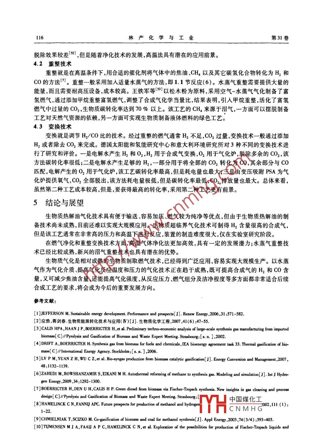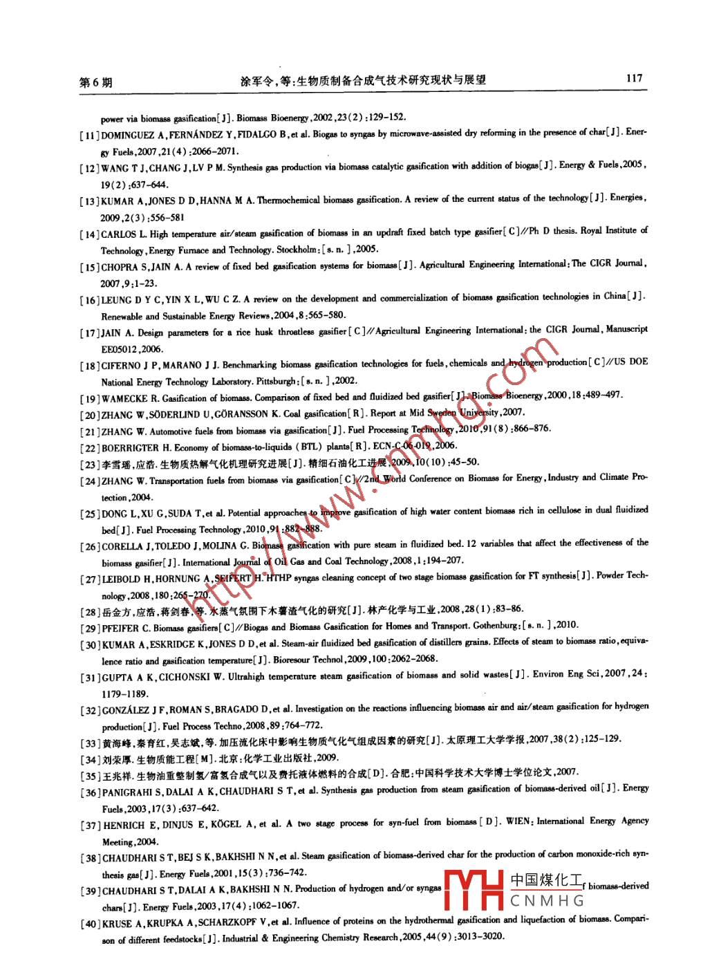 第31卷第6期林產(chǎn)化學(xué)與工業(yè)Vol 31 No 6011年12月Chemistry and Industry of Forest ProductsDec 2011生物質(zhì)制備合成氣技術(shù)研究現(xiàn)狀與展望涂軍令,應(yīng)浩12,李琳娜(1.中國(guó)林業(yè)科學(xué)研究院林產(chǎn)化學(xué)工業(yè)研究所;生物質(zhì)化學(xué)利用國(guó)家工程實(shí)驗(yàn)室;國(guó)家林業(yè)局林產(chǎn)化學(xué)工程重點(diǎn)開(kāi)放性實(shí)驗(yàn)室;江蘇省生物質(zhì)能源與材料重點(diǎn)實(shí)驗(yàn)室,江蘇南京210042;2.中國(guó)林業(yè)科學(xué)研究院林業(yè)新技術(shù)研究所,北京100091)摘要:綜述了生物質(zhì)合成氣制備技術(shù)的現(xiàn)狀,著重討論了生物質(zhì)氣化技術(shù)中氣化爐類型、氣化介質(zhì)、氣化溫度和氣化壓力對(duì)合成氣組成的影響,介紹了生物質(zhì)熱解油氣化和生物質(zhì)超臨界氣化制取合成氣技術(shù),以及生物質(zhì)制備合成氣過(guò)程中氣體凈化和重整變換等相關(guān)技術(shù),分析了各種技術(shù)的特點(diǎn),并展望了生物質(zhì)合成氣制備技術(shù)的發(fā)展方向。關(guān)鍵詞:生物質(zhì);合成氣;熱解;氣化;重整中圖分類號(hào):TQ35;TQ51文獻(xiàn)標(biāo)識(shí)碼:A文章編號(hào):0253-2417(2011)06-0112-07The State of the Art of Synthesis Gas Production Technology from BionTU Jun-ling, YING Hao"2,LI Lin-na'(1. Institute of Chemical Industry of Forest Products, CAF; National Engineering Lab for Biomass Chemical UtilizationKey and Open Lab on Forest Chemical Engineering SFA; Key Lab of Biomass Energy and Material, Jiangsu ProvinceNanjing 210042, China; 2. Institute of New Technology of Forestry, CAF, Beijing 100091, China)Abstract: The research status of synthesisnology from biomass is reviewed. The effects of gasifier, gasificationmedium, temperature and pressure on components of synthesis gas are discussed. Bio-oil gasification and gasification in supercritical water for synthesis gas production are introduced and other related technologies like gas cleaning, reforming and gas shiftingare summarized. Finally, the features of these technologies are analyzed and the development trend is pointed out.Key words: biomass; synthesis gas; pyrolysis; gasification; reforming生物質(zhì)是可以用來(lái)生產(chǎn)液體燃料和化學(xué)品的可再生資源,許多國(guó)家已經(jīng)將生物質(zhì)資源作為最主要的可再生能源進(jìn)行開(kāi)發(fā)和利用21。研究表明,與風(fēng)能、太陽(yáng)能等相比,用生物質(zhì)發(fā)電的成本更高,因此對(duì)生物質(zhì)資源的開(kāi)發(fā)利用,將主要用于生產(chǎn)各種化學(xué)品和液體燃料3。合成氣是富含H2、CO和少量CO2的混合氣體,它可以作為中間體用于精制或合成各種高品質(zhì)液體燃料和化學(xué)品,如氫氣、甲醇、二甲醚和各種費(fèi)托燃料等4。生物質(zhì)制取合成燃料工藝有以下兩個(gè)突出優(yōu)點(diǎn):1)可利用的原料更為廣泛且可再生,有更高的原料利用率;2)以生物質(zhì)合成氣為中間體可以合成非常多樣的化學(xué)品和高品質(zhì)液體燃料。生物質(zhì)制備合成氣用于合成液體燃料在經(jīng)濟(jì)和技術(shù)方面都具有潛在的優(yōu)勢(shì),有巨大的應(yīng)用前景80。目前,合成氣主要是通過(guò)煤、天然氣和石油等化石資源生產(chǎn)的。隨著化石資源的日趨枯竭,人們對(duì)生物質(zhì)資源新的替代工藝的開(kāi)發(fā)更加關(guān)注,新的方法主要有生物質(zhì)氣化法和沼氣重整法生物質(zhì)制備合成氣的技術(shù)研究已經(jīng)引起各國(guó)研究人員的重視,如美國(guó)、德國(guó)、荷蘭、加拿大等國(guó)的科研機(jī)構(gòu)從不同角度對(duì)該技術(shù)進(jìn)行了研究;國(guó)內(nèi)的研究還處于初級(jí)階段。生物質(zhì)制備合成氣有兩種技術(shù)途徑:一是直接將生物質(zhì)在氣化爐中氣化,然后對(duì)產(chǎn)生的燃?xì)膺M(jìn)行重整變換制成合成氣;二是先對(duì)生物質(zhì)進(jìn)行中溫快速熱解得到生物油,然后將生物油氣化,經(jīng)重整變換制成合成氣。本文將對(duì)生物質(zhì)中國(guó)煤化工收稿日期:2010-12-23CNMHG基金項(xiàng)目:林業(yè)公益性行業(yè)專項(xiàng)(200904062)作者簡(jiǎn)介:涂軍令(1988-),男,河南南陽(yáng)人,碩士生,主要從事生物質(zhì)熱化學(xué)轉(zhuǎn)化的研究*通訊作者:應(yīng)浩,研究員,碩士生導(dǎo)師,主要從事生物質(zhì)能轉(zhuǎn)化技術(shù)的研究;E-mail:hy2478@163.com。第6期涂軍令,等:生物質(zhì)制備合成氣技術(shù)研究現(xiàn)狀與展望113合成氣制備技術(shù)研究現(xiàn)狀進(jìn)行綜述,擬為科學(xué)研究工作提供參考。1氣化技術(shù)生物質(zhì)氣化是生物質(zhì)熱化學(xué)轉(zhuǎn)化技術(shù)中歷史最悠久,也是發(fā)展最成熟的技術(shù)之一。以制備合成氣為目標(biāo)的生物質(zhì)氣化不是追求燃?xì)飧邿嶂刀切枰獙⑸镔|(zhì)最大限度的轉(zhuǎn)化為富含H2、CO的混合氣體,方便后續(xù)合成工藝處理。11生物質(zhì)氣化反應(yīng)過(guò)程生物質(zhì)氣化過(guò)程中的主要反應(yīng)如下(1~8),其中反應(yīng)(1)是總反應(yīng)。CH,O, +02+H20=CH4+CO+CO 2+H2+H20+C+ta(1)2C+02=2C0C+0=co(3)C+2H=ChaCO+H,0=C02+H,(5)CH4 + H20=C0+3H2(6C+H,0=C0+H2C+CO2=2C0氣化技術(shù)種類很多,根據(jù)氣化介質(zhì),可以分為空氣氣化、氧氣氣化、水蒸氣氣化、空氣-水蒸氣氣化以及氧氣-水蒸氣氣化;根據(jù)操作壓力,可以分為常壓氣化和加壓氣化;根