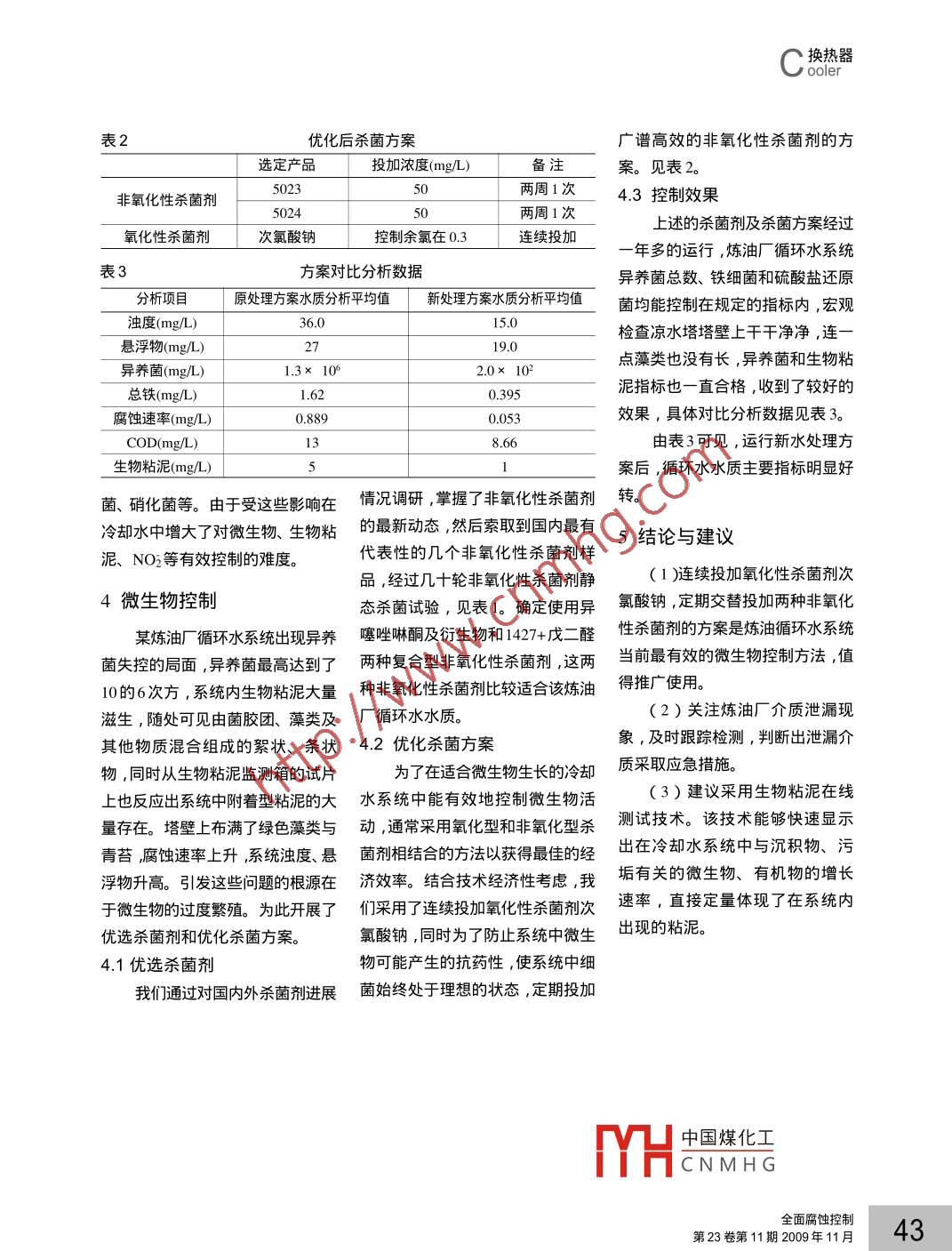 0換熱器. I ooler煉油廠循環(huán)水系統(tǒng)微生物影響因素及控制呂慧1戴新麗2高建權(quán)2( 1.中國石油股份有限公司獨山子石化分公司研究院,新疆獨山子2.中國石油股份有限公司獨山子石化分公司煉油廠, 新疆獨山子833600 )摘要:通過循環(huán)水微生物的來源、危害及影響因素的分析,結(jié)合實例闡述了循環(huán)水微生物控制方法,提出連續(xù)投加氧化性殺菌劑,定期交替投加兩種非氧化性殺菌劑的方案,是煉油循環(huán)水系統(tǒng)當(dāng)前最有效的微生物控制方法。關(guān)鍵詞:循環(huán)水微生物影響因素控制中圖分類號: TG172.5文獻(xiàn)標(biāo)識碼:A文章編號: 1008-7818(2009)1 1-0041-03The Influencing Factors and the Control of Microbes in Circulating Water SystemLV Hui, DAI Xin-lif, GAO Jian-quan2(1.The Research Institute of Petrochina Dushanzi Petrochemical Company, DushanZi 833600, China;2.The Oil Refinery of Petrochina Dushanzi Petrochemical Company, DushanZi 833600,China)Abstract: The most significant method of contoling the microbes in circulating water system of oil refinery has been mentioned,and the method has been detailed in this paper. Combining with instances and according to analysis in its source, harmfulness andinfluencing factors of microbes in circulating water system, it is proved that the best plan is continuous flling one oxide disinfectantand termly flling two non-oxide disinfectants by turms.Key words: recycled water; microbe; influencing factor; control微生物會在冷卻水系統(tǒng)中形成長的情 景,微生物進入循環(huán)水系引起的危害主要有:生物粘泥,對金屬產(chǎn)生腐蝕,影響統(tǒng)主要通過三個渠道: - -通過補( 1 )粘泥附著在換熱冷卻部位冷卻塔的效率, 同時對冷卻塔本身充水;二由空氣帶入;三由雨水帶的金屬表面上,降低冷卻水的冷卻也會造成破壞,另外,對水處理藥入。循環(huán)系統(tǒng)中循環(huán)水由于不斷效果;劑也會產(chǎn)生影響。微生物綜合控制地蒸發(fā),排污和-飛濺損失,必須連(2 )大量的粘泥將堵塞換熱器方案的目的是保持熱交換器表面清續(xù)不斷地加入補充水,生長在自( 水冷器)中冷卻水的通道,從而使?jié)嵰垣@得最大的熱傳導(dǎo)率。-個成然水體中的微生物是很多的。循冷 卻水無法工作,少量的粘泥則減功的微生物控制方案, 必須對各種環(huán)水在 涼水塔靠大氣對流冷卻,少冷 卻水通道的截面積,從而降低微生物的活動都能產(chǎn)生抑制作用。大氣中夾帶的泥砂、灰塵、絨毛及冷卻水的流量和冷卻效果,增加泵由于微生物能通過產(chǎn)生生物淤泥昆蟲等雜物會隨氣流進入循環(huán)水壓;(腐漿)而降低熱交換設(shè)備的熱傳中,大氣中的微生物大部分附著( 3 )粘泥積聚在冷卻塔填料的導(dǎo)率,所以,控制微生物活動對冷在這些雜物.上而隨之進入系統(tǒng)。表面或填料間,堵塞了冷卻水的通卻水系統(tǒng)十分重要。雨水會把大氣中懸浮的微生物從過,降低冷卻塔的冷卻效果;涼水塔的敞開部分帶入系統(tǒng)。(4 )粘泥覆蓋在換熱器內(nèi)的金1微生物的來源屬表面,阻止緩蝕劑與阻垢劑到達(dá)在敞開式循環(huán)冷卻水系統(tǒng)中2微生物的危害金屬表面發(fā)揮其緩蝕與阻垢作用,人們經(jīng)??梢钥吹轿⑸锎罅可h(huán)冷卻水系統(tǒng)中微生物粘泥陽止殺萄劑殺滅粘泥下的微生物,中國煤化工作者簡介:呂慧( 1972-),女,工程師,主要從事防腐和水處理技術(shù)研究工作。MYHCNMHG全面腐蝕控制第23卷第11期2009年11月41.s換熱器" r ooler降低藥劑的功效;值一般如在10mg/L以上就容易發(fā)3.5懸浮物( 5 )粘泥覆蓋在金屬表面,形生粘泥引起的故障。粘泥的形成與冷卻水中的懸浮成差異腐蝕電池,引起設(shè)備的腐3.2適宜的溫度和pH值物密切相關(guān),設(shè)計規(guī)范要求懸浮物蝕;微生物繁殖的最佳溫度一般在濃度不大于20mg/L。而換熱器為板(6 )大量的粘泥尤其是藻類,30~40°C、 pH 在6.0~ 9.0 ,而循環(huán)式、翅片式、螺旋式,懸浮物的濃存在于冷卻水系統(tǒng)中的設(shè)備上,影水溫度一般在32~42°C、pH 值在度不大于10mg/L。響了冷卻水系統(tǒng)的長周期運轉(zhuǎn)。6.5~9.0 ,這些條件正好為循環(huán)水3.6粘泥量3影響微生物的生長條件和系統(tǒng)中微生物的繁殖提供了幫助。粘泥量是使用1m3的冷卻水3.3溶解氧通過生物過濾網(wǎng)所得到的粘泥體積環(huán)境因素冷卻水中生長的大多數(shù)細(xì)菌都(mL),當(dāng)粘泥量在10'm L/m3以進入循環(huán)水系統(tǒng)中的微生物不為好氧菌,好氧性細(xì)菌和絲狀菌-定能造成危害, 如果沒有其適宜(霉菌類)利用溶解氧,氧化分解有上的冷卻水系統(tǒng)中時,粘泥故障的的生活條件, 微生物是不會迅速生機物,吸收細(xì)菌繁殖所需的能量,發(fā)生率高。經(jīng)顯微鏡觀察到絲狀細(xì)長繁殖的。但是,是循環(huán)水系統(tǒng)特在敞開式循環(huán)冷卻水系統(tǒng)中,水在菌(球衣細(xì)菌類)和絲狀菌(霉菌殊的生態(tài)環(huán)境,恰恰滿足了微生物冷卻塔里的噴跑、曝氣過程為微生類)的冷卻水的粘泥量高。生長繁殖的需要的各種條件。物的生長提供了充分的溶解氧,具3.7氧化還原電位( ORP )ORP值對系統(tǒng)中微生物生長3.1微生物的營養(yǎng)源備了微生物繁殖的最佳條件。有明顯的影響,它與溶解氧、pH值微生物需要維持其生長繁殖的3.4細(xì)菌數(shù)各種營養(yǎng)源,最重要的元素是C、冷卻水中當(dāng)細(xì)菌數(shù)在103個/有關(guān),好氧
