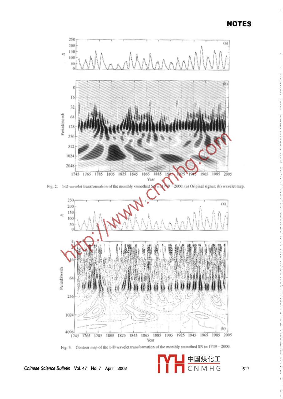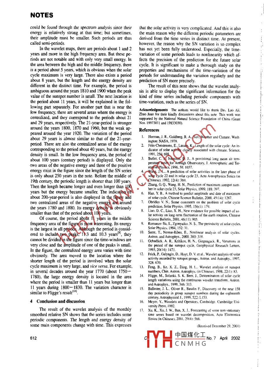 NOTESWavelet analysis of sunspotsmoothed SN maximum is around the spring of 2000, andpredicted that the date of the maximum of monthlyrelative numberssmoothed SN in 3 months is later than that of the former.The date is actually in July, 2000. Although the error ofHAN Yanben' & HAN Yonggang:2P| Athe prediction is not large; lhe advance time of the predic-tion is only about 2 yearslo. At present, great allention wasNational Astronomical Observatories, Chinese Academy of Sciences,paid to predicting SN by using the geomagnetic aa-index.Beijing 100012, China;Obridko reported that the relationship between aa indexDeparment of Applied Mathematics, Beiing Polytechnic University,and the variation of SN at the descending branch of theBejing 100022. Chinasolar cycle is close. He found that the maximum of 23rdCorrespondence should be adressed to Han Yanben (e-mail: hyb@bao.cycle is (203.2土10.7) while with the method based on theac.cn)ratio of the even-odd cycles. the value is (74.7土6.9) ac-Abstract The time series of the monthly smoothed sun.cording to his improved method'. For the contradictoryspot pumbers in 1749- 20000 is analyzed with the wavelet. resul, he thought that a cerain anomaly might be in theThe result shows that besides the known time-variation of23rd solar cycle. Therefore, we believe that the variationthe period about 11 years, other main periods of the sunspot regularity and the prediction method of the solar activitynumbers, such as the periods of about 100 years and so on, need a thorough study. The purpose of this work is tovary with time. We suggest that the time-variation of theanalyze the time series of monthly smoothed SN furthermais periods is the manifestation of the complex variation of and discuss the time- variation of some periodic compo-sunspot numbers. It is significant to make a thorough study nents.of the character and mecbanism of the time-variation of the1 Complicated variation of sunspot numbersperiods for proving prediction of sunspot numbers, espe-cally for understanding the variation process of sunspotThe data of monthy SN that started in 1749 are con-numbers.sidered as a systematic time series. The preliminary inves-Keywords: sunspot numbers, predlction, wavelet, time-variation.tigation of the series shows that the change exists in themaximum peaks and lhe length of the solar cycles. ForSunspots are considered as the main part of the solar example, the maximum of the monthly smoothed SN inactiviy. The variation of the sunspot number (SN) is al_ 19th cycle is 2013, but that of 6th cycle is only 48.7. Theways uaken as an impotant way to indicate the activit. range of the cycle length lies from about 8.6 l0 17.5 yearsSimultaneously, it has been found that the solar activityif the length is measured according to the interval betweenpossibly influences some changes and anomalous phe- the two maxima, or it ranges from about 99 to 12.5 yearsnomena of the slreresrial environment, climate, if it is measured acording t0 the minimas!. Fris- Chris-weather, seismicity, and so on!. So the studies on thetensen et al. investigated the variation of the cycle lengthsolar activity including SN and pediction are paid great in the study of the rlaionship berween the length and theatentin. In the studies, the 11-year-period was found and atnospheric temperature!.confirmed and some periodic components were obtained.There are some periodic components in the SN seriesHowever, it is dffcult to predict SN exaculy by the which are obtained through the spectrum analysis. such asperiodic parameters and some methods have sill been the periods ofabout 11 years, 100yearsand so on.frequently used at present. For example, many predictions Someone thought that there is a period of about 200aboul the maximum of monuhly smoothed SN for the 23rd yers!. However, some dferences exist in parameters ofsolar eycle are quite dfferent from the observed value periods that are obtained from data in dfferenet time iner-.later. 120.8. A panel of the NOAA Space Environment vals. This showed that lhe variation of SN is very complex.Center (SEC) with 12 scientists commented 28 predictionsand the varation is nonlinear'.derived from 6 kinds of techniques. The predications areOchadlich et al. analyzed the series with the nonlin-distributed in a large range, (115+ 40)-(200土35), and ear character using the wavelet and dscussed the variationthe ideal resut was thoughi i0 be abou (160士30). The of the cycle lnghl"!. Frick et al. studied the time seriesforecasted span of the appearance date of the maximum, of sunspot groups during 1610- 1994 by the wavelet andfrom January 1999 to June 2001, was also lager". The found that the weak solar activity is related to long solarobserved resut showed that the dale is in Apri of 2000 cycles!]. Feng et al. analyzed the yearly mean SN inWang gave a btter prediction, (119+ 30), but tbere isan 1700- 1993, and the resul showed that the range of theerror of one year on the dale prediction of the maximumi. cycle length is 9-15 years and the highest ocuensZhang et al. provided a prediction method about2 years are found to be asocialed with the 10 and 11 years.ahead of the maximum', their result is(115.4 14.9). Fligeg et al. analyzed several data sets by the MoreOne of the authors predicted that the date of the monhly wavelet, such as the Zurich relative SN, SN. the group1) Joselyn, J. A. Anderson. J. Coffeg. H. et al, Solar Cycle 23 prijet: summary of panal findings. 1996. 11. 8 al ht/:/./.wa.../nforCycle 23. html.中國(guó)煤化工Chinese Science Bulletin Vol. 47 No.7 April 2002609MHCNMHGNOTESsunspot number, the sunspot area, the facular area, Caseries of the monthly smoothed SN in 1749- 2000 isplage area, and "Be records. By combining the resultsshown in fig. 2. The upper part of the figure is the originalwith all indicators, a composite of the cycle length wassignal and the wavelet transformation map is sel inconstrucled duning the last 600 years. The result showedfig. 2(b)