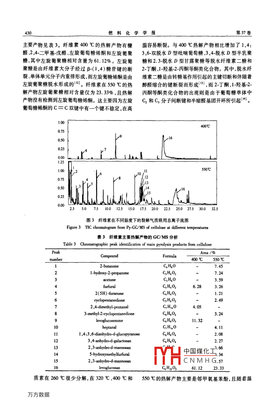 第3卷第4期燃料化學(xué)學(xué)報Vol 37 No, 42009年8月Joumal of Fuel Chemistry and TechnologyAug.2009文章編號:0253-2409(2009)040427-06生物質(zhì)主要組分低溫?zé)峤庋芯繀且菝?,趙增立,李海濱!,何方(1.中國科學(xué)院廣州能源研究所中國科學(xué)院可再生能源與天然氣水合物重點實驗室,廣東廣州510640;2中國科學(xué)院研究生院,北京10009)摘要:利用熱重分析儀和裂解氣質(zhì)聯(lián)用儀進(jìn)行生物質(zhì)主要組分低溫?zé)峤馓匦匝芯?。熱重實驗結(jié)果表明生物質(zhì)主要組分的熱穩(wěn)定性為纖維素>木質(zhì)素>半纖維素。半纖維素主要熱解溫度在210℃~320℃,而纖維素和木質(zhì)素的主要熱解溫度分別在310℃~390℃和200℃~550℃。裂解氣質(zhì)聯(lián)用實驗考察不同溫度對生物質(zhì)主要組分低溫?zé)峤猱a(chǎn)物的影響。半纖維素?zé)峤猱a(chǎn)物主要有乙酸1羥基丙酮和1羥基2丁酮纖維素?zé)峤猱a(chǎn)物主要包括左旋葡聚糖和脫水纖維二糖,而木質(zhì)素?zé)峤猱a(chǎn)物主要是鄰甲氧基苯酚。關(guān)鍵詞:生物質(zhì);主要組分;熱解;裂解氣質(zhì)聯(lián)用中圖分類號:TK6文獻(xiàn)標(biāo)識碼:ALow temperature pyrolysis characteristics of major components of biomassWU Yi-min, ZHAO Zeng-li, LI Hai-bin, HE Fang(l. Key Laboratory of Renewable Energy and Gas Hydrate, Guangzhou Institute of Energy ConversionChinese Academy of Sciences, Guangzhou 510640, China;2. Graduate University of Chinese Academy of Sciences, Beiing 100049, China)Abstract: The low temperature pyrolysis characteristics of major components of biomass were investigated usingthermogravimetric analysis(TGA)and pyrolysis-gas chromatography/ mass spectrometry(Py-GC/MS). The TGAresults show that thermal stability of major components of biomass was in descending order of cellulose >ligninhemicellulose. The main pyrolysis temperature range of hemicellulose is at 210C-320C, whereas those ofcellulose and lignin are3l0℃-390℃and200℃-55℃ respectively. The Py-GC/ MS was used for studyingthe effects of temperature on low temperature pyrolysdifferent contribution to the volatiles. The degradation of hemicellulose generates acetic acid, I-hydroxy-propanoneand 1-hydroxy-2-butanone. The high yield of levoglucosan and anhydro-cellobise is from pyrolysis of celluloseGuaiacol is associated with degradation of the ligninKey words: biomass; major components; pyrolysis; Py-GC/MS生物質(zhì)是唯一能夠同時提供固體、液體和氣體進(jìn)行了研究。 Bassilakis等利用熱重紅外聯(lián)用對燃料的可再生能源。生物質(zhì)能夠部分替代化石燃生物質(zhì)熱解產(chǎn)物進(jìn)行分析提出了七種生物質(zhì)樣品料減緩溫室效應(yīng),提高能源供應(yīng)的自給率保證國的產(chǎn)物生成模型。 Caballero等利用裂解器和氣家能源戰(zhàn)略安全。目前,在發(fā)達(dá)國家以生物能源和相色譜聯(lián)用研究了500℃~900℃硫酸鹽木素一次化工產(chǎn)品生產(chǎn)為主的生物質(zhì)產(chǎn)業(yè)正在蓬勃興起,其和二次熱裂解規(guī)律。譚洪等在紅外輻射機理實中生物質(zhì)熱化學(xué)轉(zhuǎn)化技術(shù)是當(dāng)前的研究熱點之驗臺上研究了生物質(zhì)三組分在中高溫?zé)峤?氣固液三相產(chǎn)物隨溫度變化的規(guī)律。學(xué)者們對生物質(zhì)的慢生物質(zhì)主要是由纖維素、半纖維素和木質(zhì)素等速熱解和中高溫快速熱解特性已經(jīng)進(jìn)行許多研究組成的高聚物。目前,黃娜等2用熱重分析法考察但對生物質(zhì)的低溫快速熱解特性研究較少。本實驗了生物質(zhì)主要化學(xué)組分的熱解反應(yīng)行為,建立了三通過熱重分析儀實驗得到生物質(zhì)主要組分的慢速熱組分熱解反應(yīng)的動力學(xué)模型。王樹榮等-5用熱重解特性,并利用裂解氣質(zhì)聯(lián)用儀對生物質(zhì)主要組分紅外聯(lián)用對生物質(zhì)主要化學(xué)組分熱裂解過程進(jìn)行在進(jìn)行低溫快速熱解,在線分析其熱解產(chǎn)物,為生物質(zhì)線分析,對其熱解過程中產(chǎn)物析出特性和熱解機理低溫快速熱解制取化學(xué)品和燃油提供理論依據(jù)。收稿日期:2008117;修回日期:2001-10。中國煤化工基金項目:國家高技術(shù)研究發(fā)展計劃(863計劃,200AO5Z456)。CNMHG聯(lián)系作者:趙增立, zhuozi@ms.gie,aC,cn作者簡介:吳逸民(1982-),男,廣東信宜人,碩士研究生,從事生物質(zhì)熱解液化研究E-ml:wuym@ms,gie,ae.cm。本文的英文電子版由Elsevier出版社在ScienceDirect上出版(htpe:/w,sciencedirect.com/science/journal/18725813)。燃料化學(xué)學(xué)報第37卷1實驗部分后在高純氮載氣保護(hù)下進(jìn)行加熱分解實驗。采用1.1實驗原料實驗選擇木聚糖( Xylan from birch升溫速率10Kmin從室溫開始加熱至設(shè)定反應(yīng)終溫wood,9588)微晶纖維素( Avicel PH01,11363)和600℃。堿木素( Lignin,akli,370959)作為生物質(zhì)主要組裂解氣質(zhì)聯(lián)用實驗:稱取一定量的樣品(<分(半纖維素、纖維素和木質(zhì)素)的模型化合物,均0.2mg)放人一個微型的玻璃管中間,然后以來源于 Sigma公司,元素分析見表1。10K/ms升至裂解溫度后保持108,通過載氣把裂解表1生物質(zhì)主要組分的元素分析產(chǎn)物帶入色譜,并在島津 GCMS-QP2010Pus氣質(zhì)聯(lián)Table 1 Ultimate analysis of major components of biomass用儀上進(jìn)行GCMS分析。檢測得到的質(zhì)譜峰與計Ultimate analysis wa/%算機質(zhì)譜庫進(jìn)行對比,分析判別出產(chǎn)物中可能含有H0 N S的化合物種類micell-e385.4052310.160182結(jié)果與討