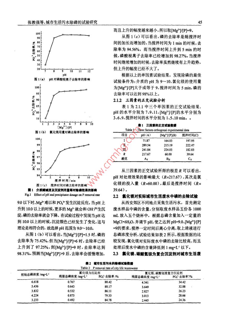 4第34卷第11期水處理技術(shù)VoL34 No 11009年11月TECHNOLOGY OF WATER TREATMENTNov,2008城市生活污水除磷的試驗(yàn)研究張教強(qiáng),???蘇力宏,寇開(kāi)昌(西北工業(yè)大學(xué)理學(xué)院應(yīng)用化學(xué)系,陜西西安710072)要:以氯化鎂及碳酸氬銨為沉淀劑,研究了模擬及城市生活慶水除磷的影響因素.試驗(yàn)發(fā)現(xiàn),介質(zhì)的pH、況淀劑用量攪拌時(shí)間等都會(huì)影響除磷的效果經(jīng)單因素及多因素的正交試驗(yàn)發(fā)現(xiàn),最佳的除磷條件為:pH為9.0~100攪拌時(shí)間為5mim和氯化鎂的投入量為[MgP-9.對(duì)于磷濃度為66mg“L4與32mg:L4的城市生活廢水,經(jīng)化學(xué)沉淀除磷處理后,廢水中的磷濃度可以降低至1mg·L以下關(guān)鍵詞:城市生活廢水;除磷;化學(xué)沉淀法中圖分類(lèi)號(hào):X7031文獻(xiàn)標(biāo)識(shí)碼:A文章編號(hào):100037002008)1040磷是產(chǎn)生水體富營(yíng)養(yǎng)化的最主要因素之一,水將樣品中的不同形態(tài)的磷轉(zhuǎn)化成磷酸鹽,然后采用鉬體富營(yíng)養(yǎng)化及其引起的“水華”、“赤潮”的發(fā)生,現(xiàn)銻抗分光光度法測(cè)定樣品中的總磷濃度。已成為全球性的環(huán)境問(wèn)題。由于飲用發(fā)生水華的1.3試驗(yàn)過(guò)程淡水引起家禽、家畜和野生動(dòng)物死亡的事件時(shí)有報(bào)將100mL城市生活污水或模擬的含磷廢水(由磷道。含磷洗滌劑和農(nóng)藥、化肥的大量使用,近年來(lái)水酸二氫鉀配制)用05molL!的NaOH溶液調(diào)節(jié)pH體磷污染日益加劇。受磷污染的水體,藻類(lèi)大量繁為9左右,加入沉淀劑進(jìn)行攪拌后過(guò)濾以鉬銻抗分光殖,藻體死亡后分解會(huì)使水體產(chǎn)生霉味和臭味。許多光度法測(cè)定母液中磷酸根的含量,計(jì)算磷的去除率。種類(lèi)還會(huì)產(chǎn)生霉素,并通過(guò)食物鏈影響人類(lèi)的健康。2結(jié)果與討論廢水除磷的方法有化學(xué)沉淀法、電解法、微生物法水生物法物理吸附法膜技術(shù)處理法和土壤處理法21影響除磷效果的因囊分析等目前就除磷效果比較來(lái)說(shuō),應(yīng)用比較多的是化學(xué)2.1單因素分析沉淀法和微生物法?;瘜W(xué)除磷的發(fā)展方向一方面是化學(xué)沉淀去除磷就是使磷成為不溶性的固體沉開(kāi)發(fā)新的化學(xué)藥劑,另一方向是對(duì)除磷過(guò)程中產(chǎn)生淀物從廢水中分離出去的除磷方法所以在除磷過(guò)的沉淀物加以回收利用。本研究考察了氯化鎂及氯程中,介質(zhì)的pH、沉淀劑的加入量及攪拌時(shí)間等都化鎂與碳酸氫銨聯(lián)用對(duì)于城市污水的除磷效果。會(huì)影響到除磷效果。圖1示出采用模擬廢水(濃度1試驗(yàn)部分為400molL4(以P計(jì)))進(jìn)行的pH、磷酸根濃度(mgL)、氯化鎂投入量和攪拌時(shí)間等單因素的試11主要試劑及儀最驗(yàn)結(jié)果。氯化鎂(MgCl"6H1O)磷酸二氫鉀(KHPO4)、從圖1(a)中可以看出,當(dāng)p從70升高到碳酸氫銨氯化亞錫、鉬酸銨等,上述試劑均為分析純。9.0時(shí),磷酸根的去除率從2977%上升到9829%722型分光光度計(jì)、電動(dòng)攪拌器pH儀、離心機(jī)等而當(dāng)pH從90升到100后,去除率反而從98.2912廢水中碘酸根及總確的含量測(cè)定下降到9751%,接著去除率隨著pH的上升又下降。樣品中磷酸根分析采取鉬銻抗分光光度法畊進(jìn)行。這說(shuō)明對(duì)磷酸根離子去除的最佳pH為90~10.0,總磷測(cè)定時(shí)先對(duì)樣品用濃硫酸及過(guò)硫酸鉀進(jìn)行消解,磷酸根去除率可達(dá)到9829%以上的效果。當(dāng)pH在收稿日期:20080325基金項(xiàng)目:2007屆西北工業(yè)大學(xué)本科畢業(yè)設(shè)計(jì)(論文)重點(diǎn)扶持項(xiàng)目(W002210)作者簡(jiǎn)介:張教強(qiáng)(1965-),男博士副教授,主要從事應(yīng)用化學(xué)方面的教學(xué)及研究工作聯(lián)系電話:02988431672;E-mail:zhangji@anpu.edu.cn張教強(qiáng)等城市生活污水除磷的試驗(yàn)研究而且上升的幅度越來(lái)越小,所以取MgP]=9。從圖1(c)可以看出,磷的去除率是隨攪拌時(shí)間的加長(zhǎng)而增加的,當(dāng)攪拌時(shí)間為1min的時(shí)候,去除率為9456%,而當(dāng)攪拌時(shí)間上升到5min的時(shí)候,磷酸根離子去除率已經(jīng)增加到9827%,當(dāng)攪拌時(shí)間繼續(xù)增加的時(shí)候,去除率雖然繼續(xù)有上升趨勢(shì),但上升的幅度已經(jīng)不大了PH根據(jù)以上的單因素試驗(yàn)結(jié)果,發(fā)現(xiàn)除磷的最佳圖1(a)pH對(duì)磷酸根離子去除率的影響試驗(yàn)條件為:介質(zhì)的pH為9~10,氯化鎂的使用量為MgJP]大于或等于9,攪拌時(shí)間為5min,磷的去除率可以達(dá)到98%以上。212三因素的正交試驗(yàn)分析表1為21中三個(gè)單因素的正交試驗(yàn)結(jié)果pH的水平分別為7、91lMg2y(P]的水平分別為3、69,攪拌時(shí)間的水平分別為1、5、10min[Mg”]nP1三因囊的正交被驗(yàn)數(shù)據(jù)圖1(b)氯化鎂用量對(duì)磷去除率的影響Table 1 Three factors orthogonal experimental data項(xiàng)目MgMPIB)攪拌時(shí)間()7187164031979528954222241.84182.83最優(yōu)從三因素的正交試驗(yàn)所得的極差R可以看出,pH對(duì)處理效果的影響最大(R=21767),其次是氯攪拌時(shí)間/min圖1(c)攪拌時(shí)間對(duì)磷去除率的影響化鎂的投入量(R=6000,最后是攪拌時(shí)間(R=圖1介質(zhì)敲堿度及沉淀劑用量等對(duì)除效果的影響3964)ig.I Effect of pH and precipitator do