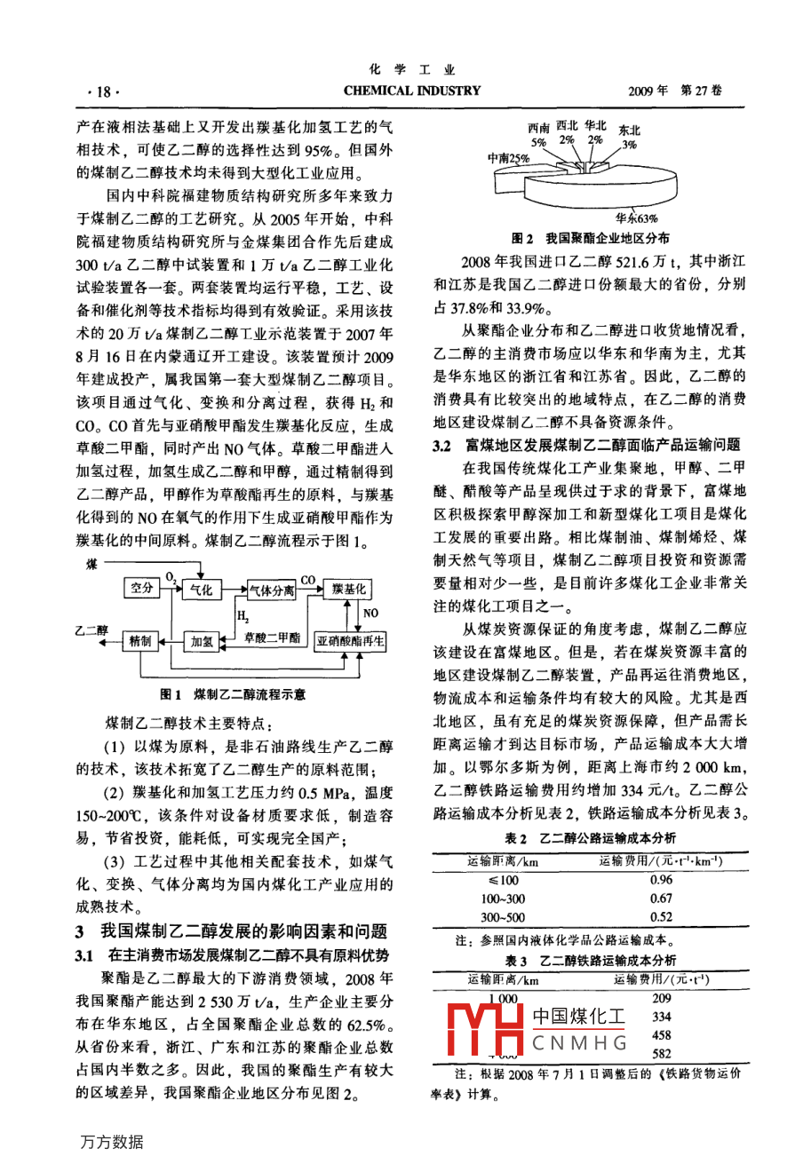 第27卷第6期化學(xué)工業(yè)200年6月CHEMICAL INDUSTRY17我國煤制乙二醇發(fā)展的問題思考王鈺(石油和化學(xué)工業(yè)規(guī)劃院,北京100013)摘要:分析了我國煤制乙二醇的市場前景和技術(shù)進(jìn)展,探討了我國發(fā)展煤制乙二醇存在的問題關(guān)鍵詞:乙二醇;市場需求分析;技術(shù)進(jìn)展;煤炭文章編號(hào):1673-9647(2009)6001704中圖分類號(hào):TQ223162文獻(xiàn)標(biāo)識(shí)碼:A1我國乙二醇的市場前景絲及后加工制成的纖維。滌綸的需求主要表現(xiàn)隨著我國聚酯工業(yè)的快速發(fā)展,乙二醇需求在服裝、家用紡織品和產(chǎn)業(yè)用紡織品三大領(lǐng)域。持續(xù)增長,消費(fèi)量從2000年的190萬,增長到近年我國滌綸生產(chǎn)能力和產(chǎn)量持續(xù)增長,20082008年的733萬t,年均增長率為18%。近年國年產(chǎn)量達(dá)到204.6萬t預(yù)計(jì)非纖聚酯產(chǎn)品的內(nèi)乙二醇供給能力也逐年增長。截止2008年底,發(fā)展將會(huì)增長,聚酯瓶和聚酯膜等優(yōu)良的包裝國內(nèi)乙二醇生產(chǎn)能力約272萬t/a,年產(chǎn)量約214材料將得到進(jìn)一步推廣,尤其是飲料、食用油萬t。200-2008年乙二醇國內(nèi)供給量年均增長化妝品等方面,聚酯在液體產(chǎn)品包裝方面的應(yīng)率為123%,國內(nèi)供給增長遠(yuǎn)不及需求增長,我用將快速增長。預(yù)計(jì)2015年國內(nèi)聚酯需求量有國乙二醇整體處于供不應(yīng)求的態(tài)勢,需要大量進(jìn)望達(dá)到280萬t,屆時(shí)可消費(fèi)乙二醇達(dá)到1120口滿足下游需求,進(jìn)口依存度連續(xù)6年在70%以萬t。預(yù)計(jì)2015年國內(nèi)乙二醇供給能力約500上。近年我國乙二醇產(chǎn)需情況如表1所示。萬t,供需缺口仍高達(dá)620萬t,我國乙二醇有較大的市場空間。表1近年我國乙二醇產(chǎn)需情況2我國煤制乙二醇的技術(shù)特點(diǎn)與進(jìn)展年份產(chǎn)能/產(chǎn)量/進(jìn)口量/出口量/表觀消費(fèi)(萬ta)萬t萬t萬t量/萬t目前乙二醇的主要生產(chǎn)方法是環(huán)氧乙烷水合200089.71899法,是乙烯經(jīng)氧化得到環(huán)氧乙烷,再進(jìn)一步水合200189785.015970.2244.5得到乙二醇的過程。近年正在開發(fā)研究的催化水2002109389221463合法、碳酸乙烯酯法以及酯交換法均以環(huán)氧乙烷2003113.896925163462為原料,均是石油路線技術(shù)。而煤制乙二醇是以2004113.8106333912.6442.8煤為原料的新型煤化工技術(shù)。該技術(shù)是經(jīng)煤氣化005136.3120.0400.0518.8獲得CO、氫氣,再經(jīng)羰基化生成草酸酯并進(jìn)一步2006177.71518406.100915578加氫精制得到乙二醇的過程。200723401740480.10.2653.920世紀(jì)70年代,受世界石油危機(jī)的影響,00827202140521.6294732.7各國紛紛開始研究以煤為原料生產(chǎn)乙二醇的方法。我國乙二醇主要用于生產(chǎn)聚酯、防凍液以及日本宇部興產(chǎn)和美國UCC公司聯(lián)合開發(fā)了通過草粘合劑等。聚酯業(yè)是我國乙二醇的主要消費(fèi)領(lǐng)域,酸丁酯合成乙二醇的工藝路線。該工藝要經(jīng)過羰是拉動(dòng)乙二醇生產(chǎn)和消費(fèi)快速增長的主要因素基化和加氫兩個(gè)過程,首先以一氧化碳和丁醇為近年聚酯消費(fèi)占乙二醇總消費(fèi)量的90%以上。我原料國聚酯產(chǎn)品主要包括聚酯纖維(滌綸)和非纖后再中國煤化工成草酸丁酯,然醇。日本宇部興酯。非纖聚酯包括聚酯薄膜、瓶用聚酯和工程塑CNMHG收稿日期:料等。作者簡介:王鈺(1978-),男,山西省人,博士,工程師,主聚酯纖維(滌綸)是以聚酯為原料經(jīng)熔融紡要從事煤化工領(lǐng)域的咨詢工作?;瘜W(xué)工業(yè)CHEMICAL INDUSTRY00年第27卷產(chǎn)在液相法基礎(chǔ)上又開發(fā)出羰基化加氫工藝的氣西南西北華北東北相技術(shù),可使乙二醇的選擇性達(dá)到95%。但國外的煤制乙二醇技術(shù)均未得到大型化工業(yè)應(yīng)用國內(nèi)中科院福建物質(zhì)結(jié)構(gòu)研究所多年來致力于煤制乙二醇的工藝研究。從2005年開始,中科華東63%院福建物質(zhì)結(jié)構(gòu)研究所與金煤集團(tuán)合作先后建成圖2我國聚酯企業(yè)地區(qū)分布300ta乙二醇中試裝置和1萬ta乙二醇工業(yè)化2008年我國進(jìn)口乙二醇521.6萬t,其中浙江試驗(yàn)裝置各一套。兩套裝置均運(yùn)行平穩(wěn),工藝、設(shè)和江蘇是我國乙二醇進(jìn)口份額最大的省份,分別備和催化劑等技術(shù)指標(biāo)均得到有效驗(yàn)證。采用該技占37.8%和339%術(shù)的20萬ta煤制乙二醇工業(yè)示范裝置于2007年從聚酯企業(yè)分布和乙二醇進(jìn)口收貨地情況看,8月16日在內(nèi)蒙通遼開工建設(shè)。該裝置預(yù)計(jì)2009乙二醇的主消費(fèi)市場應(yīng)以華東和華南為主,尤其年建成投產(chǎn),屬我國第一套大型煤制乙二醇項(xiàng)是華東地區(qū)的浙江省和江蘇省。因此,乙二醇的該項(xiàng)目通過氣化、變換和分離過程,獲得H2和消費(fèi)具有比較突出的地域特點(diǎn),在乙二醇的消費(fèi)CO。Co首先與亞硝酸甲酯發(fā)生羰基化反應(yīng),生成地區(qū)建設(shè)煤制乙二醇不具備資源條件草酸二甲酯,同時(shí)產(chǎn)出NO氣體。草酸二甲酯進(jìn)入3.2富煤地區(qū)發(fā)展煤制乙二醇面臨產(chǎn)品運(yùn)輸問題加氫過程,加氫生成乙二醇和甲醇,通過精制得到在我國傳統(tǒng)煤化工產(chǎn)業(yè)集聚地,甲醇、二甲乙二醇產(chǎn)品,甲醇作為草酸酯再生的