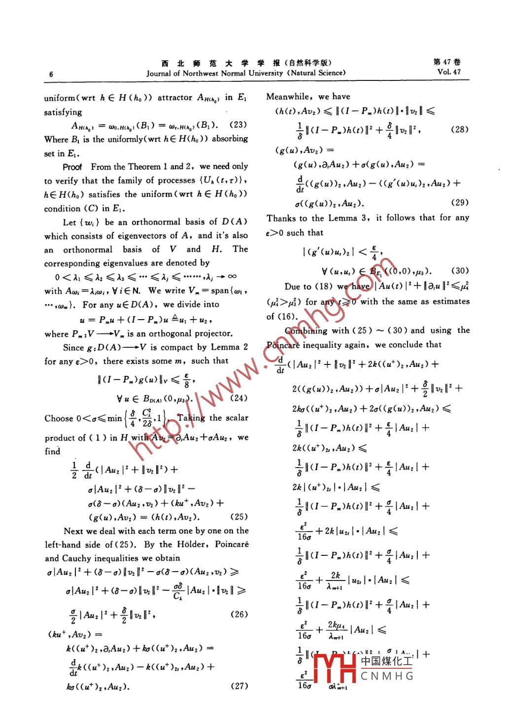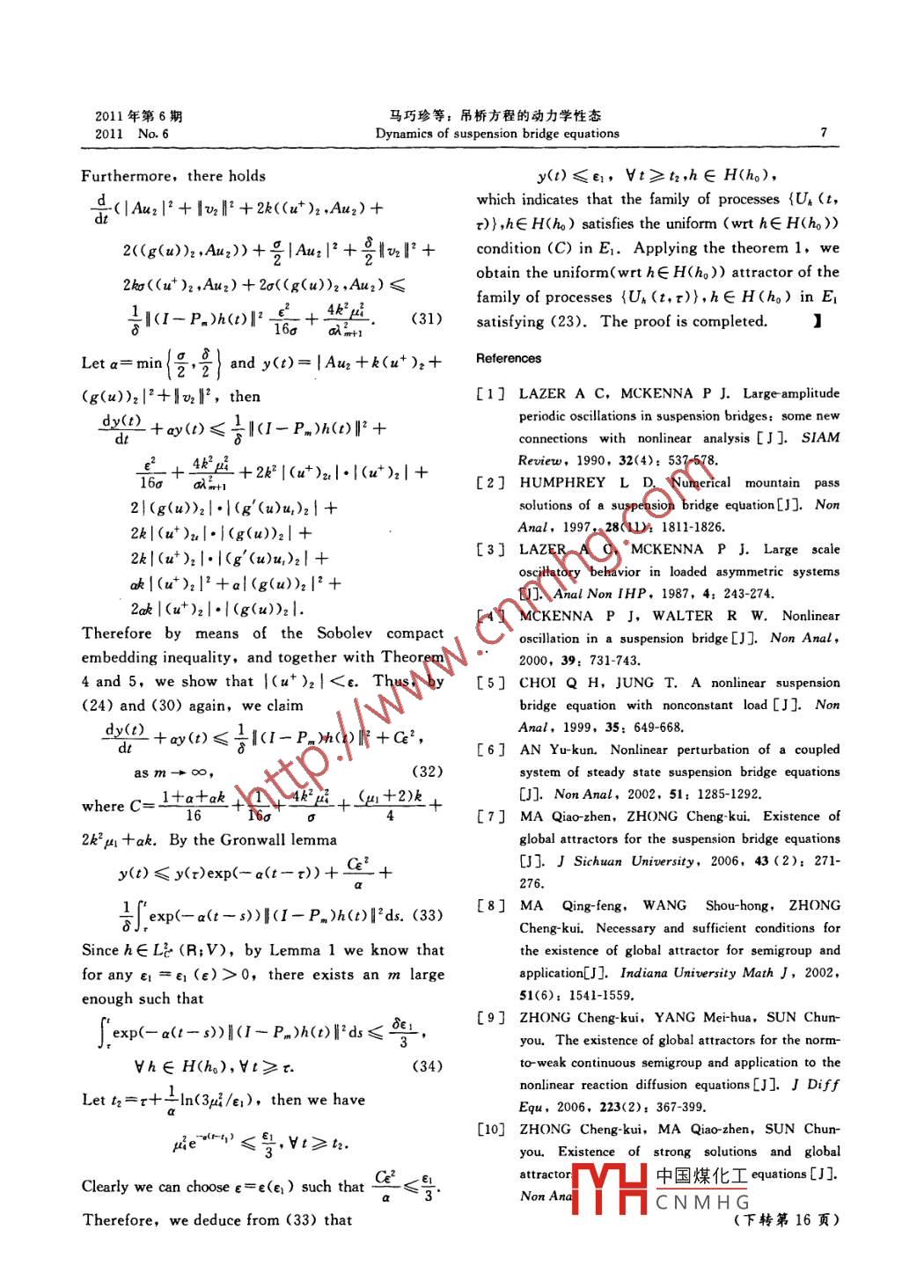 第47卷2011年第6期西北師范大學(xué)學(xué)報(自然科學(xué)版)Vol.472011No.6Journal of Northwest Normal University (Natural Science)吊橋方程的動力學(xué)性態(tài)馬巧珍,李志宇,汪璇(西北師范大學(xué)數(shù)學(xué)與信息科學(xué)學(xué)院,甘肅蘭州730070)摘要:研究弱阻尼非自治吊橋方程解的衰退估計,證明了讓方程在強(qiáng)拓?fù)淇臻g中存在一致吸引子關(guān)鍵詞:吊橋方程;一致嗄引子;一致條件(C);袁退估計中圖分類號:O175文獻(xiàn)標(biāo)識碼:A文章編號:1001-988X(2011)06-0001-07Dynamics of suspension bridge equationsMa Qiao-zhen, LI Zhi-yu, WANG Xuan(College of Mathematics and Information Science, Northwest Normal University, Lanzhou 730070, Gansu, China)Abstract: The decay estimates for the weakly damped nonautonomous suspension bridge equations areinvestigated in this paper, and then the existence of the uniform attractors in a stronger Hilbert space is proved.Key words: suspension bridge equation; uniform attractor; uniform condition(C); decay estimate1 Introductionbehavior of solution of 1 ) In [7 ],theexistence of global attractors in H(n)XL(n)forLet n be an open bounded subset of R2 with the autonomous suspension bridge equations, thatsufficiently smooth boundary r:. We study the is, h(r, t)=h(r) in(1), was investigated.following initial-boundary value problemConsequently, we achieved existence of stronguetAutaurtku+gu)=h(x,t),solutions and strong global attractors for the single(x,t)∈×R(1) suspension bridge equations and the coupled one=Va=0,x∈r,(2) respectively, in line with thermr=u,(r),a uImr = P, (x),rE R, (3) (C) introduced in [8, 9] and combining withwhere u(t, t)is an unknown function which techniques of the energy estimates(see [10, 11])represents the deflection of the road bed in the In this paper, we are going to focus on existencevertical plane, k>0 denotes a spring constant and of the uniform compact attractors of(1)-(38 is a positive constant.For a good survey of the literatures dedicated toThe suspension bridge equations were existence of attractors for the dynamical systemspresented by Lazer and McKenna as a new problem we would like to mention some monographs andin fields of the nonlinear analysis in[ 1 ] For works, such as [8-15] and so on(1), there were many literatures to studyFor the nonlinear function gE C(R, R)weexistence of solutions, see [1-6] and references presume the following general conditions: Theretherein. While we first studied the longtime exists a constant C>0 such that收稿日期:2011-03-18;修改稿收到日期:201109-15基金項目:國家自然科學(xué)基金資助項目(11101334);甘肅省自然科學(xué)基金資助項目(1107RJA223);甘肅省高?;究蒲袠I(yè)務(wù)費(fèi)項目中國煤化工作者簡介:馬巧珍(1972-),女,甘肅秦安人,教授,博士.主要研究方向為E-mail:maqzh@nwnu.edu.cnCNMH函統(tǒng)西北師范大學(xué)學(xué)報(自然科學(xué)版)第47卷Journal of Northwest Normal University (Natural ScienceVol 47exists to=to(r, B)>r such that UU,(t,t)BCBmify≥0G()=gx)dfor all t>to. a set Y Ce is said to be uniformly(G2) limsup4=0,v0≤y<∞;(wrt ges)attracting for the family of processesl→∞(G, )liminf _g(s)-C1G(s)U(t,r)},a∈Σ, if for any fixed t∈ R and every≥0B∈B(E),With the usual notation, we introduce thelim supdist(U, (t,T)B,Y)=0(7)spaces H=L'(n), V=H(n), and endow these where B(E)is the set of all bounded subset of E.spaces with the usual scalar products and normsDefinition 2 A closed set A=CE is said to be(…,),|,((…,),l1, respectively, wherethe uniform(wrt gE2)attractor of the family of(u, v)= u(r)v(r)dr,processes(L(,r)},o∈ E if it is uniformly(wrt∝∈E)attracting( attracting property)and it is contained(a,v)=△a(x)△v(x)dxin any closed uniformly (wrt oE2)attracting setWe write D(A)=H(n)n:(n), and forA' of the family of processes ( U(t,r)},d∈Σ,AxCA(minimal propertyevery u∈D(A),Aa=Δ2u. Especially, denoteI Au] the norm of D(A).The following basic assumption comes fromExploiting the Poincare inequality, thereapplications and is natural.exists a proper constant Ci>0, such thatAssumption 1 Let (T(r)Ir>o) be a family ofl|2≥clu|2,va∈V(4) operators acting on,?i)T(r)Σ=∑,r∈R;2 Non-autonomous systems and theirii)translation identity:U (t +r,+r)= Ur,(t,),attractorsd∈Σ,t≥r,r∈R,r≥0,(8)n this section we iterate some notations andNow we recall the results in [14]theorems in [13-15], which are necessary to getDefinition3 A family of processes (U, (t, t)our main results.∈Σ is said to be uniformly(wrta∈z) or limitLet e be a Banach space, and let a two compact if for any tER and BEB(E)the set Bparameter family of mappingsAUUU,(s, t)B is bounded for every t and{U(t,r)}={U(t,r)|t≥r,r∈R} act on EU(t,r):E→E,t≥r,r∈Rlim a(B, )=0. Where a is the Kuratowski measureDefinition 1 Let 2 be a parameter set. noncompactness defined by a(B)=inf (8 B admits a(U,(t,t)lt>r,tER), 0Ee is said to be a family of finite cover by set of diameter less than 8)processes in Banach space E, if for each g∈ΣTheorem 1 A family of processes (U, (t,t)U(t,r)} Is a process., that is, the twoσ∈Σ possesses compact uniform(wrta∈Σ)parameter family of mappings ( U, (t, r)) from E to attractor Ax satisfyingE satisfyAx=wx(Bo)=wr.(B),VTER (9)U2(t,s)·U(s,)=U(t,r),if and only if ityt≥s≥r,r∈Rbounded uniformly wrt oE 2U(r,r)=I,r∈R,6) absorbing set Boiwhere I is the identity operator, 2 is called the) is uniformly(wrta∈Σ) ar limit compact,symbol space and aE$ is the symbol.where a(B)=∩B, is the uniform(wrto∈E)a set B, Ce is said to be uniformly( wrt oEE) wr limit set中國煤化工absorbing set for the family of processes tU,(tNexted to verify theCNMHGr)},G∈∑, if for any t∈ R and B∈B(E), there uniform(wtVastness2011年第6期馬巧珍等:吊橋方程的動力學(xué)性態(tài)2011No.6Dynamics of suspension bridge equationsDefinition 4 A