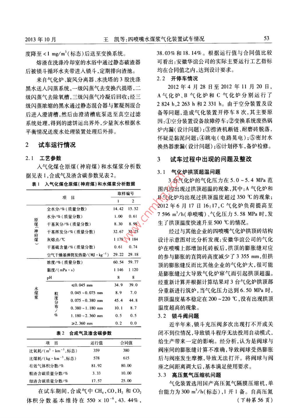52化肥工業(yè)第40卷第5期四噴嘴水煤漿氣化裝置試車情況王凱,王旭賓(安徽華誼化工有限公司安徽蕪湖241000)摘要一期四噴嘴水煤漿氣化裝置在試車期間岀現(xiàn)了氣化爐拱頂超溫、鎖斗閥關(guān)閉不到位、高壓氮?dú)鈮嚎s杋隔膜破裂、蒸發(fā)熱水塔填料或塔盤易結(jié)垢、預(yù)熱口封堵磚撥斷等冋題。根據(jù)實(shí)際情況進(jìn)行了改進(jìn)和優(yōu)化,目前裝置已進(jìn)入長(zhǎng)周期穩(wěn)定運(yùn)行階段。關(guān)鍵詞四噴嘴水煤漿氣化授料試車Trial Run of Four-Nozzle Coal Water Slurry Gasification UnitWang Kai, Wang XubinAnhui Huayi Chemical Co, Ltd. Anhui Wuhu 241000)Abstract The first phase four-nozzle coal water slurry gasification unit shows problems in trialrunning period, viz, overtemperature at arch of gasifier, incomplete closure of lock hopper valvebreakage of diaphragm of high-pressure nitrogen compressor, easy scaling of packing of evaporative hotwater tower or tower tray, and breakage of plugging brick preheating gate. According to the actualcondition improvement and optimization are carried out, so the gasification unit is now at the stage oflong-period stable operationKeywords four-nozzle coal-water slurry gasification commissioning test run安徽華誼化工有限公司(以下簡(jiǎn)稱安徽華誼公司)煤氣化裝置采用兗礦集團(tuán)有限公司和華東裝置工藝流程簡(jiǎn)述理工大學(xué)聯(lián)合開發(fā)的多噴嘴水煤漿氣化技術(shù),由原料煤破碎后進(jìn)入氣化煤倉(cāng),由稱量給料機(jī)華陸工程科技有限責(zé)任公司負(fù)責(zé)工程設(shè)計(jì),中國(guó)送入棒磨機(jī),與沉渣池灰水混合后,磨制得到質(zhì)量化學(xué)工程第三建設(shè)公司負(fù)責(zé)工程建設(shè)。分?jǐn)?shù)59%~62%的水煤漿,然后由磨煤機(jī)出口槽期工程建設(shè)3臺(tái)氣化爐,正常運(yùn)行為2開低壓煤漿泵送至煤漿槽。1備,氣化爐規(guī)格為φ3400mm×22000mm,氣煤漿槽內(nèi)的水煤漿經(jīng)煤漿給料泵加壓至化壓力為6.5MPa(表壓),氣化溫度為1330℃。9.5MPa后,與來自空分裝置的氧氣通過對(duì)噴的單臺(tái)氣化爐日處理煤量為1455t(干基),合成氣工藝燒嘴進(jìn)入氣化爐,在氣化爐燃燒室內(nèi)進(jìn)行部(CO+H2)產(chǎn)量104000m3/h(標(biāo)態(tài),干基)。氣分氧化反應(yīng);反應(yīng)生成的粗合成氣熔渣及未完全化裝置生產(chǎn)的合成氣用于600k/a甲醇、500kt/a反應(yīng)的碳通過燃燒室下部的渣口進(jìn)入氣化爐洗滌乙酸生產(chǎn)。冷卻室,與洗滌冷卻水沿洗滌冷卻管并流向下,粗期工程氣化裝置于2008年10月開工建合成氣被冷卻后在洗滌冷卻室的液位以下以鼓泡設(shè),2011年7月開始調(diào)試及預(yù)試車、聯(lián)動(dòng)試車的形式進(jìn)行洗滌和進(jìn)一步冷卻,然后由洗滌冷卻2012年1月20日B氣化爐一次投料試車成功。室上部空間出氣化爐;出氣化爐的粗合成氣經(jīng)混由于受空分裝置影響,全系統(tǒng)于2012年4月合器潤(rùn)濕、旋風(fēng)分離器分離大部分潤(rùn)濕的細(xì)灰后28日才正式進(jìn)入化工試車階段。送水洗塔進(jìn)一步洗滌除塵,將合成氣含塵質(zhì)量濃本文作者的聯(lián)系方式:252405932@q9cm2013年10月王凱等:四噴嘴水煤漿氣化裝置試車情況53度降至<1mg/m(標(biāo)態(tài))后送至變換系統(tǒng)。38.03%和18.14%。根據(jù)運(yùn)行值與合同值比較熔渣在洗滌冷卻室的水浴中通過靜態(tài)破渣器可看出:安徽華誼公司的實(shí)際主要運(yùn)行工藝指標(biāo)后被鎖斗循環(huán)水夾帶進(jìn)入鎖斗,定期排向渣池均在合同值之內(nèi),達(dá)到設(shè)計(jì)要求。來自氣化爐、旋風(fēng)分離器水洗塔的3股洗滌22開停車情況黑水送入閃蒸系統(tǒng),一級(jí)閃蒸氣去變換汽提塔,二2012年4月28日至2012年11月20日,級(jí)閃蒸氣去除氧槽,三級(jí)閃蒸氣冷凝后回收經(jīng)三A氣化爐、B氣化爐和C氣化爐分別運(yùn)行了級(jí)閃蒸濃縮的黑水通過靜態(tài)混合器與絮凝劑混合2824h,2263h和2331h。由于空分裝置及設(shè)后進(jìn)入澄清槽,然后由澄清槽底泵送至真空過濾備等問題造成氣化裝置開停車8次,其主要原系統(tǒng)處理得到的濾餅運(yùn)出界外,少量灰水根據(jù)水因:①空分裝置設(shè)備故障停車②變換系統(tǒng)廢熱鍋平衡情況送廢水處理裝置處理后外排。爐內(nèi)漏(設(shè)計(jì)問題);③撈渣機(jī)斷鏈、耐磨磚脫落,懷疑是黏泥問題;④跳電(電路晃電);⑤密封水2試車運(yùn)行情況換熱器泄漏(設(shè)計(jì)問題);⑥計(jì)劃停車,備爐檢修。2.1工藝參數(shù)3試車過程中出現(xiàn)的問題及整改入氣化煤倉(cāng)原煤(神府煤)和水煤漿分析數(shù)據(jù)見表1,合成氣及渣含碳參數(shù)見表2。3.1氣化爐拱頂超溫問題表1入氣化煤倉(cāng)原煤(神府煤)和水煤漿分析數(shù)據(jù)3臺(tái)氣化爐的氣化壓力在5.0~5.4MPa范圍內(nèi)均出現(xiàn)過拱頂超溫的現(xiàn)象,其中:A氣化爐和取樣編號(hào)B氣化爐均出現(xiàn)過拱頂溫度超過350℃的現(xiàn)象;全水分/%(質(zhì)量分?jǐn)?shù))14.4215.522012年6月17日16:17,C氣化爐負(fù)荷提高至水分/%(質(zhì)量分?jǐn)?shù)1.000.6l7596m3/h(單噴嘴)、氣化壓力5.58MPa時(shí),發(fā)干基灰分/%(質(zhì)量分?jǐn)?shù))8.308.99生了拱頂溫度快速升至500℃的情況。神干基揮發(fā)分/%(質(zhì)量分?jǐn)?shù))經(jīng)過與其他企業(yè)的四噴嘴氣化爐拱頂磚結(jié)構(gòu)煤灰熔點(diǎn)/℃l1791184設(shè)計(jì)示