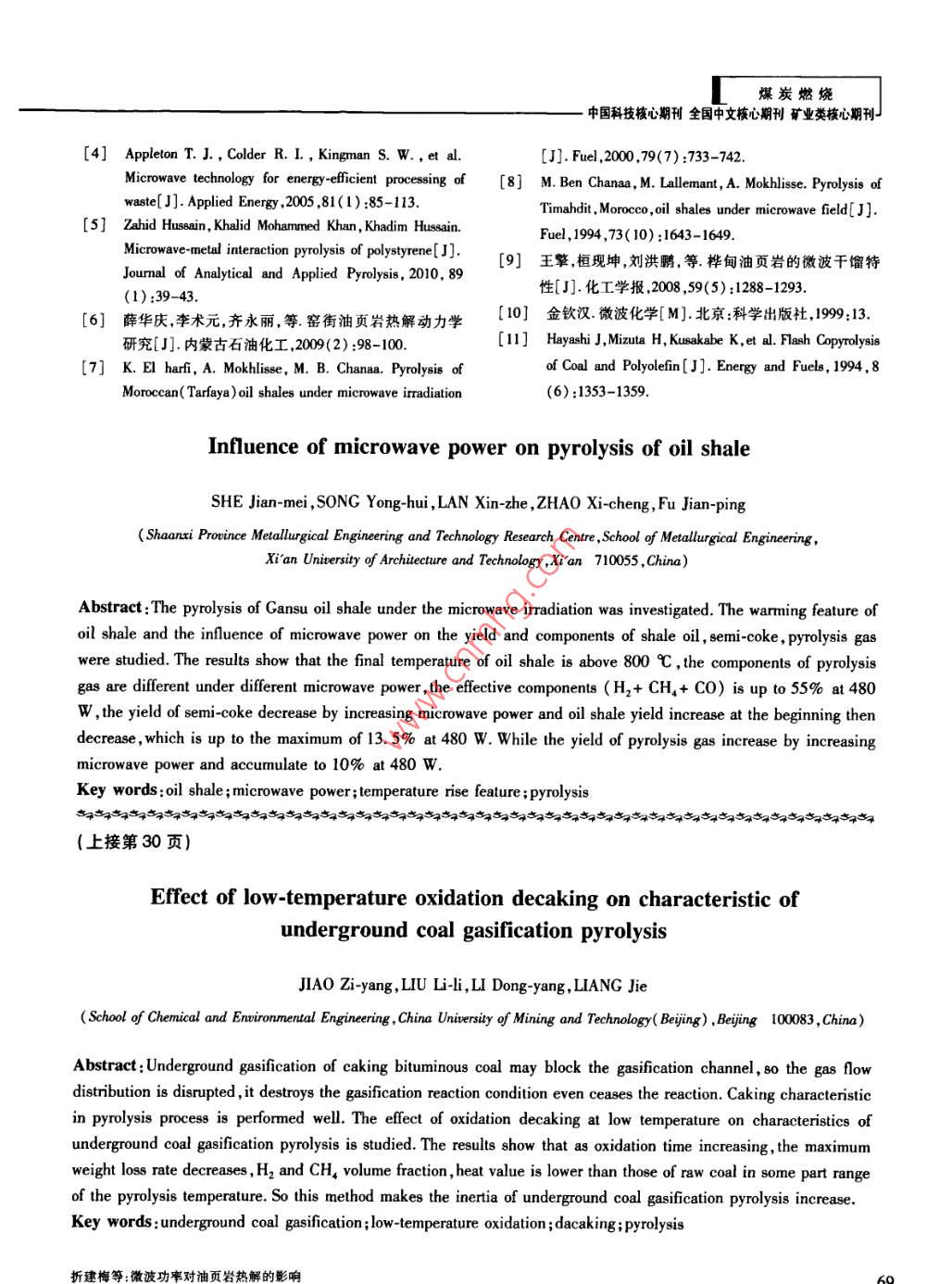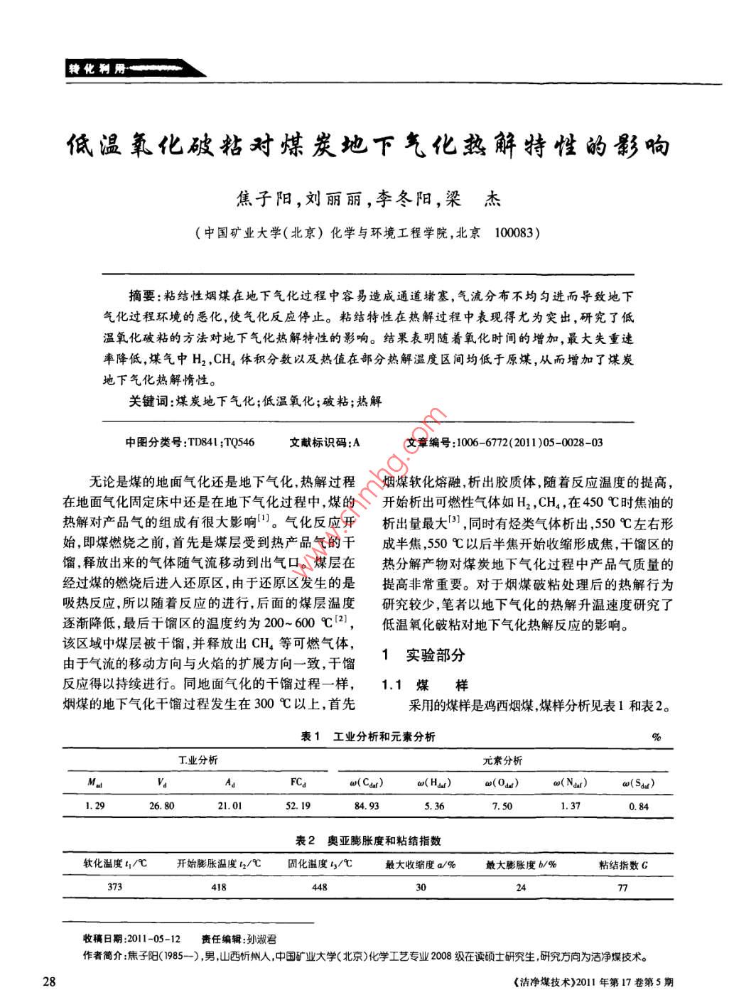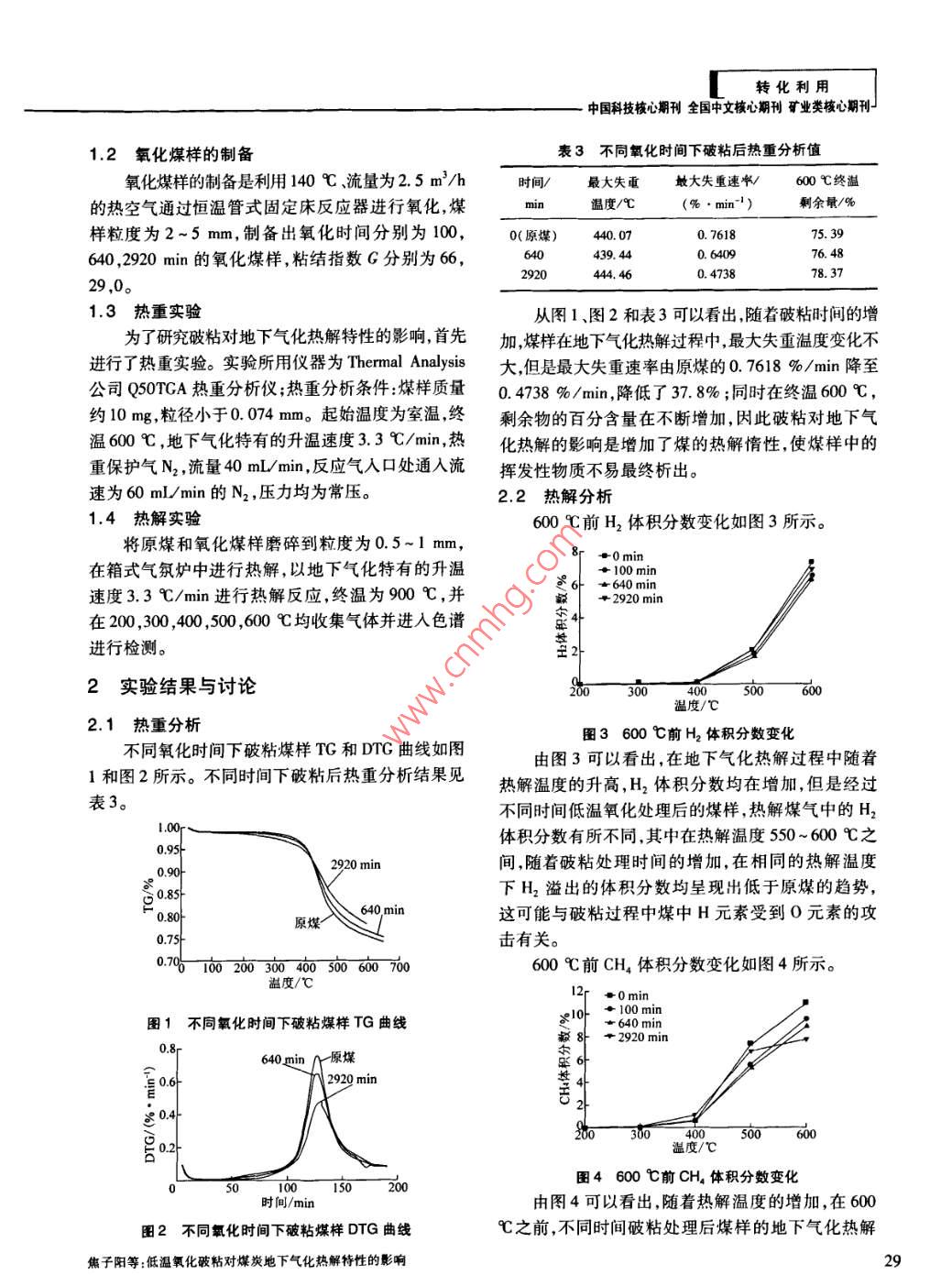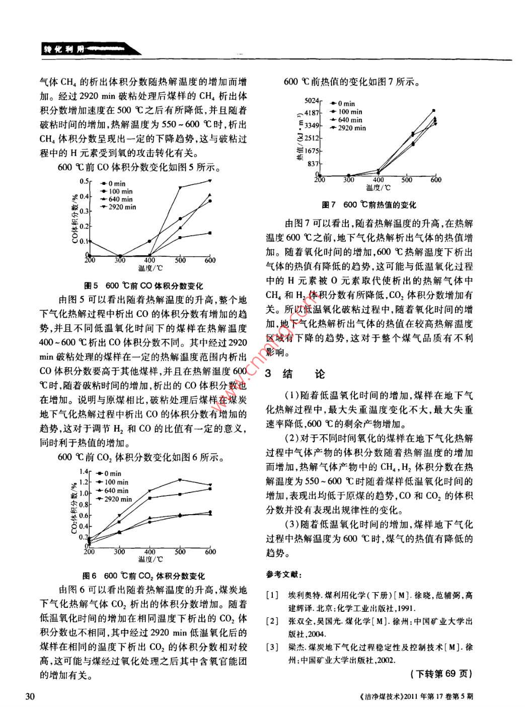 轉化利冊低溫氧化破粘對煤炭地下氣化熱解特性的影響焦子陽,劉麗麗,李冬陽,梁杰(中國礦業(yè)大學(北京)化學與環(huán)境工程學院,北京100083)摘要:粘結性煙煤在地下氣化過程中容易造成通道堵塞,氣流分布不均勻進而導致地下氣化過程環(huán)境的惡化,使氣化反應停止。粘結特性在熱解過程中表現得尤為突出,研究了低溫氧化破粘的方法對地下氣化熱解特性的影響。結果表明隨著氧化時間的增加,最大失重速率降低,煤氣中H2 ,CH,體積分數以及熱值在部分熱解溫度區(qū)間均低于原煤,從而增加了煤炭地下氣化熱解惰性。關鍵詞:煤炭地下氣化;低溫氧化;破粘;熱解中圖分類號:TD841 ;TQ546文獻標識碼:A文章編號:1006 -6772(2011 )05-0028-03無論是煤的地面氣化還是地下氣化,熱解過程煙煤軟化熔融,析出膠質體,隨著反應溫度的提高,在地面氣化固定床中還是在地下氣化過程中,煤的開始析出可燃性氣體如H2,CH,,在450C時焦油的熱解對產品氣的組成有很大影響"。氣化反應開析出量最大),同時有烴類氣體析出,550 C左右形始,即煤燃燒之前,首先是煤層受到熱產品氣的干成半焦,550C以后半焦開始收縮形成焦,干餾區(qū)的餾,釋放出來的氣體隨氣流移動到出氣口。煤層在熱分解產物對煤炭地下氣化過程中產品氣質量的經過煤的燃燒后進人還原區(qū),由于還原區(qū)發(fā)生的是提高非常重要。對于煙煤破粘處理后的熱解行為吸熱反應,所以隨著反應的進行,后面的煤層溫度研究較少,筆者以地下氣化的熱解升溫速度研究了逐漸降低,最后干餾區(qū)的溫度約為200~600C[2),低溫氧化破粘對地下氣化熱解反應的影響。該區(qū)域中煤層被干餾,并釋放出CH,等可燃氣體,1實驗部分由于氣流的移動方向與火焰的擴展方向一致,干餾反應得以持續(xù)進行。同地面氣化的干餾過程- -樣,1.1 煤樣煙煤的地下氣化干餾過程發(fā)生在300 C以上,首先采用的煤樣是雞西煙煤,煤樣分析見表1和表2。表1工業(yè)分析和元素分析%工業(yè)分析元素分析MuV。IdFC。w(Cau)w(Hsx)w(Oar)w(Nux)w(Sax)1. 2926. 8021.0152. 1984.935.367.501.370.84 .表2奧亞膨脹度和粘結 指數軟化溫度1/9C .開始膨脹溫度u2/C .固化溫度1:/心最大收縮度a/%最大膨脹度b/%粘結指數G7341830277收稿日期:2011-05-12責任編輯:孫淑君作者簡介:焦子陽(1985- -) ,男,山西忻州人,中國礦業(yè)大學(北京)化學工藝專業(yè)2008級在讀碩士研究生,研究方向為潔凈煤技術。28《潔凈媒技術>2011年第17卷第5期轉化利用中國科技核心期刊全國中文核心期刊礦業(yè)類核心期刊J1.2氧化煤樣的制備表3不同氧化時間下破粘后熱重分析值氧化煤樣的制備是利用140 C、流量為2.5 m'/h時間/最大失重最大失重速嘟/600 C終溫的熱空氣通過恒溫管式固定床反應器進行氧化,煤in溫度/心(% . min-!)剩余最/%樣粒度為2~5 mm,制備出氧化時間分別為100,0(原煤)440.070. 761875.39640,2920min的氧化煤樣,粘結指數G分別為66,439. 440. 640976. 48.2920444, 460.473878. 3729 ,0。1.3 熱重實驗從圖1、圖2和表3可以看出,隨著破粘時間的增為了研究破粘對地下氣化熱解特性的影響,首先加,煤樣在地下氣化熱解過程中,最大失重溫度變化不進行了熱重實驗。實驗所用儀器為Thermnal Analysis大,但是最大失重速率由原煤的0. 7618 %/min降至公司Q50TCA熱重分析儀;熱重分析條件:煤樣質量0.4738 %/min,降低了37. 8% ;同時在終溫600 C,約10 mg,粒徑小于0.074 mm。起始溫度為室溫,終剩余物的百分含量在不斷增加,因此破粘對地下氣溫600 C ,地下氣化特有的升溫速度3.3 C/min,熱化熱解的影響是增加了煤的熱解惰性,使煤樣中的重保護氣N2,流量40 mL/min,反應氣人口處通人流揮發(fā)性物質不易最終析出。速為60 ml/ min的N2 ,壓力均為常壓。2.2熱解分析1.4熱解實驗600C前H2體積分數變化如圖3所示。將原煤和氧化煤樣磨碎到粒度為0.5~1 mm,8r +0 min在箱式氣氛爐中進行熱解,以地下氣化特有的升溫女100 minR6-士640min速度3.3 C/min進行熱解反應,終溫為900 C,并+ 2920 min64在200 ,300 ,400 ,500 ,600 C均收集氣體并進入色譜進行檢測。2實驗結果與討論00300溫度/C5006002.1 熱重分析圖3600 C前H2體積分數變化不同氧化時間下破粘煤樣TG和DTG曲線如圖由圖3可以看出,在地下氣化熱解過程中隨著1和圖2所示。不同時間下破粘后熱重分析結果見熱解溫度的升高,H2體積分數均在增加,但是經過表3。.不同時間低溫氧化處理后的煤樣,熱解煤氣中的H21.00體積分數有所不同,其中在熱解溫度550~600C之0.952920 min間,隨著破粘處理時間的增加,在相同的熱解溫度, 0.90下H2溢出的體積分數均呈現出低于原煤的趨勢,; 0.85、 640.min這可能與破粘過程中煤中H元素受到0元素的攻原煤‘0.75擊有關。100200300400500600700600C前CH,體積分數變化如圖4所示。12p。0min+ 100mir圖1不同氧化時間下破粘煤樣 TG曲線。640 min,2920 min0.8-640min /原煤80.4-6o圖4600 C前CH,體積分數變化50時間/min100150200由圖4可以看出,隨著熱解溫度的增加,在600圖2 不同氧化時間下破粘煤樣DTG曲線C之前,不同時間破粘處理后煤樣的地下氣化熱解焦子陽等:低溫氧化破粘對煤炭地下氣化熱解特性的影響29轉化利用氣體CH,的析出體積分數隨熱解溫度的增加而增600 C前熱值的變化如圖7所示。加。經過2920min破粘處理后煤樣的CH,析出體5024p● 0mir積分數增加速度在500 C之后有所降低,并且隨著-4187- t 100 min破粘時間的增加,熱解溫度為550~600C時,析出E 33494干2920 minCH,體積分數呈現出一定的下降趨勢,這與破粘