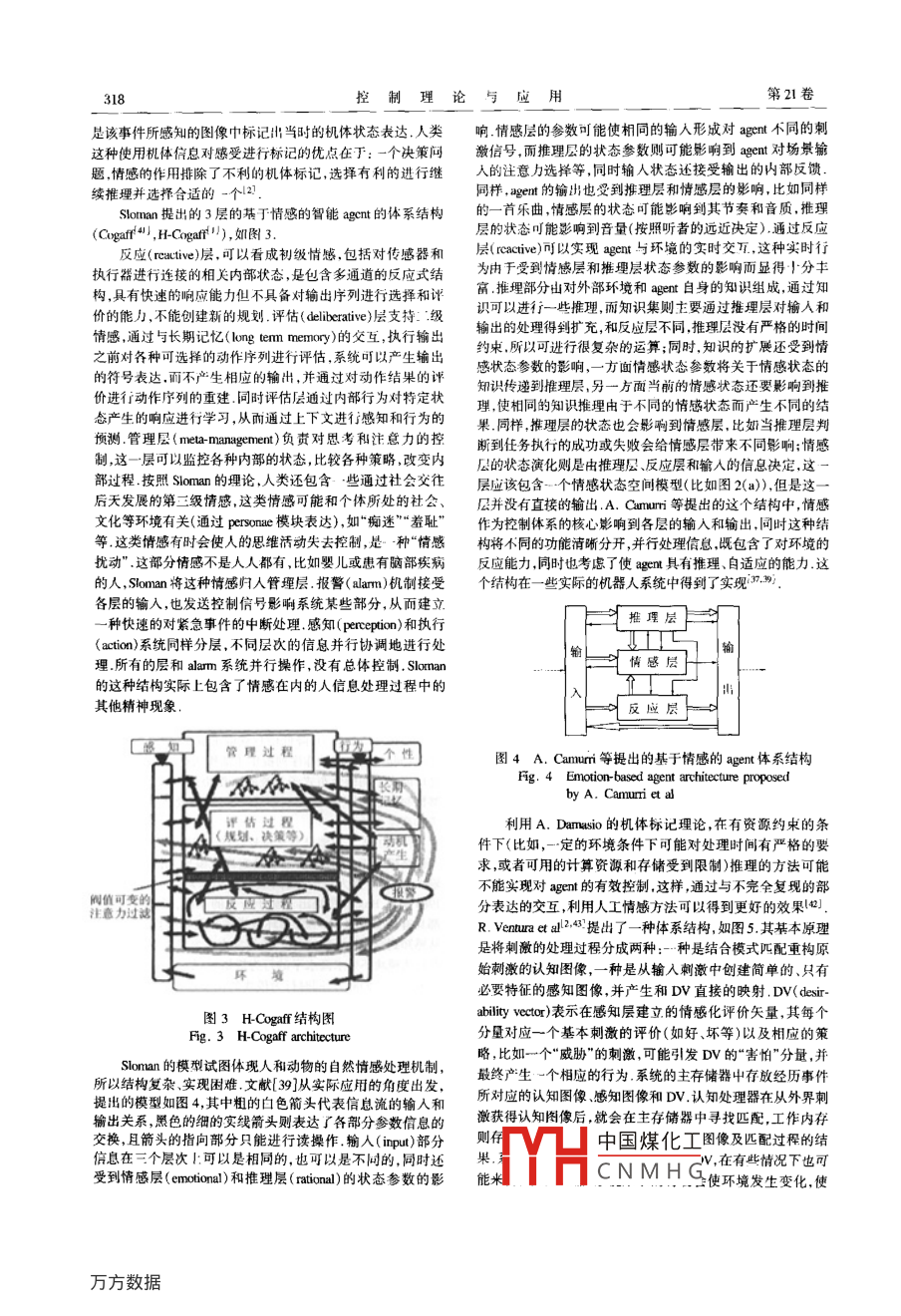 第21卷第2期控制理論與應(yīng)用Vol 21 No. 22004年4月Control Theory ApplicationsApr. 2004文章編號(hào):1000-8152(2004)02-0315-06人工情感及其應(yīng)用宋亦旭,賈培發(fā)(清華大學(xué)計(jì)算機(jī)系智能技術(shù)與系統(tǒng)國(guó)家重點(diǎn)實(shí)驗(yàn)室,北京10084)摘要:白然系統(tǒng)中,情感影響人的行為日前,人1情感在擬人agem的研究得到了越來(lái)越多的重視為此本文從工程角度綜述了人工情感研究的基問(wèn)題簡(jiǎn)要介紹了幾類情感模型,并著重討論了基于人L情感的 agent體系結(jié)構(gòu)的典型應(yīng)用人工情感的研究不僅休現(xiàn)在情感辨識(shí)情感表達(dá)等入機(jī)交互方面,同時(shí)情感的作用機(jī)理也影響到智能egcm的挖制體系結(jié)構(gòu)和算法設(shè)計(jì)某于人工情感的體系結(jié)構(gòu)具有混合分層的特點(diǎn),強(qiáng)調(diào)情感和其他過(guò)程的聯(lián)系以增強(qiáng)gent在與動(dòng)態(tài)環(huán)境交互屮的白適應(yīng)能力.在這個(gè)結(jié)構(gòu)中人工情感的核心作用主要體現(xiàn)在兩個(gè)方面:首先,人工情感是聯(lián)系 agent的內(nèi)部狀態(tài)和外部環(huán)境的基礎(chǔ),情感狀態(tài)影響到aem信息處理的整個(gè)過(guò)程,包括緊急情況下的快速響應(yīng)和規(guī)劃任務(wù)時(shí)的復(fù)雜推理其次,人工情感作為內(nèi)部驅(qū)動(dòng)機(jī)制對(duì)學(xué)習(xí)過(guò)程十分重要,人工情感作為強(qiáng)化刺激促使aent刨建更復(fù)雜的行為功能在設(shè)計(jì)屮引人人工情感,對(duì) agent實(shí)現(xiàn)智能化和個(gè)性化至關(guān)重要關(guān)鍵詞: agent;人工情感;體系結(jié)構(gòu)中圖分類號(hào):TP8文獻(xiàn)標(biāo)識(shí)碼:AArtificial emotion and its applicationsSONG YI-Xu, JIA Pei-fa( State Key Lab of Intelligent Technology and System, Department of Computer Science and TechnologyTsinghua Univcrsity, Beijing 100084, ChinaAbstract: The natural emotion plays a significant role in human behavior. Current research in Al shows an increasing in-terest in artificial emotion for developing the human-like agent. In this paper a survey of basic issues of artificial emotion fromthe engineering point of view is given, bricfly introducing several emotion models with emphasis on typical implementations ofartificial emotion-based agent architecture. Research on artificial emotion is reflected in the human-computer interaction(HCT)ch as emotion identification and emotion expression, the action mechanism of emotion also influences the control architectureand algorithm design of the intelligent agent. The emotion-based architecture being hybrid-layered emphasizes the links betweenemotion and other processes to enhance adaptive capability of agents in a dynamic environment. In the architecture the centralrole of artificial emotion is incarnated mainly in two aspects: First, the artificial emotion is the basis of connecting intemal statusof an agent with its extemal situation, and emotion affects the whole process of information processing, including both the quicksponse in an emergency and the complicated reasoning for planning a task; Second, the artificial emotion as an endogenouscreate more complex behavioral functionsEmbedding artificial emotion in the architecture is essential for agents to be more intelligent and personalizeKey words: agent; artificial emotion; architecture1引言( Introduction)的新發(fā)現(xiàn)支持了情感對(duì)人的智能活動(dòng)有著至關(guān)重要的影響對(duì)情感( emotion)的研究并不是很新的話題,早在1%67年的論斷A. Damasio的著名實(shí)驗(yàn)對(duì)此給出了比較充分的理論Simm就開(kāi)始了對(duì)人類認(rèn)知中有關(guān)情感的研究,Sm則從證據(jù)按照 Damasio的實(shí)驗(yàn)負(fù)責(zé)處理情感的神經(jīng)子系統(tǒng)出20世紀(jì)80年代初開(kāi)始擬人aen( human-like agent)建模方面的現(xiàn)問(wèn)題的病人,推理和決策能力也會(huì)受到很大的影響例如,研究,但早期的人工智能研究中對(duì)引入情感問(wèn)題存在爭(zhēng)論,這種病人甚至不能很好地處理和醫(yī)生進(jìn)行預(yù)約的計(jì)劃2有些學(xué)者認(rèn)為情感并不是必須的或者是只會(huì)干擾推理的Damasio的理論在A( artificial intelligence)領(lǐng)域的影響丿泛而以情感在傳統(tǒng)的人工智能研究中并沒(méi)有得到足夠的重視深刻從應(yīng)用角度,人們對(duì) agent(或 agent的硬件表達(dá)—機(jī)但是隨著科技的不斷發(fā)展,悄感研究逐漸變得重要起器人)擬人化的研究逐漸興起3,這種研究不僅需要更好的來(lái),這主要米自兩個(gè)方面的支持:從理論角度,神經(jīng)生物科學(xué)系統(tǒng)體系結(jié)構(gòu)支持 agent.或機(jī)器人具有更強(qiáng)的環(huán)境適應(yīng)性收稿日期:2002-12-24;收修改稿日期:203-09-04中國(guó)煤化工CNMHG控制理論與應(yīng)用第21卷同時(shí)要求其具有個(gè)性化的與人交流的能力② Agent的情感表達(dá)于此,近年來(lái)有關(guān)人工情感( artificial emotion)的研究栩栩如生”一直是小說(shuō)、戲劇、電影等藝術(shù)手段追求的不斷受到更多學(xué)者的重視,相關(guān)的文章、會(huì)議、雜志、網(wǎng)站逐效果,而在人工情感的研究中則提出 r believable agent14漸增多,人工情感研究的層面也逐漸豐富,并月在應(yīng)用上取及 Animated agent4,等,研究 agent如何更形象化地表達(dá)內(nèi)得了一系列的成果將情感納入人類精神活動(dòng)的框架,將情部情感狀態(tài),進(jìn)行“栩栩如生”