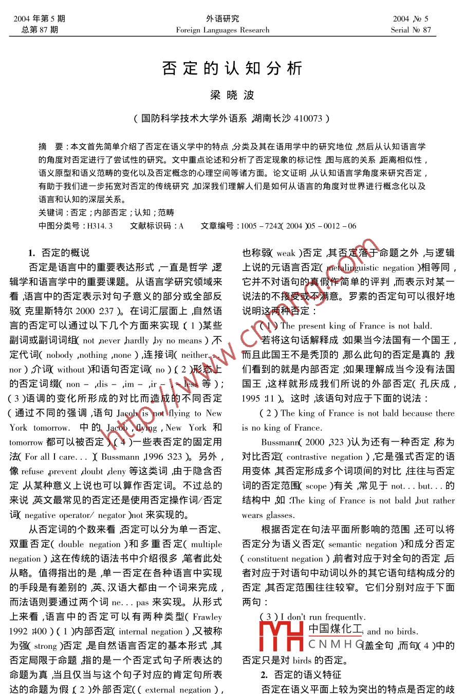 2004年第5期外語(yǔ)研究2004 ,No 5總第87期Foreign Languages ResearchSerial NO 87否定的認(rèn)知分析梁曉波(國(guó)防科學(xué)技術(shù)大學(xué)外語(yǔ)系湖南長(zhǎng)沙410073 )摘要:本文首先簡(jiǎn)單介紹了 否定在語(yǔ)義學(xué)中的特點(diǎn)分類及其在語(yǔ)用學(xué)中的研究地位然后從認(rèn)知語(yǔ)言學(xué)的角度對(duì)否定進(jìn)行了嘗試性的研究。文中重點(diǎn)論述和分析了否定現(xiàn)象的標(biāo)記性圖與底的關(guān)系距離相似性,語(yǔ)義原型和語(yǔ)義范疇的變化以及否定概念的心理空間等諸方面。論文證明,從認(rèn)知語(yǔ)言學(xué)角度來(lái)研究否定,有助于我們進(jìn)一步拓寬對(duì)否定的傳統(tǒng)研究加深我們理解人們是如何從語(yǔ)言的角度對(duì)世界進(jìn)行概念化以及語(yǔ)言和認(rèn)知的深層關(guān)系。關(guān)鍵詞:否定;內(nèi)部否定;認(rèn)知;范疇中圖分類號(hào):H314.3文獻(xiàn)標(biāo)識(shí)碼 :A .文章編號(hào):1005 -7242( 2004 )05 -0012-061.否定的概說(shuō)也稱弱weak )否定其否定落于命題之外與邏輯否定是語(yǔ)言中的重要表達(dá)形式,一直是哲學(xué)邏上說(shuō)的元語(yǔ)言否定( metalinguistic negation )相等同,輯學(xué)和語(yǔ)言學(xué)中的重要課題。從語(yǔ)言學(xué)研究領(lǐng)域來(lái)它并不對(duì)語(yǔ)句的真假作簡(jiǎn)單的評(píng)判而表示對(duì)某一看,語(yǔ)言中的否定表示對(duì)句子意義的部分或全部反說(shuō)法|的不接受或不滿意。羅素的否定句可以很好地駁克里斯特爾2000 237 )。在詞匯層面上,自然語(yǔ)說(shuō)明這兩種否定:言的否定可以通過(guò)以下幾個(gè)方面來(lái)實(shí)現(xiàn)( 1 )某些( 1 ) The present king of France is not bald. .副詞或副詞詞組( not never ,hardly by no means )不若將這句話解釋成如果當(dāng)今法國(guó)有-個(gè)國(guó)王,定代詞( nobody ,nothing ,none ) ,連接詞( neither...而且此國(guó)王不是禿頂?shù)哪敲创司涞姆穸ㄊ钦娴奈襫or )介詞without )和語(yǔ)句否定詞( no)( 2 )形態(tài)上們看到的就是內(nèi)部否定;如果理解成當(dāng)今沒(méi)有法國(guó)的否定詞綴( non- ,dis- ,im- ir- ,-less等);國(guó)王,這樣就形成我們所說(shuō)的外部否定(孔慶成,(3)語(yǔ)調(diào)的變化所形成的對(duì)比而造成的不同否定1995 :11 )。這時(shí),該語(yǔ)句對(duì)應(yīng)于下面的說(shuō)法:(通過(guò)不同的強(qiáng)調(diào),語(yǔ)句Jacob is not flying to New( 2 ) The king of France is not bald because thereYork tomorrow. 中的Jacob , flying ,New York 和is no king of France.tomorrow都可以被否定)( 4 )一些表否定的固定用Bussmann( 2000 323 )認(rèn)為還有一種否定 稱為法( For all I care... X Bussmann ,1996 323 )。另外,對(duì)比否定( contrastive negation ) ,它是強(qiáng)式否定的語(yǔ)像refuse prevent ,doubt deny等這類詞,由于隱含否用變體其否定形成多個(gè)詞項(xiàng)間的對(duì)比往往與否定定從某種意義上說(shuō)也可以算作否定詞。不過(guò)總的詞的否定范圍scope )有關(guān),常 見(jiàn)于not... but...的來(lái)說(shuō)英文最常見(jiàn)的否定還是使用否定操作詞/否定結(jié)構(gòu)中,如:The king of France is not bald ,but rather詞( negative operator/ negator )not 來(lái)實(shí)現(xiàn)的。wears glasses.從否定詞的個(gè)數(shù)來(lái)看,否定可以分為單一否定、根據(jù)否定在句法平面所影響的范圍,還可以將雙重否定( double negation )和多重否定( multiple否定分為語(yǔ)義否定( semantie negation )和成分否定negation )這在傳統(tǒng)的語(yǔ)法書中介紹很多筆者此處( constituent negation )前者對(duì)應(yīng)于對(duì)全句的否定后從略。值得指出的是,單-否定在各種語(yǔ)言中實(shí)現(xiàn)者對(duì)應(yīng)于對(duì)語(yǔ)句中動(dòng)詞以外的其它語(yǔ)句結(jié)構(gòu)成分的的手段是有差別的英、漢語(yǔ)大都由一個(gè)詞來(lái)完成,否定其否定范圍往往較窄。它們分別對(duì)應(yīng)于下面而法語(yǔ)則要通過(guò)兩個(gè)詞ne... pas來(lái)實(shí)現(xiàn)。從形式兩句:,上來(lái)看,語(yǔ)言中的否定可以有兩種類型(Frawley(3 )I don't run frequently.1992 :400 )( 1 )內(nèi)部否定( intermal negation ) ,又被稱YH中國(guó)煤化工and no birds.為強(qiáng)( strong )否定是自然語(yǔ)言否定的基本形式其CN MH G蓋全句,而句( 4 )中的否定局限于命題指的是-個(gè)否定式句子所表達(dá)的否定只是對(duì)birds的否定。命題為真當(dāng)且僅當(dāng)與這個(gè)句子對(duì)應(yīng)的肯定句所表2.否定的語(yǔ)義特征達(dá)的命題為假{ 2 )外部否定(( extermal negation ),否定在語(yǔ)義平面上較為突出的特點(diǎn)是否定的歧- 12義性。由于否定詞否定的焦點(diǎn)不同,會(huì)造成語(yǔ)句否( 11 ) John managed to stop in time.定的對(duì)象產(chǎn)生差異,這樣語(yǔ)句的歧義也就產(chǎn)生了。( 11a ) John didn't manage to stop in time.如下句:( 11b ) John stopped in time.( 5 )I don't beat my wife because I like her.( 11c ) John tried to stop in time. ( Ibid ,178 )此句可以有下面兩種解釋:但在語(yǔ)用研究中,否定所處的地位確實(shí)是未受(5a)It is because I like her that I don't beat my應(yīng)有重視的這與利奇( Leech 1983 :100- 102 ))對(duì)wife.否定句所下的評(píng)語(yǔ)不無(wú)關(guān)系。他認(rèn)為相對(duì)于肯定的(5b)It is not because I like her that I beat my形式,否定句在語(yǔ)用中不怎么受歡迎( less