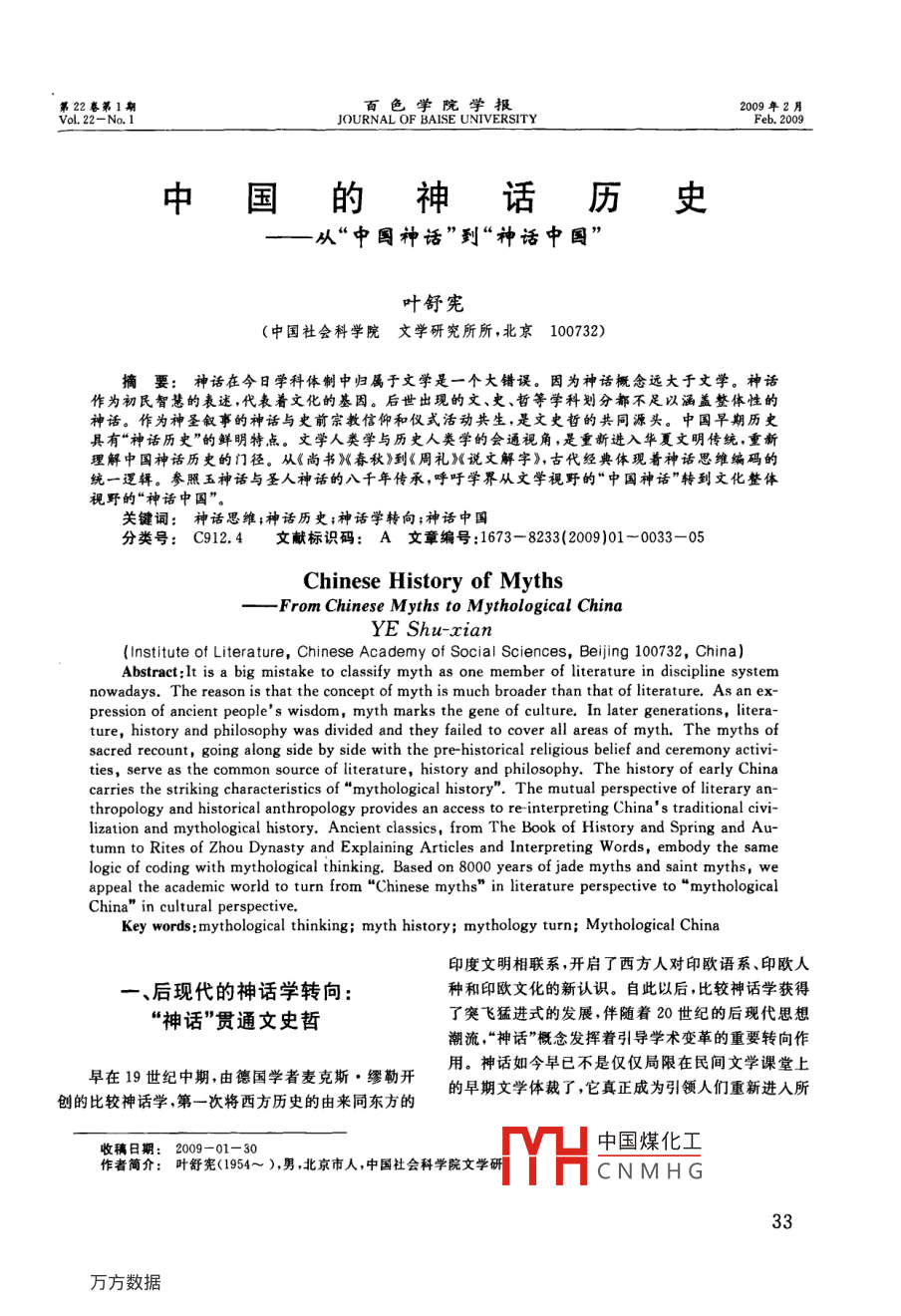 第22卷第1期百色學院學報JOURNAL OF BAISE UNIVERSITYFeb.2009中國的神話歷史從“中圓神話”到“神話中國”葉舒憲(中國社會科學院文學研究所所,北京100732)摘要:神話在今日學科體制中歸屬于文學是一個大錯誤。因為神話概念遠大于文學。神話作為初民智慧的表述,代表著文化的基因。后世出現(xiàn)的文、史、哲等學科劃分都不足以涵蓋整體性的神話。作為神圣敘事的神話與史前宗教信仰和儀式活動共生,是文史哲的共同源頭。中國早期歷史具有“神話歷史”的鮮明特點。文學人類學與歷史人類學的會通視角,是重新進入華夏文明傳統(tǒng),重新理解中國神話歷史的門徑。從《尚書Ⅸ春秋》到《周禮》《說文解字》,古代經(jīng)典體現(xiàn)著神話思維編碼的統(tǒng)一邏輯。參照玉神話與圣人神話的八千年傳承,呼吁學界從文學視野的“中國神話”轉(zhuǎn)到文化整體視野的“神話中國”關(guān)鍵詞:神話思維;神話歷史;神話學轉(zhuǎn)向;神話中國分類號:C912.4文獻標識碼:A文章編號:1673-8233(2009)01-0033-05Chinese History of MythsFrom Chinese myths to Mythological chinaYE Shu-cianInstitute of Literature, Chinese Academy of Social Sciences, Beijing 100732, China)Abstract: It is a big mistake to classify myth as one member of literature in discipline systemnowadays. The reason is that the concept of myth is much broader than that of literature. As an expression of ancient peoples wisdom, myth marks the gene of culture. In later generations, litera-ure, history and philosophy was divided and they failed to cover all areas of myth. The myths ofsacred recount, going along side by side with the pre-historical religious belief and ceremony activi-ties, serve as the common source of literature, history and philosophy. The history of early Chinacarries the striking characteristics ofmythological history". The mutual perspective of literary an-thropology and historical anthropology provides an access to re-interpreting Chinas traditional civi-lization and mythological history. Ancient classics, from The Book of History and Spring and Au-tumn to rites of Zhou dynasty and Explaining Articles and Interpreting Words, embody the samelogic of coding with mythological thinking. Based on 8000 years of jade myths and saint myths, weappeal the academic world to turn from"Chinese myths"in literature perspective to"mythologicalKey words: mythological thinking: myth history; mythology turn; Mythological China印度文明相聯(lián)系,開啟了西方人對印歐語系、印歐人后現(xiàn)代的神話學轉(zhuǎn)向種和印歐文化的新認識。自此以后,比較神話學獲得神話”貫通文史哲了突飛猛進式的發(fā)展,伴隨著20世紀的后現(xiàn)代思想潮流,“神話”概念發(fā)揮著引導學術(shù)變革的重要轉(zhuǎn)向作早在19世紀中期,由德國學者麥克斯·繆勒開用。神話如今早已不是僅僅局限在民間文學課堂上的早期文學體裁了,它真正成為引領(lǐng)人們重新進入所創(chuàng)的比較神話學第一次將西方歷史的由來同東方的收稿日期:2009-01-30中國煤化工作者簡介:葉舒憲(1954~),男,北京市人,中國社會科學院文學研HHCNMHG《百色學院學報》2009年第1期有文明傳統(tǒng)之本源和根脈的一個有效門徑。研究實老神話生命體的一種變相的延續(xù)或“置換”。因此,不踐表明,神話作為跨文化和跨學科的一種概念工具,了解置換之前的原型,就無從理解文學。就如同在遇它具有貫通文史哲宗教道德法律諸學科的多邊際整到李鬼之前沒有見過李逵,很難對變形的模仿者有所合性視野。從這種整合性視野看,神話是作為文化基識別。按照弗萊的看法,文學從屬于神話,而非神話因而存在的,它必然對特定文化的宇宙觀、價值觀和從屬于文學。若考慮到神話與宗教信仰和儀式活動行為禮儀等發(fā)揮基本的建構(gòu)和編碼作用。因而,不光的原初關(guān)聯(lián),則神話的概念要比文學的概念寬廣多是學習文學要從神話開始;要進入歷史,首先面對的了。這就是在文學一科里所看到的情況:神話如何從就是神話歷史;要進入哲學史,首先就要熟悉神話哲“潛龍勿用”狀態(tài),發(fā)展到騰龍升天的局面。學和神話思維神話在20世紀的哲學中所扮演的風凰涅槃效怎樣才能掌握比較神話學整合性視野的打通優(yōu)果,突出表現(xiàn)在新康德主義的代表卡西爾和結(jié)構(gòu)主義勢呢?這需要有一個認識上的前提,那就是:把神話的代表人物列維一斯特勞斯那里。卡西爾通過神話概念從現(xiàn)代性的學術(shù)分科制度的割裂與遮蔽中解放思維的范疇建構(gòu)起“象征形式哲學”;列維一斯特勞斯出來。具體來說,嚴重束縛著我們今人神話觀的主要則通過對一批罕為人知的南美印第安神話的研究,要窠臼,就是貌似合法并且權(quán)威的將文史哲割裂開的現(xiàn)證明人類野性思維與科學思維具有同樣重要的價值代性學科制。這種伴隨西學東漸歷程而來的學科劃神話故事作為思維編碼的一種符號方式,對于探究人分制度,在我國流行了近一個世紀,至今沒有得到本類文化的普遍性規(guī)則,能夠做出基礎(chǔ)性的貢獻。土文化自覺立場的深切反思。其結(jié)果是讓今日的在21世紀的今天,神話的騰龍升天景觀將會更學人只能從自己所熟悉的學科本位立場去思考問題,加讓人刮目相看。其重要的新動力背景是網(wǎng)絡(luò)、影落入了知識碎片化的可悲境地而不自知,甚至還會以視、動漫等新媒體對神話的情有獨鐘,以及符號經(jīng)濟某一學科的專家自居,沾