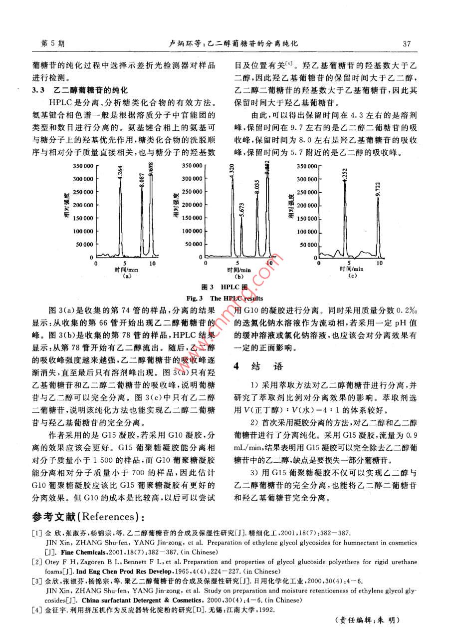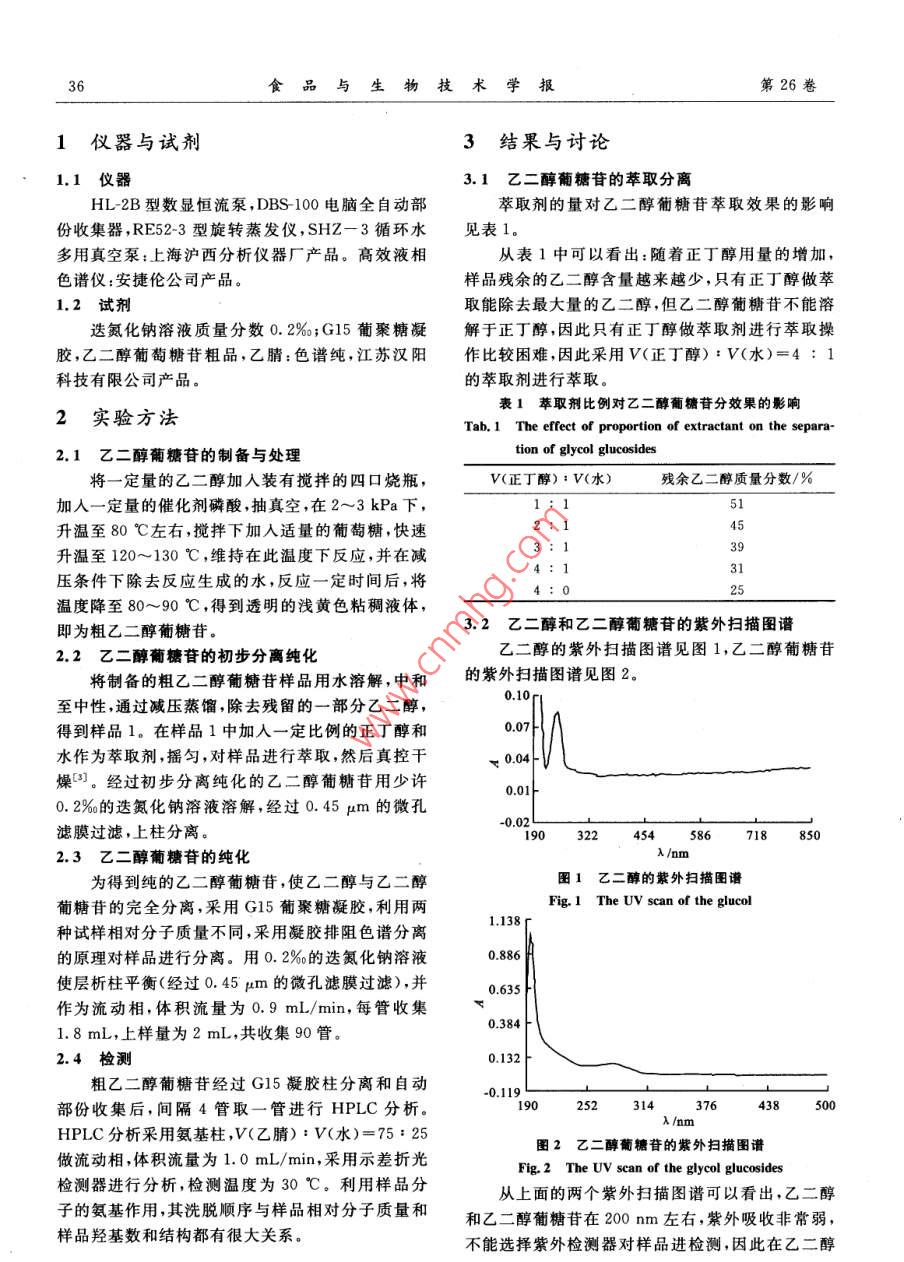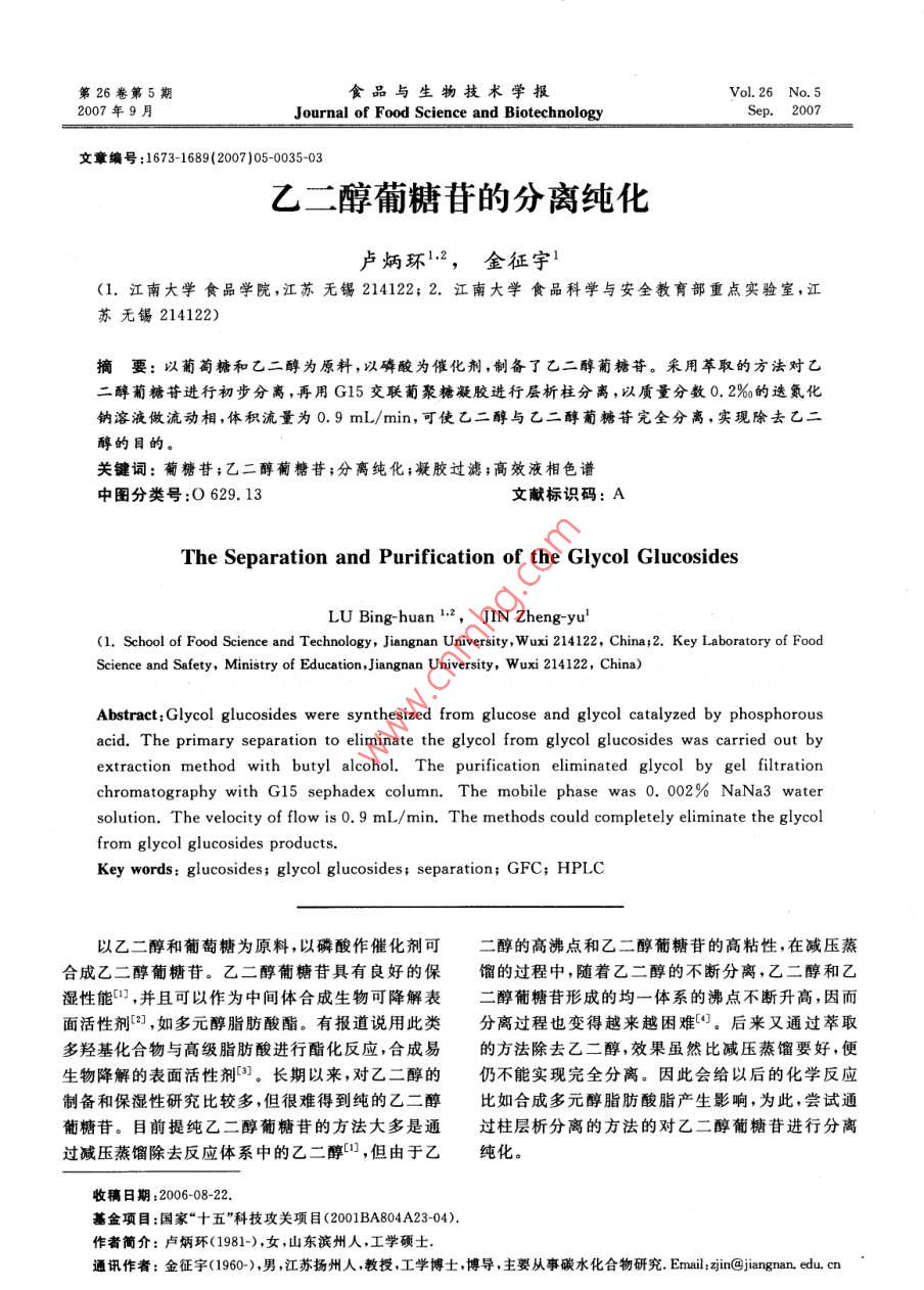 第26卷第5期食品與生物技術(shù)學(xué)報(bào) Vol.26 No.52007年9月 Journal of Food Science and BiotechnologySep.2007文章編號(hào):1673-1689(2007)05-0035-03乙二醇葡糖苷的分離純化盧炳環(huán)12,金征宇(1.江南大學(xué)食品學(xué)院,江蘇無(wú)錫2141222.江南大學(xué)食品科學(xué)與安全教育部重點(diǎn)實(shí)驗(yàn)室,江蘇無(wú)錫214122)摘要:以葡萄糖和乙二醇為原料,以磷酸為催化劑制備了乙二醇葡糖苷。采用萃取的方法對(duì)乙二醇葡糖苷進(jìn)行初步分離,再用G15交聯(lián)葡聚糖凝膠進(jìn)行層析柱分離,以質(zhì)量分?jǐn)?shù)0.2‰的迭氮化鈉溶液做流動(dòng)相,體積流量為0.9mL/min,可使乙二醇與乙二醇葡糖苷完全分離,實(shí)現(xiàn)除去乙二醇的目的。關(guān)鍵詞:葡糖苷;乙二醇葡糖苷;分離純化凝膠過(guò)濾;高效液相色譜中圖分類號(hào):O629.13文獻(xiàn)標(biāo)識(shí)碼:A The Separation and Purification of the Glycol Glucosides LU Bing-huan 12, JIN Zheng-yu' (1. School of Food Science and Technology, Jiangnan University, Wuxi 214122, China; 2. Key Laboratory of Food Science and Safety, Ministry of Education, Jiangnan University Wuxi 214122, China) Abstract: Glycol glucosides were synthesized from glucose and glycol catalyzed by phosphorous acid. The primary separation to eliminate the glycol from glycol glucosides was carried out by extraction method with butyl alcohol. The purification eliminated glycol by gel filtration chromatography with G15 sephadex column The mobile phase was 0. 002% NaNa3 water solution. The velocity of flow is 0. 9 mL/min The methods could completely eliminate the glycol from glycol glucosides products. Key words: glucosides; glycol glucosides; separation; GFC;HPLC以乙二醇和葡萄糖為原料,以磷酸作催化劑可二醇的高沸點(diǎn)和乙二醇葡糖苷的高粘性,在減壓蒸合成乙二醇葡糖苷乙二醇葡糖苷具有良好的保餾的過(guò)程中,隨著乙二醇的不斷分離,乙二醇和乙濕性能,并且可以作為中間體合成生物可降解表二醇葡糖苷形成的均一體系的沸點(diǎn)不斷升高,因而面活性劑2,如多元醇脂肪酸酯。有報(bào)道說(shuō)用此類分離過(guò)程也變得越來(lái)越困難。后來(lái)又通過(guò)萃取多羥基化合物與高級(jí)脂肪酸進(jìn)行酯化反應(yīng),合成易的方法除去乙二醇,效果雖然比減壓蒸餾要好,便生物降解的表面活性劑長(zhǎng)期以來(lái),對(duì)乙二醇的仍不能實(shí)現(xiàn)完全分離。因此會(huì)給以后的化學(xué)反應(yīng)制備和保濕性研究比較多,但很難得到純的乙二醇比如合成多元醇脂肪酸脂產(chǎn)生影響,為此,嘗試通葡糖苷目前提純乙二醇葡糖苷的方法大多是通過(guò)柱層析分離的方法的對(duì)乙二醇葡糖苷進(jìn)行分離過(guò)減壓蒸餾除去反應(yīng)體系中的乙二醇,但由于乙純化。收稿日期:2006-08-22.基金項(xiàng)目:國(guó)家“十五”科技攻關(guān)項(xiàng)目(2001BA804A23-04).作者簡(jiǎn)介:盧炳環(huán)(1981-),女,山東濱州人,工學(xué)碩士通訊作者:金征字(1960-),男,江蘇揚(yáng)州人,教授,工學(xué)博士,導(dǎo),主要從事碳水化合物研究 Email: zjinjiangnan educn36食品與生物技術(shù)學(xué)報(bào)第26卷1儀器與試劑3結(jié)果與討論1.1儀器3.1乙二醇葡糖苷的萃取分離hl-2B型數(shù)顯恒流泵,DBS-100電腦全自動(dòng)部萃取劑的量對(duì)乙二醇葡糖苷萃取效果的影響份收集器,RE52-3型旋轉(zhuǎn)蒸發(fā)儀,SHZ3循環(huán)水見(jiàn)表1多用真空泵:上海滬西分析儀器廠產(chǎn)品。高效液相從表1中可以看出:隨著正丁醇用量的增加,色譜儀:安捷倫公司產(chǎn)品。樣品殘余的乙二醇含量越來(lái)越少,只有正丁醇做萃1.2試劑取能除去最大量的乙二醇,但乙二醇葡糖苷不能溶迭氮化鈉溶液質(zhì)量分?jǐn)?shù)0.2‰;G15葡聚糖凝解于正丁醇,因此只有正丁醇做萃取劑進(jìn)行萃取操膠,乙二醇葡萄糖苷粗品,乙腈:色譜純,江蘇漢陽(yáng)作比較困難,因此采用V(丁醇):V(水)=4:1科技有限公司產(chǎn)品。的萃取劑進(jìn)行萃取。表1萃取劑比例對(duì)乙二醇葡糖苷分效果的影響2實(shí)驗(yàn)方法 Tab. 1 The effect of proportion of extractant on the separa-2.1乙二醇葡糖苷的制備與處理 tion of glycol glucosides將一定量的乙二醇加入裝有攪拌的四口燒瓶,V(正丁醇):V(水)殘余乙二醇質(zhì)量分?jǐn)?shù)/%加入一定量的催化劑磷酸,抽真空,在2~3kPa下,1:151升溫至80℃左右,攪拌下加入適量的葡萄糖,快速2:145升溫至120~130℃,維持在此溫度下反應(yīng),并在減3:1394:131壓條件下除去反應(yīng)生成的水,反應(yīng)一定時(shí)間后,將4:025溫度降至80~90℃,得到透明的淺黃色粘稠液體,即為粗乙二醇葡糖苷。.2乙二醇和乙二醇葡糖苷的紫外掃描圖譜2.2乙二醇葡糖苷的初步分離純化乙二醇的紫外掃描圖譜見(jiàn)圖1,乙二醇葡糖苷備的粗乙二醇葡糖苷樣品用水溶解,中和的紫外掃描圖譜見(jiàn)圖2。至中性,通過(guò)減壓蒸餾,除去殘留的一部分乙二醇,0.10得到樣品1。在樣品1中加入一定比例的正丁醇和0.07水作為萃取劑,搖勻,對(duì)樣品進(jìn)行萃取,然后真控干0.04燥(3。經(jīng)過(guò)初步分離純化的乙二醇葡糖苷用少許0.010.2‰的選氮化鈉溶液溶解,經(jīng)過(guò)0.45m的微孔濾膜過(guò)濾,上柱分離。-0.02L1903224545867188502.3乙二醇葡糖苷的純化/nm為得到純的乙二醇葡糖苷,使乙二醇與乙二醇圖1乙二醇的紫外掃描圖譜葡糖苷的完全分離,采用G15葡聚糖凝膠,利用兩 Fig. The UV scan of the glucol種試樣