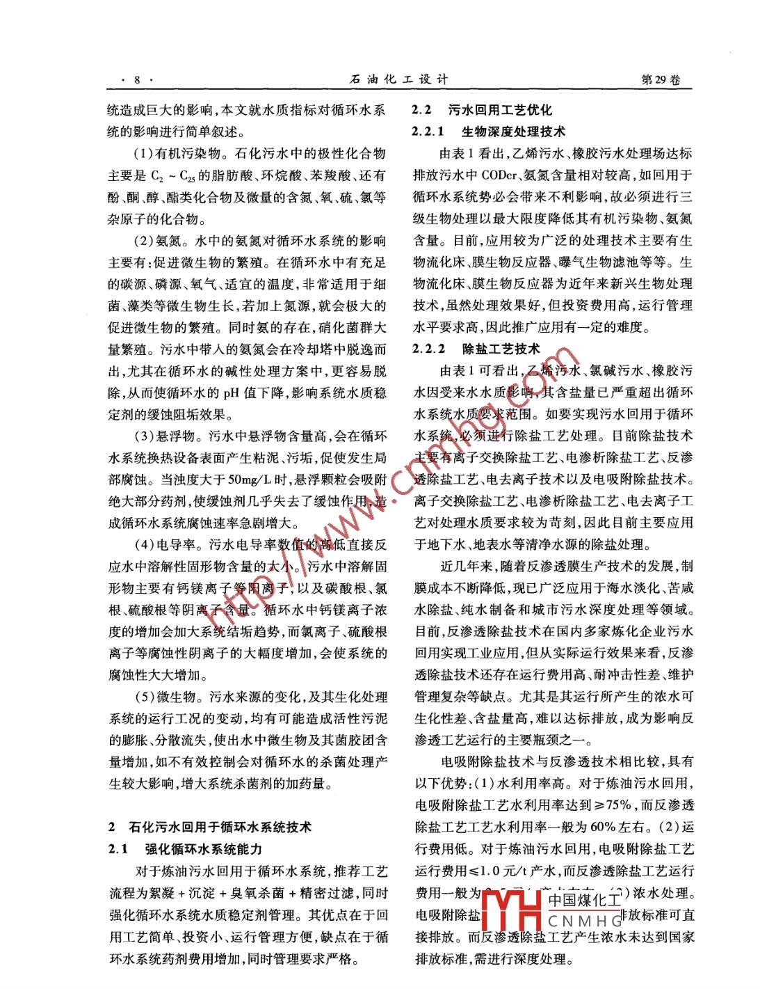 謾計(jì)掖術(shù)石油化工設(shè)計(jì)Petrochemical Design2012,29(1) 7~9石化污水回用于循環(huán)水系統(tǒng)處理技術(shù)探討姜文,萬(wàn)志強(qiáng)(山東齊魯石化工程有限公司,山東淄博255400)摘要:為達(dá)到石化企業(yè)污水回用于循環(huán)水系統(tǒng)的目的,對(duì)石化污水來(lái)源、污水處理工藝、污水達(dá)標(biāo)排放水質(zhì)指標(biāo)循環(huán)水系統(tǒng)運(yùn)行狀況進(jìn)行分析,闡述了工業(yè)污水中污染物對(duì)循環(huán)水系統(tǒng)的影響,推薦石化污水回用于循環(huán)水系統(tǒng)的處理工藝流程為曝氣生物濾池+精密過濾+臭氧氧化+電吸附除鹽,并提出石化.污水回用于循環(huán)水系統(tǒng)的參考水質(zhì)標(biāo)準(zhǔn)。該工藝可確保整套污水回用工程穩(wěn)定運(yùn)行,為企業(yè)實(shí)現(xiàn)節(jié)能減排最終目的提供技術(shù)支持,具有一定的推廣意義。關(guān)鍵詞:石化污水回用水質(zhì)特性 循環(huán)冷卻水隨著我國(guó)水資源的日益短缺,工業(yè)污水回用石化污水主要分為煉油污水和化工污水,而已成為一-種勢(shì)在必行的節(jié)水措施。在石化企業(yè)化工污水又可分為乙烯污水、橡膠污水、氯堿污水中,污水回用的途徑主要可分為工藝用水、循環(huán)水等。由此可見,石化污水水質(zhì)污染物成分十分復(fù)系統(tǒng)補(bǔ)水以及雜用水等等。在工業(yè)用水中循環(huán)冷雜。目前,國(guó)內(nèi)大型石化企業(yè)內(nèi)均自建有污水處卻水的用量約占到企業(yè)總用水量的60% ~ 75%以理系統(tǒng),因石化污水具有較好的可生物降解性能,上" ,用量穩(wěn)定而且水質(zhì)要求相對(duì)不高,工業(yè)污水因此污水處理工藝基本以生物處理技術(shù)為主,并回用的最佳用途是將污水進(jìn)行適當(dāng)?shù)纳疃忍幚砗蟾鶕?jù)所處理污水來(lái)源不同選用不同的單元工藝組作為補(bǔ)充水回用于循環(huán)冷卻水系統(tǒng)。合。表1列出了某大型石化企業(yè)內(nèi)部幾座污水處理場(chǎng)最終排放水質(zhì)與工業(yè)水、循環(huán)水水質(zhì)。1石化企業(yè)排放污水水質(zhì)特點(diǎn)表1某石化企業(yè)達(dá)標(biāo)排放污水、新鮮水循環(huán)水典型水質(zhì)對(duì)比達(dá)標(biāo)排放石化污水序號(hào)項(xiàng)目工業(yè)水循環(huán)水煉油污水乙烯污水橡膠污水H6.5-8.06.5-8.57.0-8.58.0~9.5CODer/(mg.L~ ')40~6050 ~6080-1008.6310~40氨氮(mg.L小)1~100~0.0-1油/(mg.L-1)1.0-18.51.0~4.01.0~5.00-0.30.5-5.0獨(dú)度/NTU10 ~205~204~10未檢出3~10364-10電導(dǎo)率/(μs●cm-+1)1200~ 16505000 ~ 100002700 ~ 4500700 ~ 11002000 ~4000鈣硬(以CaCO3計(jì))60-3005000 ~ 800050~ 100150 -220350 -600堿度(以CaCO,計(jì))200 ~350200 ~40080~160100 ~250250 ~40010氯離子/(mg.L-")200 - 2504000 ~ 6000250 ~35050~ 120300 -700.1| 硫酸根/(mg.L-1)100 -3001000 ~ 30001200 ~ 1600150 ~250200 -500_12異養(yǎng)菌(105個(gè). mL-1)當(dāng)1由表1可以看出,石化企業(yè)幾座污水處理場(chǎng)排放污水均達(dá)到國(guó)家排放標(biāo)準(zhǔn)( GB 8978- -1996)收稿日期:201中國(guó)煤化工一級(jí)指標(biāo),但與企業(yè)工業(yè)新鮮水比較,各項(xiàng)主要水作者簡(jiǎn)介:姜:CNMH G學(xué)水利建質(zhì)指標(biāo)CODer.氨氮、油、懸浮物、電導(dǎo)率等等還是筑工程學(xué)院給水排水專業(yè),學(xué)士學(xué)位,工程師,現(xiàn)從事具有較大的差距,如回用于循環(huán)水系統(tǒng)將會(huì)對(duì)系公用工程設(shè)計(jì)工作。Email:jiangwenqpec@ sina. com石油化工設(shè)計(jì)第29卷統(tǒng)造成巨大的影響,本文就水質(zhì)指標(biāo)對(duì)循環(huán)水系2.2 污水回用工藝優(yōu)化統(tǒng)的影響進(jìn)行簡(jiǎn)單敘述。2.2.1生 物深度處理技術(shù)(1)有機(jī)污染物。石化污水中的極性化合物由表1看出,乙烯污水、橡膠污水處理場(chǎng)達(dá)標(biāo)主要是C2~C2s的脂肪酸、環(huán)烷酸、苯羧酸、還有排放污水中CODer氨氮含量相對(duì)較高,如回用于酚、酮、醇、酯類化合物及微量的含氮、氧、硫、氯等循環(huán)水系統(tǒng)勢(shì)必會(huì)帶來(lái)不利影響,故必須進(jìn)行三雜原子的化合物。級(jí)生物處理以最大限度降低其有機(jī)污染物、氨氮(2)氨氮。水中的氨氮對(duì)循環(huán)水系統(tǒng)的影響含量。目前,應(yīng)用較為廣泛的處理技術(shù)主要有生主要有:促進(jìn)微生物的繁殖。在循環(huán)水中有充足物流化床、膜生物反應(yīng)器、曝氣生物濾池等等。生的碳源、磷源、氧氣、適宜的溫度,非常適用于細(xì)物流化床、膜生物反應(yīng)器為近年來(lái)新興生物處理菌藻類等微生物生長(zhǎng),若加上氮源,就會(huì)極大的技術(shù),雖然處理效果好,但投資費(fèi)用高,運(yùn)行管理促進(jìn)微生物的繁殖。同時(shí)氨的存在,硝化菌群大水平要求高,因此推廣應(yīng)用有一定的難度。量繁殖。污水中帶人的氨氮會(huì)在冷卻塔中脫逸而2.2.2除鹽工藝技術(shù)出,尤其在循環(huán)水的堿性處理方案中,更容易脫由表1可看出,乙烯污水、氯堿污水、橡膠污除,從而使循環(huán)水的pH值下降,影響系統(tǒng)水質(zhì)穩(wěn)水因受來(lái)水水質(zhì)影響,其含鹽量已嚴(yán)重超出循環(huán)定劑的緩蝕阻垢效果。水系統(tǒng)水質(zhì)要求范圍。如要實(shí)現(xiàn)污水回用于循環(huán)(3)懸浮物。污水中懸浮物含量高,會(huì)在循環(huán)水系統(tǒng),必須