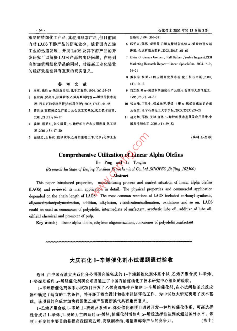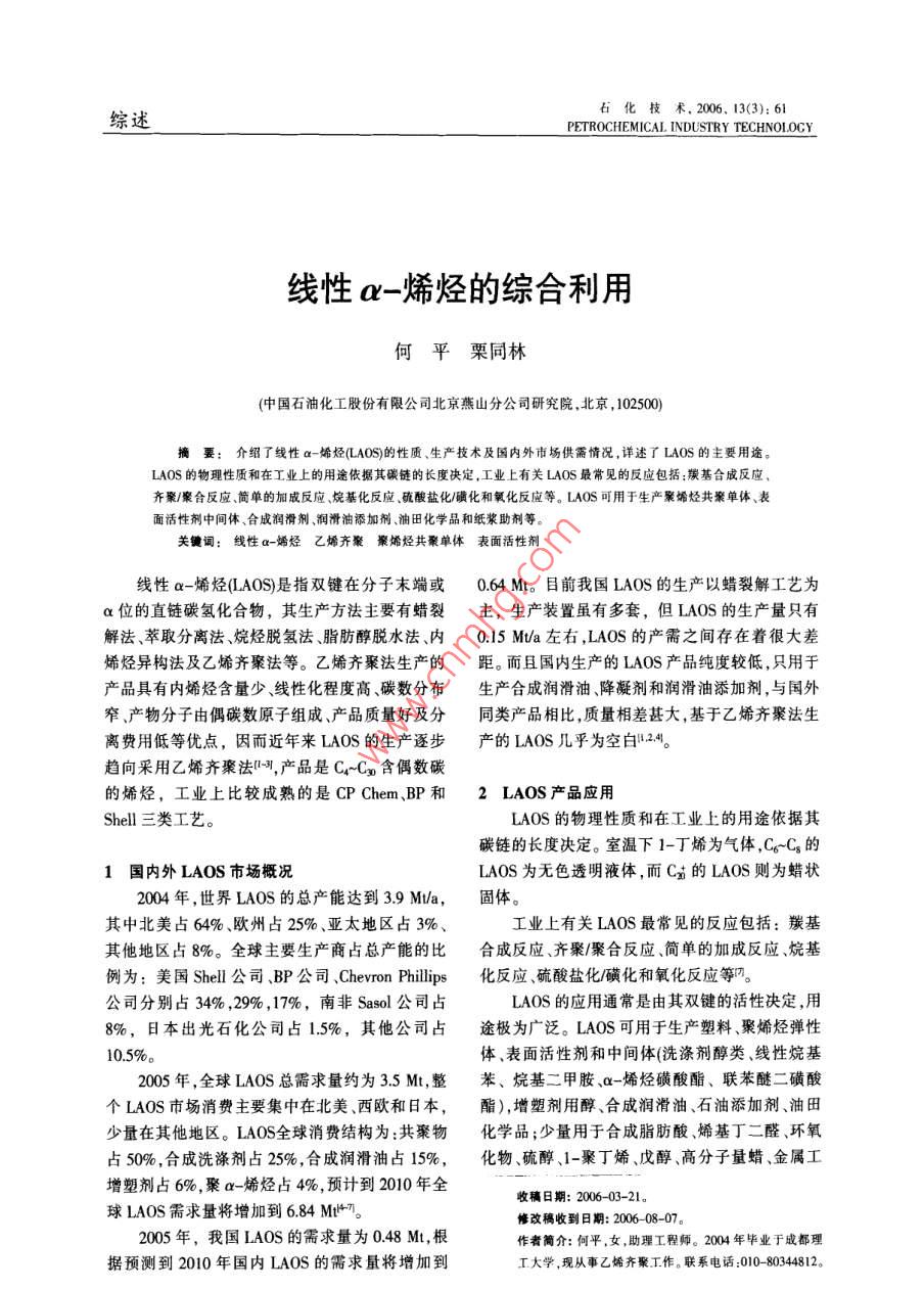 石化技術,2006.13(3); 61綜述PETROCHEMICAL INDUSTRY TECHNOLOCY線性c-烯烴的綜合利用何平栗同林(中國石油化工股份有限公司北京燕山分公司研究院,北京,102500)摘要:介紹了線性a-烯烴(LAOS)的性質、生產(chǎn)技術及國內(nèi)外市場供需情況,詳述了LAOS的主要用途。LAOS的物理性質和在工.業(yè)上的用途依據(jù)其碳鏈的長度決定.工業(yè)上有關LAOS最常見的反應包括:羰基合成反應、齊聚/聚合反應、簡單的加成反應、烷基化反應硫酸鹽化/磺化和氧化反應等。LAOS可用于生產(chǎn)聚烯烴共聚單體、表面活性劑中間體、合成潤滑劑、潤滑油舔加劑、油田化學品和紙漿助劑等。關鍵詞:線性a-烯烴 乙烯齊聚 聚烯烴共聚單體 表面活性劑線性a-烯烴([LAOS)是指雙鍵在分子末端或0.64 Mt。目前我國LAOS的生產(chǎn)以蠟裂解工藝為a位的直鏈碳氫化合物,其生產(chǎn)方法主要有蠟裂主,生產(chǎn)裝置雖有多套,但LAOS的生產(chǎn)量只有解法、萃取分離法、烷烴脫氫法、脂肪醇脫水法、內(nèi)0.15 Mt/a 左右,LAOS的產(chǎn)需之間存在著很大差烯烴異構法及乙烯齊聚法等。乙烯齊聚法生產(chǎn)的距。而且國內(nèi)生產(chǎn)的LAOS產(chǎn)品純度較低,只用于產(chǎn)品具有內(nèi)烯烴含量少線性化程度高、碳數(shù)分布生產(chǎn)合成潤滑油、降凝劑和潤滑油添加劑,與國外窄、產(chǎn)物分子由偶碳數(shù)原子組成、產(chǎn)品質量好及分同類產(chǎn)品相比,質量相差甚大,基于乙烯齊聚法生離費用低等優(yōu)點,因而近年來LAOS的生產(chǎn)逐步產(chǎn)的LAOS幾乎為空白12月。趨向采用乙烯齊聚法-9,產(chǎn)品是CrCx含偶數(shù)碳的烯烴,工業(yè)上比較成熟的是CPChem、BP和2LAOS產(chǎn)品應用Shell三類工藝。LAOS的物理性質和在工業(yè)上的用途依據(jù)其碳鏈的長度決定。室溫下1-丁烯為氣體,C6~Cg的1國內(nèi)外LAOS市場概況LAOS為無色透明液體,而Cp的LAOS則為蠟狀2004年,世界LAOS的總產(chǎn)能達到3.9 MVa,固體。其中北美占64%.歐州占25%、亞太地區(qū)占3%、工業(yè)上有關LAOS最常見的反應包括:羰基其他地區(qū)占8%。全球主要生產(chǎn)商占總產(chǎn)能的比合成反應、齊聚/聚合反應、簡單的加成反應、烷基例為:美國Shell公司、BP公司.Chevron Phillips化反應、硫酸鹽化/磺化和氧化反應等。公司分別占34% ,29%,17%,南非Sasol公司占LAOS的應用通常是由其雙鍵的活性決定,用8%,日本出光石化公司占1.5%, 其他公司占途極為廣泛。LAOS 可用于生產(chǎn)塑料、聚烯烴彈性10.5%。體、表面活性劑和中間體(洗滌劑醇類、線性烷基2005年,全球LAOS總需求量約為3.5 Mt,整苯、烷基二甲胺、a-烯烴磺酸酯、聯(lián)苯醚二磺酸個LAOS市場消費主要集中在北美、西歐和日本,酯),增塑劑用醇、合成潤滑油、石油添加劑、油田少量在其他地區(qū)。LAOS全球消費結構為:共聚物化學品;少量用于合成脂肪酸、烯基丁二醛、環(huán)氧占50% ,合成洗滌劑占25%,合成潤滑油占15%,化物硫醇、1-聚丁烯、戊醇高分子量蠟.金屬工增塑劑占6%,聚a- ~烯烴占4%,預計到2010年全收稿日期: 2006- 03-21。球LAOS需求量將增加到6.84Mt47。修改稿收到日期: 2006 08-07。2005年,我國LAOS的需求量為0.48 M,根作者簡介:何平,女,助理工程師。2004 年畢業(yè)于成都理據(jù)預測到2010年國內(nèi)LAOS的需求量將增加到I大學,現(xiàn)從事乙烯齊聚工作。聯(lián)系電話:010- 80344812?!?2.石化技術2006年第13卷第3期作液及其他產(chǎn)品B.%。酸鹽,這些產(chǎn)品作為表面活性劑是合成洗滌劑的2.1聚烯烴主要原料。其中,以烷基苯磺酸鹽、醇醚硫酸鹽、醇1-丁烯、1-己烯.1-辛烯作為共聚單體用于生硫酸鹽為主的陰離子表面活性劑約占表面活性劑產(chǎn)高密度聚乙烯(HDPE)以及線型低密度聚乙烯總量的55%以上,以脂肪醇醚、烷基糖苷為主的非([LDPE)產(chǎn)品。生產(chǎn)HDPE和LLDPE所用的LAOS離子表面活性劑約占總量的35%,其他表面活性占其總消費量50%以上。劑約占10%。在聚烯烴生產(chǎn)中使用共聚單體是為了控制聚2.2.3線性硫醇烯烴產(chǎn)品的密度和加強其物理性能,提高抗撕裂C_-C口LAOS用于生產(chǎn)線性硫醇,線性硫醇廣性和拉伸強度,而只有雜質含量低的高LAOS才泛用于 合成化學半成品、防水劑、橡膠添加劑、農(nóng)能用作聚烯烴產(chǎn)品的共聚單體。一般認為,長鏈單用化學品和聚合物改性劑等.I。體共聚的LLDPE比短鏈單體共聚的聚烯烴具有正丁基硫醇是生產(chǎn)除草劑的重要原料;正已更高的整體韌性和強度,長鏈單體- -般是指1-己基硫醇用作農(nóng)用品中間體;正辛基硫醇在紡織業(yè)烯與1-辛烯,用1-辛烯共聚的LLDPE韌性最好。上用作織物印花助劑,在增塑劑、涂層、農(nóng)藥、專用2.2醇紙張和藥物生產(chǎn)中用作聚合物改性劑;正癸基硫工業(yè)上將生產(chǎn)線性醇所使用的LAOS劃分為醇作為某些產(chǎn)品的專用添加劑,用量較小;正十二兩個范圍:C5-C LAOS和Cmo~Cr6 LAOS。由C~-C1o硫醇主要作為聚合物的聚合調節(jié)劑用于塑料和橡LAOS合成的Cr~Cn線性醇用于增塑劑產(chǎn)品;由膠制 品,也可作為礦石浮選劑(主要是銅礦)用于C1o-C16LAOS合成的Cir~Cn線性醇作為表面活性采礦行業(yè)。劑用于生產(chǎn)洗滌產(chǎn)品。潤滑油中添加的作為黏度2.3 聚c-烯烴(PAO)指數(shù)增加劑的異丁烯酸酯(由Cg~Cis線性醇衍Co LAOS (或少量Cq和Cp LAOS混合物)在生)則由介于兩種LAOS之間的LAOS衍生而來。催化劑作用下發(f