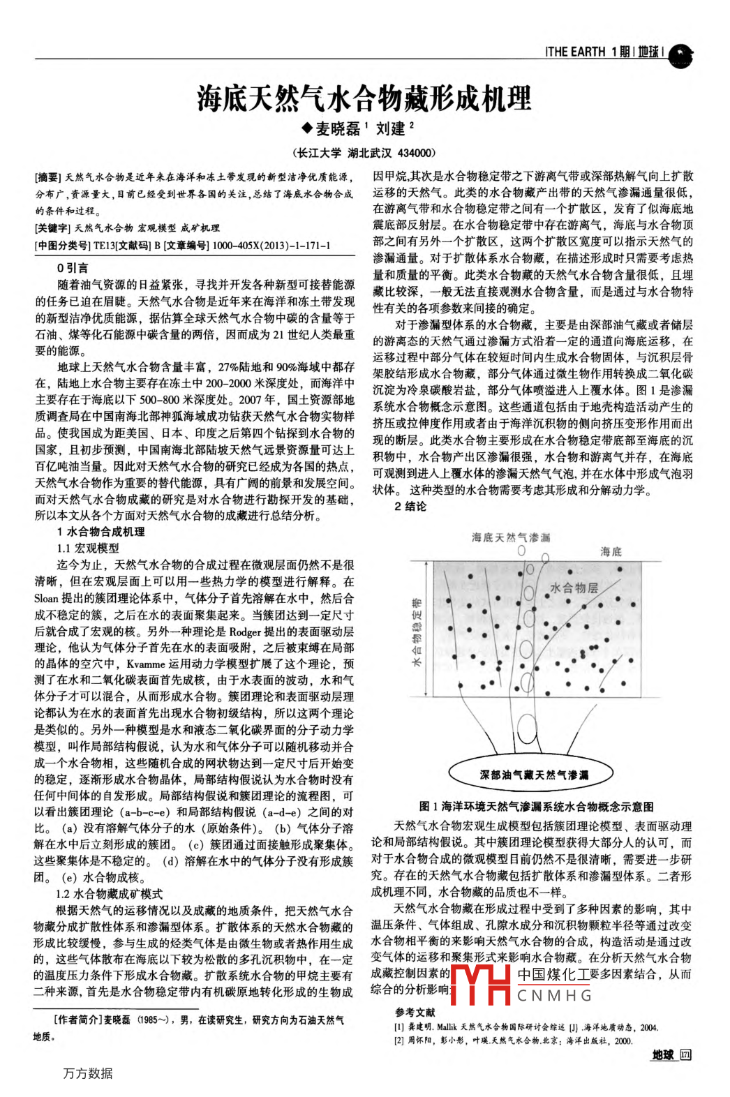 ITHE EARTH1地海底天然氣水合物藏形成機(jī)理◆麥曉磊1劉建2(長(zhǎng)江大學(xué)湖北武漢434000[摘要]天然氣水合物是近年來(lái)在海洋和凍土帶發(fā)現(xiàn)的新型潔凈優(yōu)質(zhì)能源,因甲烷其次是水合物穩(wěn)定帶之下游離氣帶或深部熱解氣向上擴(kuò)散分布廣,資源量大,目前已經(jīng)受到世界各國(guó)的關(guān)注,總結(jié)了海底水合物合成運(yùn)移的天然氣。此類的水合物藏產(chǎn)出帶的天然氣滲漏通量很低的條件和過(guò)程在游離氣帶和水合物穩(wěn)定帶之間有一個(gè)擴(kuò)散區(qū),發(fā)育了似海底地[關(guān)鍵字]天然氣水合物宏觀模型威礦機(jī)理震底部反射層。在水合物穩(wěn)定帶中存在游離氣,海底與水合物頂中圖分類號(hào)]TEl3文獻(xiàn)碼]B[文章編號(hào)]1000-405X(2013)-1-171-1部之間有另外一個(gè)擴(kuò)散區(qū),這兩個(gè)擴(kuò)散區(qū)寬度可以指示天然氣的滲漏通量。對(duì)于擴(kuò)散體系水合物藏,在描述形成時(shí)只需要考慮熱0引言隨著油氣資源的日益緊張,尋找并開發(fā)各種新型可接替能源量和質(zhì)量的平衡。此類水合物藏的天然氣水合物含量很低,且埋的任務(wù)已迫在眉睫。天然氣水合物是近年來(lái)在海洋和凍土帶發(fā)藏比較深,一般無(wú)法直接觀測(cè)水合物含量,而是通過(guò)與水合物特的新型潔凈優(yōu)質(zhì)能源,據(jù)估算全球天然氣水合物中碳的含量等于性有關(guān)的各項(xiàng)參數(shù)來(lái)間接的確定。對(duì)于滲漏型體系的水合物藏,主要是由深部油氣藏或者儲(chǔ)層石油、煤等化石能源中碳含量的兩倍,因而成為21世紀(jì)人類最重要的能源。的游離態(tài)的天然氣通過(guò)滲漏方式沿著一定的通道向海底運(yùn)移,在運(yùn)移過(guò)程中部分氣體在較短時(shí)間內(nèi)生成水合物固體,與沉積層骨地球上天然氣水合物含量豐富,27%陸地和90%海域中都存架膠結(jié)形成水合物藏,部分氣體通過(guò)微生物作用轉(zhuǎn)換成二氧化碳在,陸地上水合物主要存在凍土中200-2000米深度處,而海洋中沉淀為冷泉碳酸巖鹽,部分氣體噴溢進(jìn)入上覆水體。圖1是滲漏主要存在于海底以下500-800米深度處。2007年,國(guó)土資源部地質(zhì)調(diào)查局在中國(guó)南海北部神狐海域成功鉆獲天然氣水合物實(shí)物樣系統(tǒng)水合物概念示意圖。這些通道包括由于地殼構(gòu)造活動(dòng)產(chǎn)生的擠壓或拉伸度作用或者由于海洋沉積物的側(cè)向擠壓變形作用而出品。使我國(guó)成為距美國(guó)、日本、印度之后第四個(gè)鉆探到水合物的現(xiàn)的斷層。此類水合物主要形成在水合物穩(wěn)定帶底部至海底的沉國(guó)家,且初步預(yù)測(cè),中國(guó)南海北部陸坡天然氣遠(yuǎn)景資源量可達(dá)上積物中,水合物產(chǎn)出區(qū)滲漏很強(qiáng),水合物和游離氣并存,在海底百億噸油當(dāng)量。因此對(duì)天然氣水合物的研究已經(jīng)成為各國(guó)的熱點(diǎn)天然氣水合物作為重要的替代能源,具有廣闊的前景和發(fā)展空間可觀測(cè)到進(jìn)入上覆水體的滲漏天然氣氣泡,并在水體中形成氣泡羽而對(duì)天然氣水合物成藏的研究是對(duì)水合物進(jìn)行勘探開發(fā)的基礎(chǔ)狀體。這種類型的水合物需要考慮其形成和分解動(dòng)力學(xué)。2結(jié)論所以本文從各個(gè)方面對(duì)天然氣水合物的成藏進(jìn)行總結(jié)分析。1水合物合成機(jī)理海底天然氣滲漏1.1宏觀模型海底迄今為止,天然氣水合物的合成過(guò)程在微觀層面仍然不是很清晰,但在宏觀層面上可以用一些熱力學(xué)的模型進(jìn)行解釋。在··水合物層Sloan提出的簇團(tuán)理論體系中,氣體分子首先溶解在水中,然后合成不穩(wěn)定的簇,之后在水的表面聚集起來(lái)。當(dāng)簇團(tuán)達(dá)到一定尺寸后就合成了宏觀的核。另外一種理論是 Rodger提出的表面驅(qū)動(dòng)層理論,他認(rèn)為氣體分子首先在水的表面吸附,之后被束縛在局部似如關(guān)的晶體的空穴中, Kvamme運(yùn)用動(dòng)力學(xué)模型擴(kuò)展了這個(gè)理論,預(yù)測(cè)了在水和二氧化碳表面首先成核,由于水表面的波動(dòng),水和氣體分子才可以混合,從而形成水合物。簇團(tuán)理論和表面驅(qū)動(dòng)層理論都認(rèn)為在水的表面首先出現(xiàn)水合物初級(jí)結(jié)構(gòu),所以這兩個(gè)理論是類似的。另外一種模型是水和液態(tài)二氧化碳界面的分子動(dòng)力學(xué)模型,叫作局部結(jié)構(gòu)假說(shuō),認(rèn)為水和氣體分子可以隨機(jī)移動(dòng)并合成一個(gè)水合物相,這些隨機(jī)合成的網(wǎng)狀物達(dá)到一定尺寸后開始變的穩(wěn)定,逐漸形成水合物晶體,局部結(jié)構(gòu)假說(shuō)認(rèn)為水合物時(shí)沒有深部油氣藏天然氣滲漏任何中間體的自發(fā)形成。局部結(jié)構(gòu)假說(shuō)和簇團(tuán)理論的流程圖,可以看出簇團(tuán)理論(a-b-c-e)和局部結(jié)構(gòu)假說(shuō)(a-d-e)之間的對(duì)圖1海洋環(huán)境天然氣滲漏系統(tǒng)水合物概念示意圖比。(a)沒有溶解氣體分子的水(原始條件)。(b)氣體分子溶天然氣水合物宏觀生成模型包括簇團(tuán)理論模型、表面驅(qū)動(dòng)理解在水中后立刻形成的簇團(tuán)。(c)簇團(tuán)通過(guò)面接觸形成聚集體。論和局部結(jié)構(gòu)假說(shuō)。其中簇團(tuán)理論