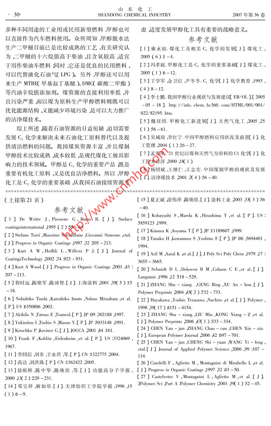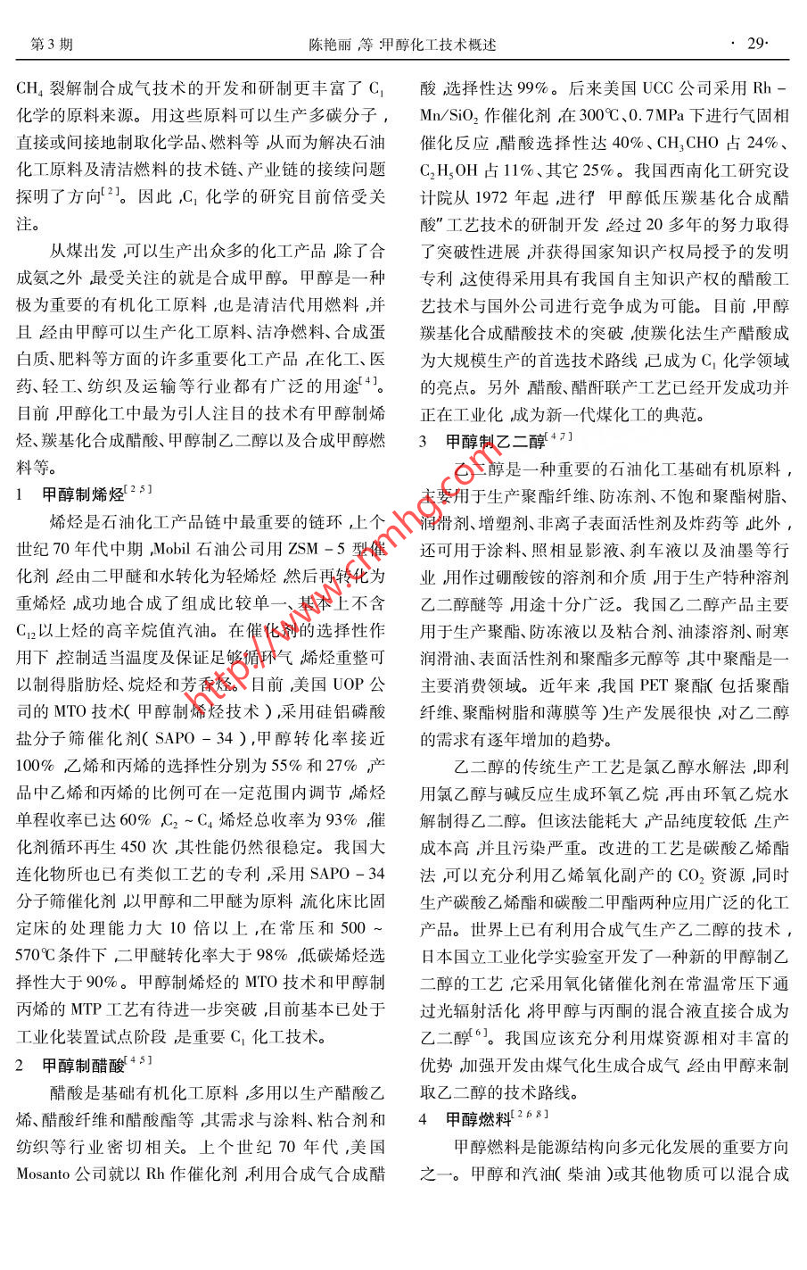 山東化工SHANDONG CHEMICAL INDUSTRY2007年第36卷甲醇化工技術(shù)概述陳艷麗',陳慧勇2( 1.菏澤學(xué)院化學(xué)化工系山東菏澤274015 2.山東東明石化集團(tuán)規(guī)劃發(fā)展部山東東明274500 )摘要隨著石油資源的日益短缺C,化學(xué)為解決石油化工原料及清潔燃料的技術(shù)鏈、產(chǎn)業(yè)鏈的接續(xù)問(wèn)題探明了方向。甲醇是重要的有機(jī)化工原料其深加工產(chǎn)品涉及到烯烴(乙烯、丙烯)有機(jī)酸甲酸、醋酸)甲醛、二甲醚等多種有機(jī)化合物,而且甲醇還是優(yōu)良的潔凈燃料。煤制甲醇是現(xiàn)代煤化工極具影響的技術(shù)領(lǐng)域應(yīng)該充分利用我國(guó)相對(duì)比較豐富的煤炭資源大力發(fā)展甲醇化工。關(guān)鍵詞C化學(xué)石油煤甲醇化工潔凈燃料中圖分類號(hào):TQ517 ;TQ223. 121文獻(xiàn)標(biāo)識(shí)碼A文章編號(hào):1008 -021X( 2007 )03 -0028 -03Summarize of Methanol Chemical TechnologyCHEN Yan-li' CHEN Hui - yong2( 1. Department of Chemistry and Chemical Engineering ,Heze University ,Heze 274015 ,China ;2. Planing Department , Shandong Dongming Petrochem Group ,Dongming 274500 .China )Abstract :With the shortening of petroleum resource ,it is urgent to develop C, chemistry for substitutingthe feedback of petroleum chemical and supplying clean fuel both in the chains of technology andindustry. Methanol is an important organic chemical material and its derived products include variousorganic compounds , such as alkene( ethylene ,propylene ) ,organic acids( formyl acid ,acetic acid ) ,formaldehyde dimethyl ether ,etc. ,and that methanol is also a fine clean fuel. The coal basis methanoltechnology is an influential field in mordern coal chemical engineering ,so we should sufficiently useabundant coal resources to develop methanol chemical engineering strongly.Key words :C chemistry petroleum icoal ;methanol chemical industry clean fuel一個(gè)世紀(jì)以來(lái),以石油為基礎(chǔ)的石油化工及其化后通過(guò)F -I( Fischer - Tropsch )合成和甲醇轉(zhuǎn)化制成品--直是促進(jìn)現(xiàn)代文明發(fā)展的重要物質(zhì)基礎(chǔ)之直接或間接制取化學(xué)品的C,化學(xué)技術(shù)12。一然而地球上的石油資源是有限的并且僅有很C化學(xué)習(xí)是指含一個(gè)碳原子的化合物以及含少量的碳以煤、石油、天然氣存在。隨著石油資源的-個(gè)碳原子物種的金屬有機(jī)單核、多核化合物和表不斷消耗20世紀(jì)70年代以來(lái)世界上已經(jīng)先后出面金屬有機(jī)化合物的化學(xué)工業(yè)上一.般是指由含有現(xiàn)了三次石油危機(jī)石油價(jià)格的持續(xù)上漲,已經(jīng)嚴(yán)重-一個(gè)碳原子的化合物出發(fā)合成各種化學(xué)品的技術(shù)。影響到能源工業(yè)石油化學(xué)工業(yè)等基礎(chǔ)工業(yè)的發(fā)展,早在上個(gè)世紀(jì)20年代德國(guó)就利用F-T合成法把成為制約世界經(jīng)濟(jì)發(fā)展的關(guān)鍵因素。人類開始從能合成氣C0/H2用于生產(chǎn)燃料油美、日、德等國(guó)把F源多元化和可持續(xù)發(fā)展的角度來(lái)思考能源替代及石-T合成研究拓展到CO2、CH4、HCN等C;原料。油化工原料的接續(xù)問(wèn)題,以煤和天然氣為主要能源而作為一個(gè)新的研究領(lǐng)域,日本首先提出了C化學(xué)和化工原料的技術(shù)開發(fā)和研究將為能源替代和化工這一概念。C化學(xué)的內(nèi)容非常豐富主要研究的是原料的接續(xù)問(wèn)題開辟--個(gè)新的領(lǐng)域。世界發(fā)達(dá)國(guó)家合成氣包括制造CO、H2或C0/H2混合氣的技術(shù)已開始轉(zhuǎn)向天然氣替代石油而我國(guó)是一- 個(gè)缺油、少和用CO、H2制造化學(xué)品、燃料的技術(shù)。C; 化學(xué)的氣煤炭資源豐富的國(guó)家所以我們應(yīng)大力發(fā)展煤化原料主要是C0/H2、CH4、CHJOH、HCHO、HC00H、工包括焦油化工、精細(xì)化工,以及以煤為原料煤氣HCN、CO2以及碳酸鹽等,而煤炭氣化制合成氣,收稿日期2006 -09-30作者簡(jiǎn)介煉艷麗( 1973- )女山東菏澤人研究生在讀講師主要從事化學(xué)化工教學(xué)及科研工作。第3期陳艷麗等甲醇化工技術(shù)概述CH4裂解制合成氣技術(shù)的開發(fā)和研制更豐富了C酸選擇性達(dá)99%。后來(lái)美國(guó)UCC公司采用Rh -化學(xué)的原料來(lái)源。用這些原料可以生產(chǎn)多碳分子,Mn/SiO2作催化劑在300C、0.7MPa下進(jìn)行氣固相直接或間接地制取化學(xué)品、燃料等從而為解決石油催化反應(yīng),醋酸選擇性達(dá)40%、CHzCHO占24%、化工原料及清潔燃料的技術(shù)鏈、產(chǎn)業(yè)鏈的接續(xù)問(wèn)題C2H,OH占11%、其它25%。我國(guó)西南化工研究設(shè)探明了方向(21。因此,C化學(xué)的研究目前倍受關(guān)計(jì)院從1972年起,進(jìn)行甲醇低壓羰基化合成醋注。酸”工藝技術(shù)的研制開發(fā)經(jīng)過(guò)20多年的努力取得從煤出發(fā)可以生產(chǎn)出眾多的化工產(chǎn)品除了合了突破性進(jìn)展并獲得國(guó)家知識(shí)產(chǎn)權(quán)局授予的發(fā)明成氨之外最受關(guān)注的就是合成甲醇。甲醇是一種專利這使得采用具有我國(guó)自主知識(shí)產(chǎn)權(quán)的醋酸工極為重要的有機(jī)化工原料,也是清潔代用燃料并藝技術(shù)與國(guó)外公司進(jìn)行競(jìng)爭(zhēng)成為可能。目前,甲醇且經(jīng)由甲醇可以生產(chǎn)化工原料、潔凈燃料、合成蛋羰基化合成醋酸技術(shù)的突破使羰化法生產(chǎn)醋酸成白質(zh