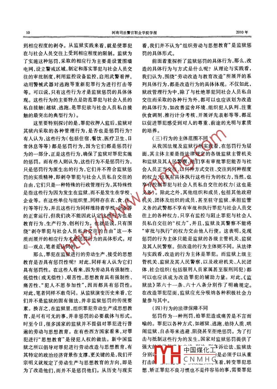 第8卷第3期河南司法警官職業(yè)學(xué)院學(xué)報(bào)2010年9月Vol 8 Na. 3Journal of Henan Judicial Police Vocational CollegeSeptember, 2010懲罰與改造的關(guān)系新探張國(guó)敏,趙靜(1.湖北江北監(jiān)獄,湖北荊州43410;2,北京大成律師事務(wù)所鄭州分所,河南鄭州45000◆◆。*…令·令摘要:“懲罰”與“改造”是我國(guó)監(jiān)獄語(yǔ)境中使用頻率最多的詞語(yǔ)。二者既有區(qū)別又有聯(lián)系。其區(qū)別表現(xiàn)在行為的直接動(dòng)機(jī)、行為的具體方式、行為的主體范圍、行為的法律保障、行為的結(jié)果要求等方面均不同。但是,二者在最終目標(biāo)上具有同向性,時(shí)空條件上具有一致性,功能發(fā)揮上具有互補(bǔ)性,資源利用上具有同一性等。通過(guò)對(duì)這一問題的研究,對(duì)我國(guó)監(jiān)獄職能體系及其結(jié)構(gòu)做出一個(gè)科學(xué)的定位,正確理解與科學(xué)把握懲罰與改造這一獨(dú)立的監(jiān)獄職能。關(guān)鍵詞:懲罰;改造;報(bào)應(yīng);矯正中圖分類號(hào):DF87文獻(xiàn)標(biāo)識(shí)碼:A文章編號(hào):1672-2663(2010)03-0009-04◆*嶺********令心眾所周知,“懲罰”與“改造”是我國(guó)監(jiān)獄語(yǔ)境中造的要義所在。使用頻率最多的詞語(yǔ),“懲罰”與“改造”也是我國(guó)監(jiān)從理論與實(shí)踐看,懲罰與改造這兩種行為有著獄的兩大職能。按理說(shuō),我們對(duì)二者的內(nèi)涵及其相以下不同點(diǎn):互關(guān)系應(yīng)有科學(xué)的定位和準(zhǔn)確的認(rèn)知,但從現(xiàn)有的(一)行為的直接動(dòng)機(jī)不同監(jiān)獄理論研究文章及現(xiàn)實(shí)實(shí)踐看,仍有不少同志對(duì)在這里,懲罰作為監(jiān)獄對(duì)罪犯所執(zhí)行的特殊刑其認(rèn)識(shí)是模糊的,甚至是偏頗的。因此,加強(qiáng)二者的罰,顯然具有刑罰的特質(zhì)。我們知道,刑罰是統(tǒng)治階內(nèi)涵及其相互關(guān)系的研究十分必要。級(jí)打擊犯罪懲治犯罪的最為嚴(yán)厲的一種強(qiáng)制手段,、懲罰與改造的區(qū)別點(diǎn)其效應(yīng)是通過(guò)對(duì)罪犯施加打擊與懲治而體現(xiàn)出來(lái)懲罰,在監(jiān)獄語(yǔ)境中,是監(jiān)獄執(zhí)行刑罰的代名詞,的。這表明,監(jiān)獄懲罰的直接動(dòng)機(jī)在于打擊與懲治其特定內(nèi)涵為:監(jiān)獄代表國(guó)家對(duì)罪犯的人身自由實(shí)施而不是其他,這就是我們常說(shuō)的“報(bào)應(yīng)”。它給罪犯相應(yīng)程度的限制使罪犯與社會(huì)環(huán)境相對(duì)隔離開來(lái),的直觀感受就是“失去了利益,遭受了痛苦”。而改其主要標(biāo)志是“圍墻電網(wǎng)”。使罪犯在相應(yīng)程度上喪造則不同,它緊扣思想決定行為的規(guī)律,刻意在罪犯失人身自由,是監(jiān)獄懲罰的核心要義。在這里,懲罰受刑的同時(shí),努力在改變罪犯的錯(cuò)誤思想上有所作與監(jiān)獄對(duì)服刑人員在獄內(nèi)違紀(jì)所施加的批評(píng)扣分,為使罪犯真正有所轉(zhuǎn)變。其直接動(dòng)機(jī)是使罪犯甚至禁閉的“處罰”有本質(zhì)的區(qū)別。換言之,處罰不“消除錯(cuò)誤的思想,形成正確的觀點(diǎn),提升科學(xué)的認(rèn)在懲罰之列,懲罰具有特指性與確定性限制罪犯與知”避免罪犯一錯(cuò)再錯(cuò),失去更大的利益與機(jī)會(huì)。社會(huì)人員(主要指監(jiān)獄內(nèi)的民警與服刑人員以外的社改造與懲罰不同,它并沒有從動(dòng)機(jī)到行為,使罪犯在會(huì)人員)交往才是懲罰的應(yīng)有內(nèi)涵。物質(zhì)利益和人身自由上受到損失,遭遇不幸,相反,在我國(guó)監(jiān)獄語(yǔ)境中,改造則主要強(qiáng)調(diào)消除罪犯它顯然出于一種善意,出于拯救與重塑。從這個(gè)角的犯罪思想扭轉(zhuǎn)罪犯的不良行為習(xí)慣使其樹立符度講改造還是一種撫慰的手段。運(yùn)用好改造手段,合社會(huì)進(jìn)步要求的觀念,養(yǎng)成良好的為人處世態(tài)度還可以有效安撫罪犯因遭受國(guó)家刑罰打擊而導(dǎo)致的與習(xí)慣。從我國(guó)監(jiān)獄改造理論來(lái)看,強(qiáng)調(diào)“改造人”心靈創(chuàng)傷主要是改造人的錯(cuò)誤世界觀,應(yīng)該是理論界的主流(二)行為的具體方式不同觀點(diǎn)。由此可見,努力實(shí)現(xiàn)罪犯世界觀的轉(zhuǎn)變,是改監(jiān)獄懲罰的核心要義在于使罪犯的人身自由受M凵中國(guó)煤化工收稿日期:2010-06-03CNMHG作者簡(jiǎn)介:1.張國(guó)敏(1966-),男,湖北監(jiān)利人,中國(guó)監(jiān)獄學(xué)會(huì)會(huì)員了,北監(jiān)獄學(xué)分會(huì)秘書長(zhǎng),主要從事監(jiān)獄學(xué)基礎(chǔ)理論研究;2趙靜(1968-),女,河南鄭州人,北京大成律師事務(wù)所鄭州分所律師河南司法警官職業(yè)學(xué)院學(xué)報(bào)2010年到相應(yīng)程度的剝奪。從監(jiān)獄實(shí)踐來(lái)看,就是使罪犯看,我們并不認(rèn)為“組織勞動(dòng)與思想教育”是監(jiān)獄懲在與社會(huì)人員交往上受到相應(yīng)程度的限制。監(jiān)獄為罰的具體形式。了實(shí)施這種懲罰,采取的相應(yīng)行為主要是設(shè)置圍墻前面著重探析了監(jiān)獄懲罰的具體行為,那么,改電網(wǎng),設(shè)立警戒區(qū)域制定和落實(shí)罪犯與社會(huì)人員交造的具體行為與方式是什么呢?從理論與實(shí)踐看,往的審批制度,利用監(jiān)控設(shè)備監(ji