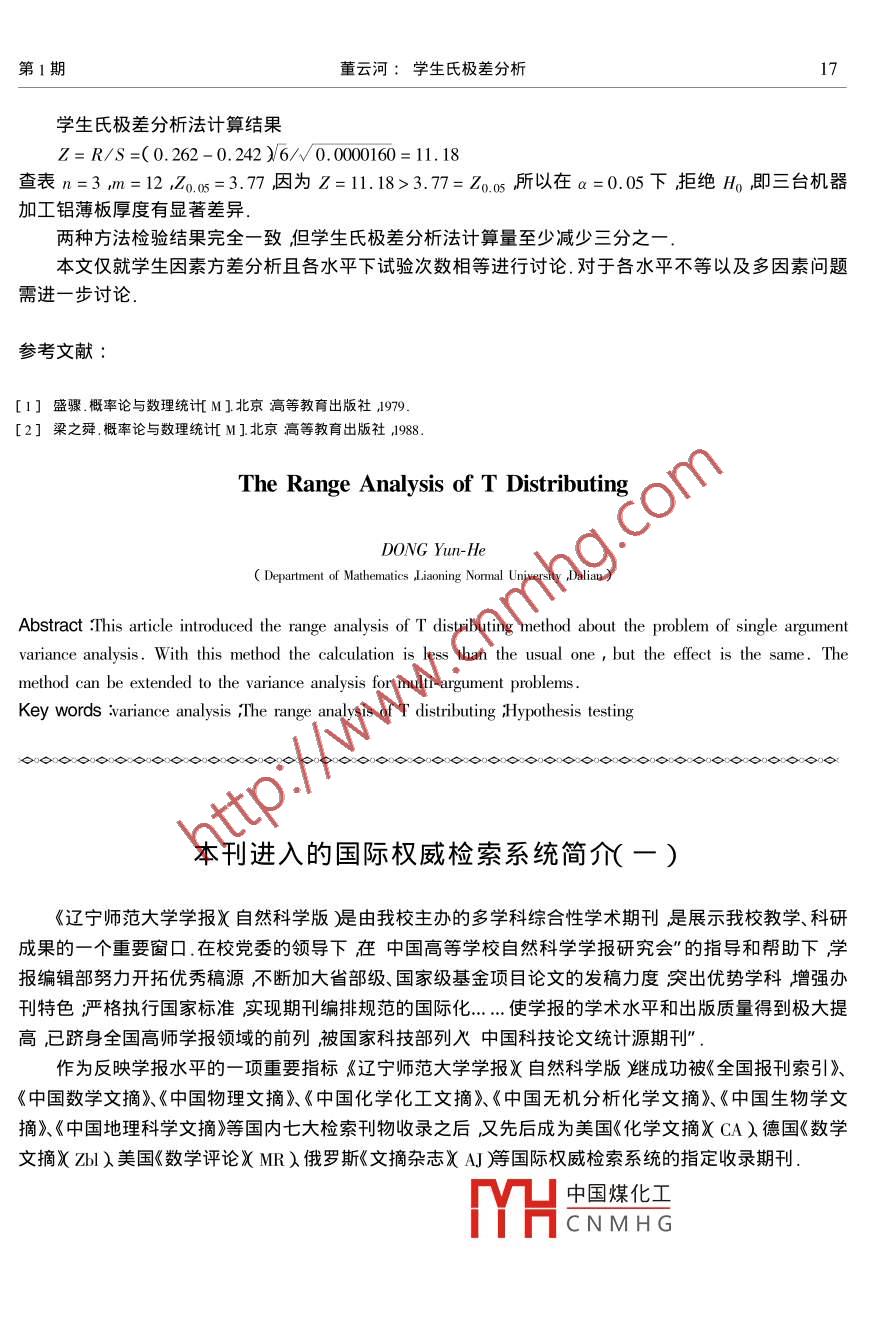 第25卷第1期遼寧師范大學(xué)學(xué)報(bào)(自然科學(xué)版)Vol.25 No. 12002年3月Journal of Liaoning Normal University ( Natural Science Edition )Mar.2002文章編號(hào):1000-1735( 2002 )1-0015-03學(xué)生氏極差分析董云河(遼寧師范大學(xué)數(shù)學(xué)系遼寧大連116029 )摘要給出了關(guān)于單因素方 差分析問題的學(xué)生氏極差分析方法.這種方法較-般方差分析計(jì)算量減少但其效果與-般方差分析相一致.這種方法可以推廣到多因素方差分析中去其證明思想與本文基本相似.關(guān)鍵詞方差分析學(xué)生氏極差分析假設(shè)檢驗(yàn)中圖分類號(hào):0212 1文獻(xiàn)標(biāo)識(shí)碼:A方差分析是討論k( k≥2)個(gè)相互獨(dú)立正態(tài)總體Nμ; σ2Xi=1 2... k)均值μ1心2..中是否完全相等的一個(gè)常用的有效方法.它是將總離差平方和分解成該差項(xiàng)平方和及因子的平方和然后通過因子平方和與該差項(xiàng)平方和建立服從F分布統(tǒng)計(jì)量進(jìn)行假設(shè)檢驗(yàn)的一種方法.本文對這種方法進(jìn)行了改進(jìn).就是將多個(gè)正態(tài)總體均值是否相等的假設(shè)檢驗(yàn)問題簡化為討論兩個(gè)正態(tài)總體值是否相等的假設(shè)檢驗(yàn)問題,即用均值極差構(gòu)造一個(gè)學(xué)生氏極差統(tǒng)計(jì)量通過對順序統(tǒng)計(jì)量中最大項(xiàng)與最小項(xiàng)所對應(yīng)的均值是否有顯著差異檢驗(yàn)進(jìn)而可達(dá)到對μ1 μ2... h是否全相等的判斷.下面就介紹這種方法.1學(xué)生氏極差分布.定義(學(xué)生氏極差分布)設(shè)xx2... ,xn 是容量為n的隨機(jī)樣本x;~ N(0,o2).令R= max; -minx; ,ms2/o2~xK m)且與x;獨(dú)立(i=1 2... n )則稱隨機(jī)變量Z= R/S服從分子自由度為n分母自由度為m的學(xué)生氏極差分布.其概率密度函數(shù)非常復(fù)雜我們在這里不給出.對于n ,m的各種值和a=0.01 0.05 0. 10在1中表VI到表VII可查得Zo使P( Z≥Z。)=a定理設(shè)X1X2... X%為k個(gè)相互獨(dú)立的正態(tài)總體X~Mμ;σXi=1 2... ,k)x成, .. x為總體X;的一個(gè)容量為r的樣本( i=1 2... k:).記j=1~ "sζ=_12(xj-x尸 (i=12. ,k)V;=(x;-μ;)rs2= 1之sR= maxV;- minV;中國煤化工則MCHCNMHG服從分子的自由度為n=k分母自由度為K( r-1 )的學(xué)生的以上小心證因?yàn)閤;~ M( μ; σ2/r )所以V;~ N(o,2li= 12...kh).*收稿日期2001-01-05作者簡介董云河( 1943- )男遼寧大連人遼寧師范大學(xué)副教授.16遼寧師范大學(xué)學(xué)報(bào)(自然科學(xué)版)第25卷又由(r- 1)S/o2~x(r-1)則k( r-1)S2/o2服從自由度為k(r-1)的x2分布.且s2與V;獨(dú)立.所以由定義知Z= R/S服從分子自由度為k分母自由度為K( r- 1 )的學(xué)生氏極差分布.2學(xué)生氏極差分析本文僅討論單因素學(xué)生氏極差分析對于兩因素學(xué)生氏極差分析將分文討論.設(shè)因素A有K個(gè)水平A ,A2... Ak在水平A;下( i=12... ,k: )進(jìn)行r次獨(dú)立試驗(yàn).結(jié)果如表1.表1重試驗(yàn)氫1平均試號(hào)果、4|xx12......xIrx22S:!假定各水平A(i=1 2... ,k:)下的樣本x; x2.. rx;(i=1 2... ,Jk )來自具有相同方差σ2和均值分別為μ(i=12... k: )的正態(tài)總體N(μ; σ2 )p;與o2未知且不同水平A;下的樣本之間相互獨(dú)立.檢驗(yàn)假設(shè)Ho:μ1=/2=.. =pk ,H:μ1 /2- h不會(huì)相等.由定理知在Ho成立下,R=、r( maxx;- minx; )所以對于顯著水平a有P( R/S≥Za )=a現(xiàn)在關(guān)鍵問題是1肖R/S≥Z。時(shí)是否可以拒絕Ho2肖R/S