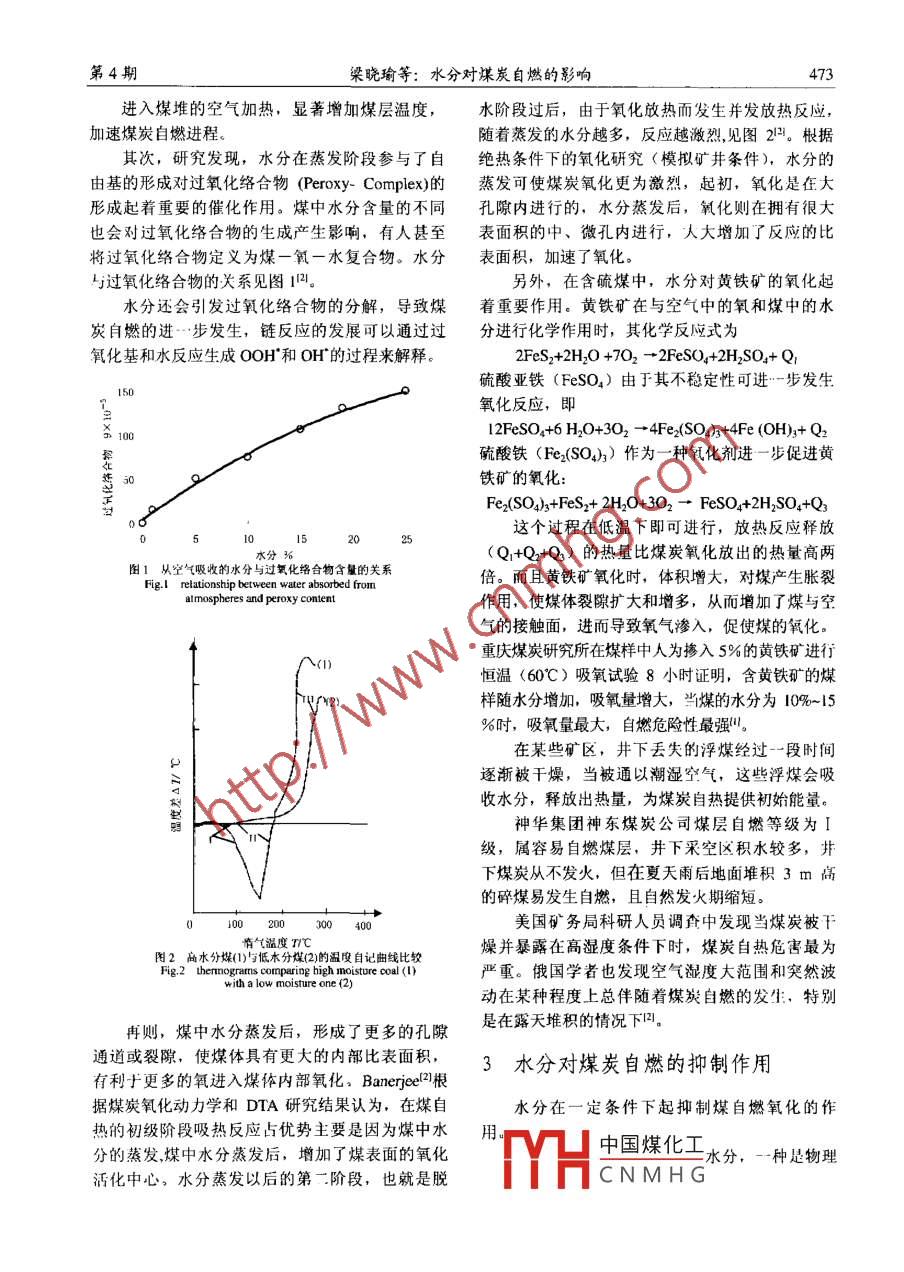 第22卷第4期遼寧工程技術(shù)大學(xué)學(xué)技2003年8月Vol.22 No.4Journal of Liaoning Technical UniversityAug.2003文章編號: 1008. 05200/04-0472-03水分對煤炭自燃的影響梁曉瑜,王德明中國礦業(yè)大學(xué)能??茖W(xué)yI程學(xué)院.江蘇徐州21008摘要:設(shè)歡門燃兒個復(fù)朵的物理化學(xué)過程烘的水分 是影響?zhàn)嚮M(jìn)程的重要以素.論述了水分化嫂成自繁門始階段的嘴化作用和劇煤家[1然的排利車用,研究了水分在奴炭自燃過科的物理化學(xué)機(jī)好,針對-些”x煤[I燃的實(shí)例對比水分的影響進(jìn)行了分析。煤發(fā)中飲分《爆的饑化、游熱和散熱過程都們-定的影響。煤中水分時煤發(fā)F|燃到成足起用化抑制作用。達(dá)足起”化虬發(fā)作月,應(yīng)根期認(rèn)體條件內(nèi)論、關(guān)鍵詞:煤炎白燃:水分:化:抑制中圖號: TD 753.7文獻(xiàn)標(biāo)識碼: AEffects of moisture on spontaneous combustion of coalLIANG Xiao-yu, WANG De-ming(Cllege of Mineral and Energy Resources, China University of Mining and Technology, Xuzhou 221008, China)Abstract: Spontaneous combustion of coal is an extremely complcated physical chemistry process and themoisture is the important factor of the influence of coal oxidation. The effects of moisture on spontaneouscombustion of coal was discussed from the catalyzing function in the initiation stage of spontaneous combustionand the sppressing action to the coal respectively in this paper. Then, the physical chemstry mechanism ofspontaneous combustion was studied. Finally, in allusion to the examples of some diggings, the account ofspontaneous combustion by the influence of moisture was analyzed. Moisture in coal has effect on coal oxidation,heat storage and heat emission process, but moisture in coal is an inhibitor or a catalyzer in spontaneouscombustion should be analyzed according to the specific condition.Key words: spontaneous combustion of coal; moisture: catalysis; suppress1煤的水分煤炭中或多或少地存在有一定的水分。根據(jù)降,物理變化是在熱處理過程中產(chǎn)生的堵孔效應(yīng)煤中水分賦存的特點(diǎn),煤中水分分內(nèi)在水分和外.使氧氣難以滲透,吸附能力降低P。在水分:煤的內(nèi)在水分是指吸附或凝聚方式存在于煤粒內(nèi)部直徑小丁l0-* cm的毛細(xì)孔中的水分:2水分在煤炭自燃初始階段的催化作用煤的外在水分是指附著在煤的顆粒表面以及點(diǎn)徑在煤炭自燃初始階段,水分對煤的氧化有著大于10-s cm的毛細(xì)孔中的水分。-般來說,煤的極為重要的催化作用。內(nèi)在水分任100 C以上的溫度才能完全蒸發(fā)于周圍的空氣中。煤的外在水分在常溫狀態(tài)下即能不首先,煤體內(nèi)存在有巨大的內(nèi)表面積,當(dāng)煤斷蒸發(fā)于周圍空氣中:在40~50 C溫度下,經(jīng)過炭被水分潤濕時,水分與煤體表面相互作用并釋- -定時間,煤的外在水分會完全蒸發(fā)。在煤的外放出一定量的潤濕熱從而促進(jìn)煤自燃初期的氧在水分還沒有全部熊發(fā)之前,溫度很難上:升到100化。潤濕熱隨煤中初始水分含量的增加而降低;C,因此,土要還是煤的外在水分含量對煤的氧水對煤的氧化或許是吸熱反應(yīng),或許是放熱反應(yīng),這依據(jù)煤中水分含量的不同而異:除了潤濕生熱化進(jìn)程有影響,干燥過的煤表面物理化學(xué)性質(zhì)都會發(fā)生變外,當(dāng)干煤炭被通以潮濕空’(時,水蒸汽在發(fā)熱化,化學(xué)變化是煤中平衡水分和極性基團(tuán)含量下“中國煤化工從血使煤堆及收稿日期: 2003-0-18基金項(xiàng)自:國家面點(diǎn)基礎(chǔ)好究專項(xiàng)終費(fèi)資助!2001CB40960102)CNMHG作者簡介:梁晚瑜:1975-.男,安敏縮州人。碩t切究生。本文編校:休樹;]第4期梁曉瑜等:水分對煤炭自燃的影響473進(jìn)入煤堆的空氣加熱,顯著增加煤層溫度,水階段過后,由于氧化放熱而發(fā)生并發(fā)放熱反應(yīng),加速煤炭自燃進(jìn)程。隨著蒸發(fā)的水分越多,反應(yīng)越激烈,見圖21。根據(jù)其次,研究發(fā)現(xiàn),水分在蒸發(fā)階段參與了自絕熱條件下的氧化研究( 模擬礦井條件),水分的由基的形成對過氧化絡(luò)合物(Peroxy- Complex)的蒸發(fā)可使煤炭氧化更為激烈,起初,氧化是在大形成起著重要的催化作用。煤中水分含量的不同孔隙內(nèi)進(jìn)行的,水分蒸發(fā)后,氧化則在擁有很大也會對過氧化絡(luò)合物的生成產(chǎn)生影響,有人甚至表面積的中、微孔內(nèi)進(jìn)行,人大增加了反應(yīng)的比將過氧化絡(luò)合物定義為煤一氧一水復(fù)合物。水分表面積,加速了氧化。與過氧化絡(luò)合物的關(guān)系見圖12。另外,在含硫煤中,水分對黃鐵礦的氧化起水分還會引發(fā)過氧化絡(luò)合物的分解,導(dǎo)致煤著重要作用。黃鐵礦在與空氣中的氧和煤中的水炭自燃的進(jìn)一步發(fā)生,鏈反應(yīng)的發(fā)展可以通過過分進(jìn)行化學(xué)作用時,其化學(xué)反應(yīng)式為氧化基和水反應(yīng)生成00H"和0H^的過程來解釋。2FeSs+2H2O +702→2FeSO+2HSO4+ Q1硫酸亞鐵(FeSO4) 由于其不穩(wěn)定性可進(jìn)-步發(fā)生50氧化反應(yīng),即l2FeSO4+6 H2O+3O2→4Fe2(SO4)3+4Fe (OH)3+ Q2硫酸鐵(Fe:(SO)}) 作為一種氧化劑進(jìn)一 步 促進(jìn)黃鐵礦的氧化:Fe(SO4)3+FeS2+ 2H2O+3O2一FeSO4+2H2SO+Q3這個過程在低溫下即可進(jìn)行,放熱反應(yīng)釋放52(25(Q,+Q2+Q)的熱量比煤炭氧化放出的熱量高兩圖1從空氣吸 收的水分與過氧化絡(luò)合物含量的關(guān)系倍。而且黃鐵礦氧化時,體積