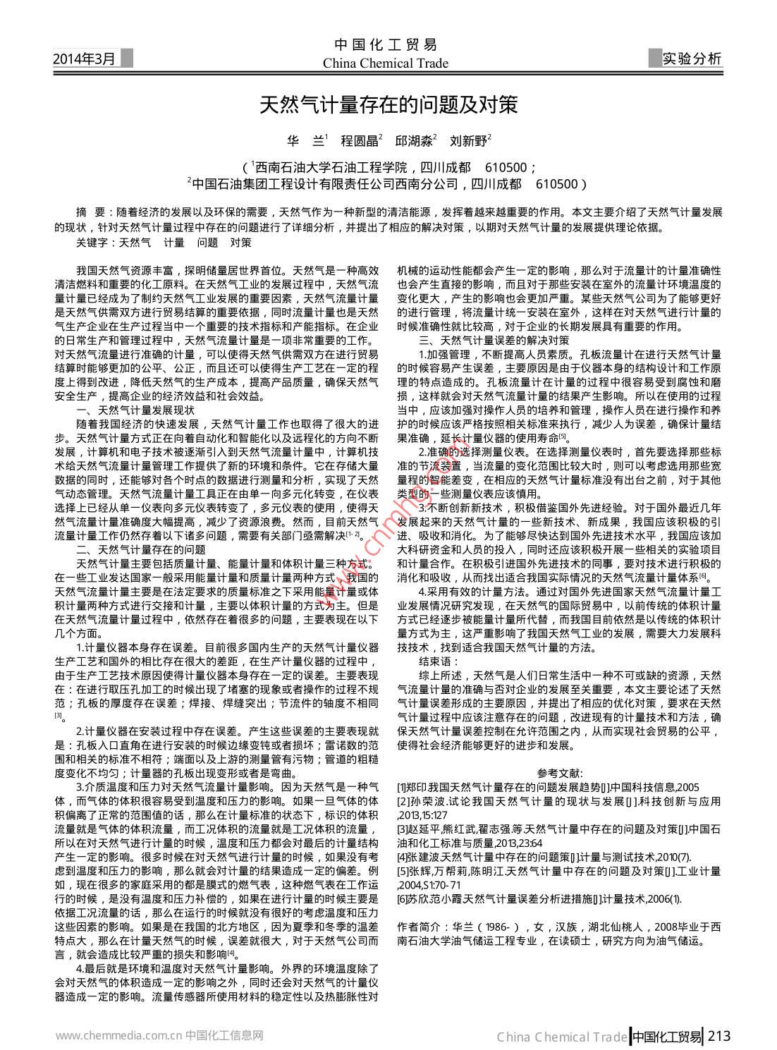 中國(guó)化工貿(mào)易014年3月China Chemical Trade實(shí)驗(yàn)分析天然氣計(jì)量存在的問題及對(duì)策華蘭程圓晶2邱湖淼2劉新野2(西南石油大學(xué)石油工程學(xué)院,四川成都6105002中國(guó)石油集團(tuán)工程設(shè)計(jì)有限責(zé)任公司西南分公司,四川成都610500)摘要:隨著經(jīng)濟(jì)的發(fā)展以及環(huán)保的需要,天然氣作為一種新型的清潔能源,發(fā)揮著越來越重要的作用。本文主要介紹了天然氣計(jì)量發(fā)展的現(xiàn)狀,針對(duì)夭然氣計(jì)量過程中存在的問題進(jìn)行了詳細(xì)分析,并提出了相應(yīng)的解決對(duì)策,以期對(duì)天然氣計(jì)量的發(fā)展提供理論依據(jù)關(guān)鍵字:天然氣計(jì)量問題對(duì)策我國(guó)天然氣資源豐富,探明儲(chǔ)量居世界首位。天然氣是一種高效機(jī)械的運(yùn)動(dòng)性能都會(huì)產(chǎn)生一定的影響,那么對(duì)于流量計(jì)的計(jì)量準(zhǔn)確性凊潔燃料和重要的化工原料。在天然氣工業(yè)的發(fā)展過程中,天然氣流也會(huì)產(chǎn)生直接的影響,而且對(duì)于那些安裝在室外的流量計(jì)環(huán)境溫度的量計(jì)量已經(jīng)成為了制約天然氣工業(yè)發(fā)展的重要因素,天然氣流量計(jì)量變化更大,產(chǎn)生的影響也會(huì)更加嚴(yán)重。某些天然氣公司為了能夠更好是天然氣供需雙方進(jìn)行貿(mào)易結(jié)算的重要依據(jù),同時(shí)流量計(jì)量也是天然的進(jìn)行管理,將流量計(jì)統(tǒng)一安裝在室外,這樣在對(duì)天然氣進(jìn)行計(jì)量的氣生產(chǎn)企業(yè)在生產(chǎn)過程當(dāng)中一個(gè)重要旳技術(shù)指標(biāo)和產(chǎn)能指標(biāo)。在企業(yè)時(shí)候準(zhǔn)確性就比較高,對(duì)于企業(yè)的長(zhǎng)期發(fā)展具有重要的作用的日常生產(chǎn)和管理過程中,天然氣流量計(jì)量是一項(xiàng)非常重要的工作。三、天然氣計(jì)量誤差的解決對(duì)策對(duì)天然氣流量進(jìn)行準(zhǔn)確的計(jì)量,可以使得天然氣供需雙方在進(jìn)行貿(mào)易1加強(qiáng)管理,不斷提高人員素質(zhì)??装辶髁坑?jì)在進(jìn)行天然氣計(jì)量結(jié)算時(shí)能夠更加的公平、公正,而且還可以使得生產(chǎn)工藝在一定的程的時(shí)候容易產(chǎn)生誤差,主要原因是由于儀器本身的結(jié)構(gòu)設(shè)計(jì)和工作原度上得到改進(jìn),降低天然氣的生產(chǎn)成本,提高產(chǎn)品質(zhì)量,確保天然氣理的特點(diǎn)造成的。孔板流量計(jì)在計(jì)量的過程中很容易受到腐蝕和磨安全生產(chǎn),提高企業(yè)的經(jīng)濟(jì)效益和社會(huì)效益損,這樣就會(huì)對(duì)天然氣流量計(jì)量的結(jié)果產(chǎn)生影響。所以在使用的過程一、天然氣計(jì)量發(fā)展現(xiàn)狀當(dāng)中,應(yīng)該加強(qiáng)對(duì)操作人員的培養(yǎng)和管理,操作人員在進(jìn)行操作和養(yǎng)隨著我國(guó)經(jīng)濟(jì)的快速發(fā)展,天然氣計(jì)量工作也取得了很大的進(jìn)護(hù)的時(shí)候應(yīng)該嚴(yán)格按照相關(guān)標(biāo)準(zhǔn)來執(zhí)行,減少人為誤差,確保計(jì)量結(jié)天然氣計(jì)量方式正在向著自動(dòng)化和智能化以及遠(yuǎn)程化的方向不斷果準(zhǔn)確,延長(zhǎng)計(jì)量?jī)x器的使用壽命。發(fā)展,計(jì)箅機(jī)和電子技術(shù)被逐漸引入到天然氣流量計(jì)量中,計(jì)算機(jī)技2準(zhǔn)確的選擇測(cè)量?jī)x表。在選擇測(cè)量?jī)x表時(shí),首先要選擇那些標(biāo)術(shù)給天然氣流量計(jì)量管理工作提供了新的環(huán)境和條件。它在存儲(chǔ)大量準(zhǔn)的節(jié)流裝置,當(dāng)流量的變化范圍比較大時(shí),則可以考慮選用那些寬數(shù)據(jù)的同時(shí),還能夠?qū)Ω鱾€(gè)時(shí)點(diǎn)的數(shù)據(jù)進(jìn)行測(cè)量和分析,實(shí)現(xiàn)了天然量程的智能差變,在相應(yīng)的天然氣計(jì)量標(biāo)準(zhǔn)沒有出臺(tái)之前,對(duì)于其他天然氣流量計(jì)量工具正在由單一向多元化轉(zhuǎn)變,在儀表類型的一些測(cè)量?jī)x表應(yīng)該慎用。選擇上已經(jīng)從單一儀表向多元儀表轉(zhuǎn)變了,多元儀表的使用,使得天3.不斷創(chuàng)新新技術(shù),積極借鑒國(guó)外先進(jìn)經(jīng)驗(yàn)。對(duì)于國(guó)外最近幾年然氣流量計(jì)量準(zhǔn)確度大幅提高,減少了資源浪費(fèi)。然而,目前天然氣發(fā)展起來的天然氣計(jì)量的一些新技術(shù)、新成果,我國(guó)應(yīng)該積極的引流量計(jì)量工作仍然存著以下諸多問題,需要有關(guān)部門亟需解決。進(jìn)、吸收和消化。為了能夠盡快達(dá)到國(guó)外先進(jìn)技術(shù)水平,我國(guó)應(yīng)該加天然氣計(jì)量存在的問題大科研資金和人員的投入,同時(shí)還應(yīng)該積極開展一些相關(guān)的實(shí)驗(yàn)項(xiàng)目天然氣計(jì)量主要包括質(zhì)量計(jì)量、能量計(jì)量和體積計(jì)量三種方式。和計(jì)量合作。在積極引進(jìn)國(guó)外先進(jìn)技術(shù)的同事,要對(duì)技術(shù)進(jìn)行積極的在一些工業(yè)發(fā)達(dá)國(guó)家一般采用能量計(jì)量和質(zhì)量計(jì)量?jī)煞N方式,我國(guó)的消化和吸收,從而找出適合我國(guó)實(shí)際情況的天然氣流量計(jì)量體系天然氣流量計(jì)量主要是在法定要求的質(zhì)量標(biāo)準(zhǔn)之下采用能量計(jì)量