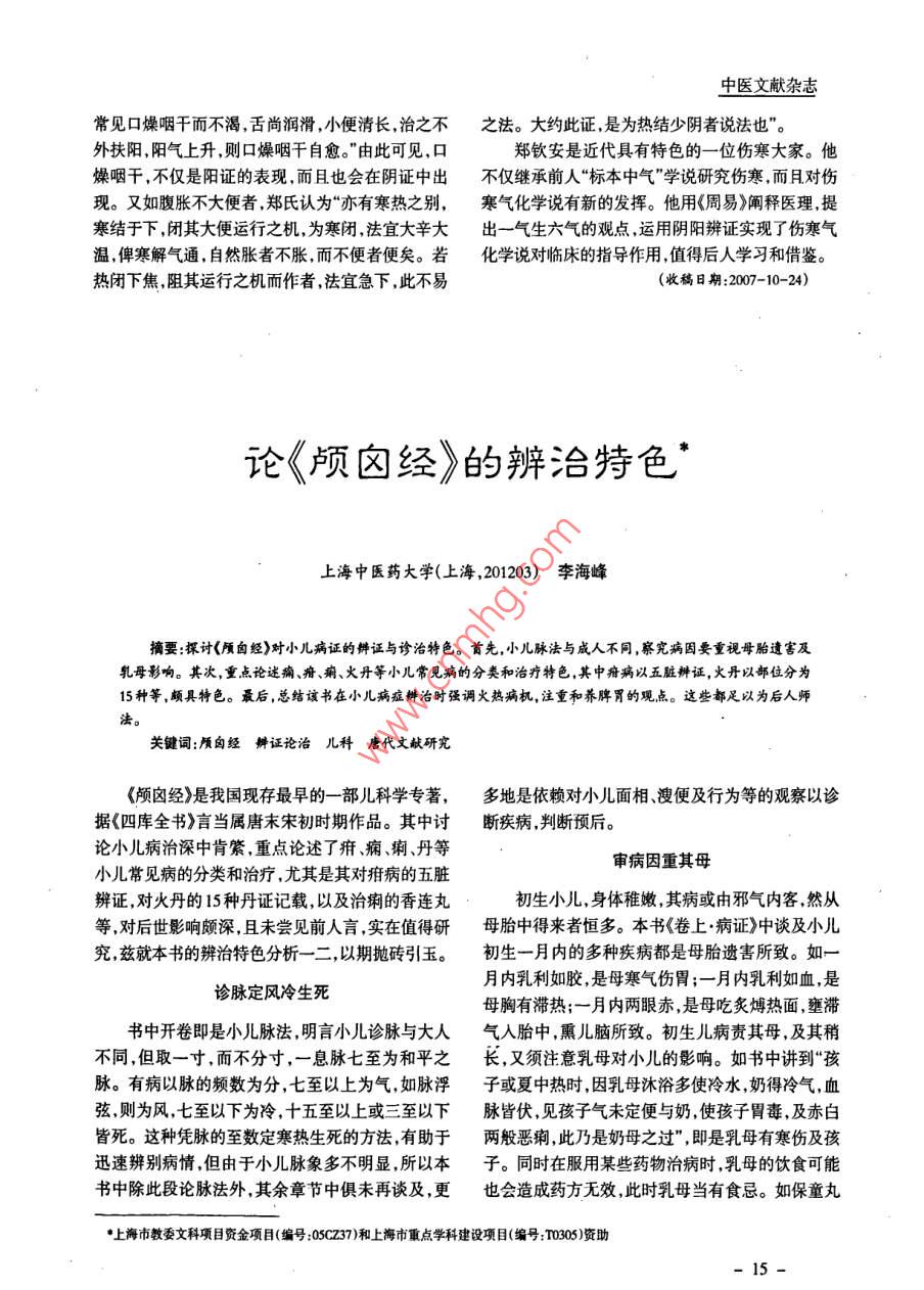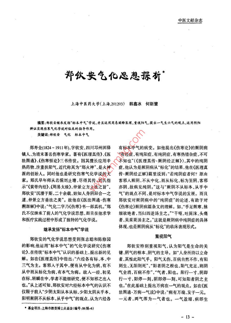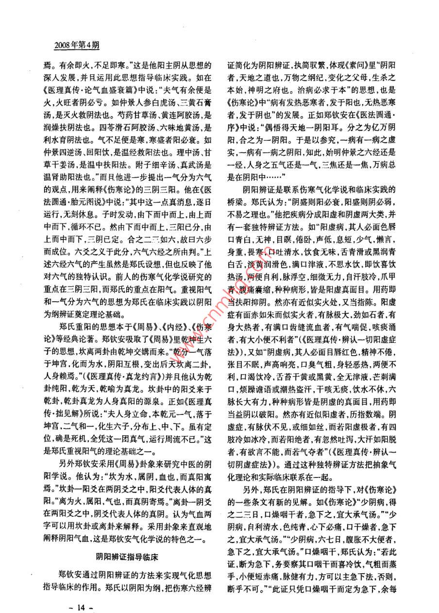 中醫(yī)文獻雜志鄭欽安氣化思想探析*上海中醫(yī)藥大學(上海,201203)韓鑫冰何新慧摘要:鄭欽安繼承發(fā)揚“標本中氣”學說,并且運用周易闡釋醫(yī)理,重視陽氣,提出一氣生六氣的觀點,運用陰陽辨證實現傷寒氣化學說對臨床的指導作用。關鍵詞:鄭欽安氣化 標本中氣鄭壽全(1824~ 1911年),字欽安,四川邛州周驛有標本中氣的病變。如他提出《傷寒論》的厥陰病鎮(zhèn)人,為清末著名傷寒學家。著有《醫(yī)理真?zhèn)鳌?《醫(yī)“有經癥,有純陽癥,有純陰癥,有寒熱錯雜癥,不可法圓通》、《傷寒恒論》三書傳世。因其擅長應用辛不知也"(《醫(yī)理真?zhèn)鳌褙赎幗浾狻?,其中的純陰熱藥物,注重扶陽氣,近代稱其為“鄭火神”,是火神癥,他認為是厥陰病從“標化’的結果,他在《醫(yī)理真派的創(chuàng)始人。同時他也是研究傷寒氣化學說的大傳.厥陰經正解》篇里說到:“若純陰癥者何?原由家。鄭氏早年師從名儒劉止塘,盡得其傳,劉氏指客邪人厥陰,不從中化.而從標化,標為至陰,客邪:示“《黃帝內經》、《周易太極》,仲景立方立法之旨”,亦陰 ,故病見純陰。”這與“厥陰不從標本,從乎中鄭欽安“沉潛于斯,二十余載,始知人身陰陽合- -之氣”的觀點不同,是對標本中氣學說的發(fā)展。而且道,仲景立方垂法之美”。故他在《醫(yī)法圓通.傷寒鄭欽安對厥陰病中的“純陰癥”的論述.有助于對溯源解》中說:“氣化二字乃《傷寒》書一部真機?!编崱秱摗坟赎幉∑獥l文的理解。如,“手足厥寒,脈氏不僅繼承了前人的氣化學說思想,而且在他求學細欲絕者.當歸四逆湯主之?!薄案蓢I,吐涎沫,頭痛和醫(yī)療實踐過程中形成了獨特的氣化學說。者.吳茱萸湯主之。"這就是厥陰病中純陰癥的具體體現,也是既陰病從“標化”的臨床表現形式。繼承發(fā)揚"標本中氣”學說重視陽氣鄭欽安的氣化學說思想受到張志聰和陳修園的影響,他運用“標本中氣”的氣化學說研究《傷寒鄭欽安特別重視陽氣,認為陽氣是生命的關論》,在傳統(tǒng)“標本中氣”認識的基礎上提出新的見鍵、陰氣的根本、陰氣的主導。如“人身所持以立命解。如在《醫(yī)理真?zhèn)鳌分兄赋?“六經各有標,本、中者,其惟此陽氣乎。陽氣無傷,百病自然不作,有陽三氣為主??托叭擞谄渲?便有從中化為病,有不則生,無陽則死”,“陽者陰之根也,陽氣充足,則陰從中而從標化為病,有本氣為病。故入一經,初見氣全消,百病不作” ,“氣者,陽也。陽行一寸,陰即在標,轉瞬在中,學者不能細研究,便不知邪之出入行一寸,陽停一刻,陰即停一刻,可知陽者陰之主也?!睆纳鲜隹芍?鄭欽安對六經標本中氣的認識不也。”在此基礎上提出萬病在-氣的觀點。如在《醫(yī)僅限于前人“少陰太陽從本從標,少陽太陰從乎本,法圓通 .萬病-氣說》中說:“病有萬端.發(fā)于一元。陽明厥陰不從標本從乎中氣”的觀點,認為六經各- 元者.兩氣渾為一氣者也。一氣盈縮,病即生●基金項目:上海市教委博土點基金(編號:06博-6)一13-2008年第4期焉。有余即火,不足即寒?!边@是他陽主陰從思想的證簡化為陰陽辨證,執(zhí)簡馭繁,體現《素問》里“陰陽深人發(fā)展,并且運用此思想指導臨床實踐。如在者,天地之道也,萬物之綱紀,變化之父母,生殺之《醫(yī)理真?zhèn)?論氣血盛衰篇》中說:“夫氣有余便是本始,神明之府也。治病必求于本"的思想,也是火,火旺者陰必虧。如仲景人參白虎湯、三黃石膏《傷寒論》中“病有發(fā)熱惡寒者.發(fā)于陽也,無熱惡寒湯,是滅火救陰法也。芍藥甘草湯,黃連阿膠湯,是者,發(fā)于陰也”的發(fā)展。正如鄭欽安在《醫(yī)法圓通●潤燥扶陰法也。四苓滑石阿膠湯、六味地黃湯,是序》中說:“偶悟得天地一陰陽耳。分之為億萬陰利水育陰法也。氣不足便是寒,寒盛者陽必衰。如陽,合之為一陰陽。于是以參究,一病有一病之虛仲景四逆湯回陽飲,是溫經救陽法也。理中湯、甘實,一病有一-病之陰陽,知此,始明仲景之六經還是草干姜湯,是溫中扶陽法。附子細辛湯、真武湯是-經,人身之五氣還是一氣,三焦還是一焦,萬病總溫腎助陽法也?!倍宜M一-步提出一氣分為六氣是在陰陽....的觀點,用來闡釋《傷寒論》的三陰三陽。他在《醫(yī)陰陽辨證是聯系傷寒氣化學說和臨床實踐的法圓通●胎元圖說》中說:“其中這一一點真消息,逐日橋梁。鄭氏認為:“陰盛則陽必衰,陽盛則陰必弱,運行,無刻休息。子時發(fā)動,由下而中而上,由上而不易之理也。”他把疾病分成陽虛和陰虛兩大類,并中而下,循環(huán)不已。然由下而中而上,三陽已分,由有一套獨特辨證方法。如“陽虛病,其人必面色唇上而中而下,三陰已定。合之二三如六,故曰六步口青白,無神,目暝,倦臥,聲低,息短,少氣,懶言,而成位。六爻之義于此分,六氣六經之所由判?!鄙仙碇?畏寒,口吐清水,飲食無味,舌青滑或黑潤青述六經六氣的產生雖然是鄭氏設想,但也反映了他白舌,淡黃潤滑色,滿口津液,不思水飲,即飲喜飲對六氣的獨特認識。前人的傷寒氣化學說研究的熱湯,兩便自利,脈浮空,細微無力,自汗肢冷,爪甲重點在三陰三陽,而鄭氏的重點在陽氣。重視陽氣青,腹痛囊縮,種種病形,皆是陽虛真面目。用藥即和一氣分為六氣的思想為鄭氏在臨床實踐以陰陽當扶陽抑陰。然亦有近似實火處,又當指陳。陽虛為綱辨證奠定理論基礎。癥有面赤如朱而似實火者,有脈