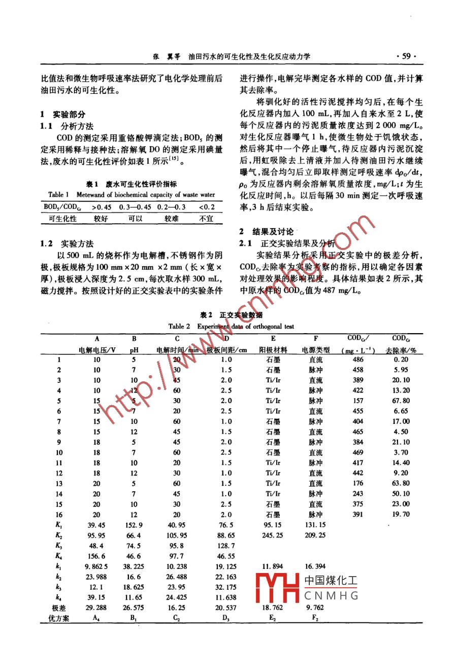 第37卷第2化學(xué)工程Vol 37 No. 2000年2月CHEMICAL ENGINEERING(CHINA)Feb.2009油田污水的可生化性及生化反應(yīng)動(dòng)力學(xué)張翼,張妍,李雪峰,李云峰',胡冰',楊玉蓮3(1.大慶石油學(xué)院化學(xué)化工學(xué)院,黑龍江大慶163318;2.長(zhǎng)安品質(zhì)電子制造廠,廣東東莞523860;3.遼寧石油化工大學(xué)化學(xué)化工學(xué)院,遼寧撫順113001)摘要:以油田污水為研究對(duì)象采用電化學(xué)氧化工藝來提高污水的可生化性考察了不同因素對(duì)除污效果的影響利用正交實(shí)驗(yàn)設(shè)計(jì)確定電化學(xué)氧化最佳工藝參數(shù)為:電解電壓20V,pH值5極板間距20cm,陽極為TIr形穩(wěn)電雙向脈沖電源在此條件下電解30min,油田污水COD去除率達(dá)到70%。利用BOD3CODc比值法和微生物呼吸速率法對(duì)污水的可生化性進(jìn)行了研究,2種實(shí)驗(yàn)方法均表明處理前油田污水的可生化性較差,而經(jīng)電化學(xué)氧化工藝處理后的污水可進(jìn)行生化處理同時(shí)在微生物呼吸速率法的基礎(chǔ)上探討了微生物的生化反應(yīng)動(dòng)力學(xué),結(jié)果表明實(shí)驗(yàn)條件下微生物的呼吸速率都嚴(yán)格遵循一級(jí)動(dòng)力學(xué)關(guān)系式。關(guān)鍵詞:油田污水;電化學(xué)氧化;可生化性;反應(yīng)動(dòng)力學(xué)分類號(hào):X703.1文獻(xiàn)標(biāo)識(shí)碼:A文章編號(hào):10059954(2009)020058Biochemical capacity and biochemical reaction kineticsof oilfield wastewaterZHANG YI, ZHANG Yan', LI Xue-feng, LI Yun-feng, HU Bing, YANG Yu-lian(1. College of Chemistry and Chemical Engineering, Daqing Petroleum Institute, Daqing 163318, HeilongjiangProvince, China; 2. Dongguan Changan Quality Electron Factory, Dongguan 523860, GuangdongProvince, China; 3. College of Chemistry and Chemical Engineering, Liaoning PetrochemicalUniversity, Fushun 113001, Liaoning Province, China)Abstract: Electrochemical oxidation process was used to improve biodegradability of the oilfield wastewater. Theeffects of different factors on the decontamination were investigated. The best electrochemical oxidation processparameters were determined through orthogonal experiment design as follows: electrolysis voltage of 20V, pH=5plate spacing of 2.0 cm, anode materials for the Ti/Ir dimensionally stable electrode, two-way pulse for electricalsource. Under these conditions the removal rate of cod of oilfield wastewater achieved 70% after 30 minelectrolysis. The biochemical capacity of wastewater untreated and treated was studied by BOD, /CODc,andmicrobial respiration rate method. Both experimental methods show that the biodegradability of the former is poorand the electrochemical oxidation canove the biodegradability of wastewater. On the basis of microbialrespiration rate, the microbial reaction kinetics results show that under the experimental conditions the microbialrespiration rate strictly abides by a first-order kinetic relationshipKey words: oilfield wastewater; electrochemical oxidation; biochemical capacity reaction kinetics隨著能源的不斷消耗,石油開采量不斷增加,這水的處理,國內(nèi)外的研究機(jī)構(gòu)及專家學(xué)者一直在努一過程中油田產(chǎn)生的污水也與日俱增。據(jù)統(tǒng)計(jì),石力開發(fā)探尋更為高效環(huán)保的新技術(shù)。油和天然氣開發(fā)過程中產(chǎn)生的廢水占整個(gè)開采工業(yè)最近幾年,電化學(xué)技術(shù)因其處理效率高、成本低的70%12],這些廢水經(jīng)過處理之后作為生產(chǎn)廢水廉、操作簡(jiǎn)單安全、環(huán)境友好等在污/廢水處理領(lǐng)域被直接外排或是注入地表和地下。由于環(huán)境保護(hù)意引起識(shí)的提高和排放標(biāo)準(zhǔn)要求的日益嚴(yán)格,對(duì)于油田污定了凵中國煤化工果用取計(jì)確CNMHG基金項(xiàng)目:中國石油天然氣集團(tuán)公司中青年創(chuàng)新基金(07E1010);黑龍江省自然基金(B0310作者簡(jiǎn)介:張翼(1964-),女,博士教授,主要從事材料表面改性及廢水深度處理方面的研究電話:(0459)6503479, E-mail:;2200dypi@張翼等油田污水的可生化性及生化反應(yīng)動(dòng)力學(xué)比值法和微生物呼吸速率法研究了電化學(xué)處理前后進(jìn)行操作,電解完畢測(cè)定各水樣的COD值,并計(jì)算油田污水的可生化性。其去除率。將馴化好的活性污泥攪拌均勻后,在每個(gè)生1實(shí)驗(yàn)部分化反應(yīng)器內(nèi)加人100mL,再加入自來水至2L,使1.1分析方法每個(gè)反應(yīng)器內(nèi)的污泥質(zhì)量濃度達(dá)到2000mg/L。COD的測(cè)定采用重鉻酸鉀滴定法;BOD3的測(cè)對(duì)生化反應(yīng)器曝氣1h,使微生物處于饑餓狀態(tài),定采用稀釋與接種法;溶解氧DO的測(cè)定采用碘量然后將其中一個(gè)停止曝氣待反應(yīng)器內(nèi)污泥沉淀法,廢水的可生化性評(píng)價(jià)如表1所示后,用虹吸除去上清液并加入待測(cè)油田污水繼續(xù)曝氣,混合均勻后立即取樣測(cè)定呼吸速率ψo(hù)/dr,豪1廢水可生化性評(píng)價(jià)指標(biāo)po為反應(yīng)器內(nèi)剩余溶解氧質(zhì)量濃度,mgL;t為生Table 1 Metewand of biochemical capacity of waste water化反應(yīng)時(shí)間,h。以后每隔30min測(cè)定一次呼吸速BOD3COD>0.450.3-0.450.2-0.3<0.2率,3h后結(jié)束實(shí)驗(yàn)??缮暂^好可以不宜2結(jié)果及討論1.2實(shí)驗(yàn)方法2.1正交實(shí)驗(yàn)結(jié)果及分析以500mL的燒杯作為電解槽,不銹鋼作為陰實(shí)驗(yàn)結(jié)果分析采用正交實(shí)驗(yàn)中的極差分析極極板規(guī)格為100mmx20mmx2mm(長(zhǎng)x寬×COD去除率