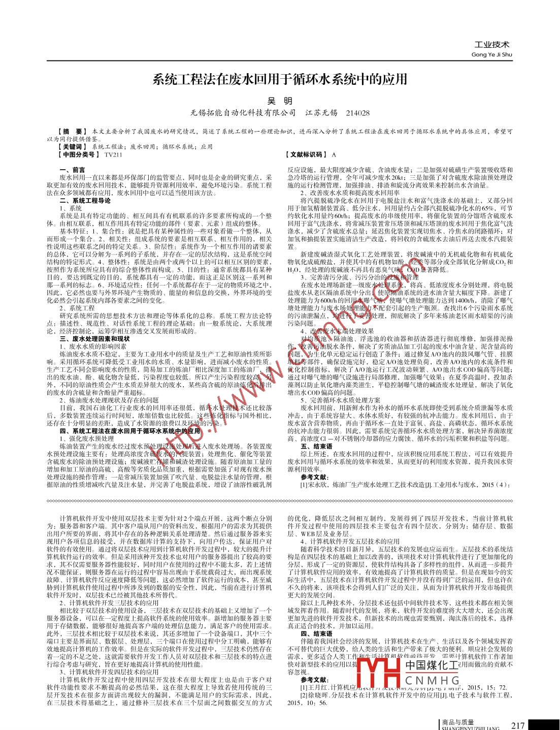系統(tǒng)工程法在廢水回用于循環(huán)水系統(tǒng)中的應(yīng)用