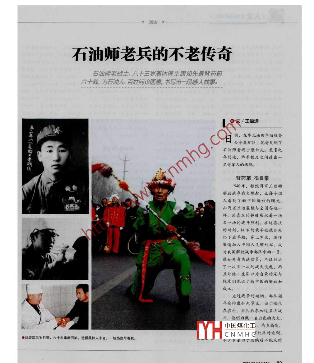 石油師老兵的不老傳奇石油師老戰(zhàn)土、八十三歲離休醫(yī)生康如先身背藥箱六十載,為石油人百姓問診醫(yī)患,書寫出一段感人故事?!蛭?王福運日前,在華北油田華麗服務(wù)處辛集礦區(qū),筆者見到了石油師老戰(zhàn)士康如先。耄耋之年的他,舉手投足之間透出一十名老軍人的酒脫。背藥箱很自豪._1946年,摧毀蔣家王朝的解放戰(zhàn)爭戰(zhàn)火燃起,讓每個國人看到了新中國解放的曙光。山西省長治襄垣與全國各地一樣,用喜慶的鑼鼓慶祝著一場又一場的戰(zhàn)斗勝利。在這喜慶的時刻,14 歲的放羊娃康如先扔下放羊鞭,穿上軍裝,滿懷激情加入中國人民解放軍,成為我國解放戰(zhàn)爭部隊中的一員??等缦壬頌橥ㄐ艈T,不僅經(jīng)歷了一次又一次的戰(zhàn)火洗禮,而且讓他一生引以為自豪的是與戰(zhàn)友們見證了新中國的解放和成立。走過戰(zhàn)爭的硝煙,部隊領(lǐng)導(dǎo)安排康如先學(xué)醫(yī)。由于他生在農(nóng)村,當兵后參加過多次戰(zhàn)斗,他明白做一名出色的大夫,中國煤化工、有多高尚。●戎裝卸后歲月稠,六十年華獻石油,造福桑梓人未老,一腔熱血寫春秋。CHCNMHG放羊時看到,不少鄉(xiāng)親由于悲病后不能及時2012/09/15第18用83