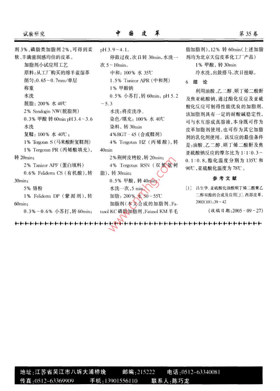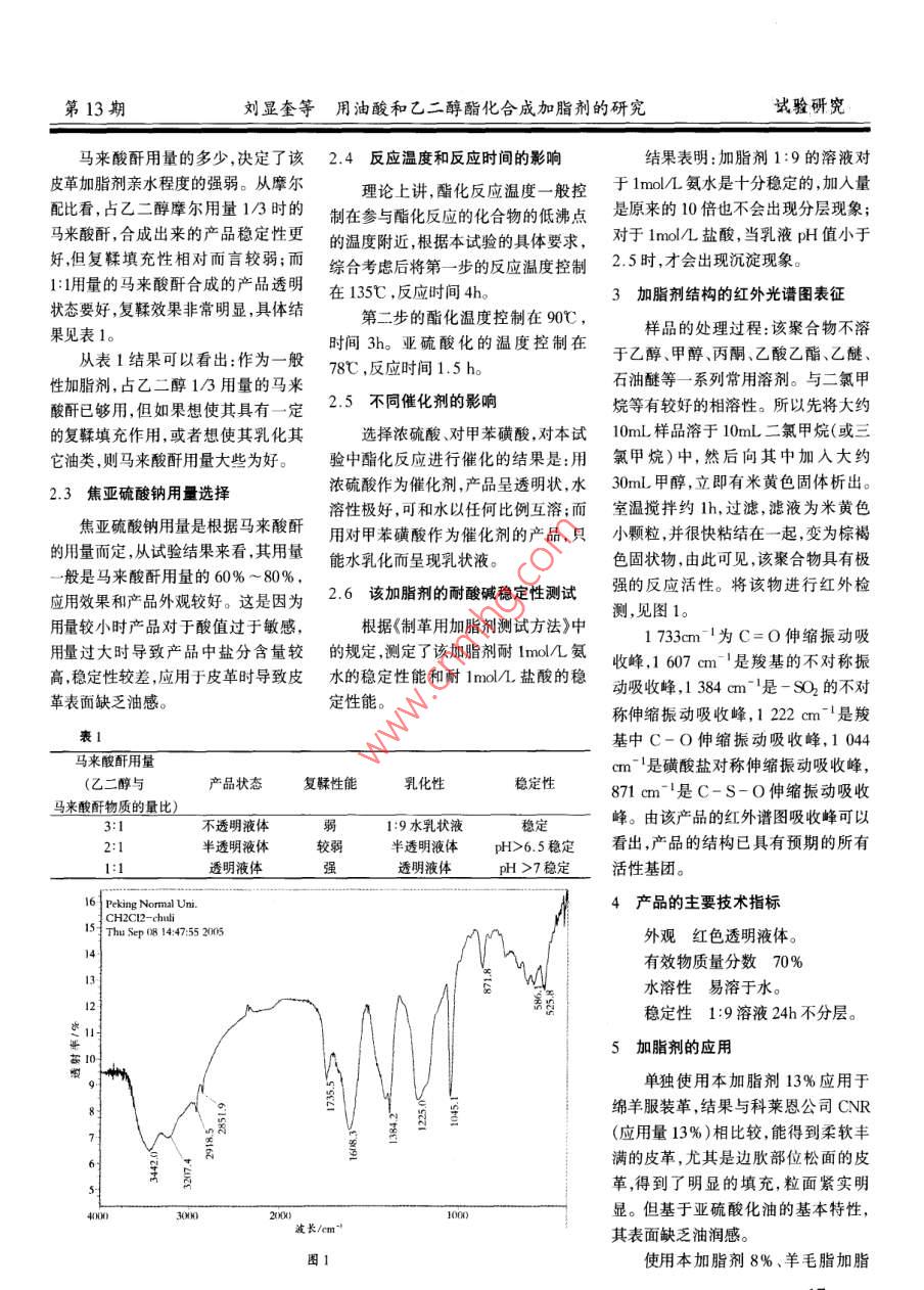 第35卷第13期中國皮蘋Vol 35 No 132006年7月CHINA LEATHERJul.2006用油酸和乙二醇酯化合成加脂劑的研究劉顯奎”王文琪段力民(中國皮革和制鞋工業(yè)研究院,北京100016)摘要:以油酸和乙二醇及馬來酸酐為主要原料,合成了一種性能優(yōu)良的加脂劑,同時詳細討論了各步反應的影響因素,得到最佳反應條件,并對該加脂劑進行了應用試驗。關鍵詞:油酸;乙二醇;亞硫酸化;加脂劑中圖分類號TS51文獻標識碼AStudy on Fatliquor Synthesized with Oleic Acid and glycolLIU Xian-kui, WANG Wen-qi, DUAN Li-minChina Leather and Footwear Industry Research Institute, Beijing 100016, China)Abstract: An excellent fatliquor is synthesized with oleic acid, glycol and maleic anhydride. The influencing factors of eachorocess are studied and the optimal reacting conditions are gained. And the application of the fatliquor is carried outKey words: oleic acid; glycol; sulfite; fatliquor將油酸與乙二醇放入無水三口瓶響的主要是pH值,因此在產(chǎn)品出料隨著我國人口的逐漸增多,人們中,攪拌升溫并同時滴加適量濃硫酸,前應將產(chǎn)品的時H值調(diào)為7.5以利于對食用油的需求也越來越大,價格也在135℃酯化反應4h,隨著酯化反應產(chǎn)品的貯存。逐年上升,因此利用食用油生產(chǎn)皮革的進行,反應體系的顏色越來越深由用對甲苯磺酸代替濃硫酸進行了用加脂劑將受到極大限制。油酸作為紅色變?yōu)楹谏?利用反應體系酸值的1.2.1的反應,并進行12.2-1.24常見的工業(yè)原料,其自身羧基所具有變化來判斷反應的程度的化學過程。的活性,使其在化工行業(yè)中得到了廣1.2.2油酸乙二醇酯與馬來酸酐的2結果與討論泛的應用。皮革工業(yè)中利用油酸合成進一步酯化反應2.1乙二醇用量的選擇加脂劑也有報道,但一般是利用聚乙將1.2.1反應罐的液體降溫至由于油酸與乙二醇酯化反應的目二醇和油酸酯化1。本文利用乙二醇90℃,加入馬來酸酐,攪拌,待其全部的是在油酸分子鏈中引入羥基,以利和油酸酯化然后再亞硫酸化的方法,溶化后,補加總量0.5%的濃硫酸,保于進一步同順丁烯二酸酐進行酯化反獲得了一種性能優(yōu)良的加脂劑,并對溫90℃反應3h應,從而達到亞硫酸化的目的,因此反應條件進行了研究1.2.3產(chǎn)品的亞硫酸化以油酸和乙二醇的摩爾比為1:1為宜1試驗部分將1.2.2的中間體降溫至40℃盡管酯化反應不可能全部消耗乙11主要原料加入氨水調(diào)p值至7,攪拌均勻后加二醇,但剩余的乙二醇分子還可以和植物油酸、乙二醇、馬來酸酐、焦人焦亞硫酸鈉溫度自動升至70馬來酸酐形成酯化反應,再進一步聚亞硫酸鈉,均為工業(yè)純;對甲苯磺酸、加入適量熱水,于78℃保溫1h合,可形成填充復鞣皮革的化工材料,濃硫酸、氨水,均為化學純1.2.4產(chǎn)品的中和該材料應用皮革后,復鞣填充的效果1.2試驗方法在出料前用適量的氨水調(diào)節(jié)P體現(xiàn)得非常明顯。12.1油酸與乙二醇酯化反應值到7.5。對最終產(chǎn)品的穩(wěn)定性有影2.2馬來酸酐的選擇*第一作者簡介:劉顯奎,男,1964年生,大學本科,高級工程師第13期劉顯奎等用油酸和乙二醇酯化合成加脂劑的研究試驗研究馬來酸酐用量的多少,決定了該2.4反應溫度和反應時間的影響結果表明:加脂劑1:9的溶液對皮革加脂劑親水程度的強弱。從摩爾理論上講酯化反應溫度一般控于1m氨水是十分穩(wěn)定的加入量配比看,占乙二醉摩爾用量1/3時的制在參與酯化反應的化合物的低沸點是原來的10倍也不會出現(xiàn)分層現(xiàn)象馬來酸酐,合成出來的產(chǎn)品穩(wěn)定性更的溫度附近根據(jù)本試驗的具體要求,對于1moL鹽酸,當乳液pH值小于好,但復鞣填充性相對而言較弱;而綜合考慮后將第一步的反應溫度控制2.5時,才會出現(xiàn)沉淀現(xiàn)象。11用量的馬來酸酐合成的產(chǎn)品透明在135℃,反應時間4h3加脂劑結構的紅外光譜圖表征狀態(tài)要好,復鞣效果非常明顯,具體結第二步的酯化溫度控制在90℃,果見表1。樣品的處理過程:該聚合物不溶時間3h。亞硫酸化的溫度控制在從表1結果可以看出:作為一般78℃,反應時間1.5h于乙醇、甲醇、丙酮、乙酸乙酯、乙醚、性加脂劑,占乙二醇13用量的馬來石油醚等一系列常用溶劑。與二氯甲酸酐已夠用但如果想使其具有一定25不同催化劑的影響烷等有較好的相溶性。所以先將大約的復鞣填充作用,或者想使其乳化其選擇濃硫酸、對甲苯磺酸,對本試10mL樣品溶于10mL二氯甲烷(或三它油類,則馬來酸酐用量大些為好。驗中酯化反應進行催化的結果是:用氯甲烷)中,然后向其中加入大約2.3焦亞硫酸鈉用量選擇濃硫酸作為催化劑,產(chǎn)品呈透明狀,水30mL甲醇,立即有米黃色固體析出。溶性極好,可和水以任何比例互溶;而室溫攪拌約1h,過濾,濾液為米黃色焦亞硫酸鈉用量是根據(jù)馬來酸酐用對甲苯磺酸作為催化劑的產(chǎn)品,只小顆粒,并很快粘結在一起,變?yōu)樽睾值挠昧慷?從試驗結果來看,其用量能水乳化而呈現(xiàn)乳狀液。色固狀物,由此可見,該聚合物具有極般是馬來酸酐用量的60%~80%應用效果和產(chǎn)品外觀較好。這是因為2.6該加脂劑的耐酸堿穩(wěn)定性測試的反應活性。將該物進行紅外檢測,見圖1。用量較小時產(chǎn)品對于酸值過于敏感根據(jù)《制革用加脂劑測試方法》中1733cm1為C=O伸縮振動吸用量過大時導致產(chǎn)品中鹽分含量較的規(guī)定測定了該加脂劑耐1moL氨收峰,1607cm1是羧基的不對稱振高穩(wěn)定性