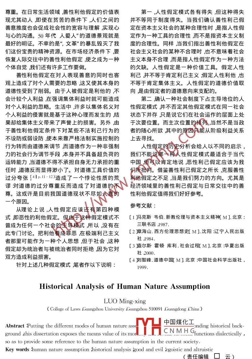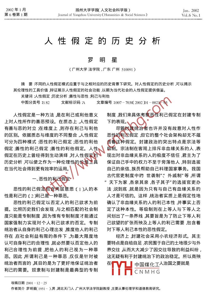 2002年1月?lián)P州大學(xué)學(xué)報(bào)(人文社會(huì)科學(xué)版)Jan. 2002第6卷第1期Journal of Yangzhou University( Humanities & Social Sciences )Vol.6 No. 1人性假定的歷史分析羅明星(廣州大學(xué)法學(xué)院,廣東廣州510091 )摘要不同的人性假定模式應(yīng)置于與之相對(duì)應(yīng)的歷史背景下研究。對(duì)人性假定的歷史分析可以揭示其倫理性的工具價(jià)值辯證展示人性假定的社會(huì)功能,以期為當(dāng)代社會(huì)的人性假定提供借鑒。關(guān)鍵詞人性假定;歷史分析善性與惡性利己與利他中圖分類(lèi)號(hào)B 82文獻(xiàn)標(biāo)識(shí)碼A文章編號(hào):1007- 7030( 2002 )1 - 0023 - 05.人性假定是-種方法,是在利己或利他意義制度我們來(lái)具體考察惡性利己假定在封建專(zhuān)制上對(duì)人性所作的善惡預(yù)設(shè)。在質(zhì)態(tài)上人性假定下的表現(xiàn)。有善與惡的對(duì)立;在維度上則存在利己與利他盡管封建統(tǒng)治者也許并沒(méi)有故意對(duì)人性作的區(qū)別。依據(jù)質(zhì)態(tài)與維度的不同整合人性假定惡性的利己假定,但它的整個(gè)社會(huì)架構(gòu)卻無(wú)不蘊(yùn)可分為四種模式:惡性的利己假定;惡性的利他含著這種假定。封建政治的突出特點(diǎn)是宗法等假定善性的利己假定;善性的利他假定。人性.級(jí)制。宗法制在客觀上排斥非血緣關(guān)系的人表假定在歷史上曾經(jīng)得到生動(dòng)演繹,對(duì)人性假定的現(xiàn)出對(duì)非血緣關(guān)系的人的極度不信任,君主為了歷史分析,可以使之作為一種倫理性的價(jià)值工具保證自己手中的權(quán)力不至于旁落他人特別選拔在當(dāng)代社會(huì)得到更有效率的運(yùn)用。自己的親信、族員幫助自己料理國(guó)家事務(wù)。我國(guó)古代官吏制度中的世襲制”、外戚制”等,所謂一、惡性的利己假定”天下為家,各親其親,各子其子”的選拔官吏辦惡性的利己假定包含兩層意思( 1 )人的本法,說(shuō)到底就是因?yàn)橹挥信c自己有血緣關(guān)系的性是利己的(2 )利己是一種罪惡。人才是可信的。這樣統(tǒng)治者實(shí)質(zhì)上是假定性地惡性的利己假定以否定人的利己欲求為前確認(rèn)了非血緣關(guān)系的人的利己本性并事實(shí)上否提。比照歷史我們會(huì)發(fā)現(xiàn)與之相匹配的社會(huì)制定了這種本性。等級(jí)制則在上等人與下等人之度只能是專(zhuān)制制度,因?yàn)槲┯袑?zhuān)制制度才能通過(guò)間劃出了一條界線(xiàn)其要旨是為了防止下等人利國(guó)家強(qiáng)制力實(shí)現(xiàn)對(duì)個(gè)人利己欲求的否定。專(zhuān)制己欲望的擴(kuò)張而殃及上等人的利己需要,包含著統(tǒng)治者從自身的利己心理出發(fā)推度他人的利己對(duì)下等人利己本性的惡性假定。存在在社會(huì)利益有限的條件下為最大限度地經(jīng)濟(jì).上封建社會(huì)采用小農(nóng)經(jīng)濟(jì)形式。其主認(rèn)可自身利己的合理性就必然要以否定他人的要特點(diǎn)是自給自足農(nóng)民囿于自己的土地很少與外利己合理性為前提,把他人的利己視為-種罪界交往,從而大大減少了因交往導(dǎo)致的利益糾紛,惡。因此所謂利己是一種罪惡,僅僅是針對(duì)被這無(wú)疑有利于封建統(tǒng)治下的政治穩(wěn)定。所以商殃統(tǒng)治者而言的其目的是為了更好地保證統(tǒng)治者中國(guó)煤化工人治國(guó)之要就是利己的需要。奴隸制與封建制是最典型的專(zhuān)制MHCNMHG.收稿日期2001-12-25作者簡(jiǎn)介羅明星( 1951- )男湖北天門(mén)人廠(chǎng)州大學(xué)法學(xué)院副教授主要從事倫理學(xué)和道德教育研究。.“令民歸心于農(nóng),歸心于農(nóng)則民樸而可正”",少詐控制權(quán)。所以如果說(shuō)封建道德之于道德本身有而重居”。可見(jiàn),封建小農(nóng)經(jīng)濟(jì)的形成除了理論什么積極意義的話(huà)那就是使人們真正認(rèn)識(shí)到了界所及的生產(chǎn)力水平等原因之外,還內(nèi)在地包含什么是道德,它以惡的方式顯示了道德的不可蔑了一個(gè)農(nóng)民本性利己的惡性假設(shè)。封建經(jīng)濟(jì)另視的權(quán)威。-一個(gè)重要特點(diǎn)是重農(nóng)抑商。重農(nóng)抑商是歷代封其三是加劇了封建道德的不平等性。惡性建政府的-項(xiàng)基本國(guó)策。如果說(shuō)重農(nóng)抑商開(kāi)始的利己假定完全否定人的現(xiàn)實(shí)欲求和利己需要還是出于戰(zhàn)爭(zhēng)的需要,而至后來(lái)則主要是基于道使封建道德變成人民的精神枷鎖。但是統(tǒng)治者德上的原因了。在當(dāng)時(shí)人們的觀念里.工商業(yè)者對(duì)自己的人性假定則不同,它同樣認(rèn)定自己是利是追逐末利、妨害風(fēng)化的小人”,他們的財(cái)產(chǎn) 是己的,只不過(guò)它在善性意義上認(rèn)可了自己利己的”欺民取賄”或惑民取產(chǎn)"而得來(lái)的。因此,那些質(zhì)態(tài)。統(tǒng)治者與被統(tǒng)治者在人性認(rèn)定上的對(duì)立,從事工商業(yè)活動(dòng)的人,即使取得了高官厚祿,也外化開(kāi)來(lái)就形成了兩者在道德上的對(duì)立統(tǒng)治為人不恥。因?yàn)楣ど虡I(yè)行為最直露地展示著人者利用手中權(quán)力將道德賦予差等并在其中確認(rèn)的利己欲望在封建統(tǒng)治者把人性利己視為邪惡自己的利益優(yōu)先權(quán),這樣,便有了君