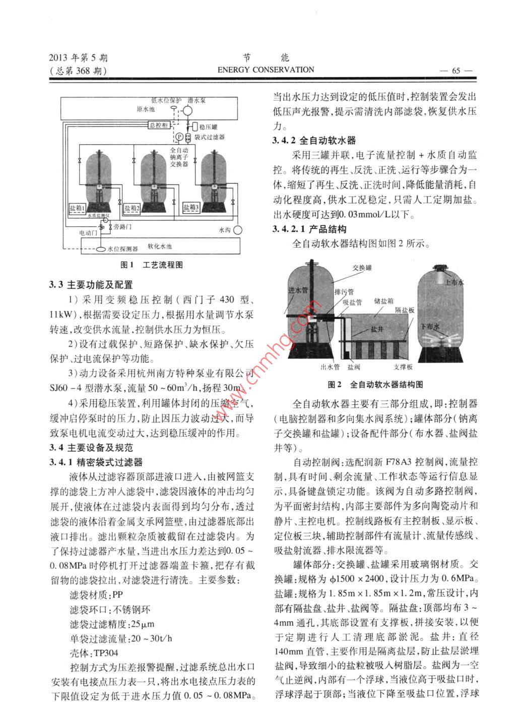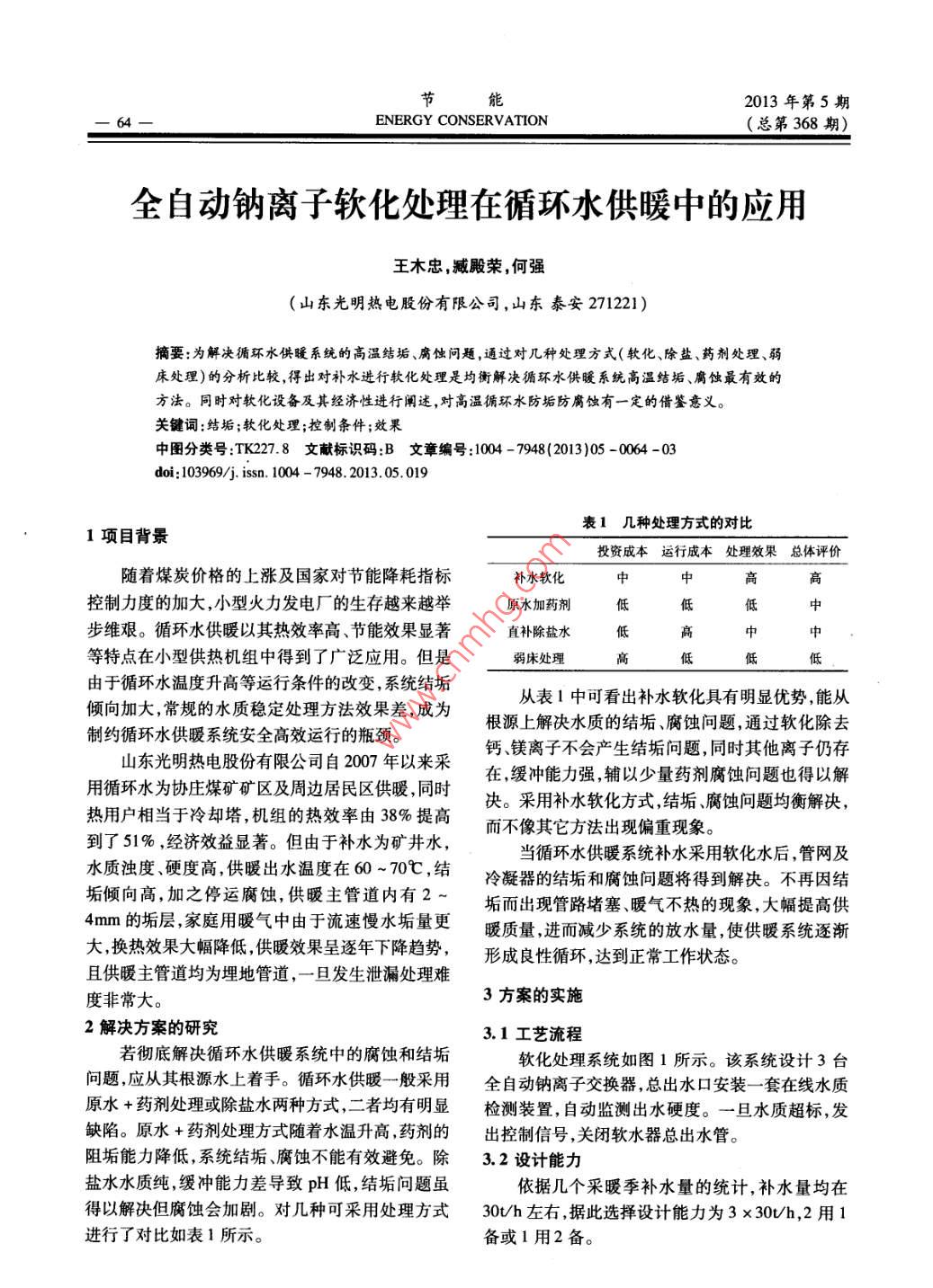 節(jié)能2013年第5期ENERGY CONSERⅤ ATION總第368期全自動(dòng)鈉離子軟化處理在循環(huán)水供暖中的應(yīng)用王木忠,臧殿榮,何強(qiáng)(山東光明熱電股份有服公司,山東泰安271221)摘要:為解決循環(huán)水供暖系統(tǒng)的高溫結(jié)垢、腐蝕問(wèn)題,通過(guò)對(duì)幾種處理方式(軟化、除鹽、藥劑處理、弱床處理〕的分析比較,得出對(duì)補(bǔ)水進(jìn)行軟化處理是均衡解決循環(huán)水供暖系統(tǒng)高溫結(jié)垢、腐蝕最有效的方法。同時(shí)對(duì)軟化設(shè)備及其經(jīng)濟(jì)性進(jìn)行闡述,對(duì)高溫循環(huán)水防垢防腐蝕有一定的借鑒意義。關(guān)鍵詞:結(jié)垢;軟化處理;控制條件;效果中圖分類(lèi)號(hào):TK278文獻(xiàn)標(biāo)識(shí)碼:B文章編號(hào):1004-7948(2013)05-0064-03doi:103969/ J. Issn.1004-7948.2013.05019表1幾種處理方式的對(duì)比1項(xiàng)目背景投資成本運(yùn)行成本處理效果總體評(píng)價(jià)隨著煤炭?jī)r(jià)格的上漲及國(guó)家對(duì)節(jié)能降耗指標(biāo)補(bǔ)水軟化控制力度的加大,小型火力發(fā)電廠的生存越來(lái)越舉原水加藥劑步維艱。循環(huán)水供暖以其熱效率高、節(jié)能效果顯著直補(bǔ)除鹽水中低低中低高低高低中低高中中低等特點(diǎn)在小型供熱機(jī)組中得到了廣泛應(yīng)用。但是弱床處理由于循環(huán)水溫度升高等運(yùn)行條件的改變,系統(tǒng)結(jié)垢傾向加大,常規(guī)的水質(zhì)穩(wěn)定處理方法效果差,成為從表1中可看出補(bǔ)水軟化具有明顯優(yōu)勢(shì),能從制約循環(huán)水供暖系統(tǒng)安全高效運(yùn)行的瓶頸。根源上解決水質(zhì)的結(jié)垢、腐蝕問(wèn)題,通過(guò)軟化除去鈣、鎂離子不會(huì)產(chǎn)生結(jié)垢問(wèn)題,同時(shí)其他離子仍存山東光明熱電股份有限公司自2007年以來(lái)采在緩沖能力強(qiáng)輔以少量藥劑腐蝕問(wèn)題也得以解用循環(huán)水為協(xié)莊煤礦礦區(qū)及周邊居民區(qū)供暖,同時(shí)決。采用補(bǔ)水軟化方式,結(jié)垢、腐蝕問(wèn)題均衡解決,熱用戶(hù)相當(dāng)于冷卻塔,機(jī)組的熱效率由38%提高而不像其它方法出現(xiàn)偏重現(xiàn)象到了51%,經(jīng)濟(jì)效益顯著。但由于補(bǔ)水為礦井水,當(dāng)循環(huán)水供暖系統(tǒng)補(bǔ)水采用軟化水后,管網(wǎng)及水質(zhì)濁度、硬度高,供暖出水溫度在60~70℃,結(jié)垢傾向高,加之停運(yùn)腐蝕,供暖主管道內(nèi)有2~冷凝器的結(jié)垢和腐蝕問(wèn)題將得到解決。不再因結(jié)垢而出現(xiàn)管路堵塞、暖氣不熱的現(xiàn)象,大幅提高供4mm的垢層,家庭用暖氣中由于流速慢水垢量更暖質(zhì)量,進(jìn)而減少系統(tǒng)的放水量,使供暖系統(tǒng)逐漸大,換熱效果大幅降低,供暖效果呈逐年下降趨勢(shì),形成良性循環(huán),達(dá)到正常工作狀態(tài)。且供暖主管道均為埋地管道,一旦發(fā)生泄漏處理難度非常大。3方案的實(shí)施2解決方案的研究3.1工藝流程若徹底解決循環(huán)水供暖系統(tǒng)中的腐蝕和結(jié)垢軟化處理系統(tǒng)如圖1所示。該系統(tǒng)設(shè)計(jì)3臺(tái)問(wèn)題,應(yīng)從其根源水上著手。循環(huán)水供暖一般采用全自動(dòng)鈉離子交換器,總出水口安裝一套在線水質(zhì)原水+藥劑處理或除鹽水兩種方式,二者均有明顯檢測(cè)裝置自動(dòng)監(jiān)測(cè)出水硬度。一旦水質(zhì)超標(biāo)發(fā)缺陷。原水+藥劑處理方式隨著水溫升高藥劑的出控制信號(hào),關(guān)閉軟水器總出水管。阻垢能力降低,系統(tǒng)結(jié)垢腐蝕不能有效避免。除3.2設(shè)計(jì)能力鹽水水質(zhì)純,緩沖能力差導(dǎo)致pH低,結(jié)垢問(wèn)題雖依據(jù)幾個(gè)采暖季補(bǔ)水量的統(tǒng)計(jì),補(bǔ)水量均在得以解決但腐蝕會(huì)加劇。對(duì)幾種可采用處理方式30/h左右據(jù)此選擇設(shè)計(jì)能力為3×30U/h,2用1進(jìn)行了對(duì)比如表1所示備或1用2備。2013年第5期能(總第368期)ENERGY CONSERVATION當(dāng)出水壓力達(dá)到設(shè)定的低壓值時(shí),控制裝置會(huì)發(fā)出原水池低壓聲光報(bào)警,提示需清洗內(nèi)部濾袋,恢復(fù)供水壓三控相穩(wěn)壓罐力迎9袋式過(guò)濾器3.4.2全自動(dòng)軟水器采用三罐并聯(lián),電子流量控制+水質(zhì)自動(dòng)監(jiān)交換器控。將傳統(tǒng)的再生、反洗、正洗、運(yùn)行等步驟合為體,縮短了再生、反洗、正洗時(shí)間,降低能量消耗,自動(dòng)化程度高,供水工況穩(wěn)定,只需人工定期加鹽。鹽出水硬度可達(dá)到0.03mmoL以下。旁路門(mén)水溝3.4.2.1產(chǎn)品結(jié)構(gòu)水位化水全自動(dòng)軟水器結(jié)構(gòu)圖如圖2所示。圖1工藝流程圖交換罐3.3主要功能及配置進(jìn)水管1)采用變頻穩(wěn)壓控制(西門(mén)子430型吸鹽管儲(chǔ)鹽箱l1kW),根據(jù)需要設(shè)定壓力,根據(jù)用水量調(diào)節(jié)水泵隔鹽板轉(zhuǎn)速,改變供水流量,控制供水壓力為恒壓鹽井下布水2)設(shè)有過(guò)載保護(hù)、短路保護(hù)、缺水保護(hù)、欠壓保護(hù)、過(guò)電流保護(hù)等功能。3)動(dòng)力設(shè)備采用杭州南方特種泵業(yè)有限公司出水管鹽閥撐板SJ60-4型潛水泵,流量50~60m3/h,揚(yáng)程30m。圖2全自動(dòng)軟水器結(jié)構(gòu)圖4)采用穩(wěn)壓裝置,利用罐體封閉的壓縮空氣,全自動(dòng)軟水器主要有三部分組成,即:控