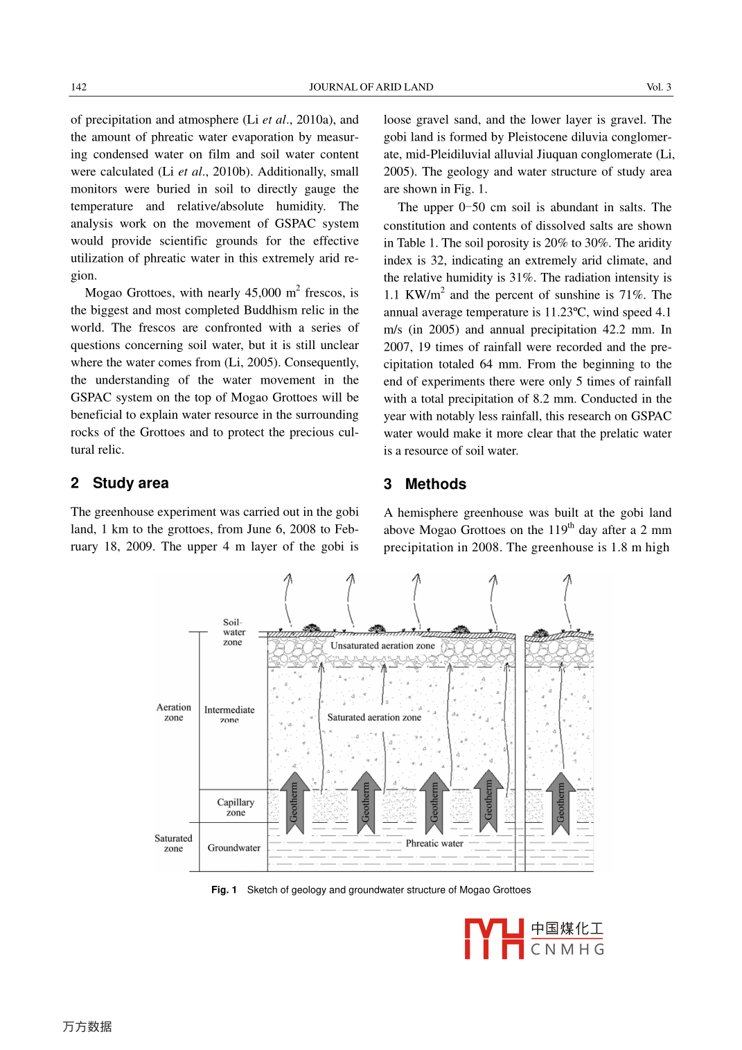 JOURNAL OF ARID LAND, 2011, VOL.3, NO.2, 141-149GSPAC water movement in extremely dry areaHongShou L1,2*, WanFu WANG1.2, GuoBin ZHANG1,2, ZhengMo ZHANG1,2, XiaoWei WANG1,21 The Conservation Institute of Dunhuang Academy, Dunhuang 736200, China;2 Key Scientific Research Base of Conservation for Ancient Mural State Administration for Cultural Heritage, Dunhuang 736200,ChinaAbstract: Under an extremely arid condition, a PVC greenhouse was built on the top of Mogao Grottoesin gobi area. The results of 235-day constant extraction of condensed water on the greenhouse film and soilwater content showed that 2.1 g/(m^.d) groundwater moved up and exported into the soil, and a phreaticwater evaporation existed in the extreme dry area where the groundwater is buried deeper than 200 m.After a prolonged export, the soil water content in the greenhouse was not lower but obviously higher thanthe original control ones. According to the monitored parameters including relative humidity and absolutehumidity of soil, and temperature outside and inside the greenhouse, it was found that there is the availablecondition and mechanism for the upward movement of groundwater, and also it can be sure that the ex-ported water was not from the soil and atmosphere outside the greenhouse. Phreatic water, an importantsource for soil water, interacts with atmosphere moisture via soil respiration. Soil salinity also has importanteffects on soil water movement and spatial-temporal heterogeneity. The extremely dry climate, terrestrial .heat and change of upper soil temperature are the fundamental driving forces of water transportation andphreatic water evaporation in the Groundwater-Soil-Plant Atmosphere Continuum (GSPAC) system.Keywords: greenhouse method; GSPAC system; extremely dry area; water movement1 Introductionrainfall once-in-a-decade in Mogao Grotteos within 20days (Li et al., 2010a). .Water circle is important to ecosystem. Vertical waterAccording to previous investigations, the soil watercircle is constituted by the water movement in the Gr-content was high in the proluvial clay layer at 1.4 mound water-Soil-Plant-Atmosphere Continuum (GSPAC)depth of the gobi land around the Grottoes (Li et al.,system (Wang et al., 2004; Zhou et al, 2005). It is2009), and it could reach 24% at 4 m depth (Yang etwell known that when groundwater level is shallow,al, 2009). Further, the experiments conducted inphreatic water is an important supplement to soil,closed system revealed that the annual precipitation inplant and atmosphere moisture through capillary acthis area (42.2 mm) is not enough to supply soil watertion (Yang, 1999; Chen et al., 2004; Ren et al., 2006). .content (Li et al., 2010a). Therefore, other water re-However, it remains unclear whether phreatic watersources supplying soil water indeed exist.can contribute to soil water, which is a key to under-The only possible resource of soil water except pre-stand whether there is a maximum depth of phreaticcipitation is phreatic water. The research work on thewater evaporation (Zhu and Qian, 2005).climate, geology and vegetation in this area proved theA common belief is that soil water in extremely drypossibility of vertical transportation of phreatic waterarea is the remain of last precipitation (Warner, 2008).(Li et al., 2009). However, as the phreatic water in thisHowever, Liu et al. (2006) found that precipitation isarea is buried deeper than 200 m, water could not beinvalid if its amount is less than or equal to 13.44 mm,transported upward due to capillary action. To furtherbecause water would be evaporated completely beforeverify the existence of phreatic water evaporation, apermeating into deep soil. In former simulated pre-PVC greenhouse was used to eliminate the influencecipitation experiments we found that a rainfall rangingfrom 5 mm to 10 mm could be evaporated entirelyReceived 2010- 10 28, accepted 2011-01-06doi: 10.3724/SPJ.1227.2011.00149within 8 days and 12 days respectively, and a 15 mm● Crresponding author: HongShou Lu (E-mail: dlbs69@ 163.com).中國煤化工YHCNMH G.142JOURNAL OF ARID LANdVol. 3of precipitation and atmosphere (Li et al, 2010a), andloose gravel sand, and the lower layer is gravel. Thethe amount of phreatic water evaporation by measur-gobi land is formed by Pleistocene diluvia conglomer-ing condensed water on film and soil water contentate, mid-Pleidiluvial alluvial Jiuquan conglomerate (Liwere calculated (Li et al, 2010b). Additionally, small 2005). The geology and water structure of study areamonitors were buried in soil to directly gauge theare shown in Fig. 1.temperature and relative/absolute humidity. TheThe upper 0- -50 cm soil is abundant in salts. Theanalysis work on the movement of GSPAC systemconstitution and contents of dissolved salts are shownwould provide scientific grounds for the effective in Table 1. The soil porosity is 20% to 30%. The aridityutilization of phreatic water in this extremely arid re-index is 32, indicating an extremely arid climate, andgion.the relative humidity is 31%. The radiation intensity is .Mogao Grottoes, with nearly 45,000 m2 frescos, is .1.1 KW/m2 and the percent of sunshine is 71%. Thethe biggest and most completed Buddhism relic in theannual average temperature is 11.23°C, wind speed 4.1world. The frescos are confronted with a series ofm/s (in 2005) and annual precipitation 42.2 mm. Inquestions concerning soil water, but it is still unclear2007, 19 times of rainfall were recorded and the pre-where the water comes from (Li, 2005). Consequently,cipitation totaled 64 mm. From the beginning to thethe understanding of the water movement in theend of experiments there were only 5 times of rainfallGSPAC system on the top of Mogao Grottoes will bewith a total precipitation of 8.2 mm. Conducted in thebeneficial to explain water resource in the surroundingyear with notably less rainfall, this research on GSPACrocks of the Grottoes and to protect the precious cul-water would make it more clear that the