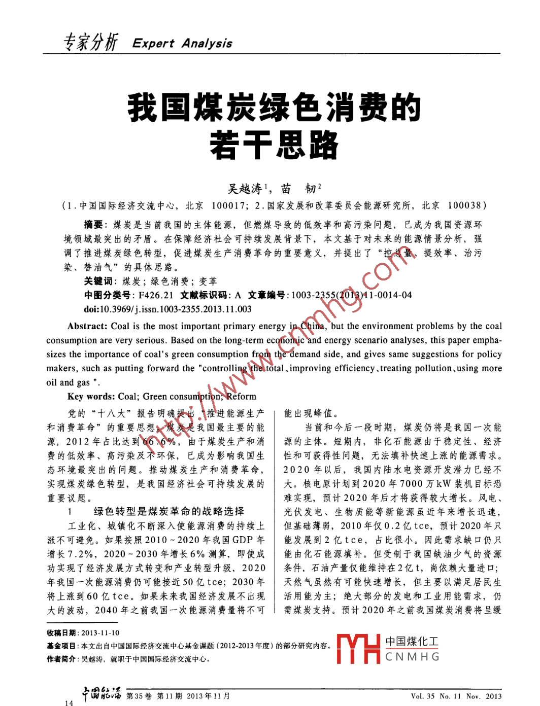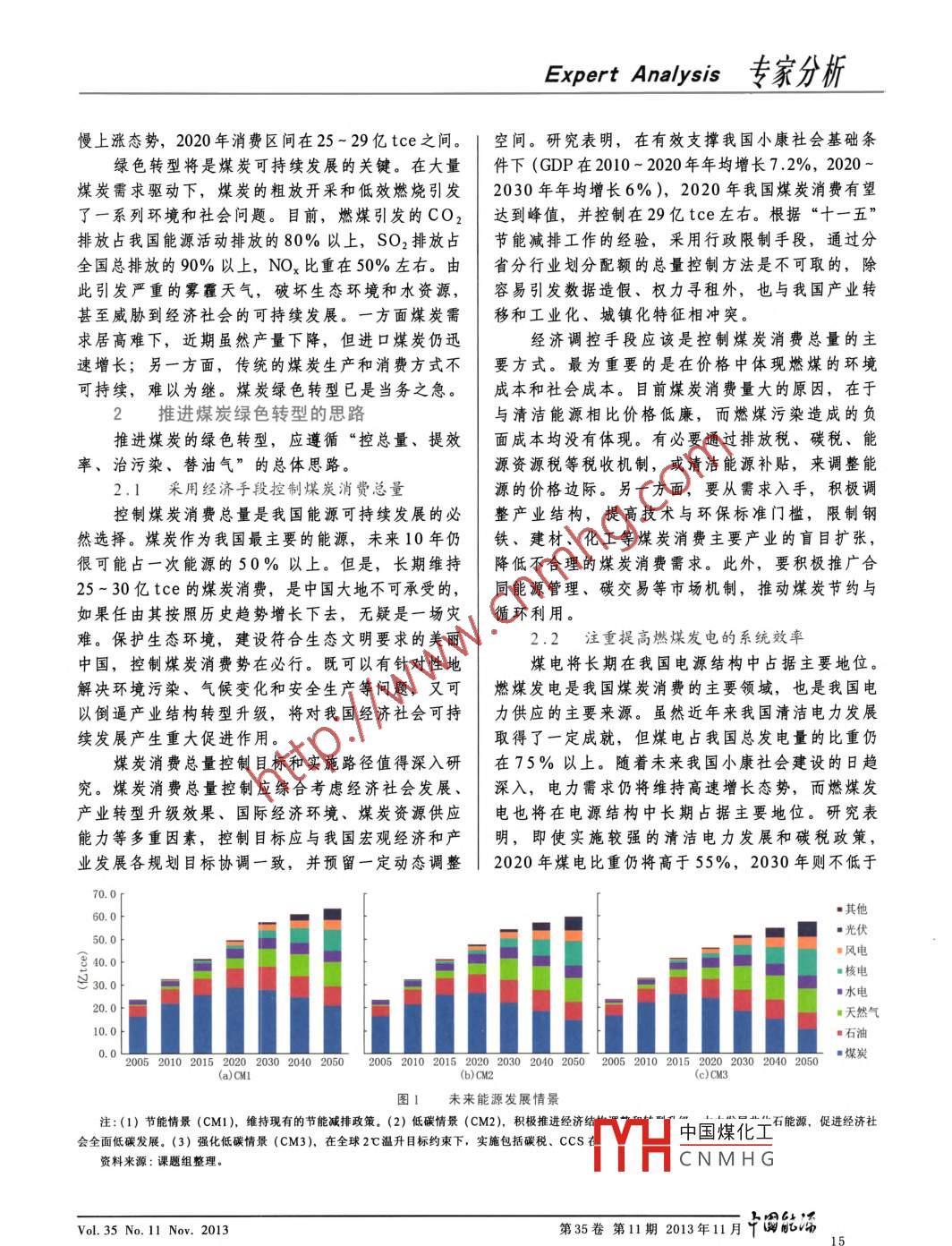 專家分析Expert Analysis我國(guó)煤炭綠色消費(fèi)的若干思路吳越濤',苗韌2(1.中國(guó)國(guó)際經(jīng)濟(jì)交流中心,北京100017; 2.國(guó)家發(fā)展和改革委員會(huì)能源研究所,北京100038 )摘要:煤炭是當(dāng)前我國(guó)的主體能源,但燃煤導(dǎo)致的低效率和高污染問題,已成為我國(guó)資源環(huán)境領(lǐng)域最突出的矛盾。在保障經(jīng)濟(jì)社會(huì)可持續(xù)發(fā)展背景下,本文基于對(duì)未來的能源情景分析,強(qiáng)調(diào)了推進(jìn)煤炭綠色轉(zhuǎn)型,促進(jìn)煤炭生產(chǎn)消費(fèi)革命的重要意義,并提出了“控總量、提效率、治污染、替油氣”的具體思路。關(guān)鍵詞:煤炭;綠色消費(fèi);變革中圖分類號(hào): F426.21文獻(xiàn)標(biāo)識(shí)碼: A文章編號(hào): 1003-2355(2013)11-0014-04doi: 10.3969/j.issn.1003-2355 .2013.11.003Abstract: Coal is the most important primary energy in China, but the environment problems by the coalconsumption are very serious. Based on the long-term economic and energy scenario analyses, this paper empha-sizes the importance of coal's green consumption from the demand side, and gives same suggestions for policymakers, such as putting forward the " controlling the total 、improving efficiency 、treating pollution、using moreoil and gasKey words: Coal; Green consumption; Reform黨的“十八大”報(bào)告明確提出“推進(jìn)能源生產(chǎn)能出現(xiàn)峰值。和消費(fèi)革命”的重要思想。煤炭是我國(guó)最主要的能當(dāng)前和今后一段時(shí)期,煤炭仍將是我國(guó)一次能源,2012年占比達(dá)到66.6%,由于煤炭生產(chǎn)和消源的主體。短期內(nèi),非化石能源由于穩(wěn)定性、經(jīng)濟(jì)費(fèi)的低效率、高污染及不環(huán)保,已成為影響我國(guó)生性和可獲得性問題,無法填補(bǔ)快速上漲的能源需求。態(tài)環(huán)境最突出的問題。推動(dòng)煤炭生產(chǎn)和消費(fèi)革命,2020年以后,我國(guó)內(nèi)陸水電資源開發(fā)潛力巳經(jīng)不實(shí)現(xiàn)煤炭綠色轉(zhuǎn)型,是我國(guó)經(jīng)濟(jì)社會(huì)可持續(xù)發(fā)展的大。核電原計(jì)劃到2020年7000萬kW裝機(jī)目標(biāo)恐重要議題。難實(shí)現(xiàn),預(yù)計(jì)2020年后才將獲得較大增長(zhǎng)。風(fēng)電、綠色轉(zhuǎn)型是煤炭革命的戰(zhàn)略選擇光伏發(fā)電、生物質(zhì)能等新能源雖近年來增長(zhǎng)迅速,工業(yè)化、城鎮(zhèn)化不斷深入使能源消費(fèi)的持續(xù)上但基礎(chǔ)薄弱,2010年僅0.2億tce,預(yù)計(jì)2020年只漲不可避免。如果按照2010~ 2020年我國(guó)GDP年能發(fā)展到2億tce,占比很小。因此需求缺口仍只增長(zhǎng)7.2%,2020 ~ 2030年增長(zhǎng)6%測(cè)算,即使成能由化石能源填補(bǔ)。但受制于我國(guó)缺油少氣的資源功實(shí)現(xiàn)了經(jīng)濟(jì)發(fā)展方式轉(zhuǎn)變和產(chǎn)業(yè)轉(zhuǎn)型升級(jí),2020條件,石油產(chǎn)量?jī)H能維持在2億t,尚依賴大量進(jìn)口;年我國(guó)一次能源消費(fèi)仍可能接近50億tce; 2030 年天然氣雖然有可能快速增長(zhǎng),但主要以滿足居民生將上漲到60億tce.如果未來我國(guó)經(jīng)濟(jì)發(fā)展不出現(xiàn)活用能為主;絕大部分的發(fā)電和工業(yè)用能需求,仍大的波動(dòng),2040 年之前我國(guó)一次能源消費(fèi)量將不可需煤炭支持。預(yù)計(jì)2020年之前我國(guó)煤炭消費(fèi)將呈緩收稿日期:2013-11-10基金項(xiàng)目:本文出自中國(guó)國(guó)際經(jīng)濟(jì)交流中心基金課題(2012-2013 年度)的部分研究?jī)?nèi)容。中國(guó)煤化工作者簡(jiǎn)介:吳越濤,就職于中國(guó)國(guó)際經(jīng)濟(jì)交流中心。MYHCNMHG中國(guó)能滿第35卷第11期2013年11月Vol. 35 No. 11 Nov. 2013專家分析Expert Analysis45%。因此煤電的科學(xué)發(fā)展對(duì)我國(guó)能源可持續(xù)發(fā)展2.3 治理燃煤污染物刻不容緩至關(guān)重要。治理燃煤污染是防治霧霾等大氣污染的根本手提高燃煤發(fā)電效率一舉多得。一是顯著降低污段。2013年初我國(guó)中東部地區(qū)爆發(fā)了近年來持續(xù)時(shí)染物和溫室氣體排放。作為我國(guó)主要的碳排放源,間最長(zhǎng)、影響范圍最廣、強(qiáng)度最強(qiáng)的霧霾天氣,燃當(dāng)前燃煤發(fā)電占我國(guó)總CO2排放比重高達(dá)35%,如煤導(dǎo)致的煙塵排放是霧霾發(fā)生的最主要原因。事實(shí)果發(fā)電煤耗降低1gce / kWh,則每度電可以降低上,上述問題在近年來沒有得到充分重視,雖然“十CO2排放2.8g左右,全國(guó)則可能減排超過850萬t一五”節(jié)能減排行動(dòng)開展了針對(duì)PM10的治理工作,CO2,相當(dāng)于青海省2010年CO2排放總量的1/ 10。但其主要的靜電除塵設(shè)備卻無法有效去除PM2.5二是有利于資源節(jié)約和能源消費(fèi)總量控制。隨著未等直接對(duì)人體有害物質(zhì)。開展燃煤污染物排放治理來電力在我國(guó)終端能源消費(fèi)中的比重日益提高,發(fā)勢(shì)在必行,可以考慮在華北、華東地區(qū)限制新建燃電用煤占我國(guó)煤炭消費(fèi)總量比重將進(jìn)一步提高。提煤電廠,推進(jìn)居民用能煤改氣,實(shí)施農(nóng)村用能改造高燃煤發(fā)電效率,將對(duì)抑制煤炭消費(fèi)需求快速上漲等政策。起到重要作用。提高燃煤污染物綜合防控治理標(biāo)準(zhǔn)和技術(shù)水超超臨界機(jī)組應(yīng)作為當(dāng)前優(yōu)先發(fā)展技術(shù)。未來平。