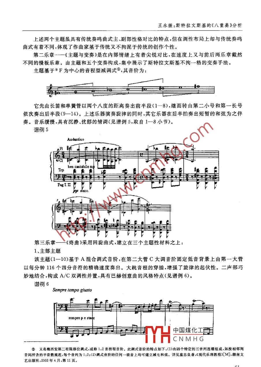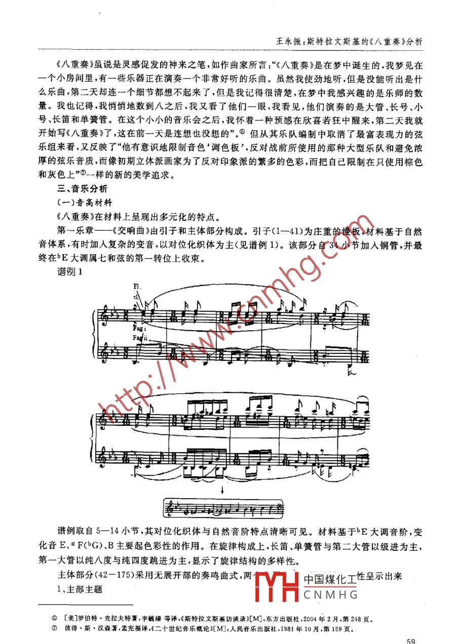 天津音樂學(xué)院學(xué)報(天籟)2005年第4期JOURNAL OF TIANJIN CONSERVATORY OF MUSIC (SOUNDS OF NATURE)王永振WANG Yong -zhen斯特拉文斯基的《八重奏》分析內(nèi)容提要:《八重奏》是斯特拉文斯基創(chuàng)作的第一部真正具有新古典主義意義的作品。作曲家將古典體載與現(xiàn)代作曲技法有機地結(jié)合在一起,賦予作品獨特的風格特征。作品采用多元化的材料、個性化的調(diào)性布局、新穎的節(jié)拍節(jié)奏與變奏手法、基于傳統(tǒng)又突破傳統(tǒng)的曲式結(jié)構(gòu)等,使作品獲得了獨特的音響效果關(guān)鍵詞:斯特拉文斯基八重奏變拍子多調(diào)性變奏作品簡介為管樂器而作的《八重奏》是斯特拉文斯基進入新古典主義時期后的第一部主要作品1922年末開始創(chuàng)作次年5月完成并題獻給薇拉,德·波塞特( Verade bosset)②,同年由作曲家本人指揮首演于巴黎格蘭特歌劇院。樂器編制為長笛、單簧管(bB調(diào))各一支、大管兩支、C調(diào)與A調(diào)小號各一支及高、低音長號各一支。樂譜有1924年和1952年兩種版本,本文的研究以后者為依據(jù),出版社及編號為B.8H.17231,演奏時間約14分鐘?!栋酥刈唷酚山豁懬? Sinfonia)③、主題與變奏( Temacon Variazioni)和終曲( Finale)三樂章組成。作品啟用傳統(tǒng)的曲式和對位化織體,具有巴洛克音樂的精神和氣質(zhì),但在結(jié)構(gòu)及調(diào)性布局變奏曲的處理方式、節(jié)奏和音響結(jié)構(gòu)的總體設(shè)計等方面,又體現(xiàn)出鮮明的現(xiàn)代性和斯特拉文斯基的個性創(chuàng)作特征二、創(chuàng)作背景《八重奏》的創(chuàng)作始于第一次世界大戰(zhàn)結(jié)束后的第四年,正處于作曲家兩種音樂風格的交替時期。此時,俄羅斯風格的《婚禮》( Lesnoces)④尚在做最后的完善新古典主義風格的《普爾欽內(nèi)拉》 Pulcinella)⑤已經(jīng)上演??陀^上講,殘酷的戰(zhàn)爭打破了人們的美夢與幻想,使人的思想發(fā)生了深刻的變化。人們對晚期浪漫派的夸張、矯飾以及印象派的精美和虛幻已感到厭倦轉(zhuǎn)而偏愛客觀、冷靜、樸素的音樂作品;主觀而言,勇于創(chuàng)新的斯特拉文斯基不會囿于固有的創(chuàng)作模式與風格,而是永不停息地處于探索和追求之中。這些都為《八重奏》的出現(xiàn)提供了必要的前提。①[德]沃爾夫?qū)ざ嗄缝`著俞人豪譯,《斯特拉文斯基》M],人民音樂出版社,2003年第112頁②生于1808年,出身于一個法國·瑞士家庭,1921年與斯特拉文斯基相識,后成為他的妻子③巴羅克時期作曲家們?yōu)殚_場的樂章所定下的標題④帶歌唱的芭養(yǎng)舞劇,作于1914-1923年⑤帶歌唱的芭蕾劇,作于1919-—1920年,同年首演于巴黎收稿日期:2005-09-12中圖分類號:614.3中國煤化工文獻標識碼:A文章編號:1008-2530(2005)04-0058-12CNMHG作者簡介:王永振(1964-),男,中國石油大學(xué)勝利學(xué)院音樂系副教投,中央音樂學(xué)院作曲系碩士生(山東,257097)王永振:斯特拉文斯基的《八重奏》分析《八重奏》雖說是靈感促發(fā)的神來之筆,如作曲家所言:“《八重奏》是在夢中誕生的,我夢見在個小房間里,有一些樂器正在演奏一個非常好聽的樂曲。雖然我使勁地聽,但是沒能聽出是什么樂曲,第二天卻連一個細節(jié)都想不起來了,但是我記得很清楚在夢中我感興趣的是樂師的數(shù)量。我也記得我悄悄地數(shù)到八之后,我又看了他們一眼,我看見,他們演奏的是大管、長號、小號、長笛和單簧管。在這個小小的音樂會之后,我懷著一種預(yù)感在欣喜若狂中醒來,第二天我就開始寫《八重奏》了,這在前一天是連想也沒想的”⑥但從其樂隊編制中取消了最富表現(xiàn)力的弦樂組來看,又反映了“他有意識地限制音色調(diào)色板’,反對戰(zhàn)前所使用的那種大型樂隊和避免濃厚的弦樂音質(zhì),而像初期立體派畫家為了反對印象派的繁多的色彩而把自己限制在只使用棕色和灰色上”一樣的新的美學(xué)追求。音樂分析(一)音高材料《八重奏》在材料上呈現(xiàn)出多元化的特點第一樂章—《交響曲》由引子和主體部分構(gòu)成。引子(1-41)為莊重的慢板,材料基于自然音體系,有時加入復(fù)雜的變音,以對位化織體為主(見譜例1)。該部分自34小節(jié)加入銅管,并最終在bE大調(diào)屬七和弦的第一轉(zhuǎn)位上收束譜例1譜例取自5-14小節(jié),其對位化織體與自然音階特點清晰可見。材料基于bE大調(diào)音階,變化音E、#F(G)、B主要起色彩性的作用。在旋律構(gòu)成上,長笛、單簧管與第二大管以級進為主第一大管以純八度與純四度跳進為主,顯示了旋律結(jié)構(gòu)的多樣性主體部分42-13)用無展開部的奏鳴曲式兩們凵中國煤化工性呈示出來主部主題CNMHG[美]羅伯特·克拉夫特著,李梳榛等譯,《斯特拉文斯基訪談錄M],東方出版社,204年2月,第248頁。⑦彼得·斯·漢森著,孟憲福譯《二十世紀音樂概論M,人民音樂出版社,1981年10月,第159頁。天津音樂學(xué)院學(xué)報(天籟)2005年第4期主部主題(見譜例2)是一個7小節(jié)長度的一句體樂段,bE大調(diào),自然音階特點。音樂采用跳進與級進結(jié)合的形式,并引入附點節(jié)奏,使音樂充滿活力。它以中快的速度( Allegro moderato)和強力度(f)奏出,與恬靜、柔和的引子形成對比。譜例附加時值泰辛豐練該材料首先在42-48小節(jié)由木管奏出,接著在49-56小節(jié)以八度卡農(nóng)的形式變奏一次