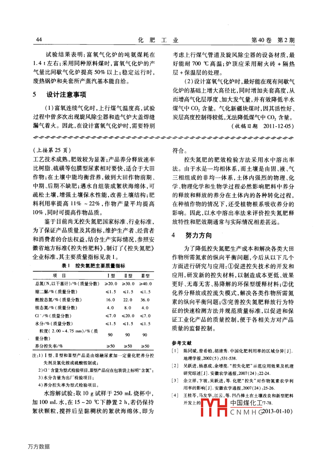 化肥工業(yè)第40卷第2期富氧連續(xù)氣化試驗總結(jié)楊曉勤,古永紅(湖北宜化集團有限責(zé)任公司湖北宜昌443000摘要簡要介紹了富氧連續(xù)氣化技術(shù)的特點、工藝流程、主要設(shè)備以及富氧氣化爐的操作要點,并提出了設(shè)計中需要注意的事項。富氧連續(xù)氣化試驗結(jié)罘表明:富氧氣化爐的哋氨煤耗在1.4t左右,產(chǎn)氣量比間歇氣化爐提高50%以上,廢熱鍋爐和夾套所產(chǎn)蒸汽基本能自給。關(guān)鍵詞富氧氣化炭層控制上行煤氣溫度試驗Sum-Up of Experiments on Continuous Gasification with Oxygen-Enriched AirYang Xiaoqin, Gu YoHubei Yihua Group Co, Ltd. Hubei Yichang 443000)Abstract A brief introduction is given to the continuous gasification technology with oxygenenriched air, its special features, technological process, main pieces of equipment and main points inthe operation of the gasification with oxygen-enriched air, and points for attention are mentioned in itsdesign. The experimental results indicate that the gasifier consumes about 1. 4 t of coal per ton ofammonia,its gas production is over 50% higher than that of the batch coal gasifier, and the steamfrom the waste heat boiler and the jacket is basically self-sufficientKeywords gasification with oxygen-enriched air carbon layer control upgoing gas temperature1富氧連續(xù)氣化技術(shù)特點越高,對純氧的消耗量也越高。由于需要消耗氧氣,因此富氧連續(xù)氣化技術(shù)實施的關(guān)鍵在于能否富氧連續(xù)氣化和間歇氣化技術(shù)均屬于常壓固獲得穩(wěn)定、經(jīng)濟的富氧源。湖北宜化集團有限責(zé)任定層氣化,前者是以純氧、富氧空氣和水蒸氣為氣公司通過對國內(nèi)采用富氧連續(xù)氣化技術(shù)的河南平化劑同時從爐底進(jìn)入,所產(chǎn)煤氣由爐頂引出;后者頂山、安徽淮化,福建三明3家化肥企業(yè)的考察:富是以空氣和水蒸氣為氣化劑,由空氣吹風(fēng)和水蒸氧連續(xù)氣化所需的氧濃度一般在55%~60%(體氣上、下吹交替制取半水煤氣。積分?jǐn)?shù));對于φ2740,φ3000和φ3300mm煤與間歇氣化技術(shù)相比,富氧連續(xù)氣化技術(shù)具氣爐,富氧空氣流量在200-4000m3/h;這有如下特點:工藝流程及生產(chǎn)操作大為簡化,安全3家企業(yè)全部采用深冷法制氧,河南平頂山的制性也得以提高;由于沒有吹風(fēng)階段的大流量空氣氧能力是6500m3/h,安徽淮化利用與德士古水通過床層,炭層中的氣體流速大幅降低,因而可以煤漿氣化裝置配套的2800m3/h空分裝置所產(chǎn)使用粒度較小的原料煤,灰渣含碳量也較間歇氣的部分氧氣,福建三明是利用附近鋼鐵企業(yè)的氧化技術(shù)的低,氣化反應(yīng)區(qū)溫度穩(wěn)定,氣化強度可比氣(5300m3/h)。由于富氧連續(xù)氣化對氧氣的濃間歇氣化提高50%以上;不存在間歇氣化工藝中度要求不高,因此可考慮采用變壓吸附制氧閥門頻繁切換的問題,從而大大延長有效制氣時間,使氣化強度及單爐氣化能力大幅提高;可充分2富氧氣“中國煤化主要設(shè)備利用原有的常壓固定層氣化爐,投資增加不大。2.1富氧CNMHG般氧氣純度越高,氣化強度越大,氣化效率湖北宜化雙環(huán)公司富氧連續(xù)氣化試驗裝置是2013年4月楊曉勤等:富氧連續(xù)氣化試驗總結(jié)在原間歇氣化爐的基礎(chǔ)上改造而成。氣溫度將迅速升高。汽氧比失調(diào)時,也易引起上來自空分裝置的4.0MPa純氧減壓至25kPa行溫度波動,此時應(yīng)根據(jù)煤氣成分分析結(jié)果進(jìn)行后進(jìn)入純氧緩沖罐,然后進(jìn)入富氧緩沖罐,與來自調(diào)節(jié)。上行煤氣溫度超標(biāo)時,若煤氣中有效氣含羅茨風(fēng)機的25kPa空氣混合,富氧空氣中含氧體量高、二氧化碳含量低,說明氧過量,需要增加蒸積分?jǐn)?shù)控制在5%~60%。富氧空氣經(jīng)管道進(jìn)汽用量;若有效氣含量低、二氧化碳含量高,說明入氣化劑混合罐,與來自蒸汽緩沖罐的蒸汽混合蒸汽過量,需減少蒸汽用量或增加氧用量。在實后由爐底進(jìn)入氣化爐,所產(chǎn)半水煤氣由爐頂引出,際操作過程中,也可以通過調(diào)節(jié)加煤量來控制上然后依次經(jīng)過旋風(fēng)除塵器廢熱鍋爐后進(jìn)入煤氣行煤氣溫度,但必須優(yōu)先保證炭層高度??偣堋4撕笤谶M(jìn)行以新疆塊煤為原料的富氧連續(xù)(3)經(jīng)多次試驗,富氧連續(xù)氣化所產(chǎn)煤氣中氣化試驗時,在廢熱鍋爐后增設(shè)了噴淋式單爐洗的有效氣體積分?jǐn)?shù)最佳范圍為62%~68%。當(dāng)氣塔。有效氣體積分?jǐn)?shù)低于62%時,說明爐內(nèi)氣化層溫2.2富氧連續(xù)氣化試驗裝置主要設(shè)備度較低,蒸汽用量也會偏高,經(jīng)濟性較差;當(dāng)有效(1)富氧氣化爐是由常壓間歇氣化爐改造而氣體積分?jǐn)?shù)超過68%時,爐內(nèi)溫度過高極易引成,富氧空氣與蒸汽混合后并入爐底三又管經(jīng)鼓起結(jié)疤,炭層高時也容易引起掛壁。風(fēng)箱進(jìn)入爐內(nèi)。因上行煤氣溫度高,一旦有紅炭落入灰倉,接觸富氧空氣后極易劇烈燃燒,能快速4富氧連續(xù)氣化試驗結(jié)果將灰倉燒紅,因此氣化爐爐頂、上行管道爐底灰湖北宜化雙環(huán)公司分別對貴州煤煤棒、山西倉、鼓風(fēng)箱均要求涂抹耐高溫澆注料煤煤棒、寧夏煤煤棒、內(nèi)蒙古機焦塊、內(nèi)蒙古焦粉(2)湖北宜化雙環(huán)公司富氧連續(xù)氣化試驗裝煤球等進(jìn)行了富氧連續(xù)氣化試驗,并與間歇式煤氣置利用與She粉煤氣化裝置配套的空分裝置