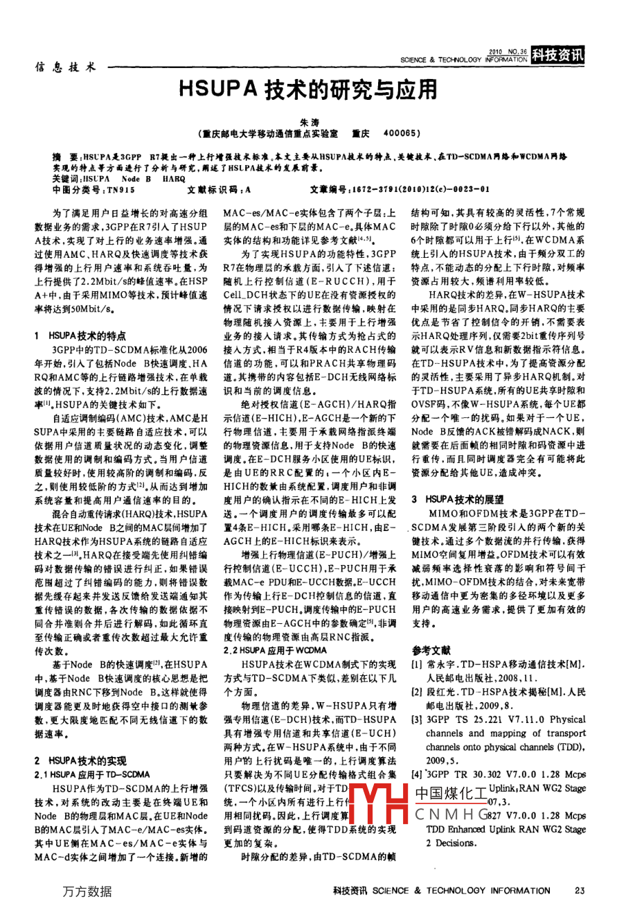 Bea76o器漂科技資訊信息技術HSUPA技術的研究與應用朱濤(重慶郵電大學移動通倍重點實驗室重慶400065)摘要: HSUPA是3GPPR7挺出一種上行增強技術標準。本文主要從 HSUPA技術的特點,美健技求、在TD- SCDMA月路和 WCDMA閂絡實現(xiàn)的特點等方面進行了分析與研究,闡還了 HSLPA技術的發(fā)辰前錄關鍵詞 SUPA Node B HARQ中圖分類號:TN915文讞標識碼:A文章編號:1672-3781(2010)12(e)-0023-01為了滿足用戶日益增長的對高速分組MAC-es/MAC-e實體包含了兩個子層:上結構可知,其具有較高的靈活性,7個常規(guī)數(shù)據(jù)業(yè)務的需求,3GPP在R7引入了HSUP層的MAC-es和下層的MAC-e。具體MAC時隙除了時隙0必須分給下行以外,其他的A技術,實現(xiàn)了對上行的業(yè)務速率增強。通實體的結構和功能詳見參考文獻…56個時隙都可以用于上行,在 WCDMA系過使用AMC、HARQ及快速調度等技術獲為了實現(xiàn) HSUPA的功能特性,3GPP統(tǒng)上引入的 HSUPA技術,由于頻分雙工的得增強的上行用戶速率和系統(tǒng)吞吐量,為R7在物理層的承載方面,引入了下述信道:特點,不能動態(tài)的分配上下行時隙,對頻率上行提供了2.2Mbit/s的峰值速率。在HSP隨機上行控制信道(E- RUCCH),用于資源占用較大,頻譜利用率較低A+中,由于采用MIMo等技術,預計峰值速 Cell DCH狀態(tài)下的UE在沒有資源授權的HARQ技術的差異,在W- HSUPA技術率將達到50Mbit/s情況下請求授權以進行數(shù)據(jù)傳輸,映射在中采用的是同步HARQ同步HARQ的主要物理隨機接入資源上,主要用于上行增強優(yōu)點是節(jié)省了控制信令的開銷,不需要表1 HSUPA技術的特點業(yè)務的接入請求。其傳輸方式為搶占式的示HARQ處理序列,僅需要2bit重傳序列號3GPP中的TD- SCDMA標準化從2006接入方式,相當于R4版本中的RACH傳輸就可以表示RⅤ信息和新數(shù)據(jù)指示符信息年開始,引入了包括 Node B快速調度、HA信道的功能,可以和 PRACH共享物理碼在TD- HSUPA技術中,為了提高資源分配RQ和AMC等的上行鏈路增強技術,在單載道。其攜帶的內容包括E-DcH無線網絡標的靈活性,主要采用了異步HARQ機制。對波的情況下,支持2.2Mbit/s的上行數(shù)據(jù)速識和當前的調度信息于TD- HSUPA系統(tǒng)所有的UE共享時隙和率山 HSUPA的關鍵技術如下絕對授權信道(E-AGcH)/HARQ指OVSF碼,不像W- HSUPA系統(tǒng),每個UE都自適應調制編碼(AMC)技術,AMC是H示信道(E-HICH),E-AGCH是一個新的下分配一個唯一的擾碼。如果對于一個UESUPA中采用的主要鏈路自適應技術,可以行物理信道,主要用于承載網絡指派終端 Node B反饋的ACK被錯解碼成NACK,則依據(jù)用戶信道質量狀況的動態(tài)變化,調整的物理資源信息,用于攴持 Node B的快速就需要在后面幀的相同時陳和碼資源中進數(shù)據(jù)使用的調制和編碼方式。當用戶信道調度。在E-DCH服務小區(qū)使用的UE標識,行重傳,而且同時調度器完全有可能將此質量較好時,使用較高階的調制和編碼,反是由UE的RRC配置的;一個小區(qū)內E—資源分配給其他UE,造成沖突之,則使用較低階的方式2從而達到增加HICH的數(shù)量由系統(tǒng)配置,調度用戶和非調系統(tǒng)容量和提高用戶通信速率的目的。度用戶的確認指示在不同的E-HcH上發(fā)3Hsu胛PA技術的展望混合自動重傳請求(HARQ技術 HSUPA送。一個調度用戶的調度傳輸最多可以配MMo和OFDM技術是3GPP在TD技術在UE和 Node B之間的MAC層間增加了置4條E-HICH。采用哪條E-HICH,由E- SCDMA發(fā)展第三階段引入的兩個新的關HARQ技術作為 HSUPA系統(tǒng)的鏈路自適應AGCH上的E-HCH標識來表示鍵技術。通過多個數(shù)據(jù)流的并行傳輸,獲得技術之一叫HARQ在接受端先使用糾錯編增強上行物理信道(E-PUcH)/增強上MMo空間復用增益OFDM技術可以有效碼對數(shù)據(jù)傳輸?shù)腻e誤進行糾正,如果錯誤行控制信道(E-UccH),E-PUCH用于承減弱頻率選擇性衰落的影響和符號間干范圍超過了糾錯編碼的能力,則將錯誤數(shù)載MAC-ePDU和E-UCCH數(shù)據(jù) E-UCCH擾MIMO-OFDM技術的結合對未來寬帶據(jù)先緩存起來并發(fā)送反饋給發(fā)送端通知其作為傳輸上行E-DcH控制信息的信道,直移動通信中更為密集的多徑環(huán)境以及更多重傳錯誤的數(shù)據(jù),各次傳輸?shù)臄?shù)據(jù)依據(jù)不接映射到E-PUcH調度傳輸中的E-PUcH用戶的高速業(yè)務需求,提供了更加有效的同合并準則合井后進行解碼,如此循環(huán)直物理資源由E-AGCH中的參數(shù)確定,非調支持至傳輸正確或者重傳次數(shù)超過最大允許重度傳輸?shù)奈锢碣Y源由高層RNC指派。傳次數(shù)。22 HSUPA應用于WcMA參考文獻基于 Node bi的快速調度,在 HSUPAHSUPA技術在 WCDMA制式下的實現(xiàn)[1]常永字.TD-HSPA移動通信技術M中,基于 Node B快速調度的核心思想是把方式與TD- SCDMA下類似,差別在以下幾人民郵電出版社,2008,11調度器由RNcC下移到 Node B這樣就使得個方面[2】段紅光TD-HSPA技術揭秘[M].人民器能更及時地獲得空中接口的測鬟參物理信道的差異,W- HSUPA只有增郵電出版社,2009,8數(shù),更大限度地匹配不同無線信道下的數(shù)強專用信道(E-DcH)技術,而TD- HSUPA3]3 GPP TS25.221V7.11.0 Physical據(jù)速率具有增強專用信道和共享信道(E-UcH) channels and mapping of transport兩種方式。在W- HSUPA系統(tǒng)中,由于不同 channels onto physical channels(TDD),2 HSUPA技術的實用戶的上行擾碼是唯一的,上行調度算法2009,521 HSUPA應用于 TD-SCDMA只要解決為不同UE分配傳輸格式組合集{4]3 GPP TR3