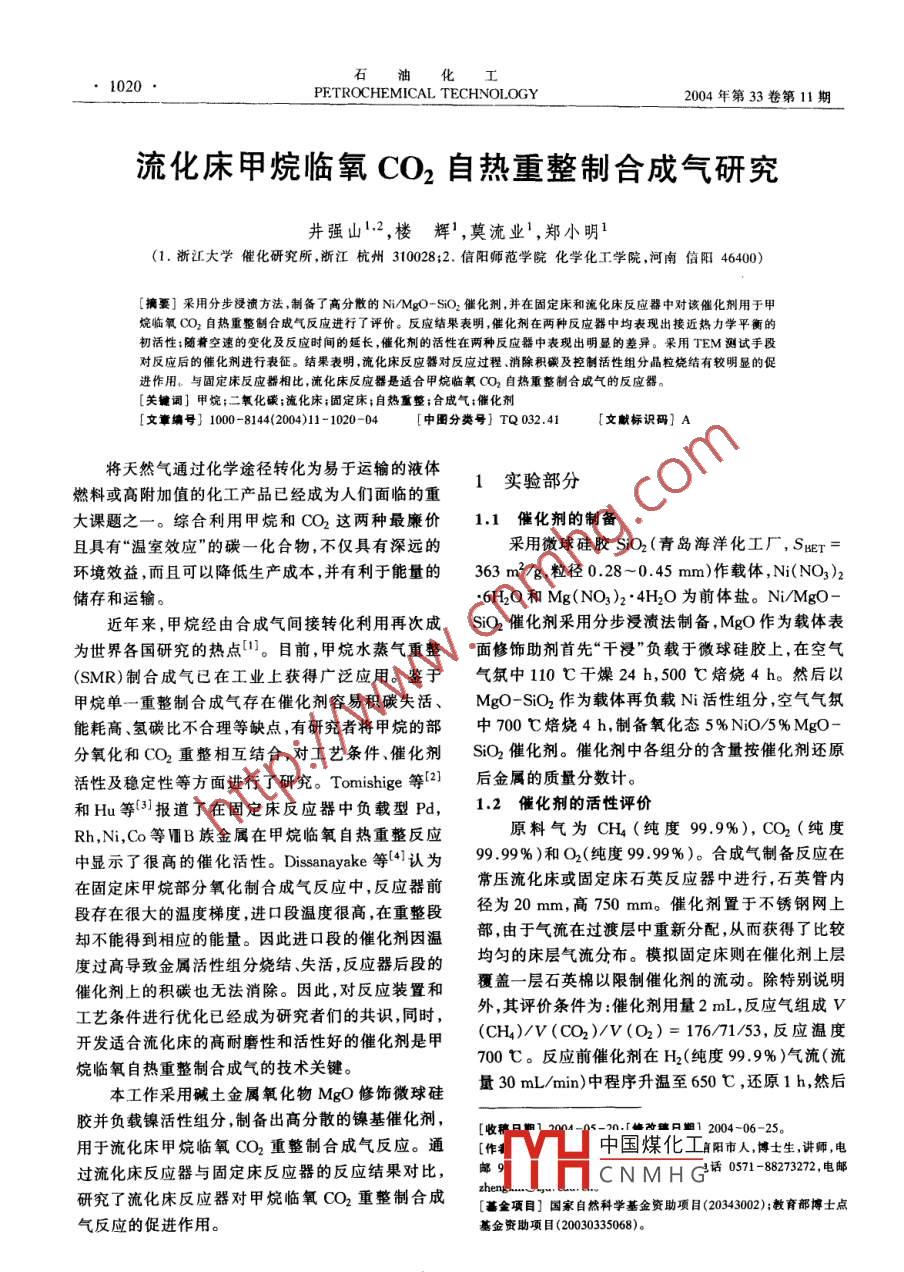 流化床甲烷臨氧CO2自熱重整制合成氣研究